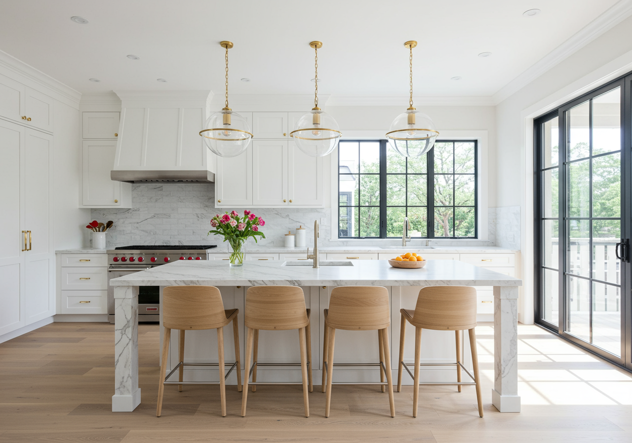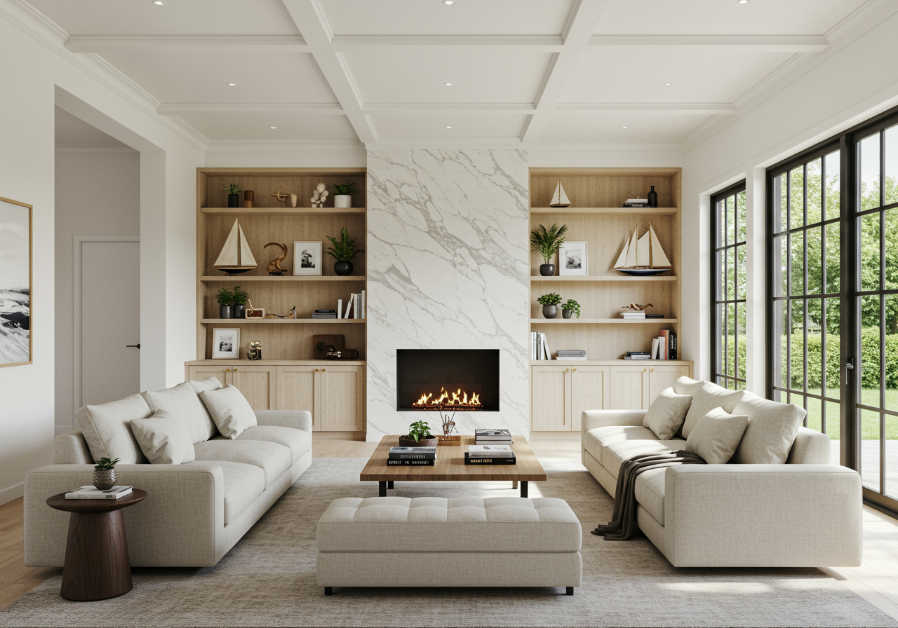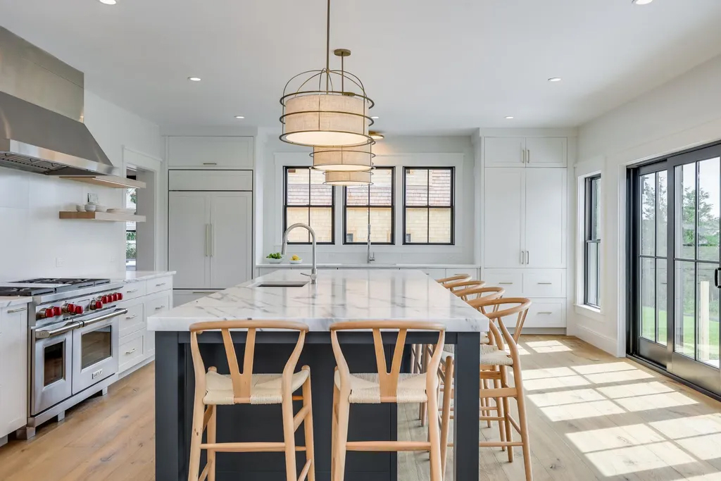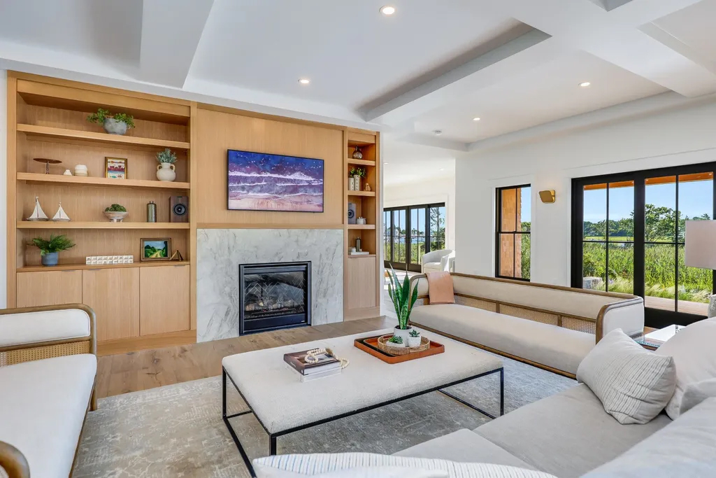 Combining classic Cape Cod architectural elements—among them a wood-shingled façade and a gambrel roof—with stylish modern interiors, clean lines, and chic finishes in soothing organic hues, the 5,400-square-foot home features a versatile floor plan ideal for relaxed coastal living and entertaining. On the main level are sophisticated living and dining rooms and a spacious kitchen with an island, a butler’s pantry with wine storage, and appliances from Wolf, Sub-Zero, Thermador, and Bosch. An inviting family room on the upper level is equipped with useful built-ins and gazes out at the water.