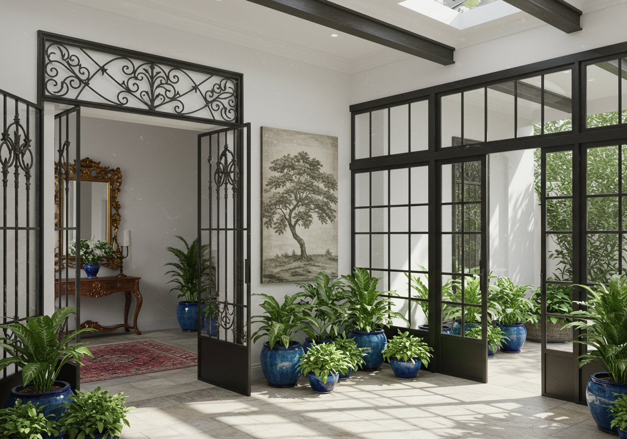 Such opulence is readily apparent when passing through the gates of ornately wrought iron and glass-fronted doors into a polished interior where rich, warm limestone provides a subtle yet notable counterpoint to smooth white plaster of the walls. Artful recesses and reliefs, crown moldings, and floral fretwork on the archways and doorways immediately signify regality.