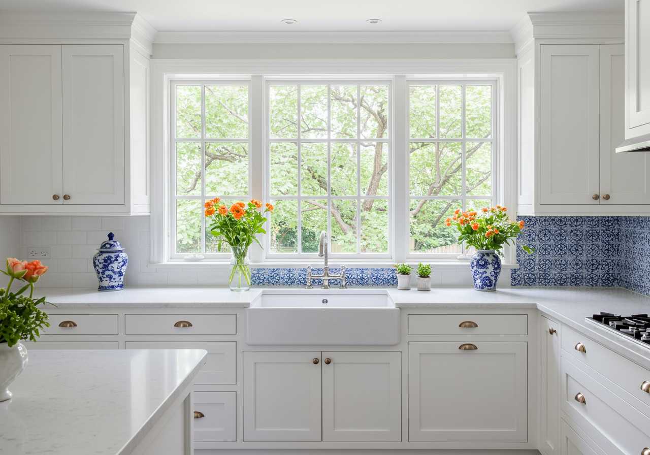 Following it back to the ground floor, it’s easy to appreciate how this home has been designed to make the most of the sumptuous green spaces that enfold it. A large, comfortable sitting room features a cushioned window seat between its paneled walls, as well as a wood-burning fireplace and glass French doors that lead to the garden. Another tranquil space lies adjacent, which can serve as a study or a sunroom, and is fashioned with an entire wall of windows with views of the verdant lawns and trees.