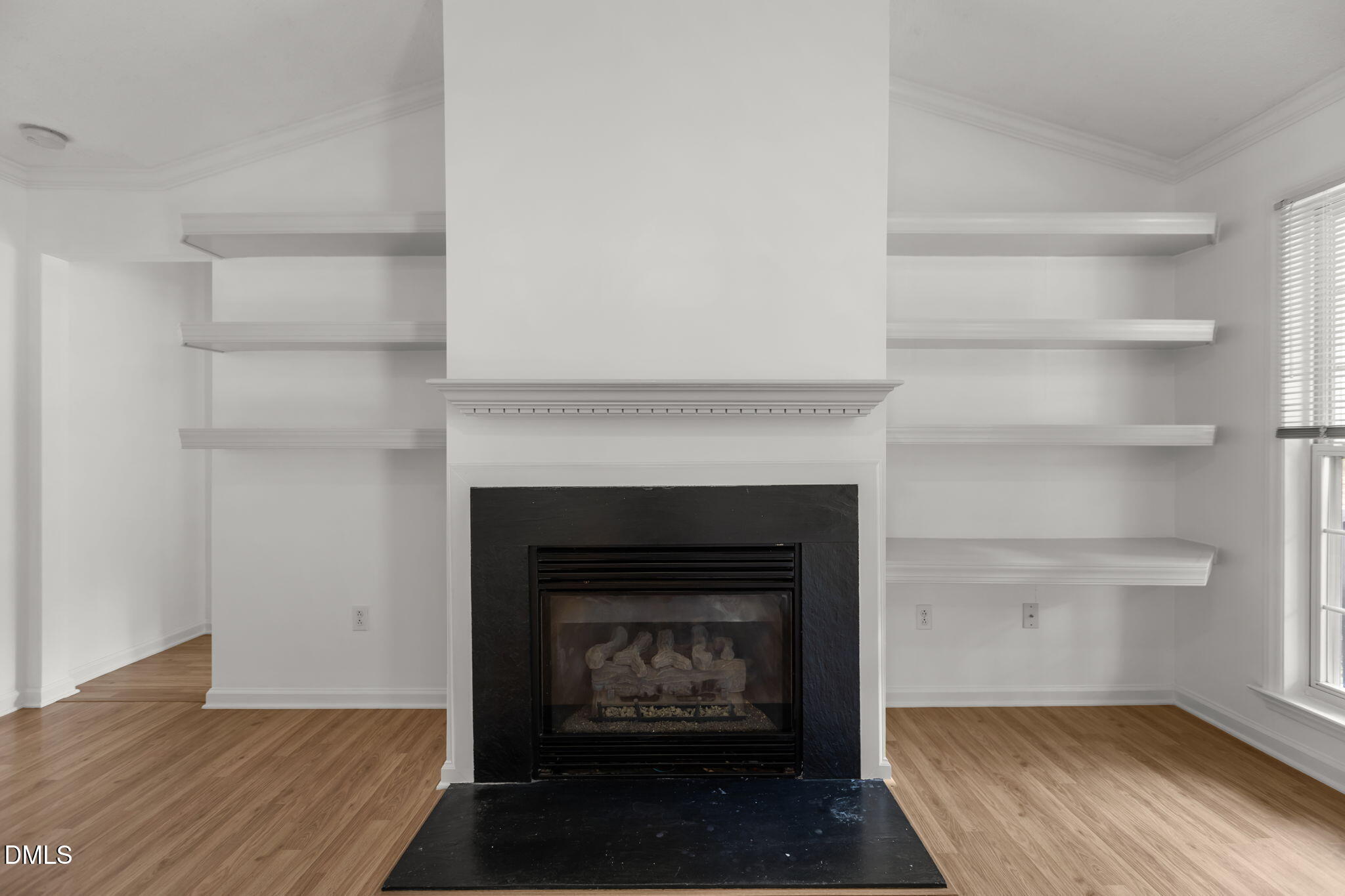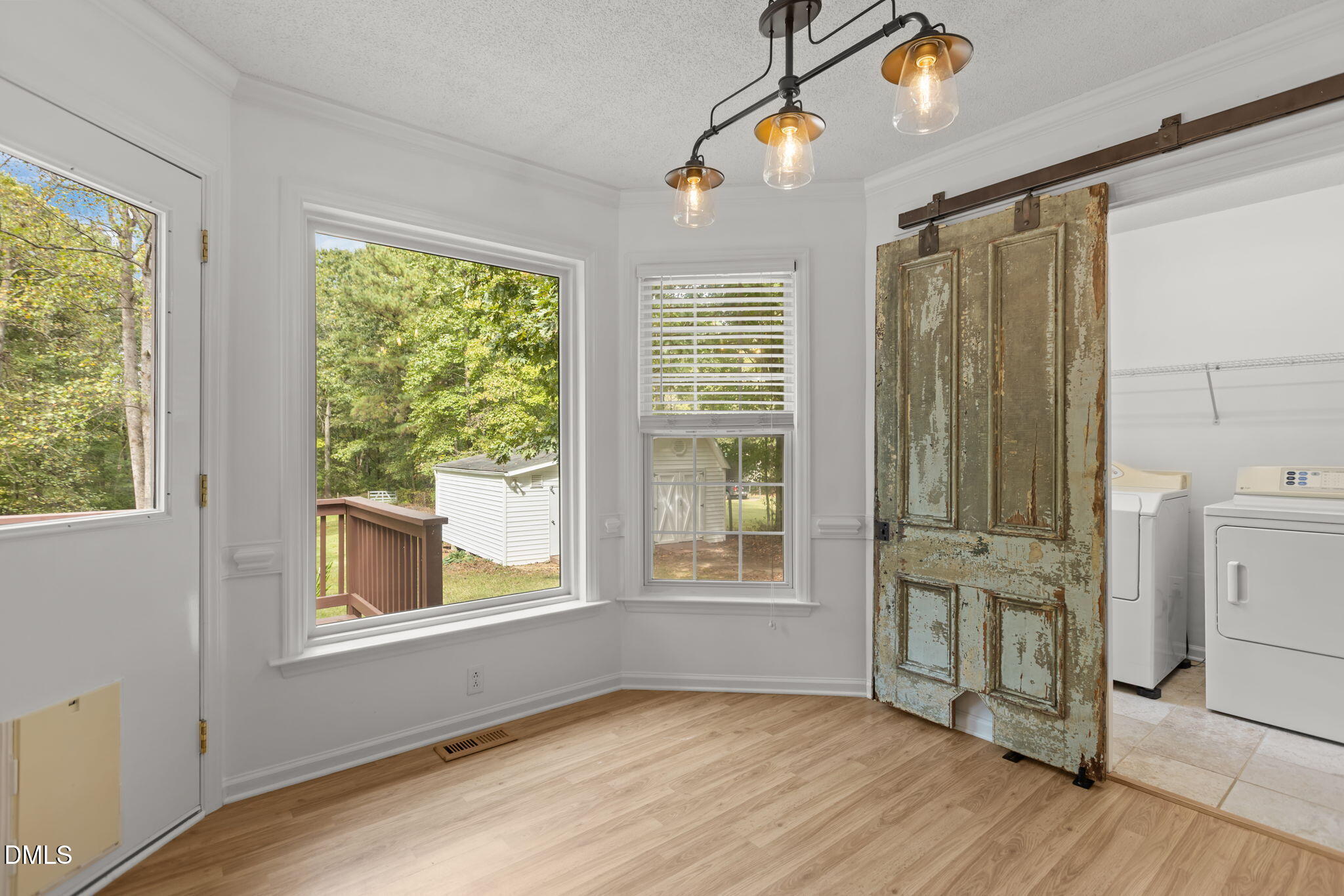 Inside, enjoy an inviting covered front porch, a vaulted living room with built-in bookshelves, and a bright kitchen with a bay window dining nook overlooking the serene backyard. A vintage barn door leads to the laundry room, adding character and charm. The primary suite features a vaulted ceiling and walk-in closet, and fresh paint throughout makes this home move-in ready. Two additional light-filled bedrooms offer flexibility for a home office, workout space, or guest rooms.