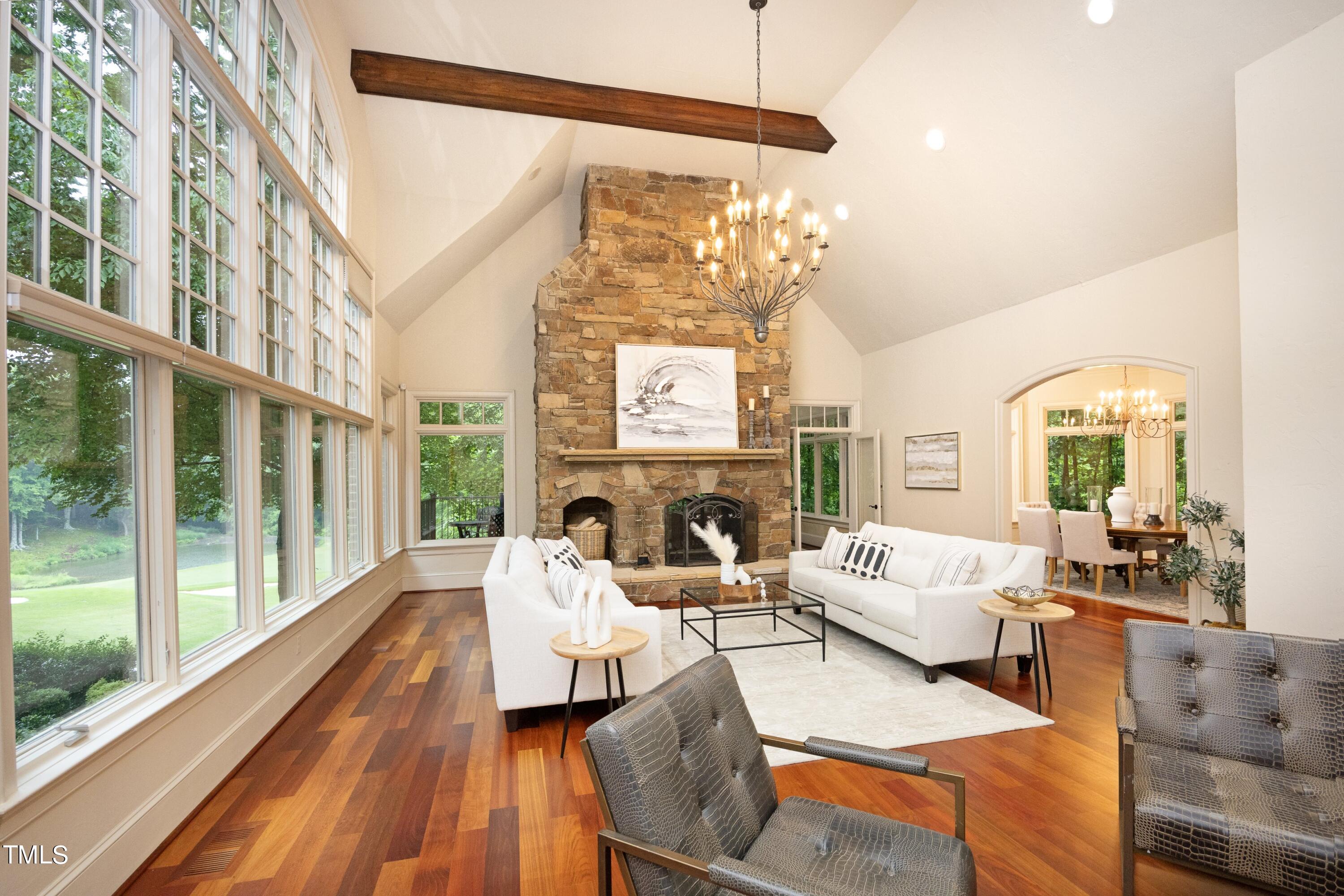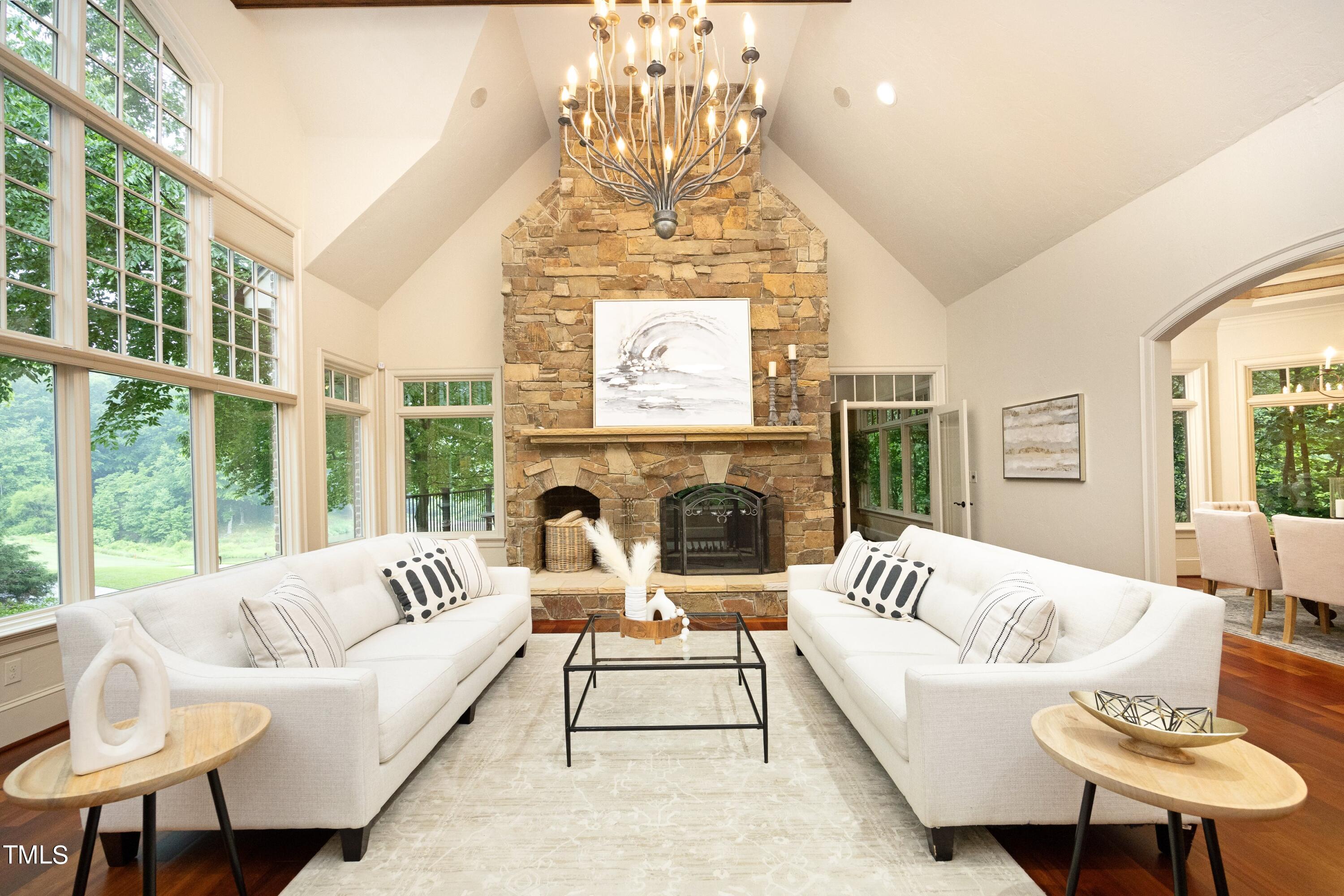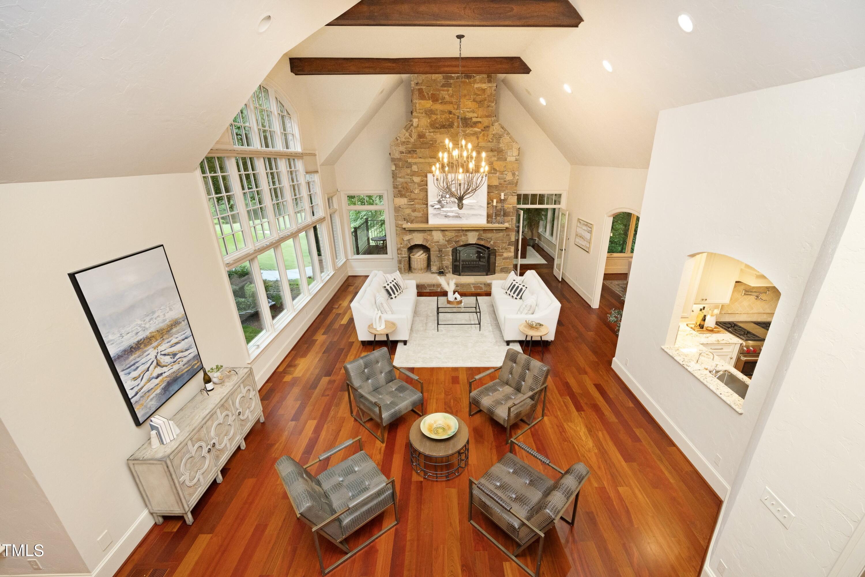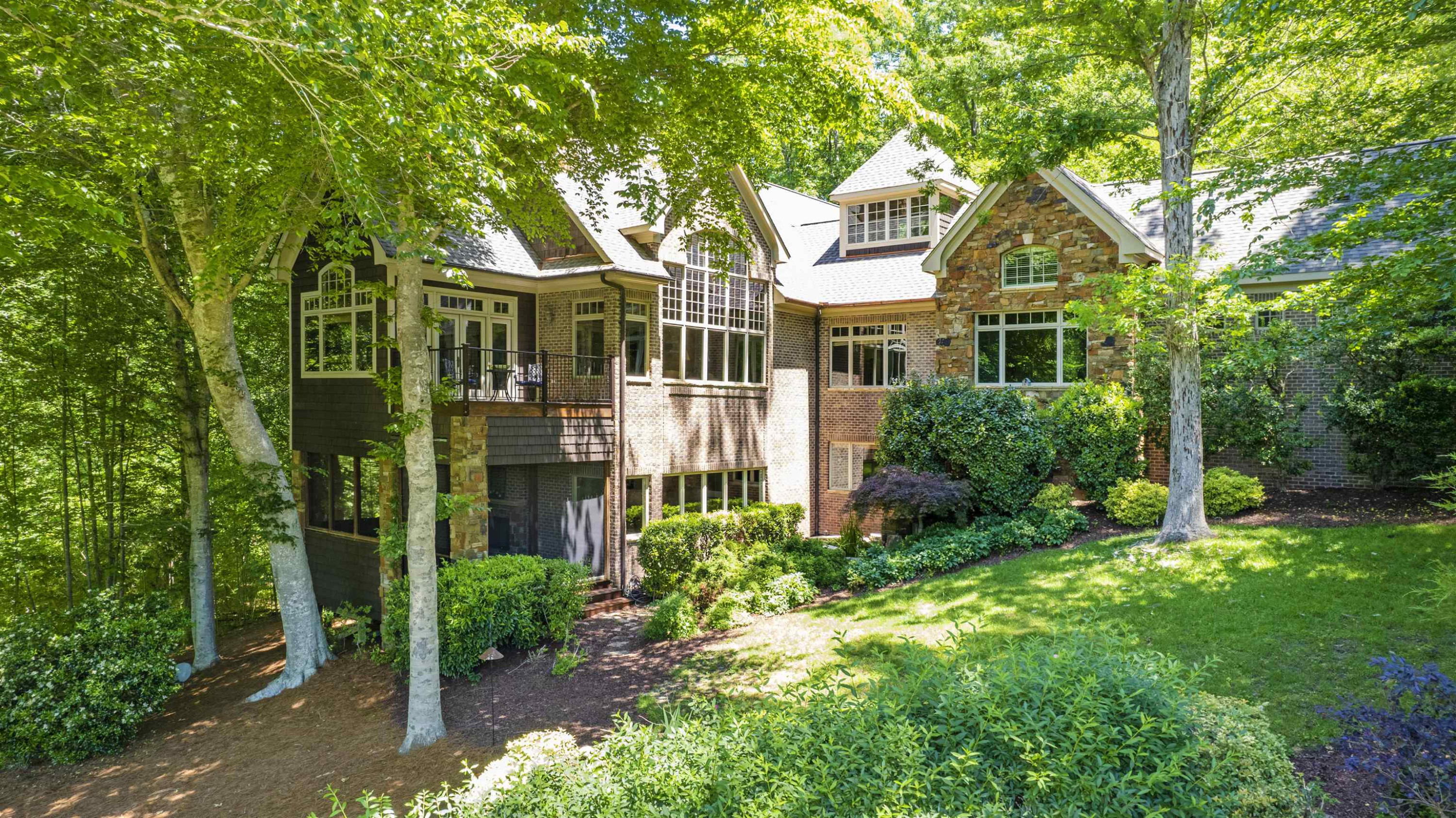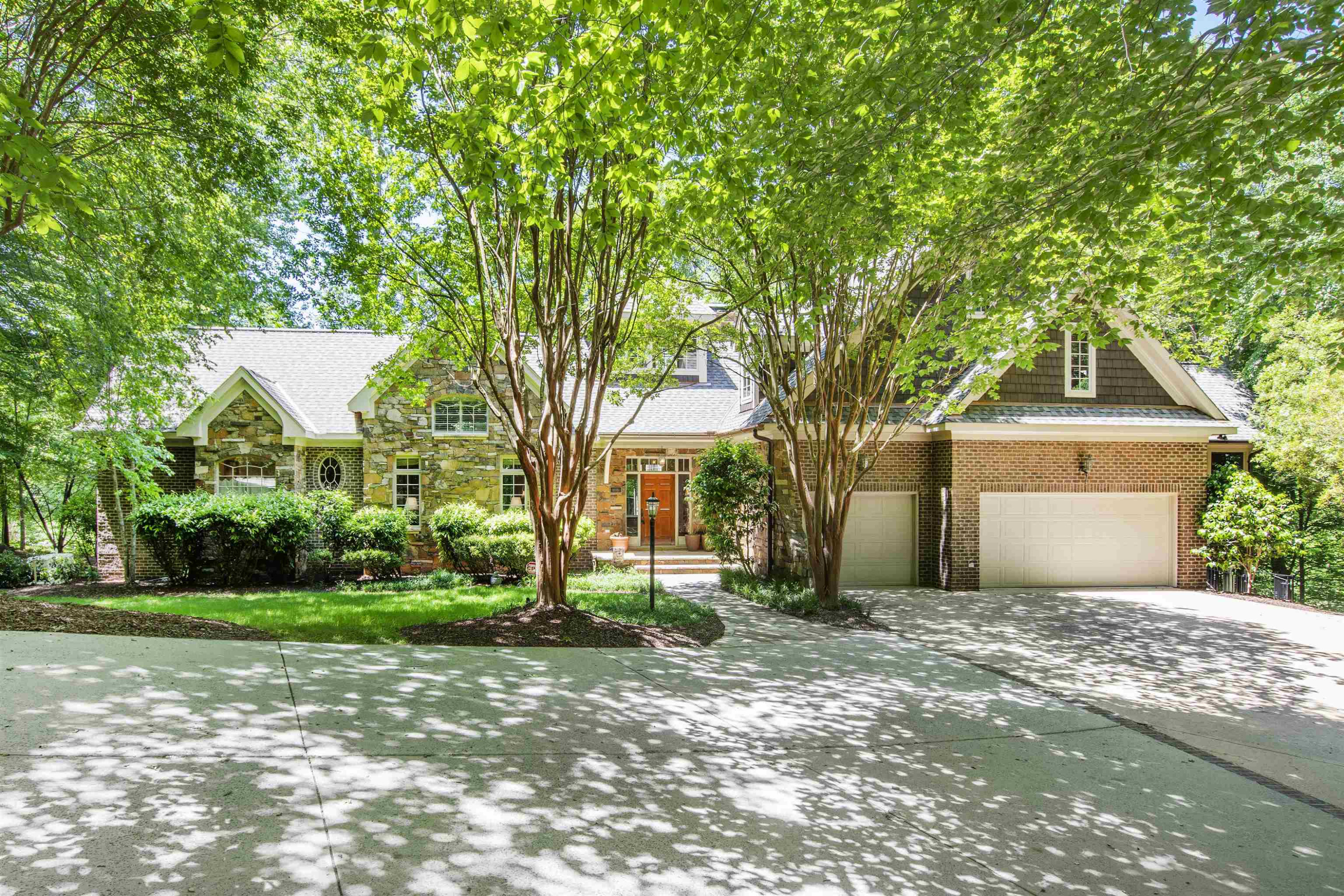 Experience your private mountain estate minutes from downtown Chapel Hill. On a 1.09 acre lot at the end of its own road, this stone and brick masterpiece features a long view of fairway and mountain, near views of a pond and golf course and 180 degree views of woods and Cub Creek. Two decks, sunroom and screened porch on the main level and Phantom screened porch on lower level with hot tub and fireplace. Recently renovated - new gourmet kitchen, floors, paint. Roof replaced in 2022. Wine cellar.