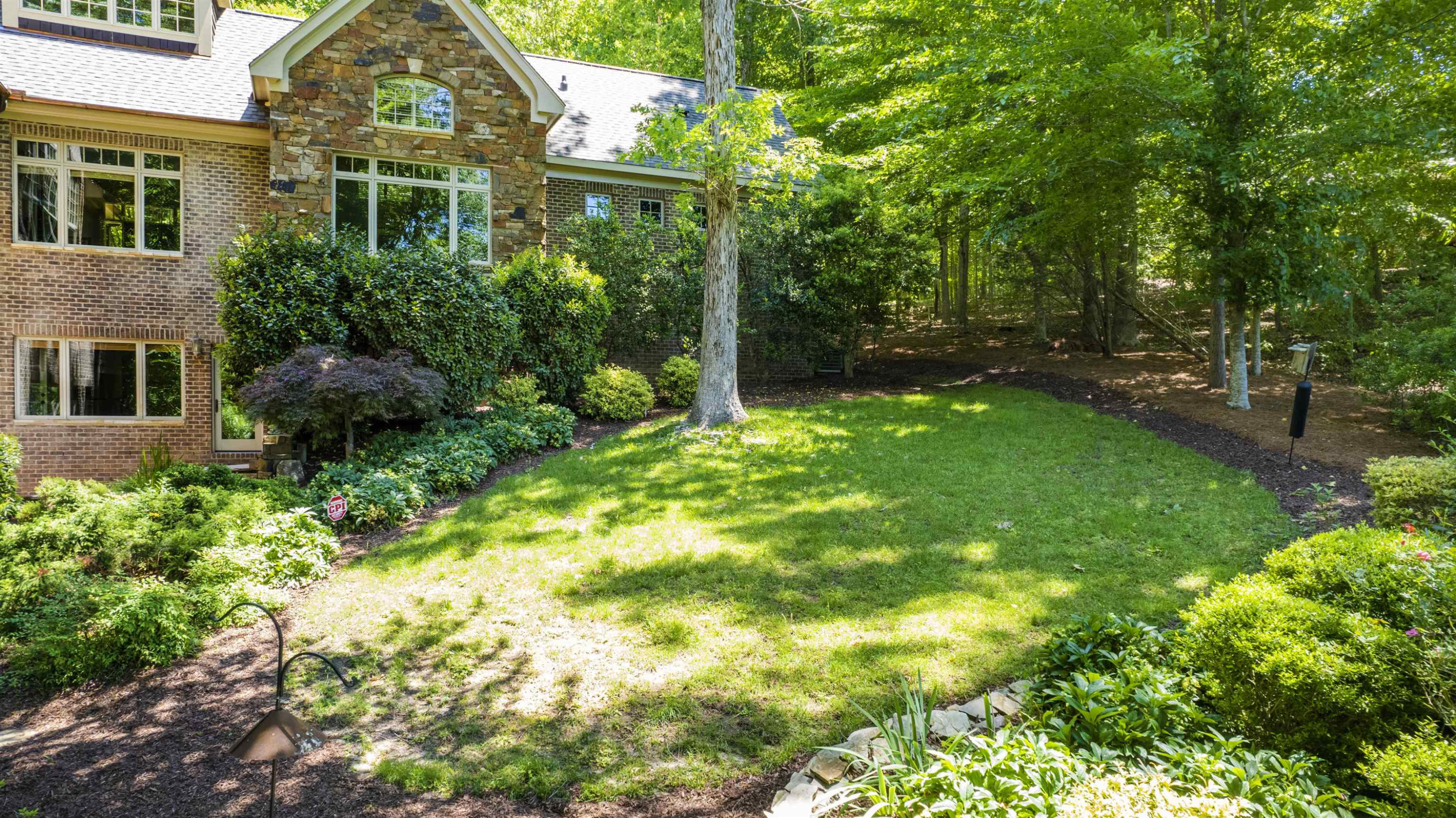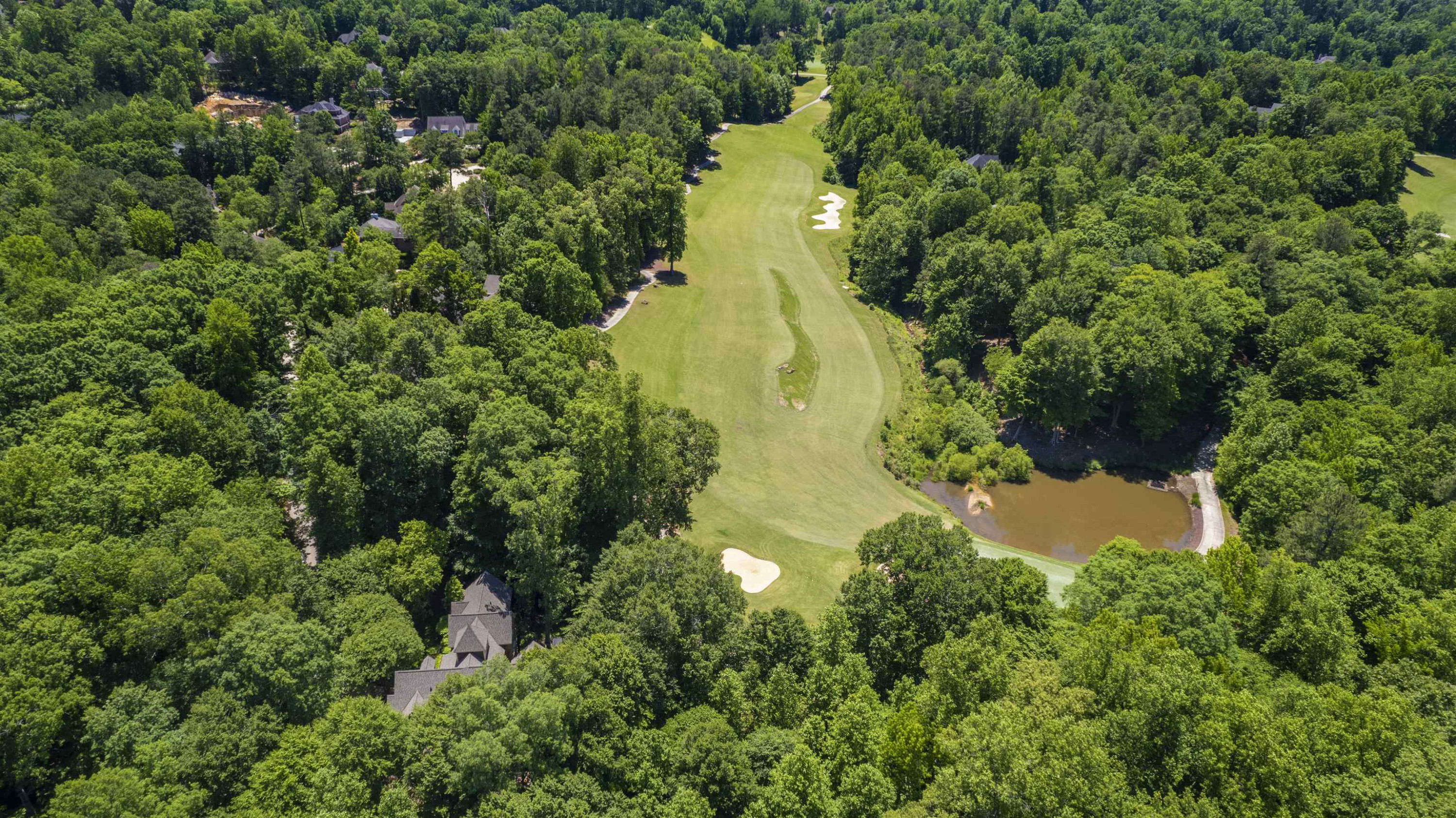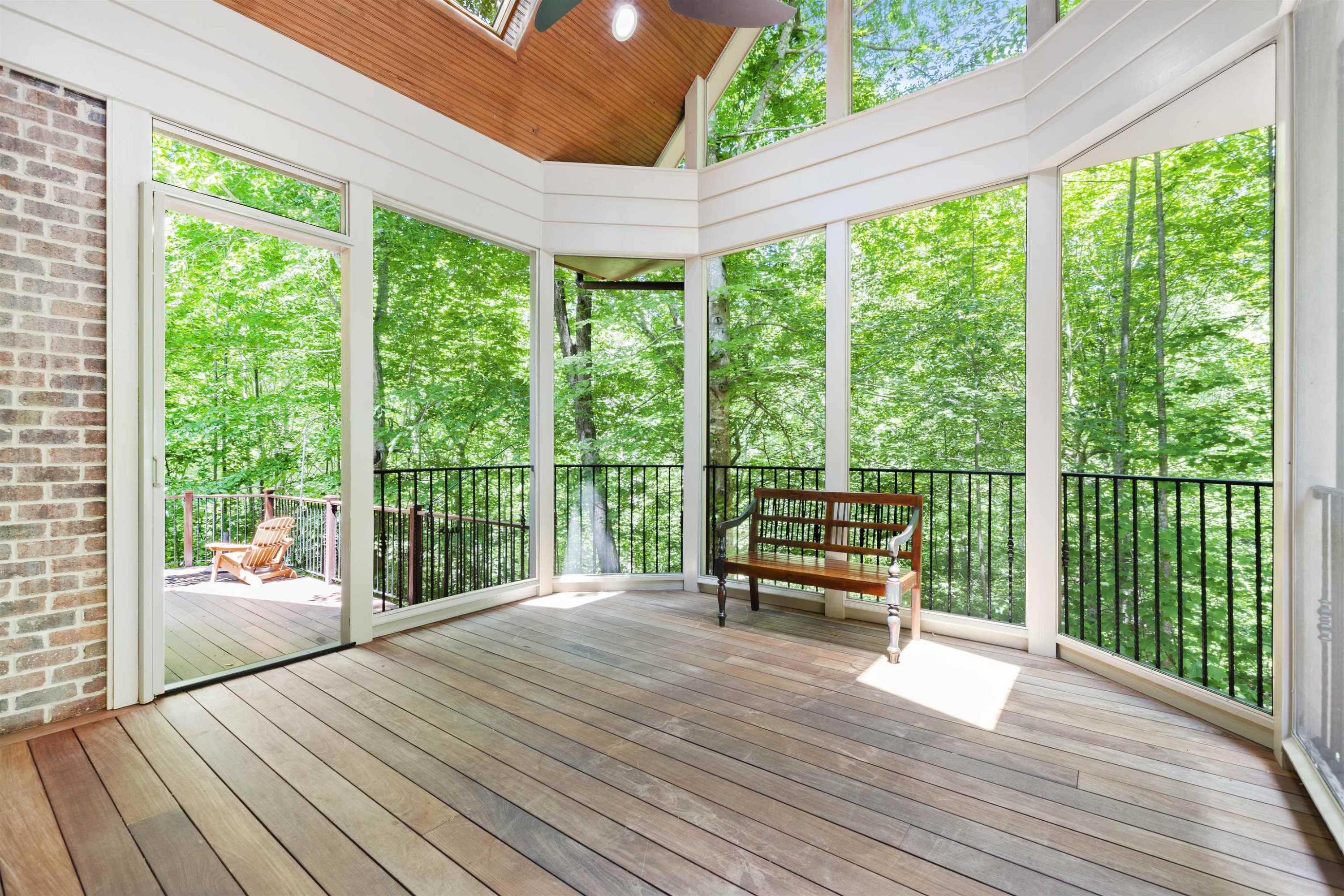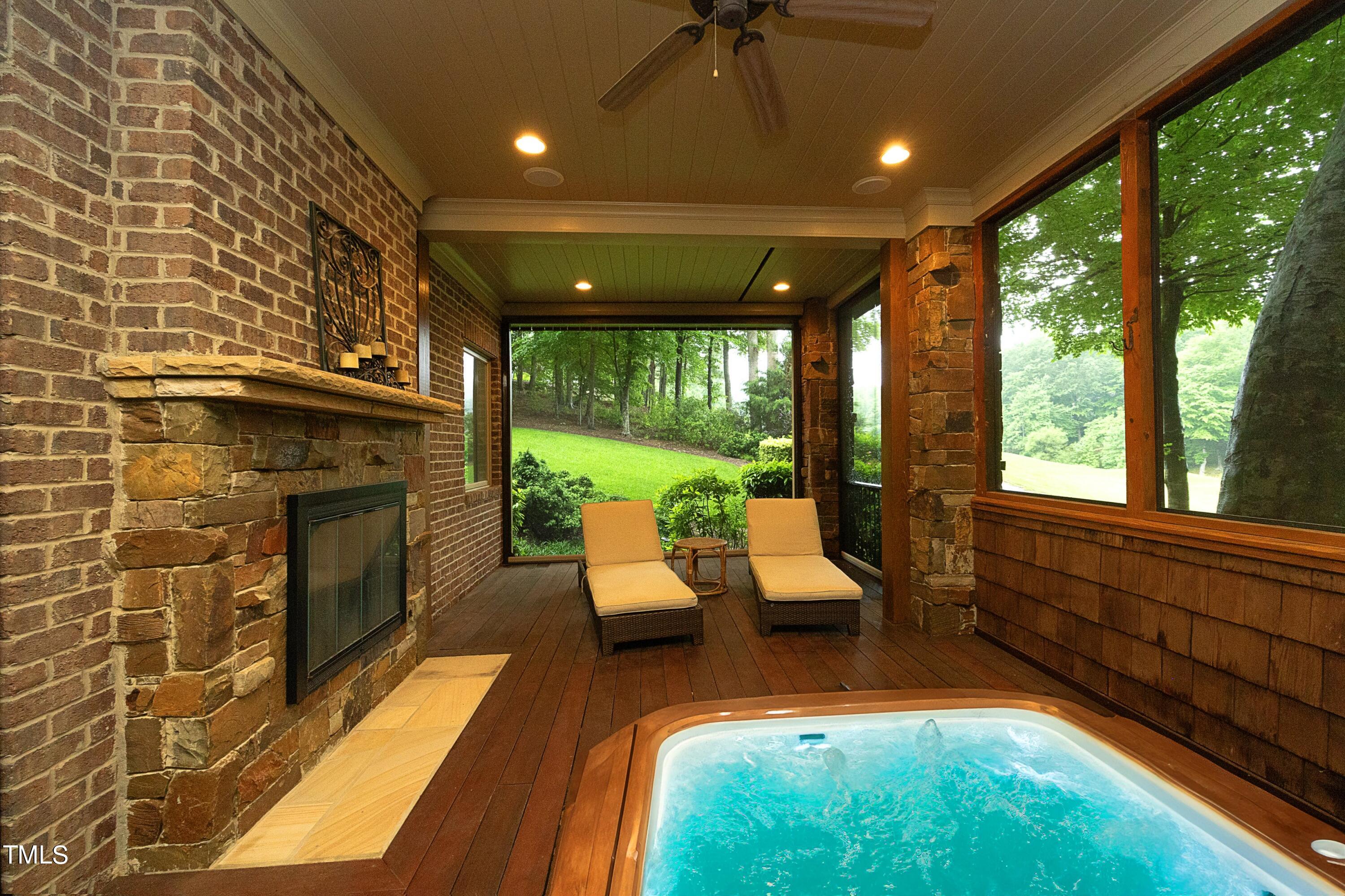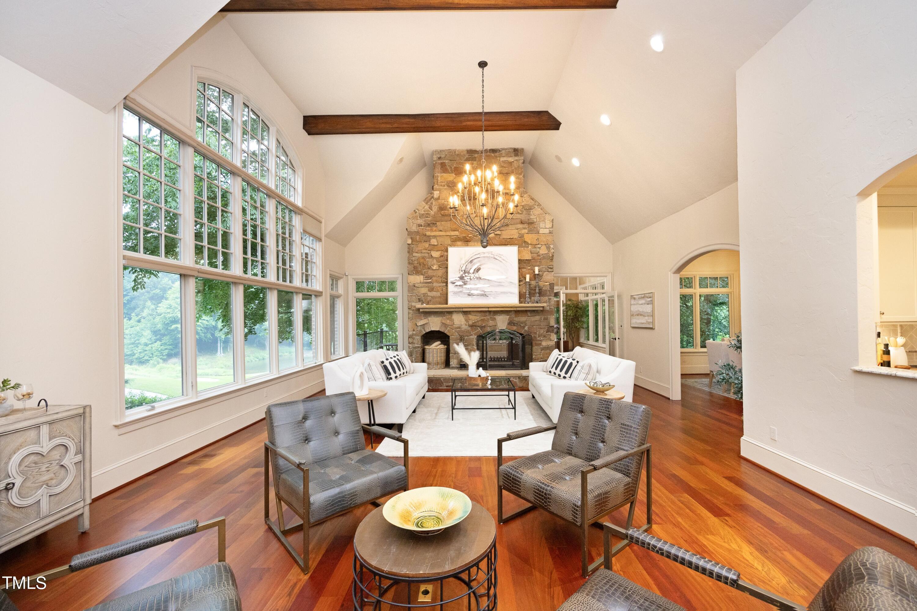 Experience your private mountain estate minutes from downtown Chapel Hill. On a 1.09 acre lot at the end of its own road, this stone and brick masterpiece features a long view of fairway and mountain, near views of a pond and golf course and 180 degree views of woods and Cub Creek. Two decks, sunroom and screened porch on the main level and Phantom screened porch on lower level with hot tub and fireplace. Recently renovated - new gourmet kitchen, floors, paint. Roof replaced in 2022. Wine cellar.