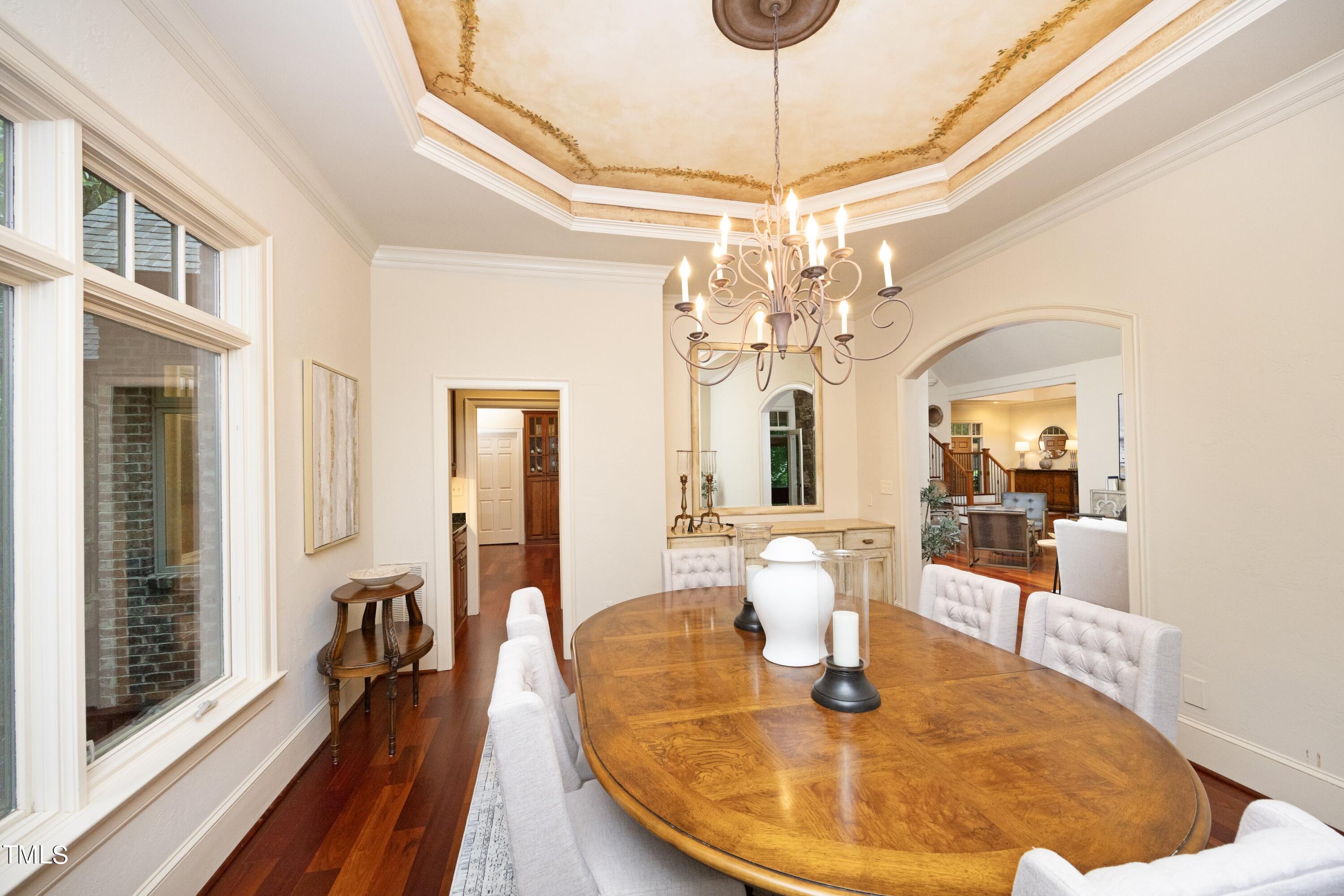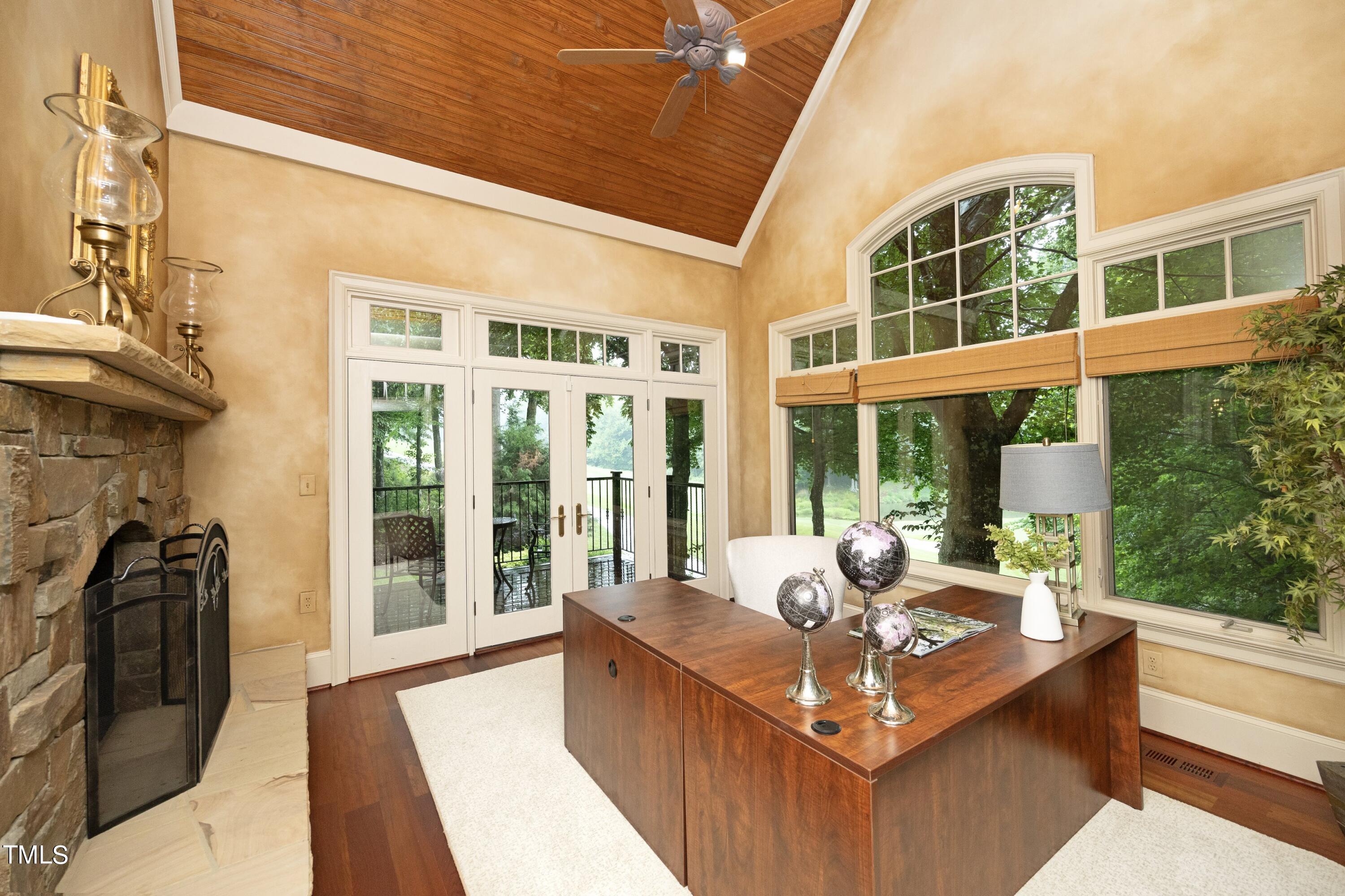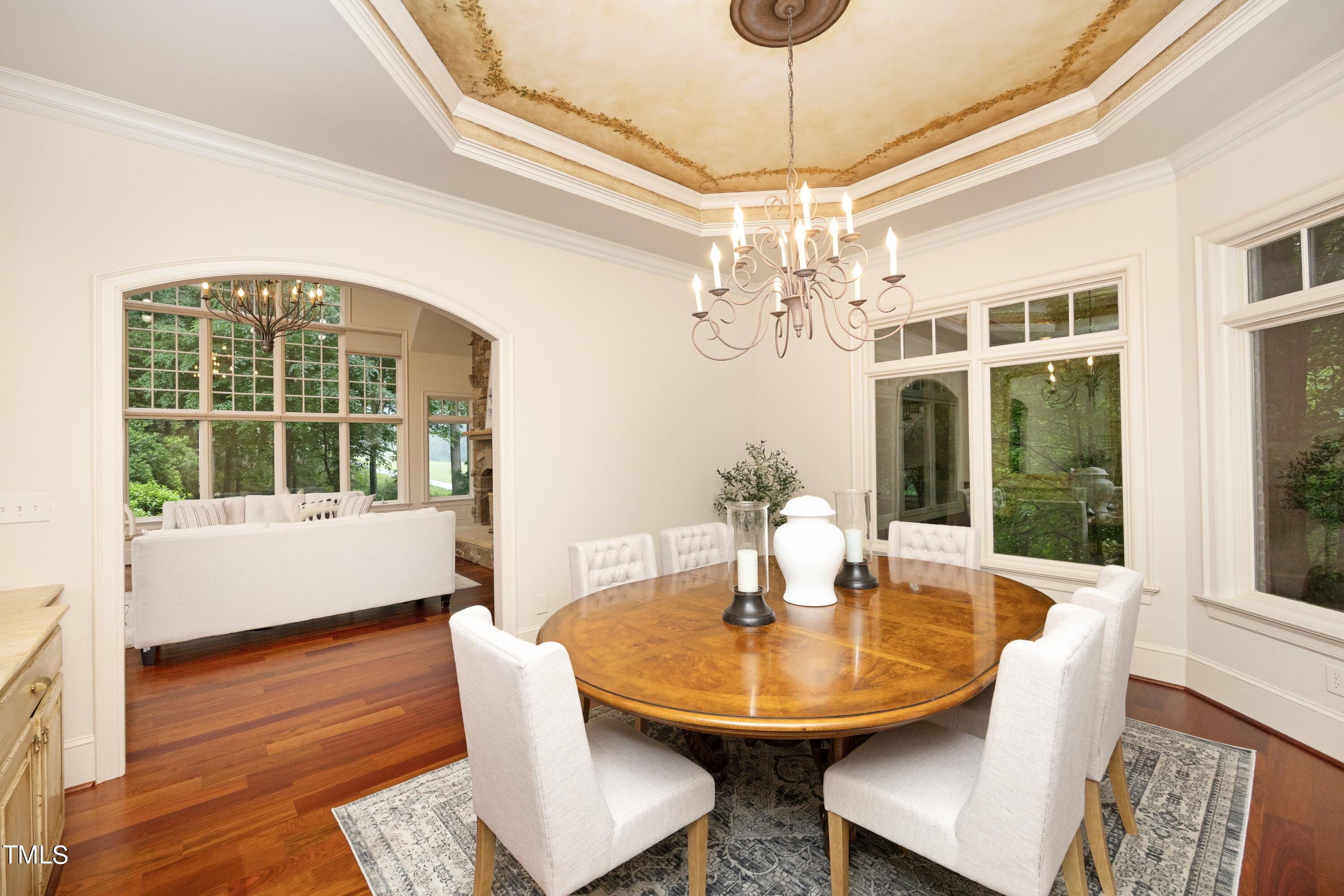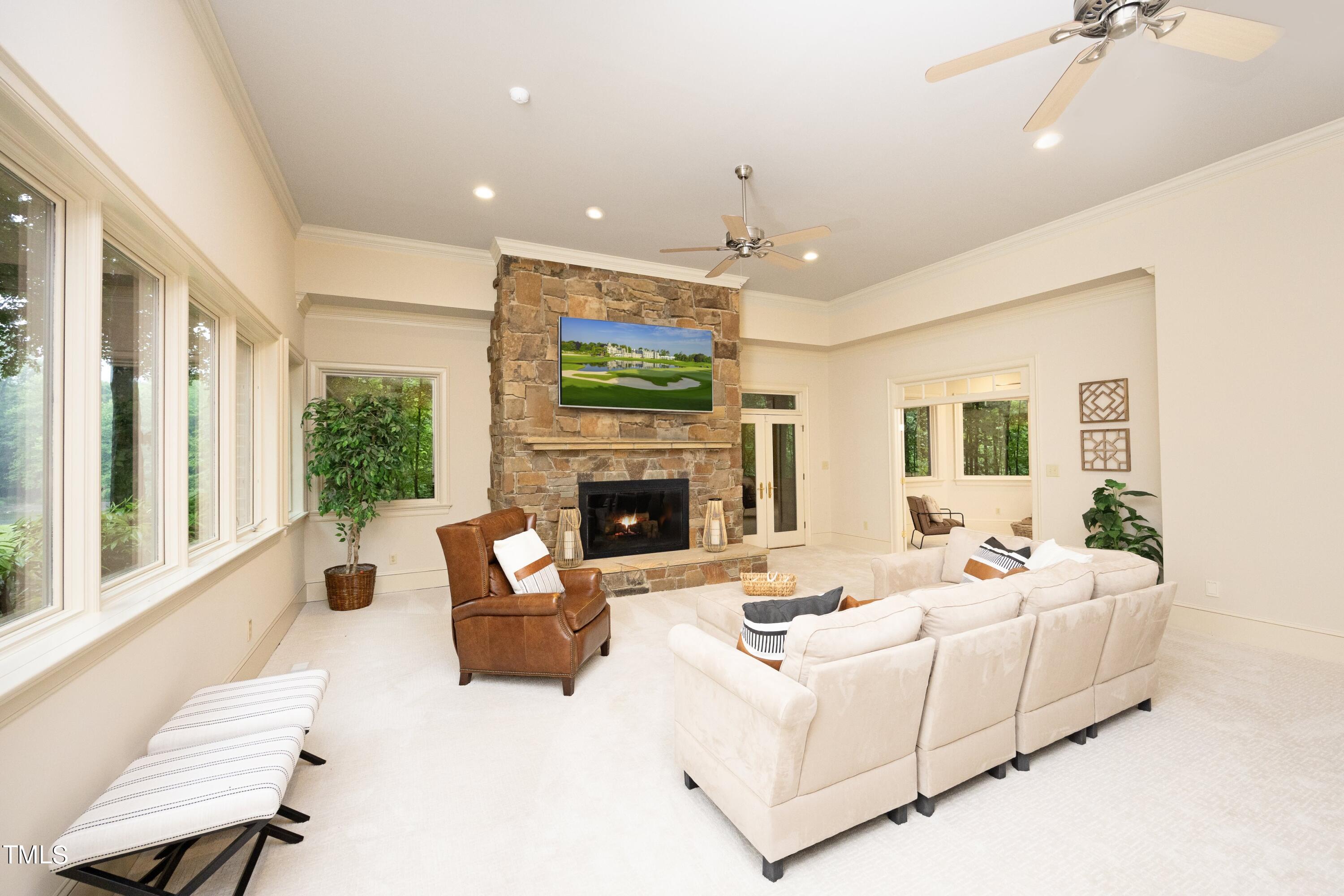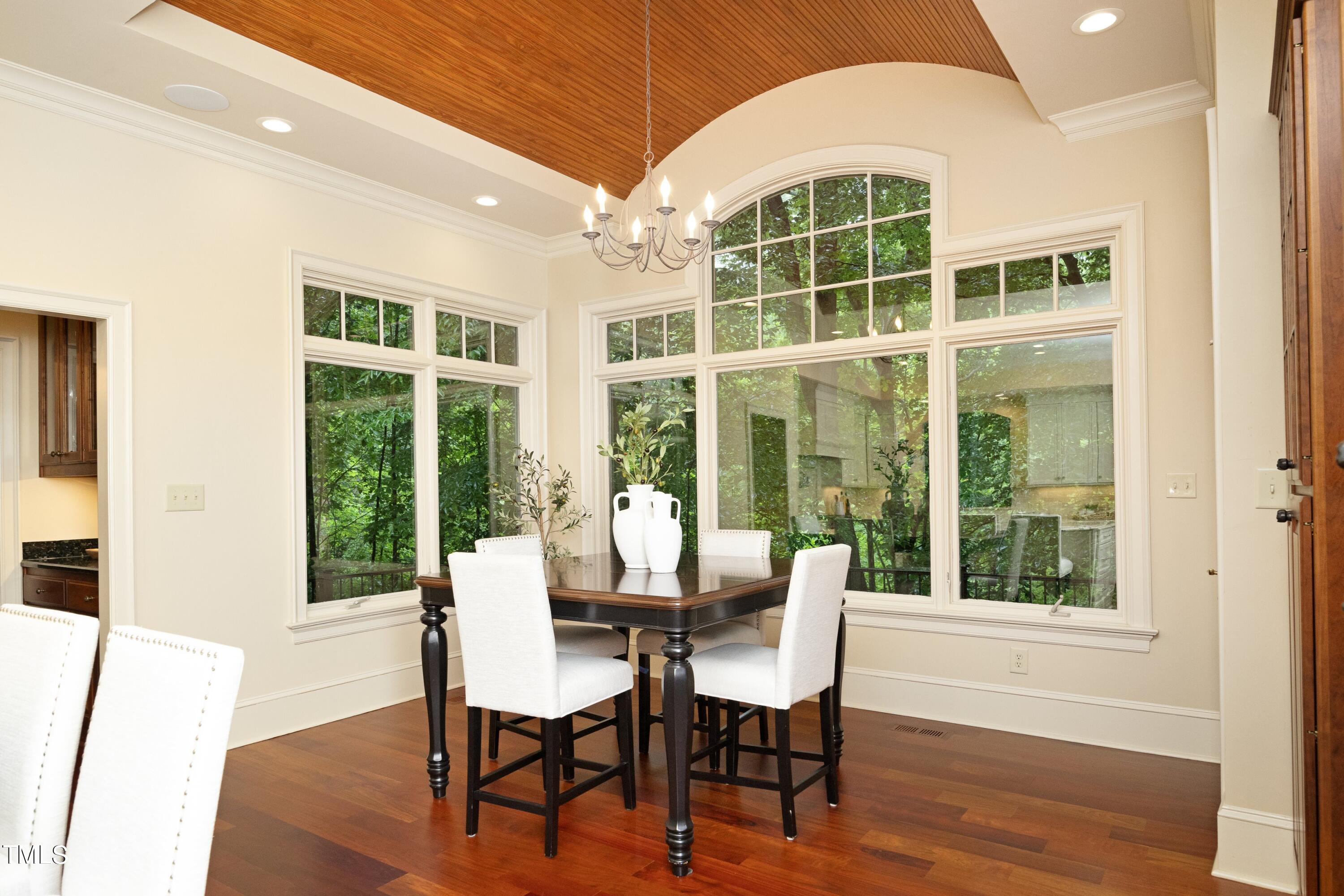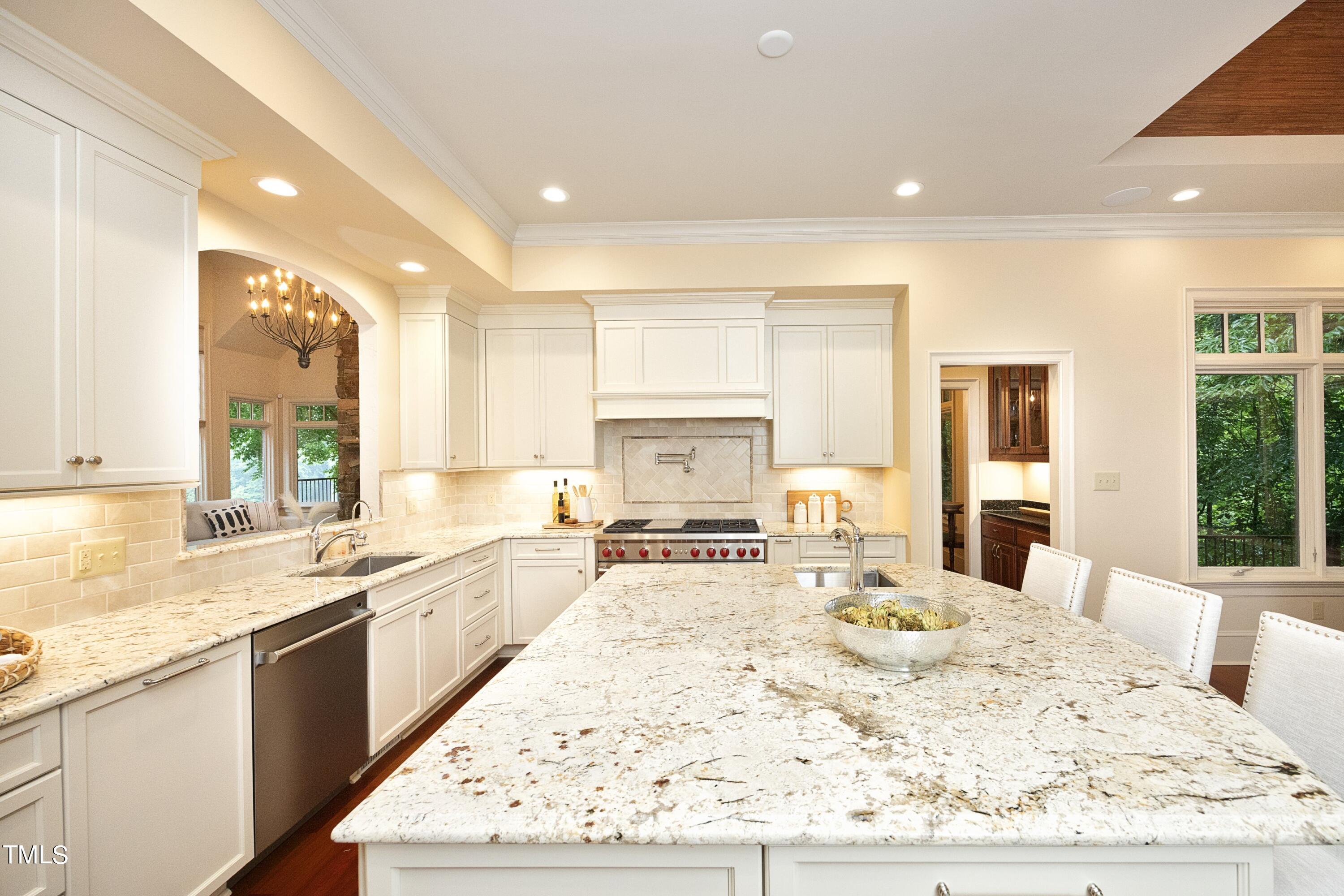 Experience your private mountain estate minutes from downtown Chapel Hill. On a 1.09 acre lot at the end of its own road, this stone and brick masterpiece features a long view of fairway and mountain, near views of a pond and golf course and 180 degree views of woods and Cub Creek. Two decks, sunroom and screened porch on the main level and Phantom screened porch on lower level with hot tub and fireplace. Recently renovated - new gourmet kitchen, floors, paint. Roof replaced in 2022. Wine cellar.