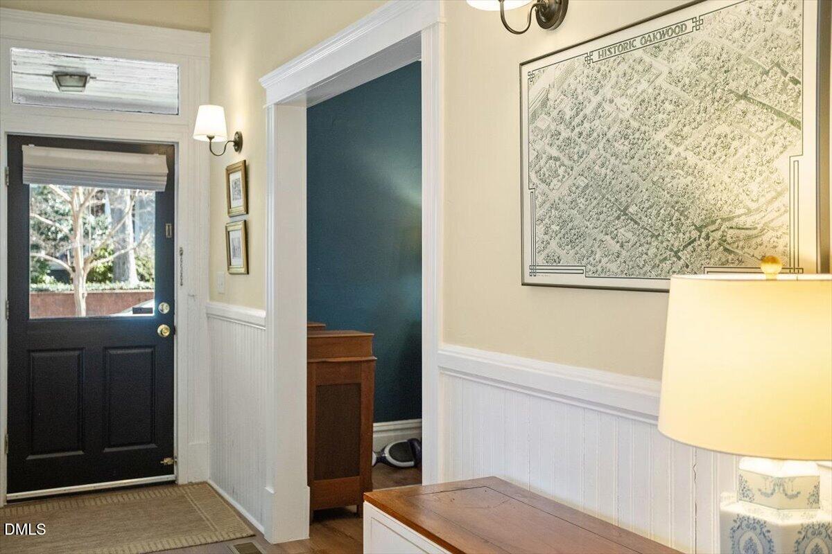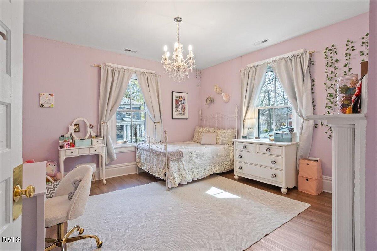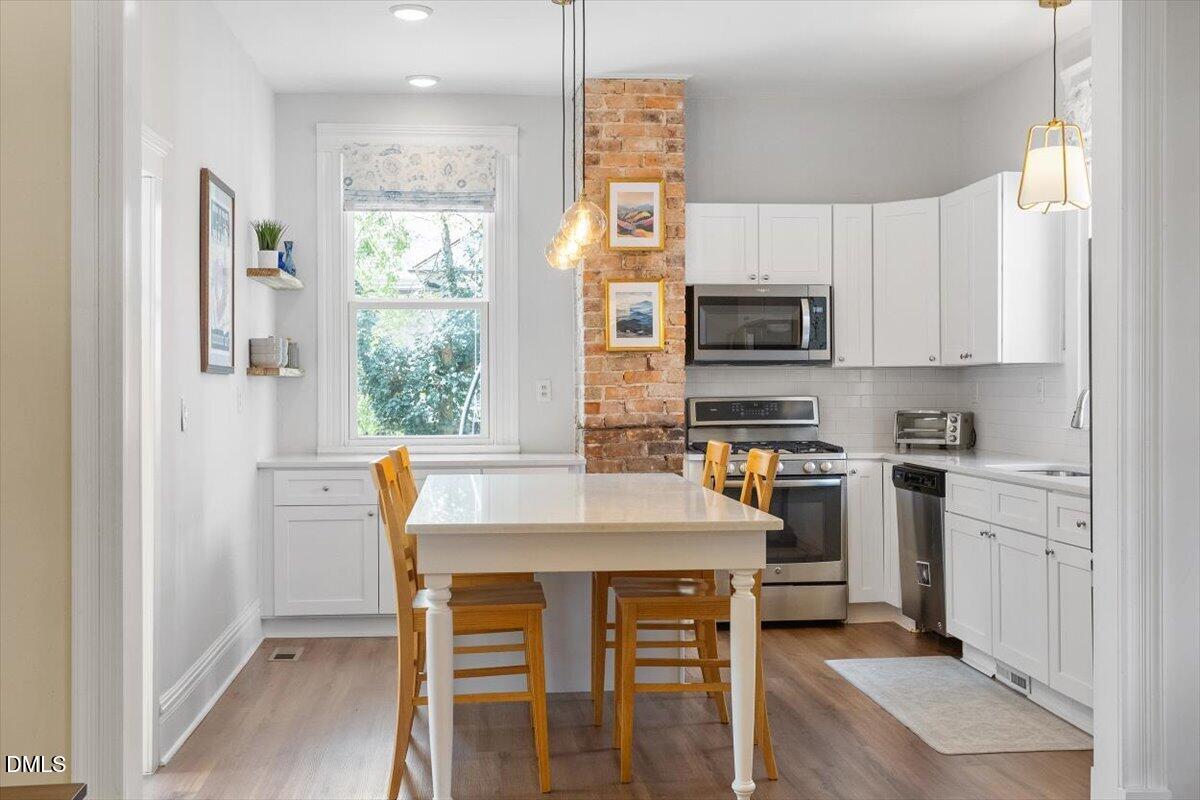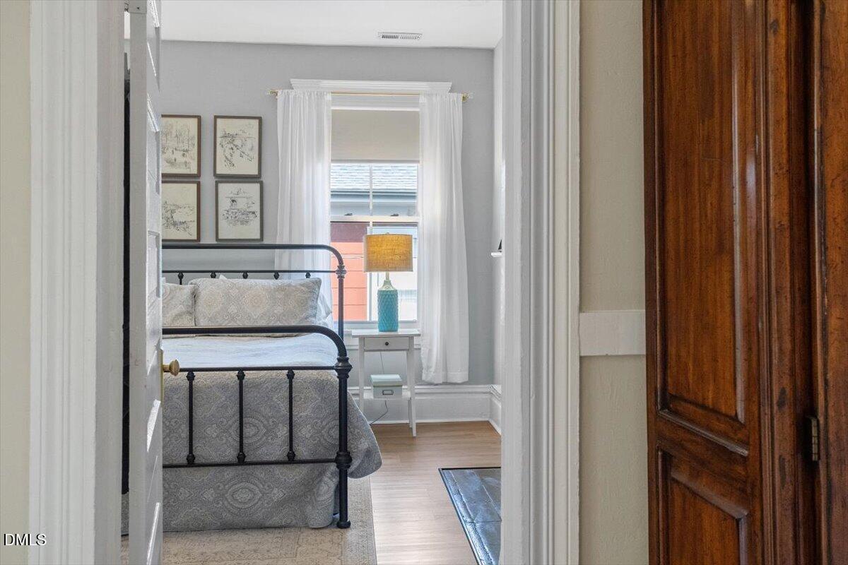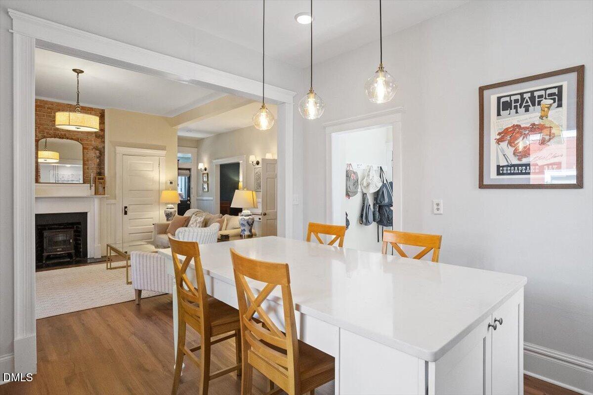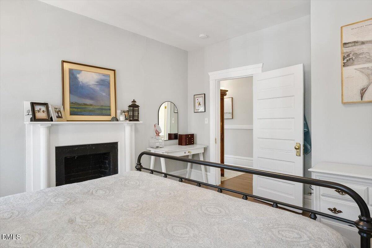 A classic Queen Anne frame two-story in Historic Oakwood, the Fleming-Smith House c.1908, was tastefully reimagined back into a single residence. Work recently completed in 2025 highlights original charm while leaning into significant modern updates. Brilliantly-lit renovated kitchen anchors the architectural ell to the rear while opening to the living room. Touches of exposed brick are easy to view with 10' ceilings. A new stairwell connects to the traditional bedroom layouts on the second floor. Bathroom updates offer a large bathroom with tub, and shower option on main level, both with timeless aesthetic. Lap wood siding, integrated front porch, two-over-two windows and slate roof with scalloped accents all retain integrity of the original intent in exterior construction and design. A brilliant location and property in which to embrace the history of Downtown Raleigh.