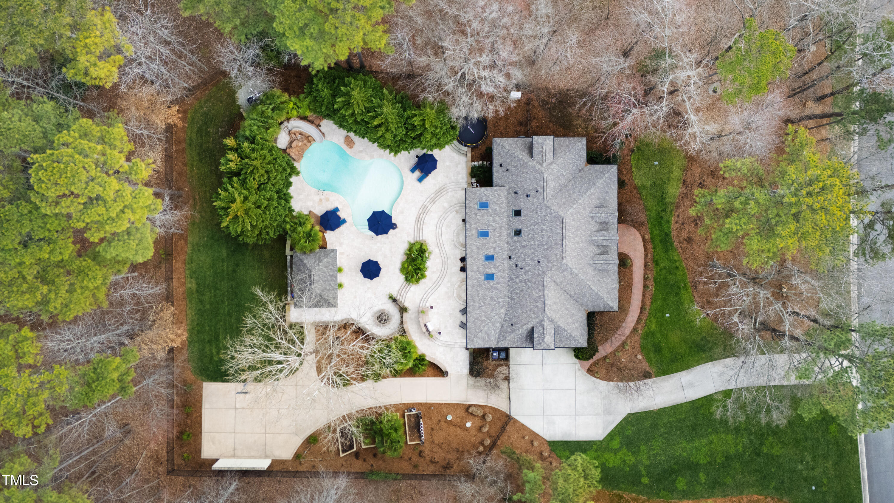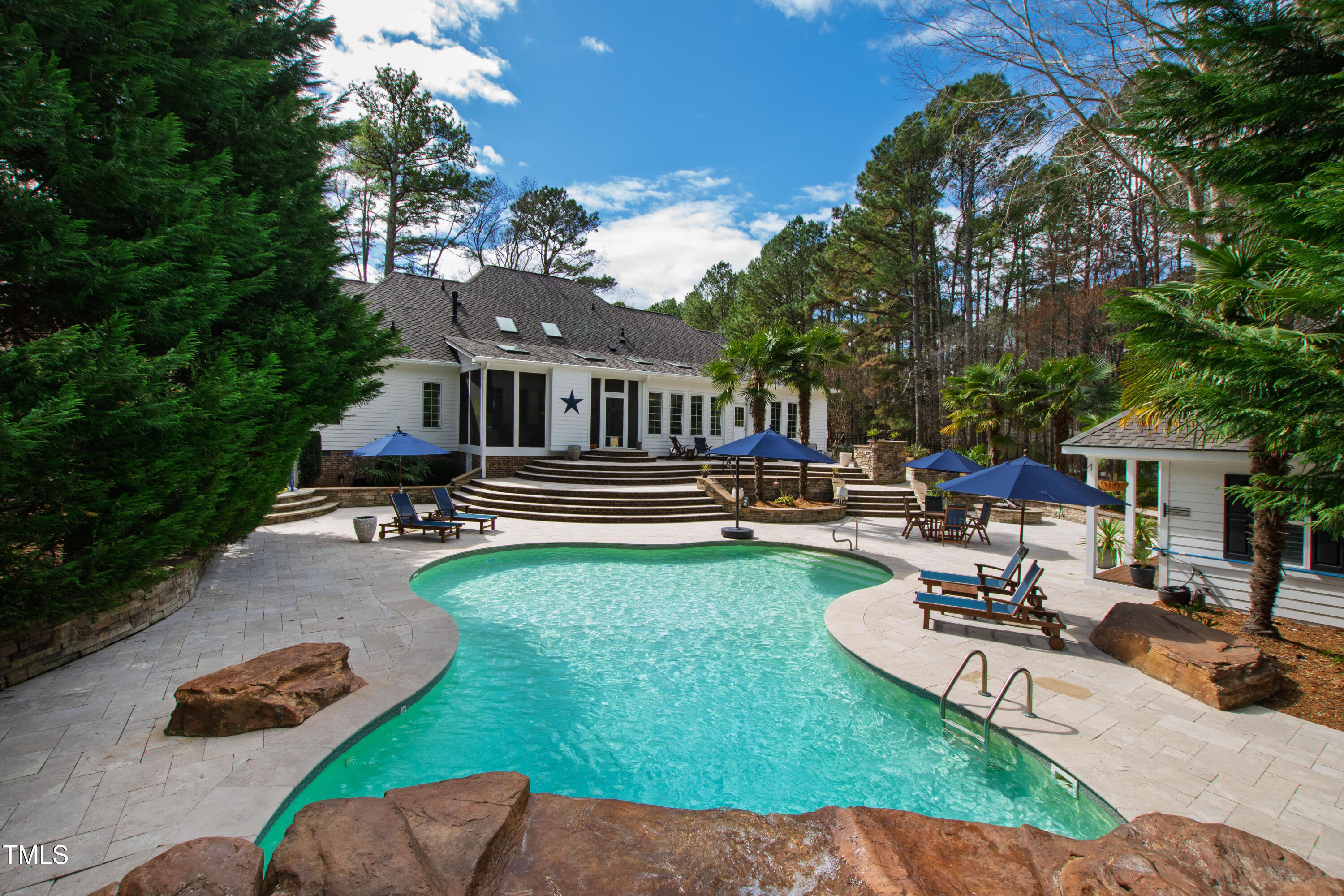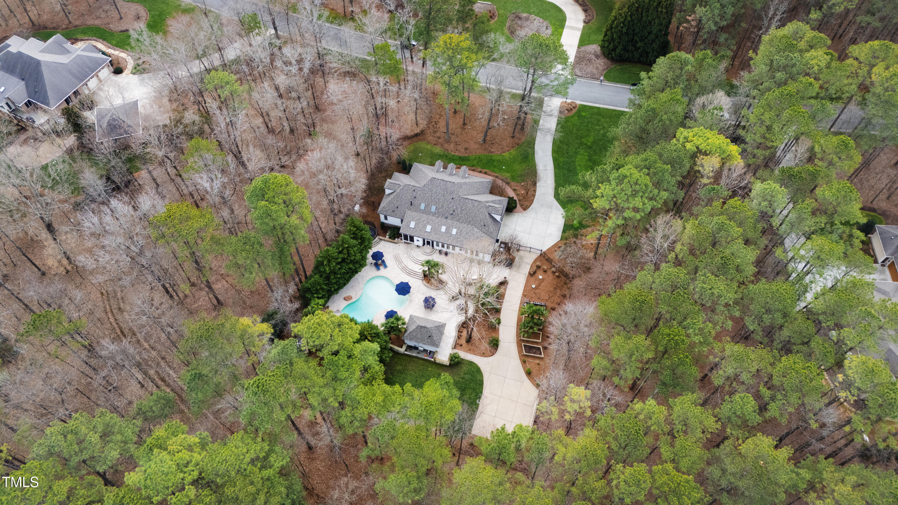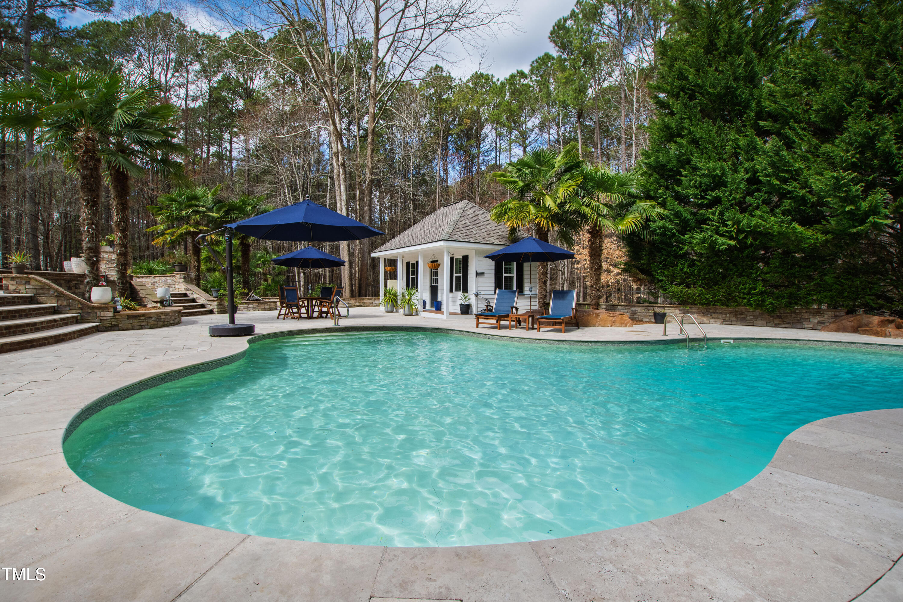 Don't miss the cleverly designed wine closet, a highlight created by the current owners. The spacious laundry room and an inviting first-floor office overlooking the pool area add to the home's appeal. With 4 bedrooms and 4.5 baths, plus a large bonus room currently serving as a gym, this home includes a primary suite that flows seamlessly into a cozy TV room and family room. Abundant windows fill the space with natural light, enhancing the home's welcoming atmosphere. Perfect for entertaining, the floor plan is designed for both indoor and outdoor gatherings. The beautifully landscaped exterior, featuring delightful terraces for al fresco dining, along with a stunning salt water pool, exudes resort-style living. Surrounded by beautiful palm trees, imagine sipping a cocktail or two in this tropical paradise. The pool house, measuring 176.70 square feet, not included in the living area square footage of the house, includes a beautiful kitchen with an induction cooktop and refrigerator, as well as a full bathroom, making it ideal for guests and entertaining while ensuring privacy. Experience the serene lifestyle that 106 Woodkirk offers--a peaceful retreat from the everyday hustle and bustle, yet conveniently located near Chapel Hill, Durham, Duke, UNC, and I-40.