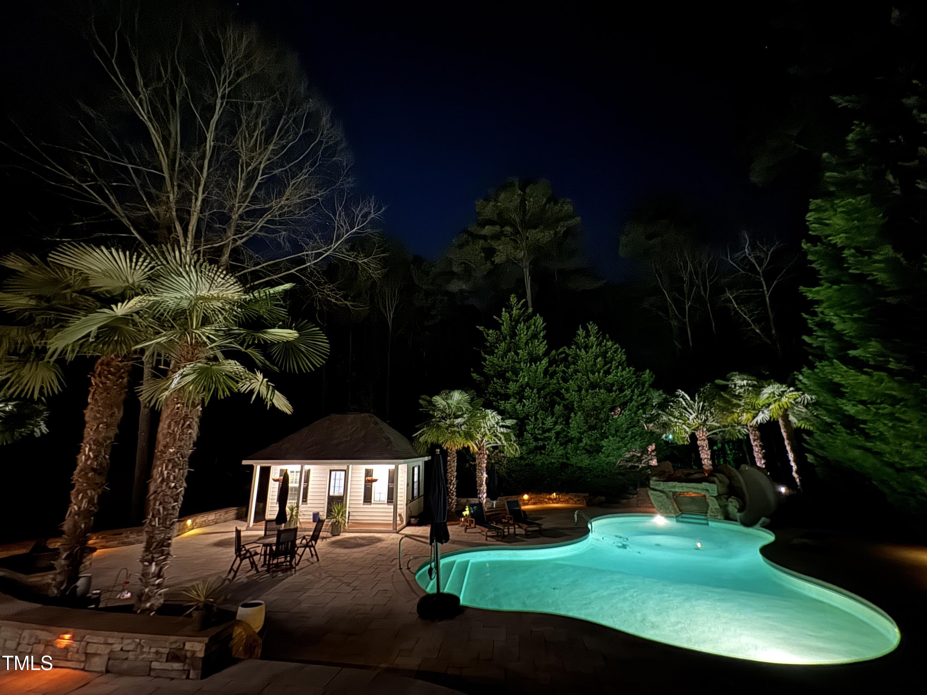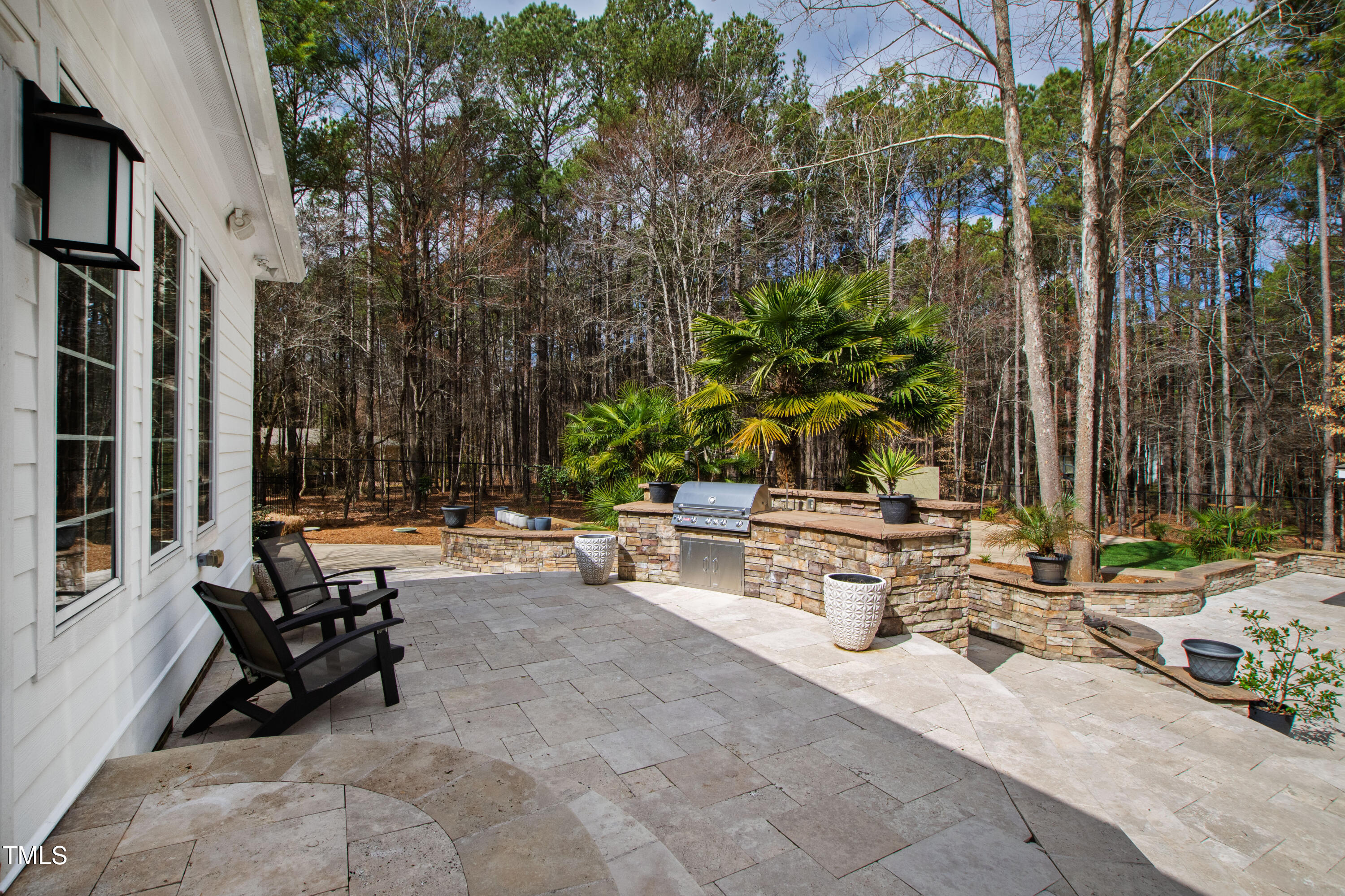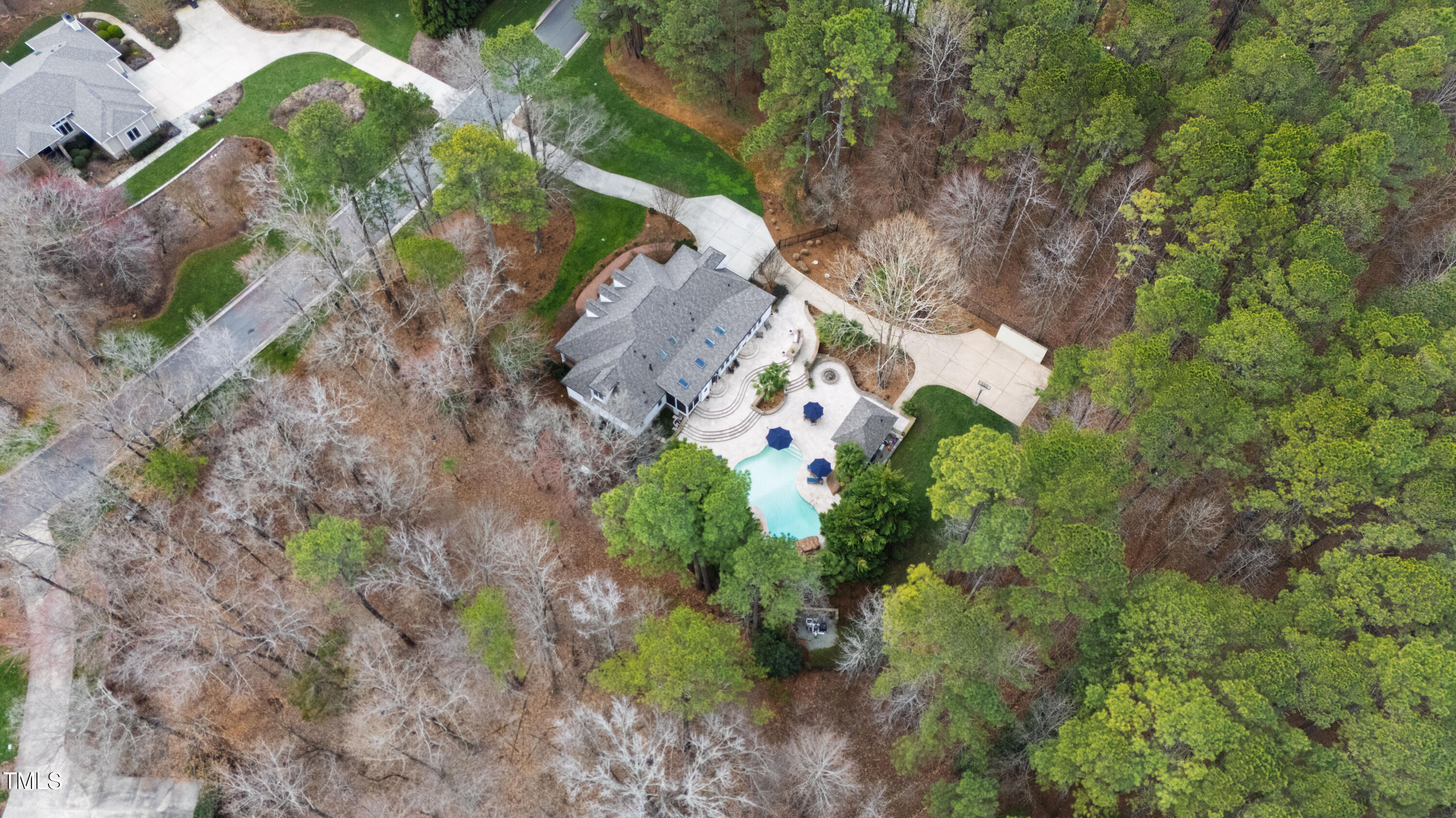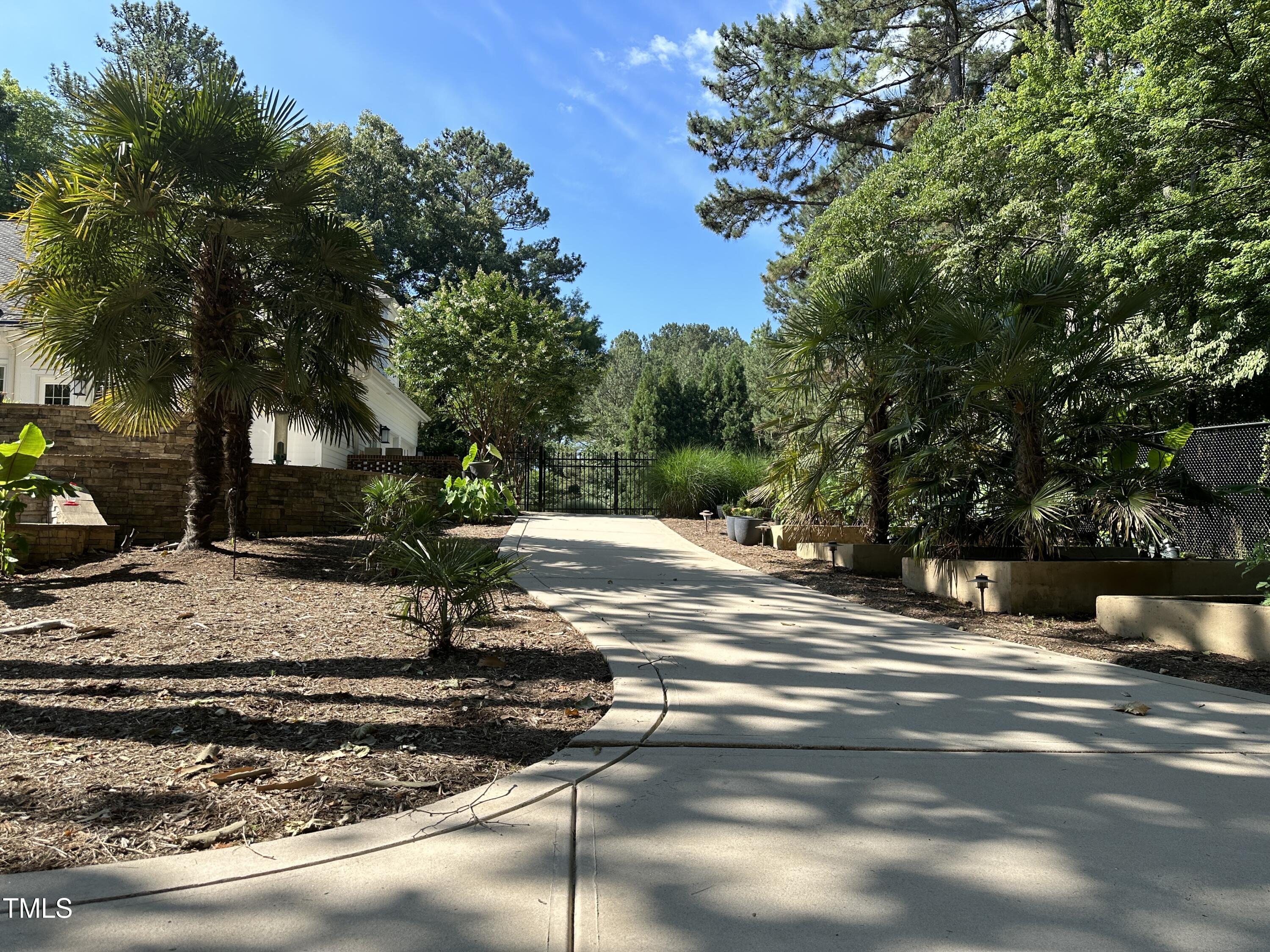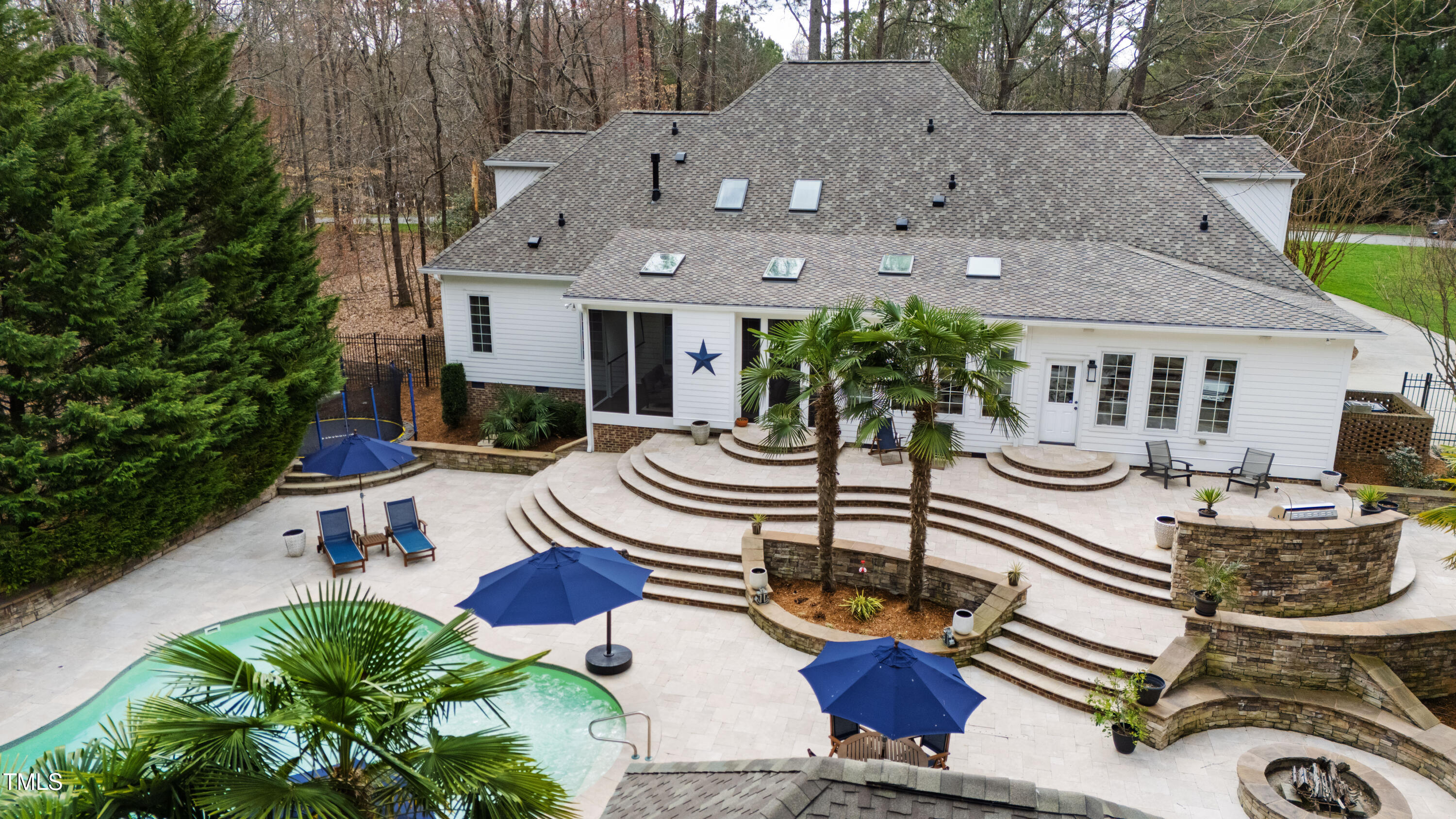 Don't miss the cleverly designed wine closet, a highlight created by the current owners. The spacious laundry room and an inviting first-floor office overlooking the pool area add to the home's appeal. With 4 bedrooms and 4.5 baths, plus a large bonus room currently serving as a gym, this home includes a primary suite that flows seamlessly into a cozy TV room and family room. Abundant windows fill the space with natural light, enhancing the home's welcoming atmosphere. Perfect for entertaining, the floor plan is designed for both indoor and outdoor gatherings. The beautifully landscaped exterior, featuring delightful terraces for al fresco dining, along with a stunning salt water pool, exudes resort-style living. Surrounded by beautiful palm trees, imagine sipping a cocktail or two in this tropical paradise. The pool house, measuring 176.70 square feet, not included in the living area square footage of the house, includes a beautiful kitchen with an induction cooktop and refrigerator, as well as a full bathroom, making it ideal for guests and entertaining while ensuring privacy. Experience the serene lifestyle that 106 Woodkirk offers--a peaceful retreat from the everyday hustle and bustle, yet conveniently located near Chapel Hill, Durham, Duke, UNC, and I-40.