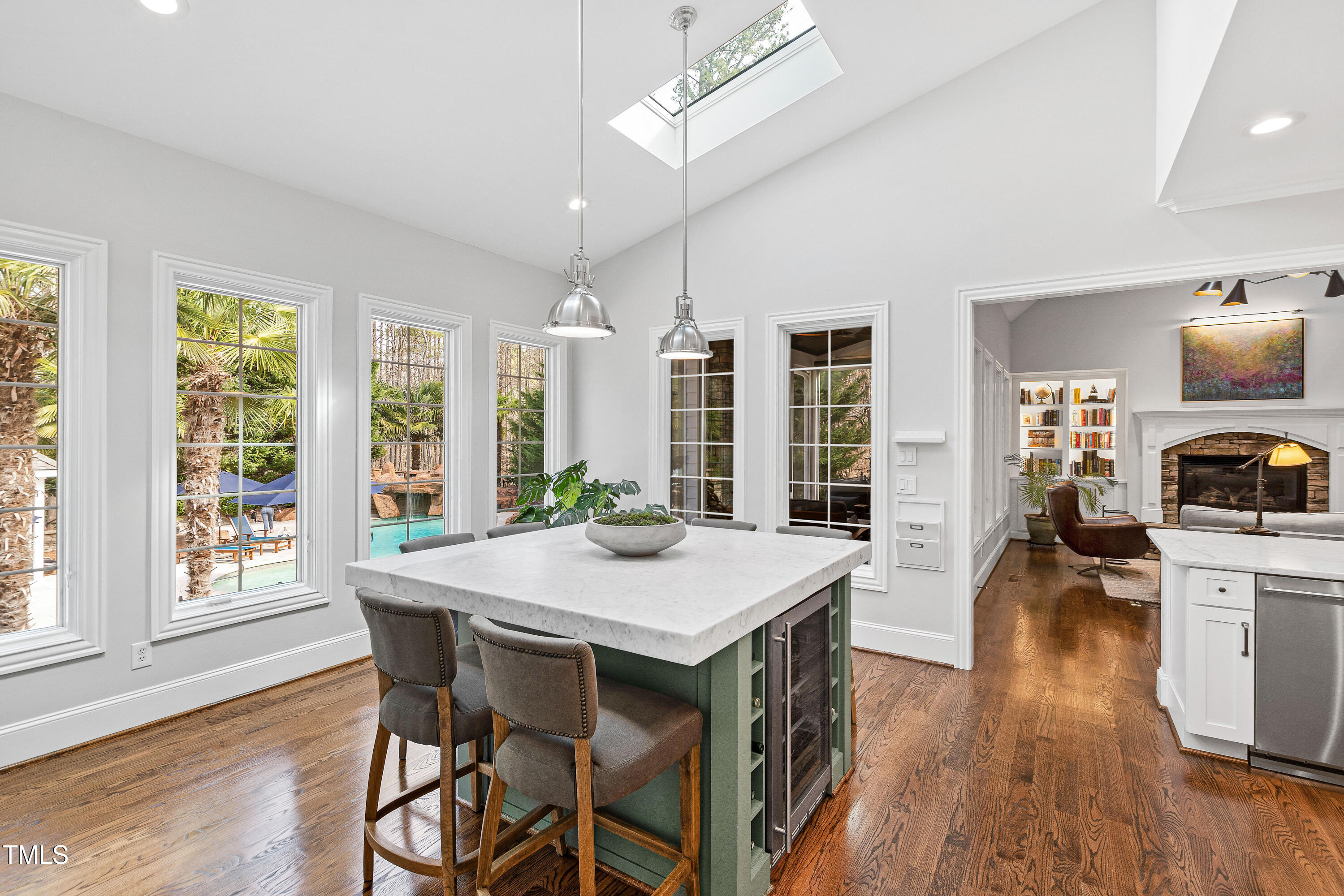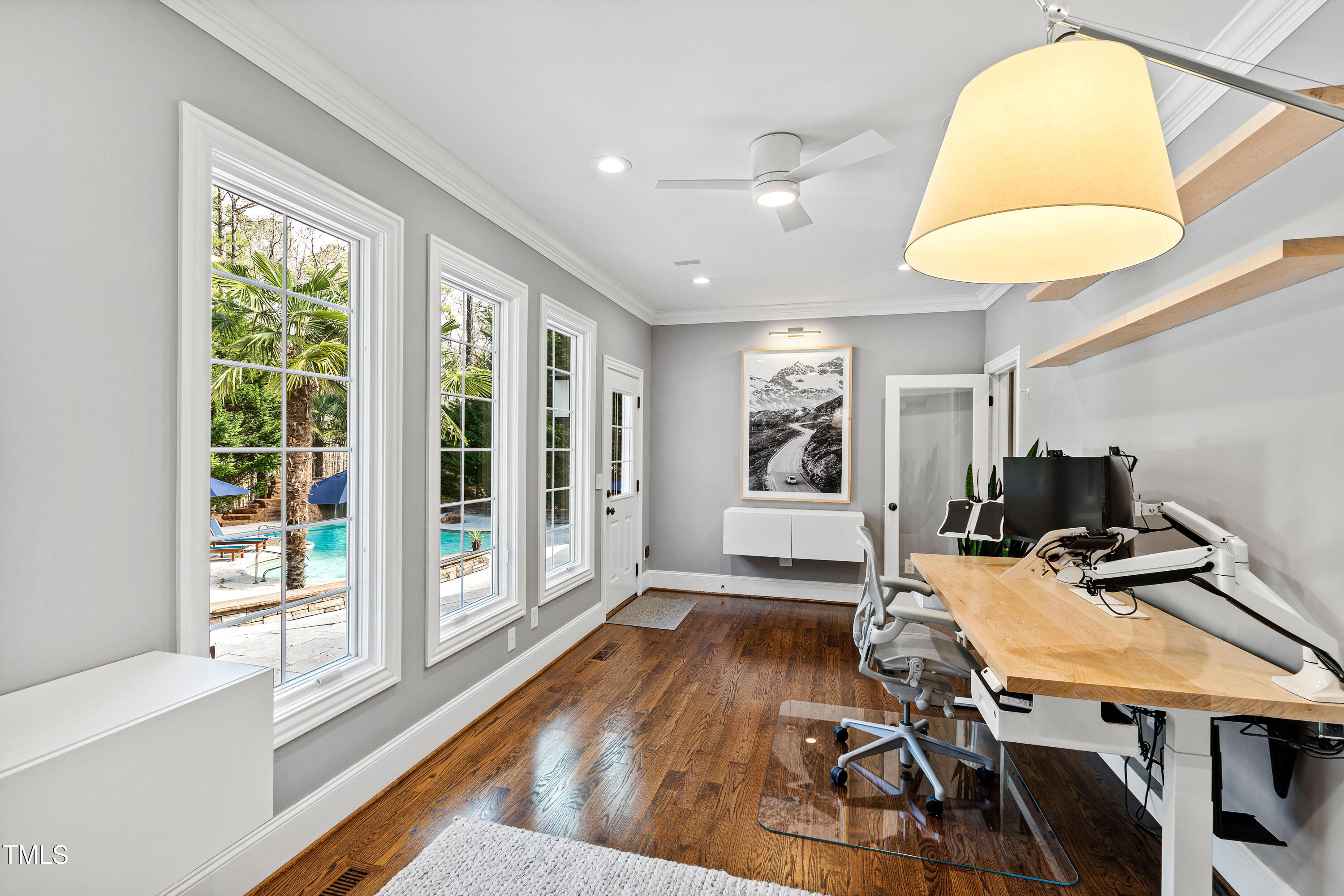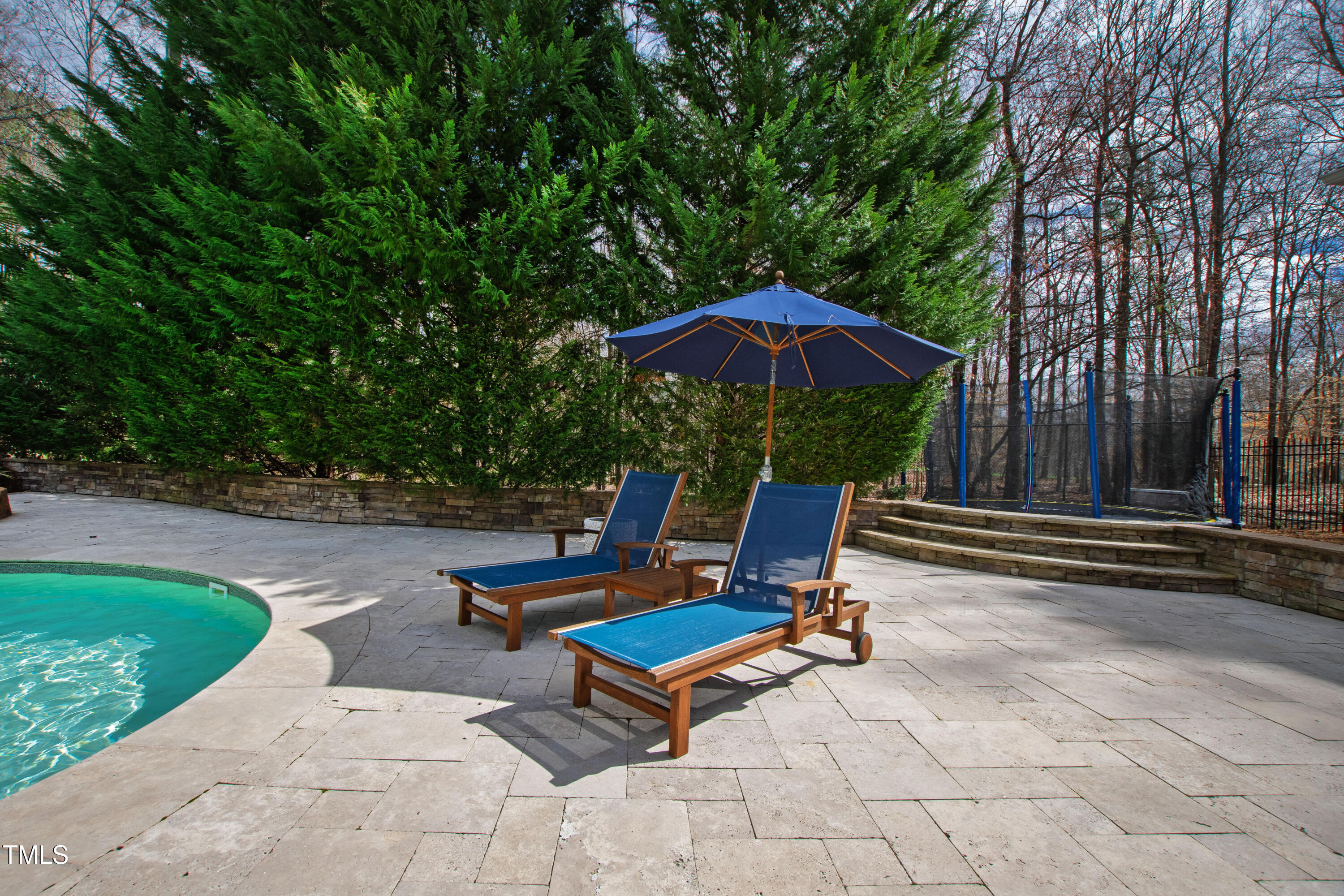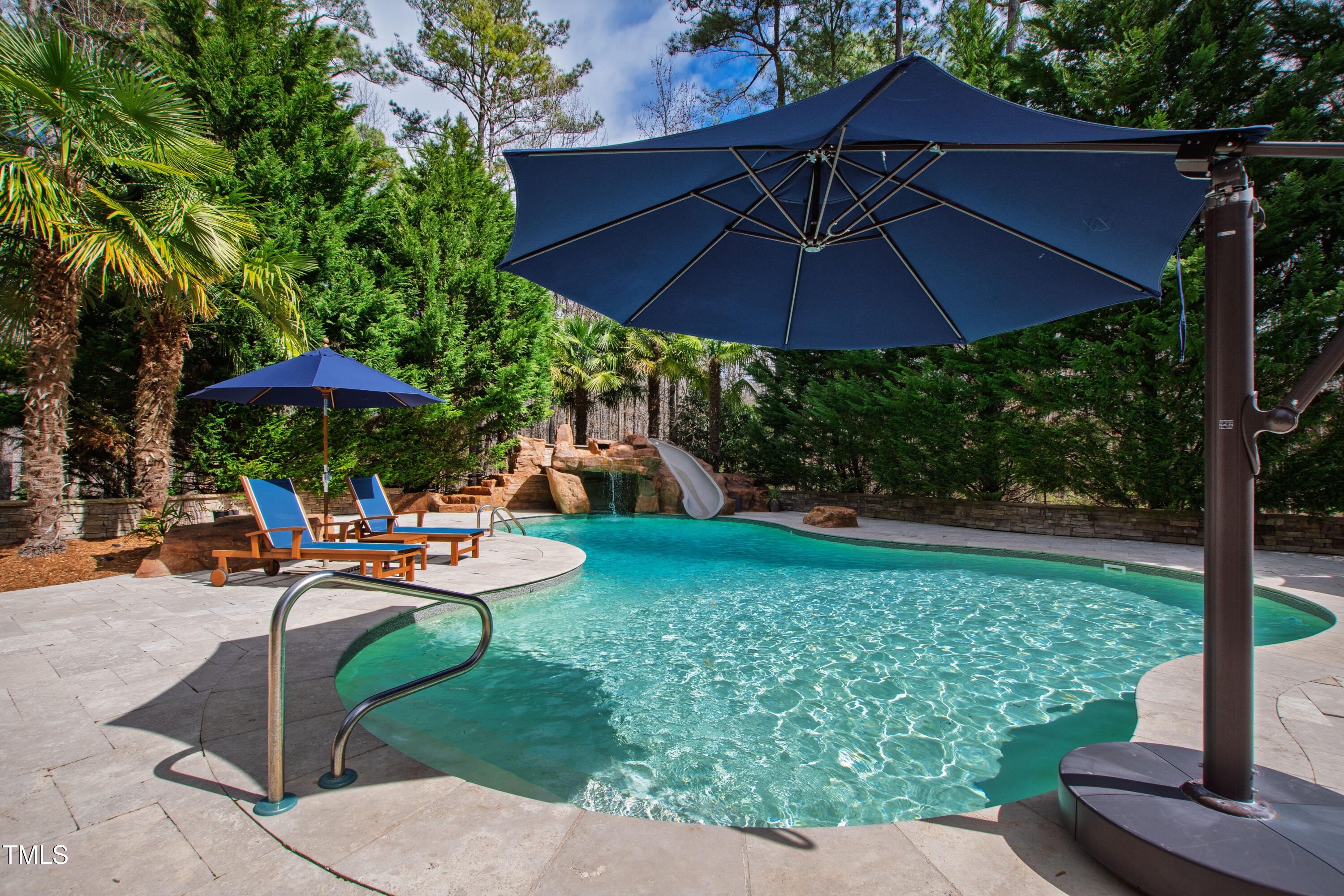 Don't miss the cleverly designed wine closet, a highlight created by the current owners. The spacious laundry room and an inviting first-floor office overlooking the pool area add to the home's appeal. With 4 bedrooms and 4.5 baths, plus a large bonus room currently serving as a gym, this home includes a primary suite that flows seamlessly into a cozy TV room and family room. Abundant windows fill the space with natural light, enhancing the home's welcoming atmosphere. Perfect for entertaining, the floor plan is designed for both indoor and outdoor gatherings. The beautifully landscaped exterior, featuring delightful terraces for al fresco dining, along with a stunning salt water pool, exudes resort-style living. Surrounded by beautiful palm trees, imagine sipping a cocktail or two in this tropical paradise. The pool house, measuring 176.70 square feet, not included in the living area square footage of the house, includes a beautiful kitchen with an induction cooktop and refrigerator, as well as a full bathroom, making it ideal for guests and entertaining while ensuring privacy. Experience the serene lifestyle that 106 Woodkirk offers--a peaceful retreat from the everyday hustle and bustle, yet conveniently located near Chapel Hill, Durham, Duke, UNC, and I-40.