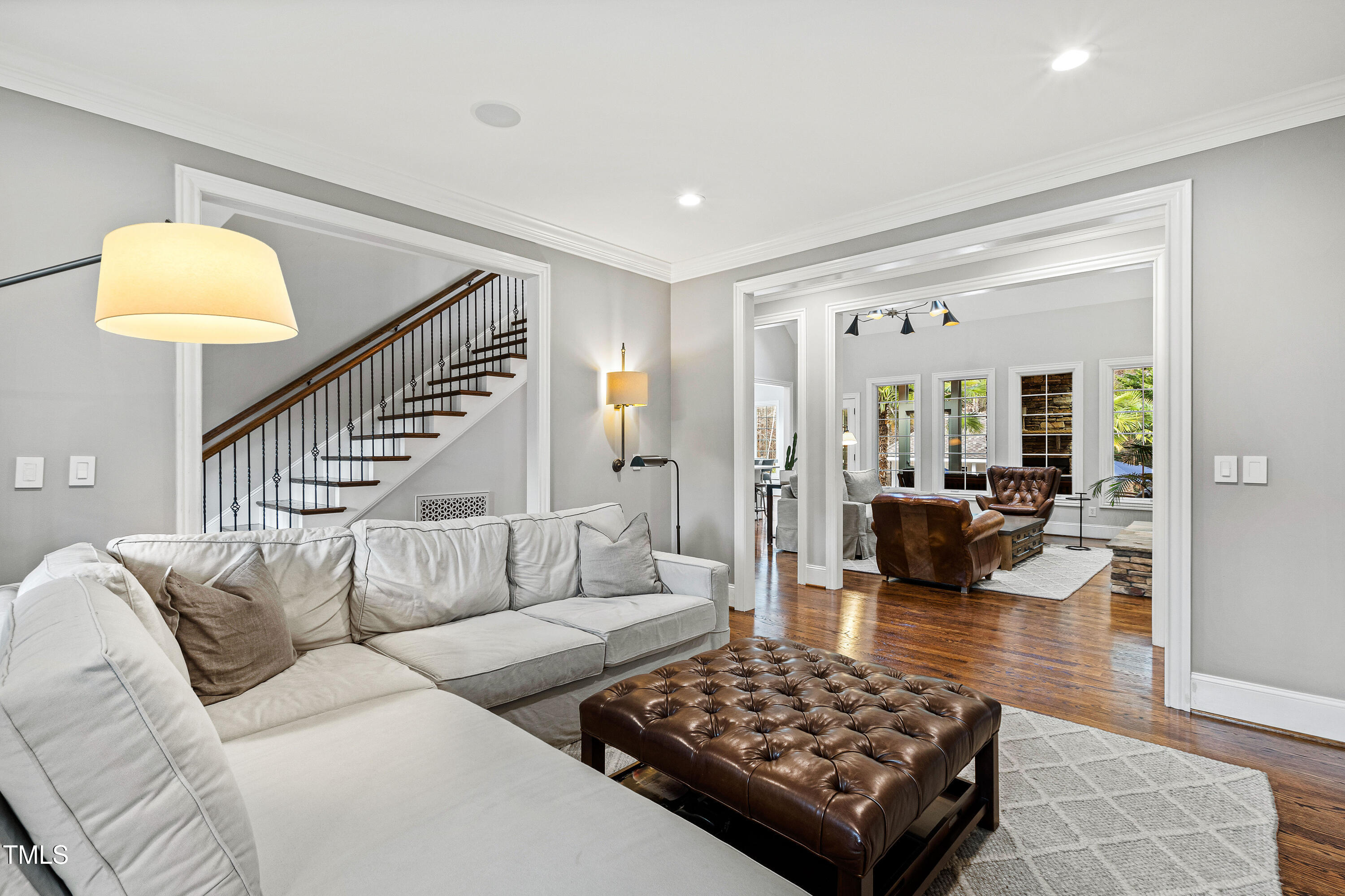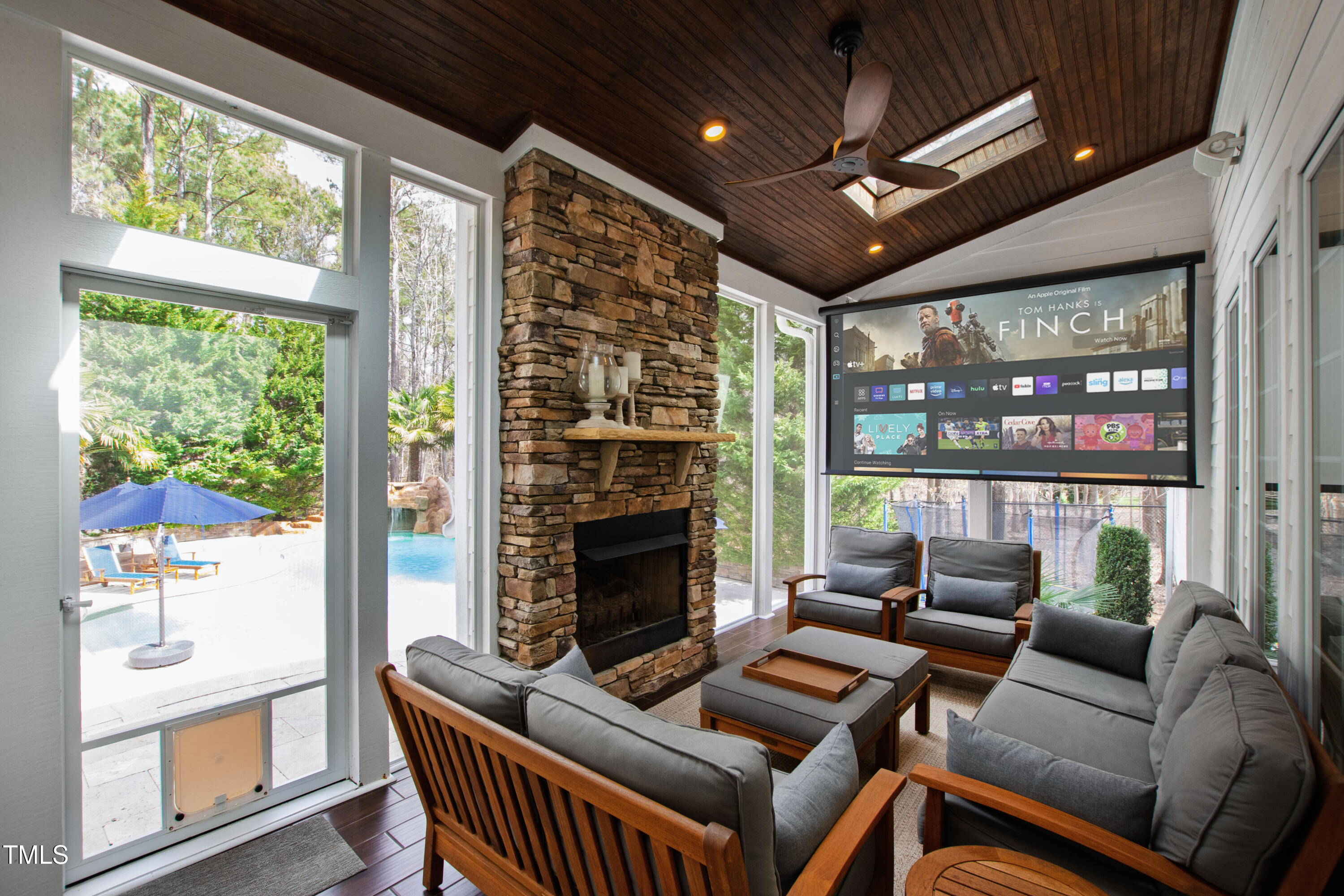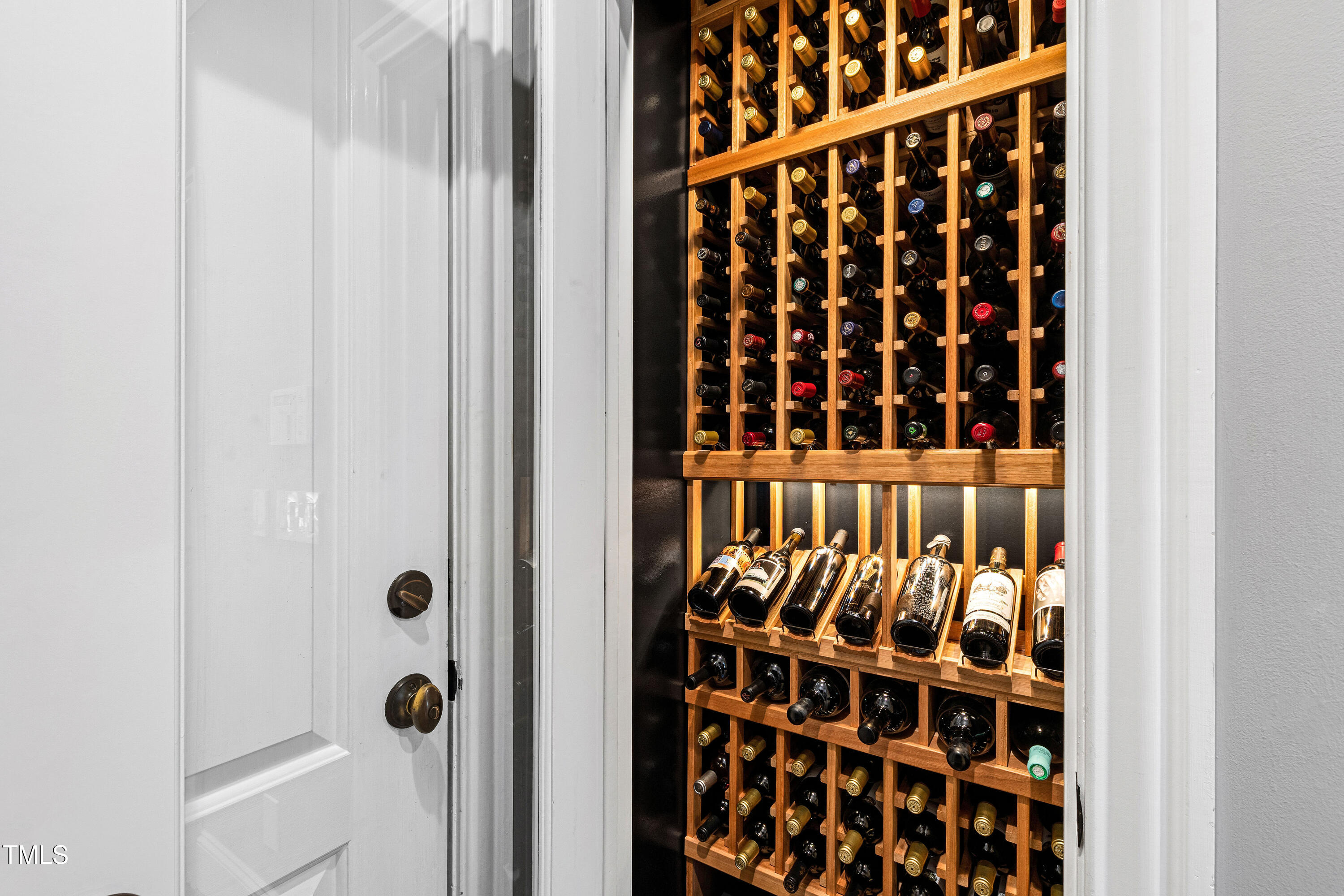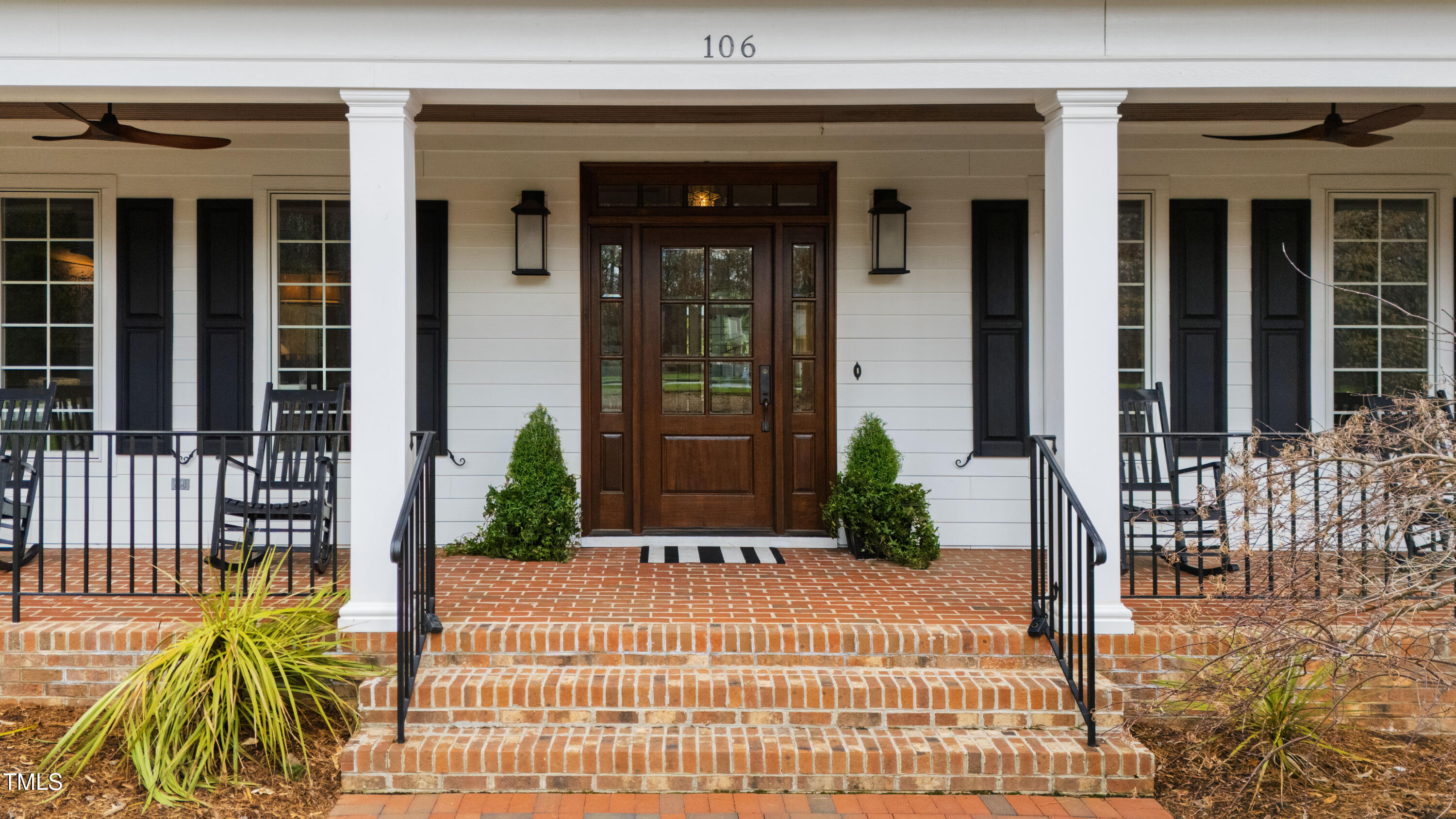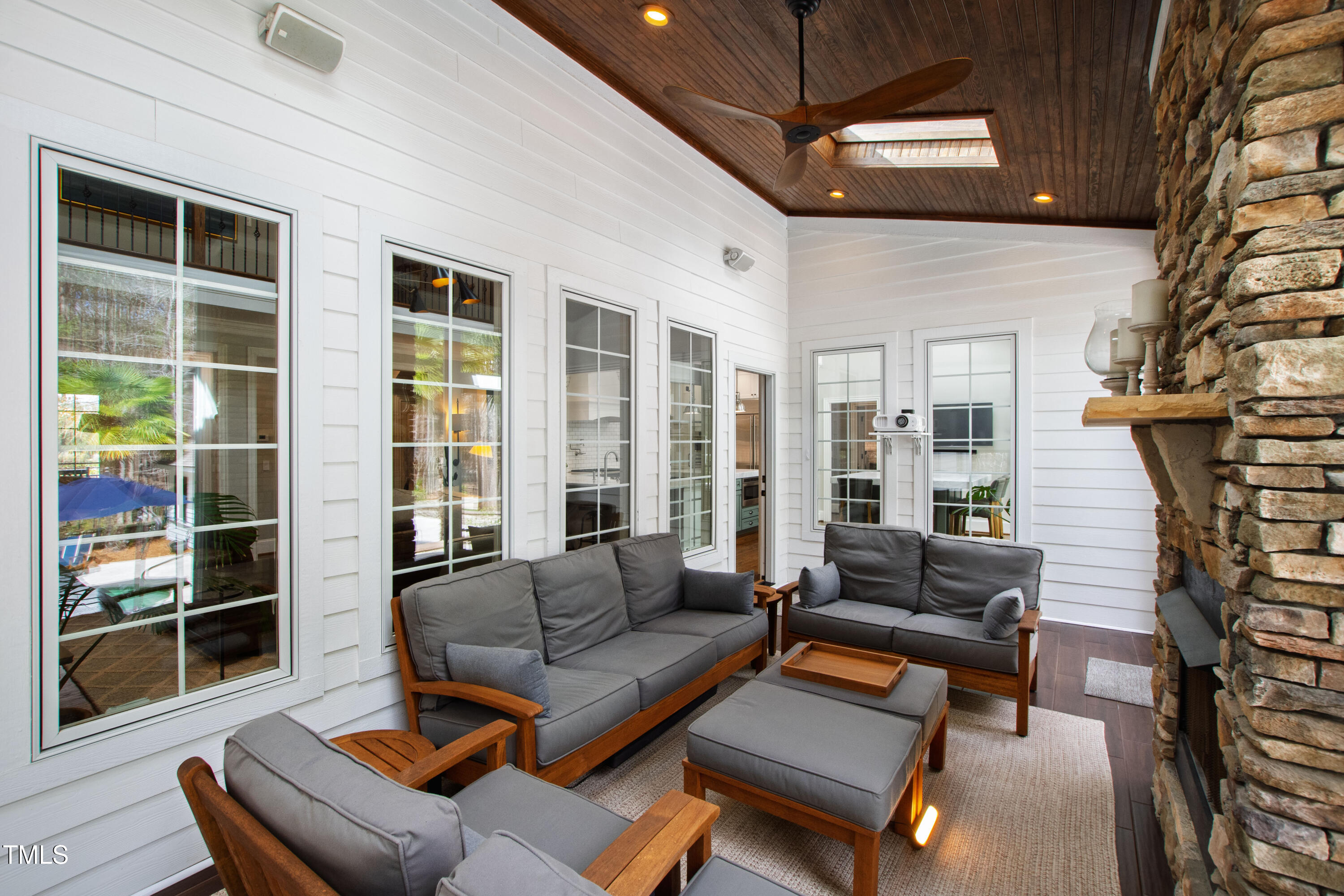 Don't miss the cleverly designed wine closet, a highlight created by the current owners. The spacious laundry room and an inviting first-floor office overlooking the pool area add to the home's appeal. With 4 bedrooms and 4.5 baths, plus a large bonus room currently serving as a gym, this home includes a primary suite that flows seamlessly into a cozy TV room and family room. Abundant windows fill the space with natural light, enhancing the home's welcoming atmosphere. Perfect for entertaining, the floor plan is designed for both indoor and outdoor gatherings. The beautifully landscaped exterior, featuring delightful terraces for al fresco dining, along with a stunning salt water pool, exudes resort-style living. Surrounded by beautiful palm trees, imagine sipping a cocktail or two in this tropical paradise. The pool house, measuring 176.70 square feet, not included in the living area square footage of the house, includes a beautiful kitchen with an induction cooktop and refrigerator, as well as a full bathroom, making it ideal for guests and entertaining while ensuring privacy. Experience the serene lifestyle that 106 Woodkirk offers--a peaceful retreat from the everyday hustle and bustle, yet conveniently located near Chapel Hill, Durham, Duke, UNC, and I-40.