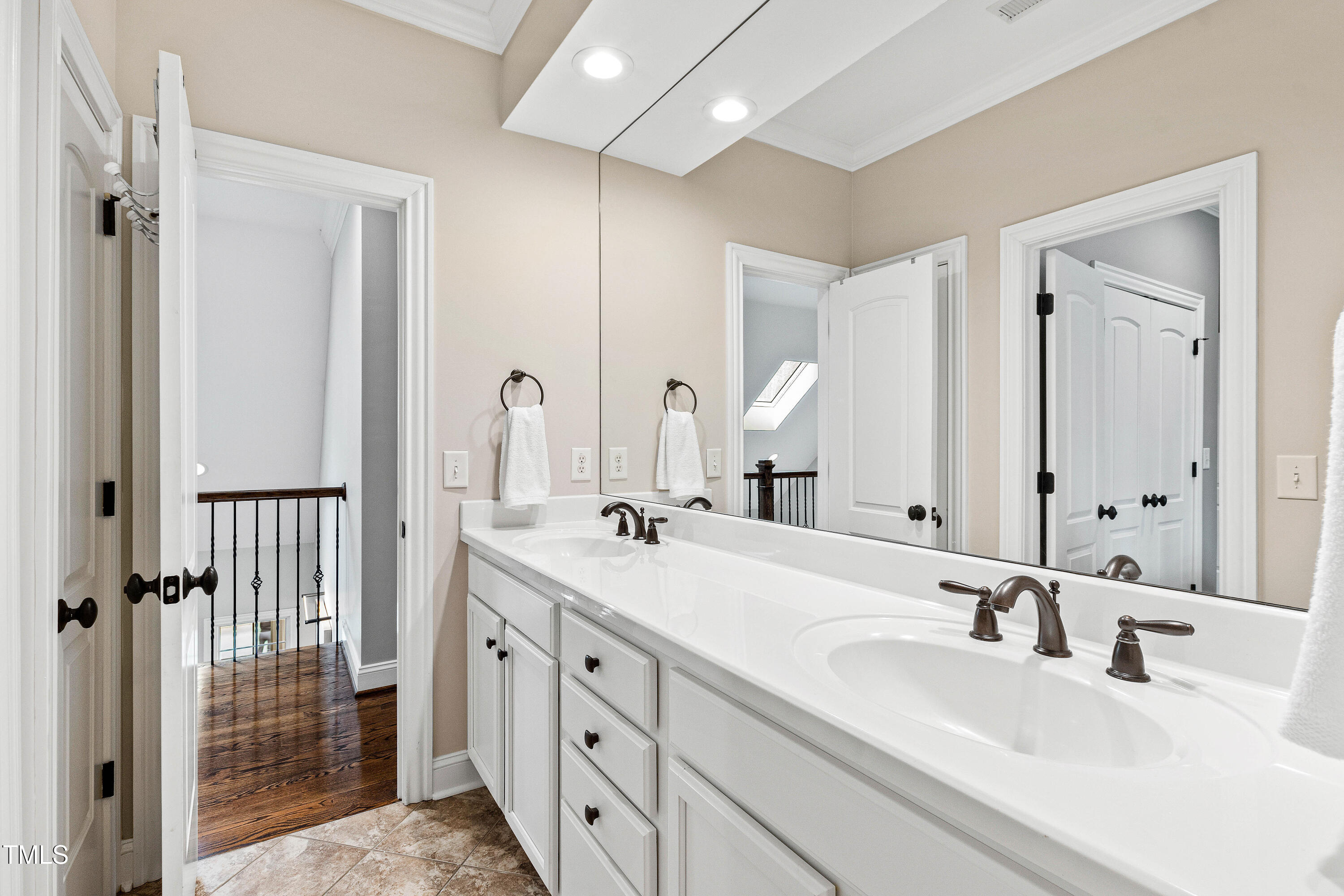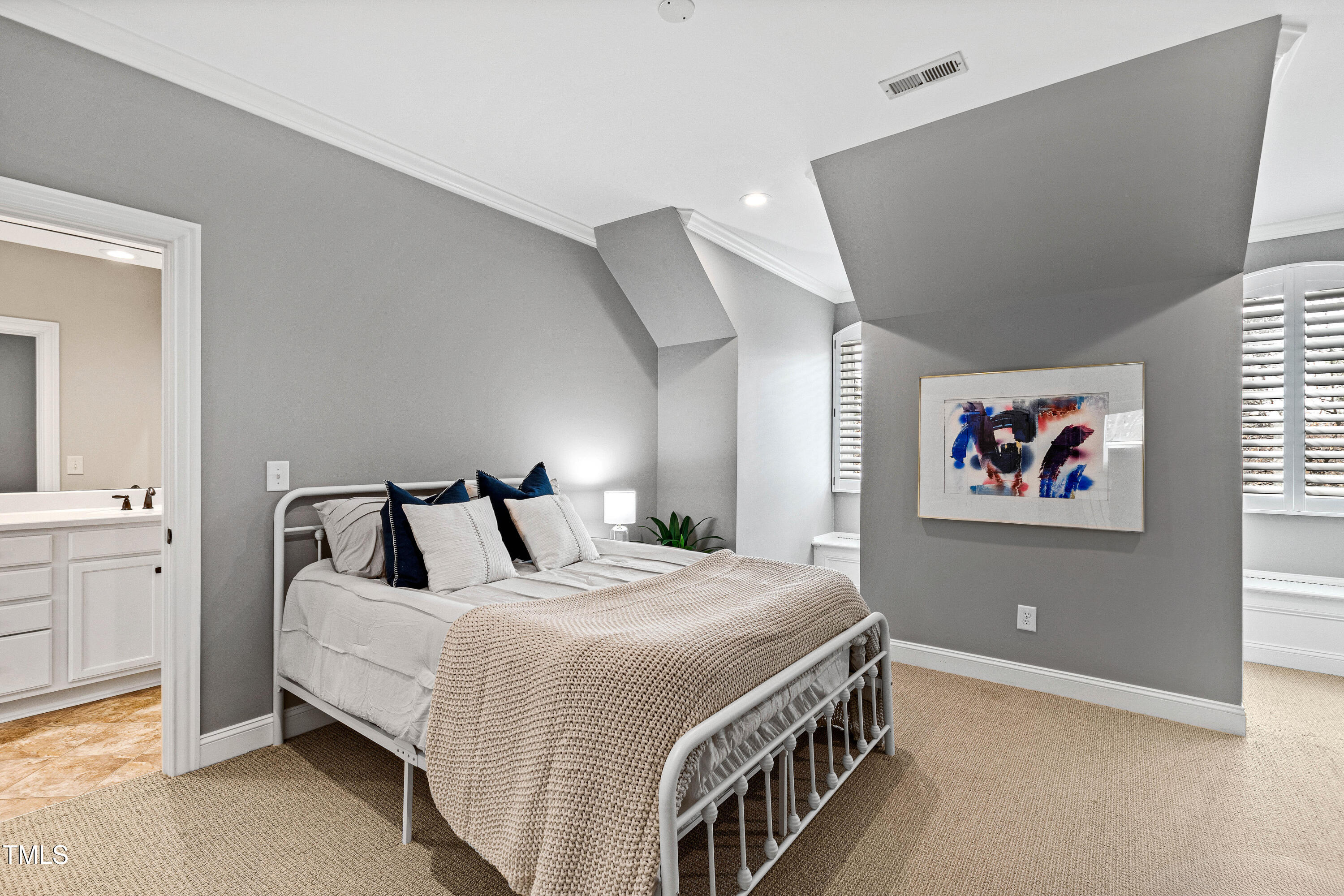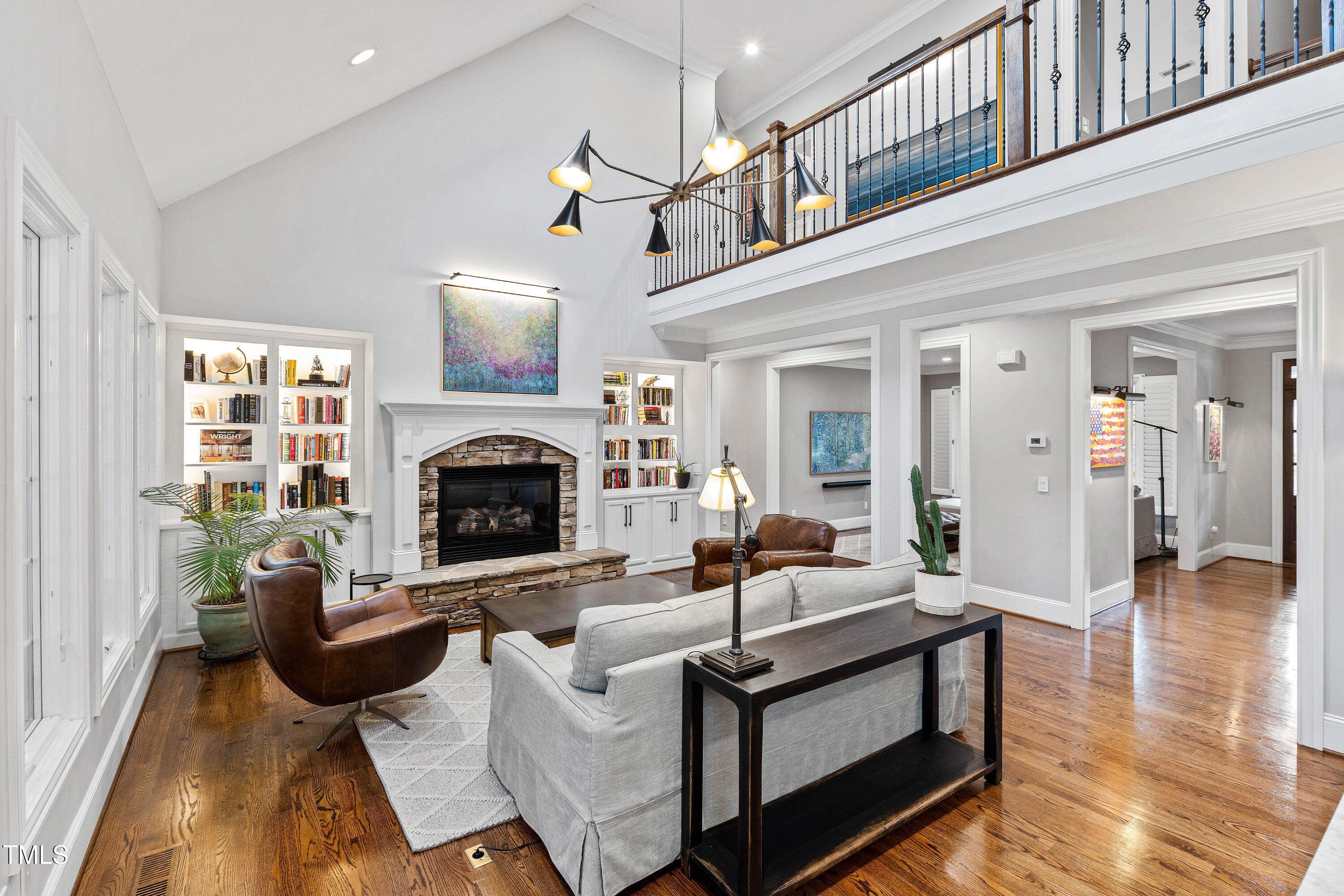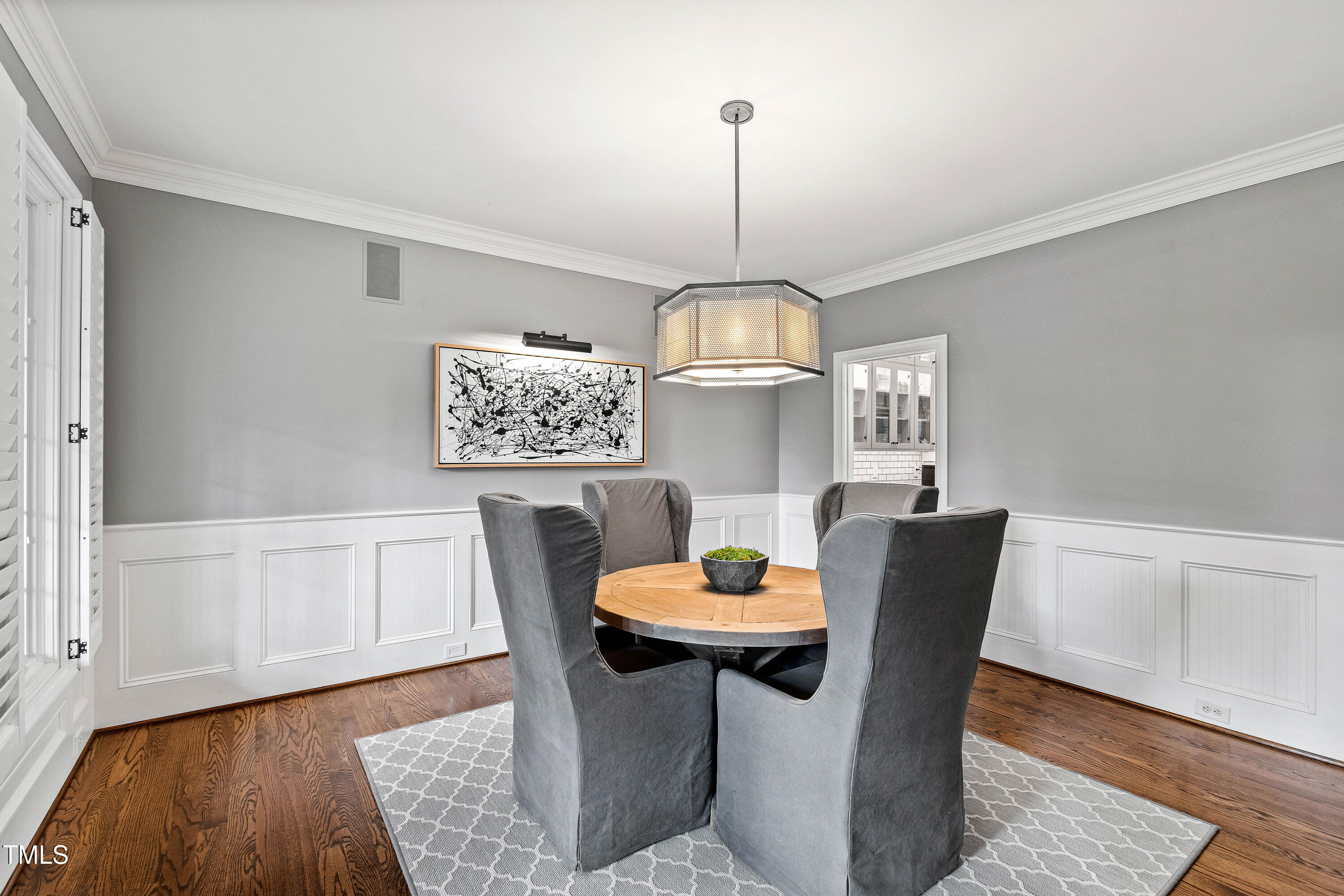 Don't miss the cleverly designed wine closet, a highlight created by the current owners. The spacious laundry room and an inviting first-floor office overlooking the pool area add to the home's appeal. With 4 bedrooms and 4.5 baths, plus a large bonus room currently serving as a gym, this home includes a primary suite that flows seamlessly into a cozy TV room and family room. Abundant windows fill the space with natural light, enhancing the home's welcoming atmosphere. Perfect for entertaining, the floor plan is designed for both indoor and outdoor gatherings. The beautifully landscaped exterior, featuring delightful terraces for al fresco dining, along with a stunning salt water pool, exudes resort-style living. Surrounded by beautiful palm trees, imagine sipping a cocktail or two in this tropical paradise. The pool house, measuring 176.70 square feet, not included in the living area square footage of the house, includes a beautiful kitchen with an induction cooktop and refrigerator, as well as a full bathroom, making it ideal for guests and entertaining while ensuring privacy. Experience the serene lifestyle that 106 Woodkirk offers--a peaceful retreat from the everyday hustle and bustle, yet conveniently located near Chapel Hill, Durham, Duke, UNC, and I-40.