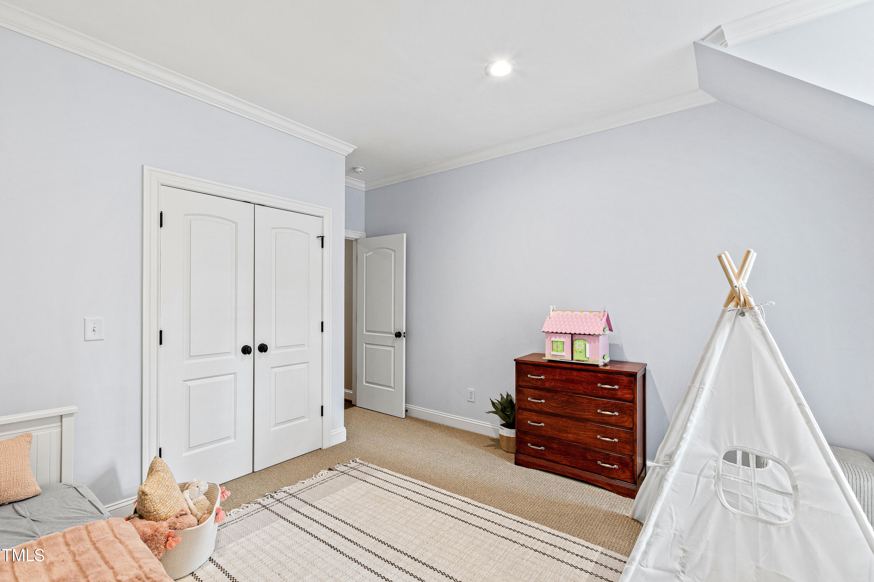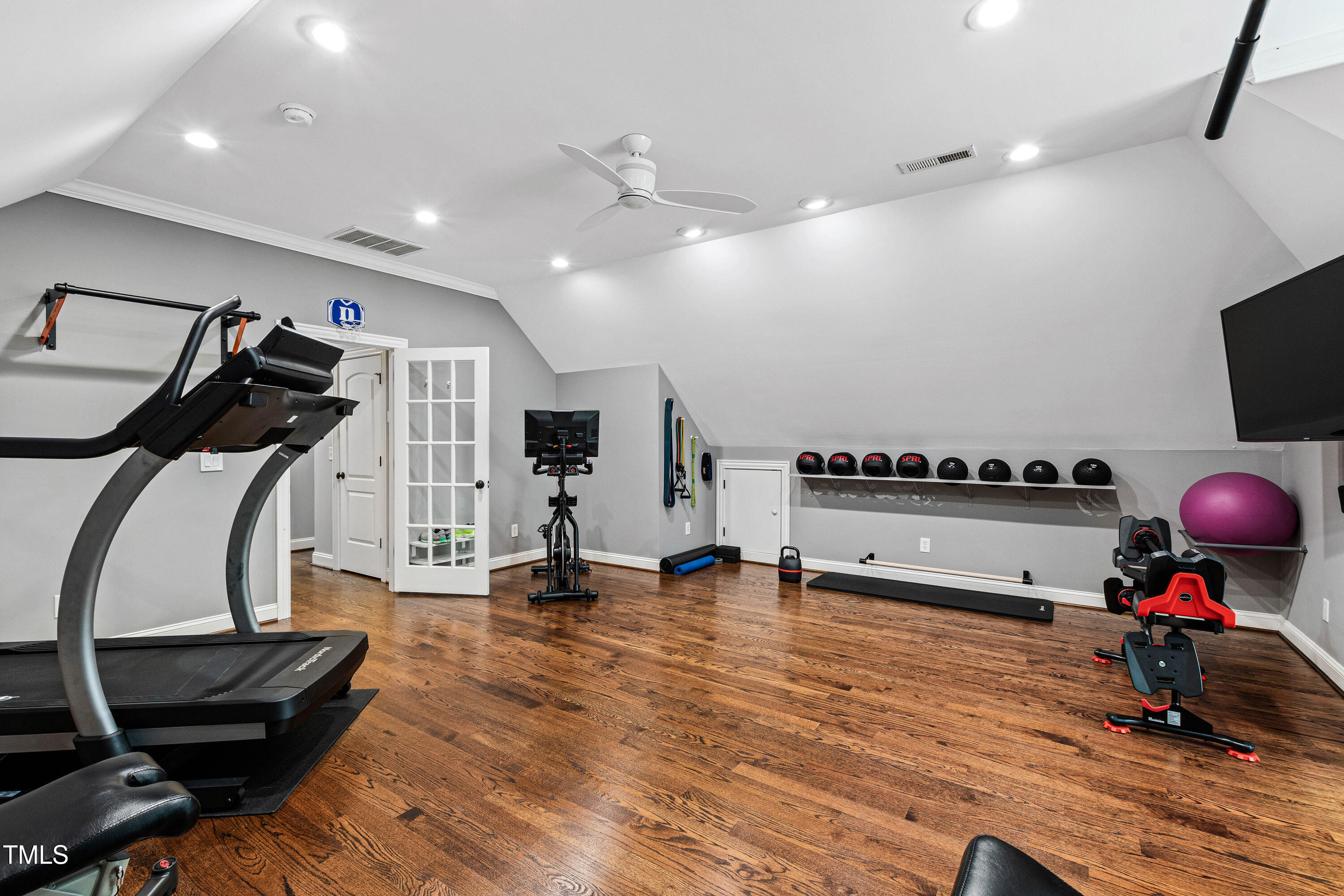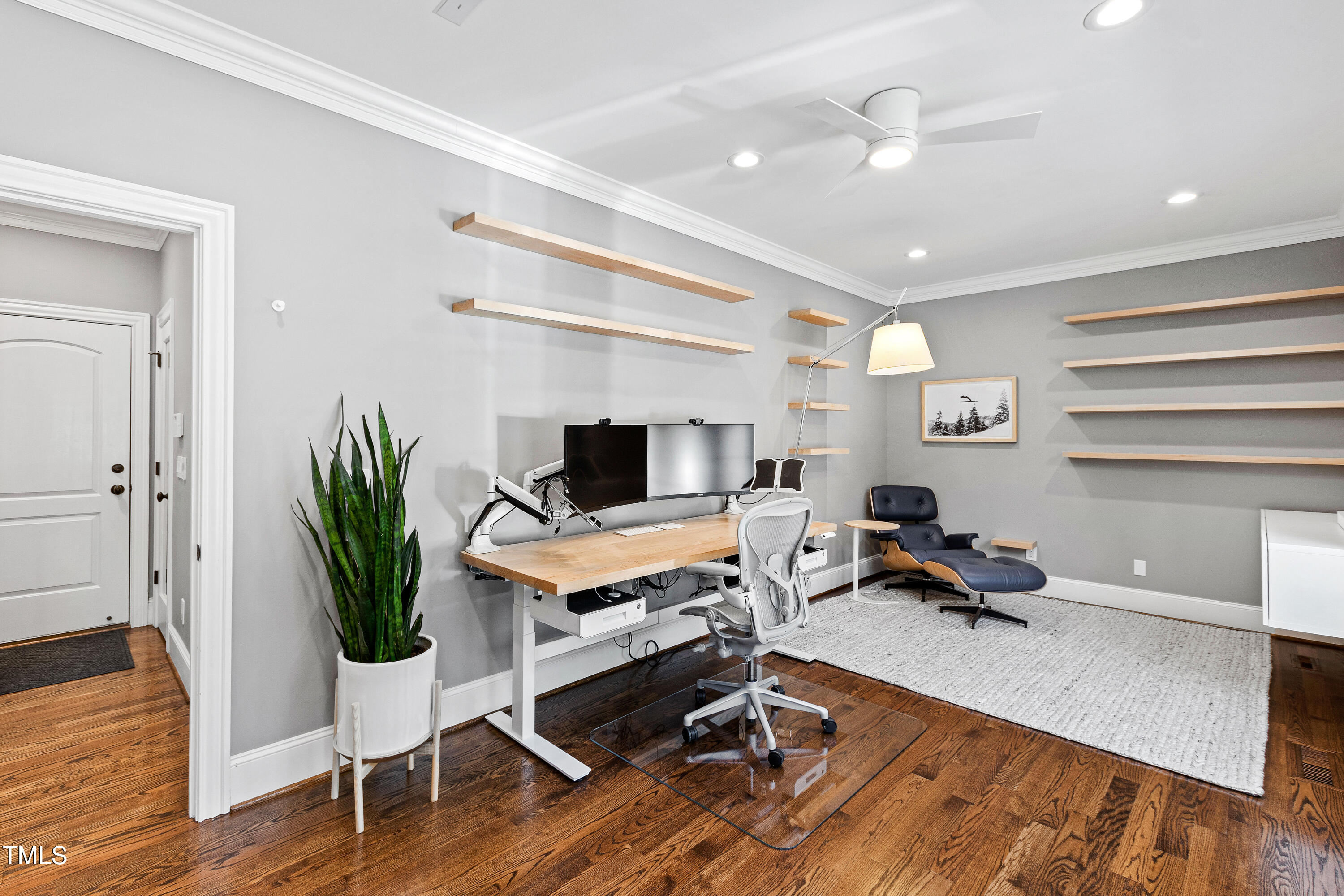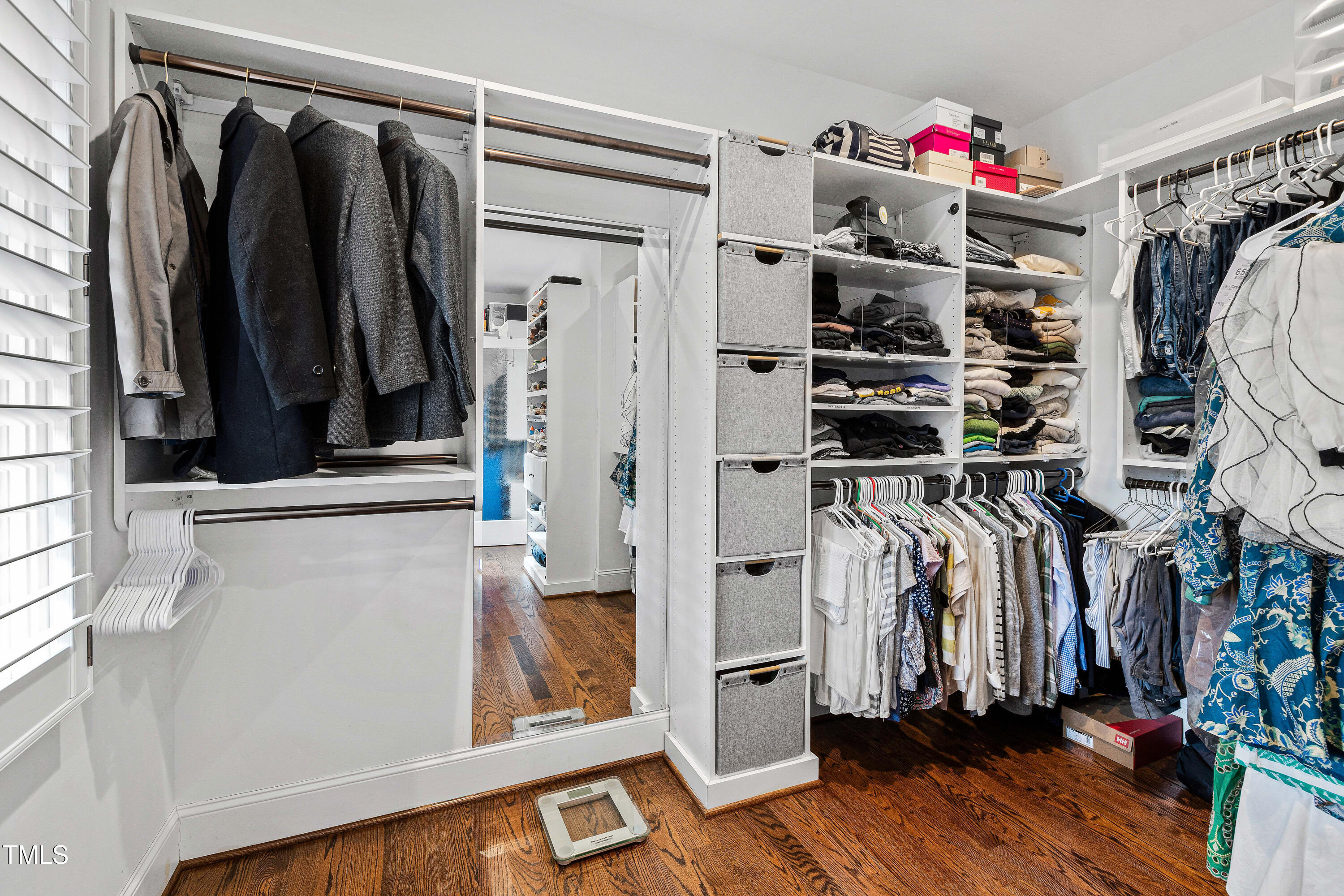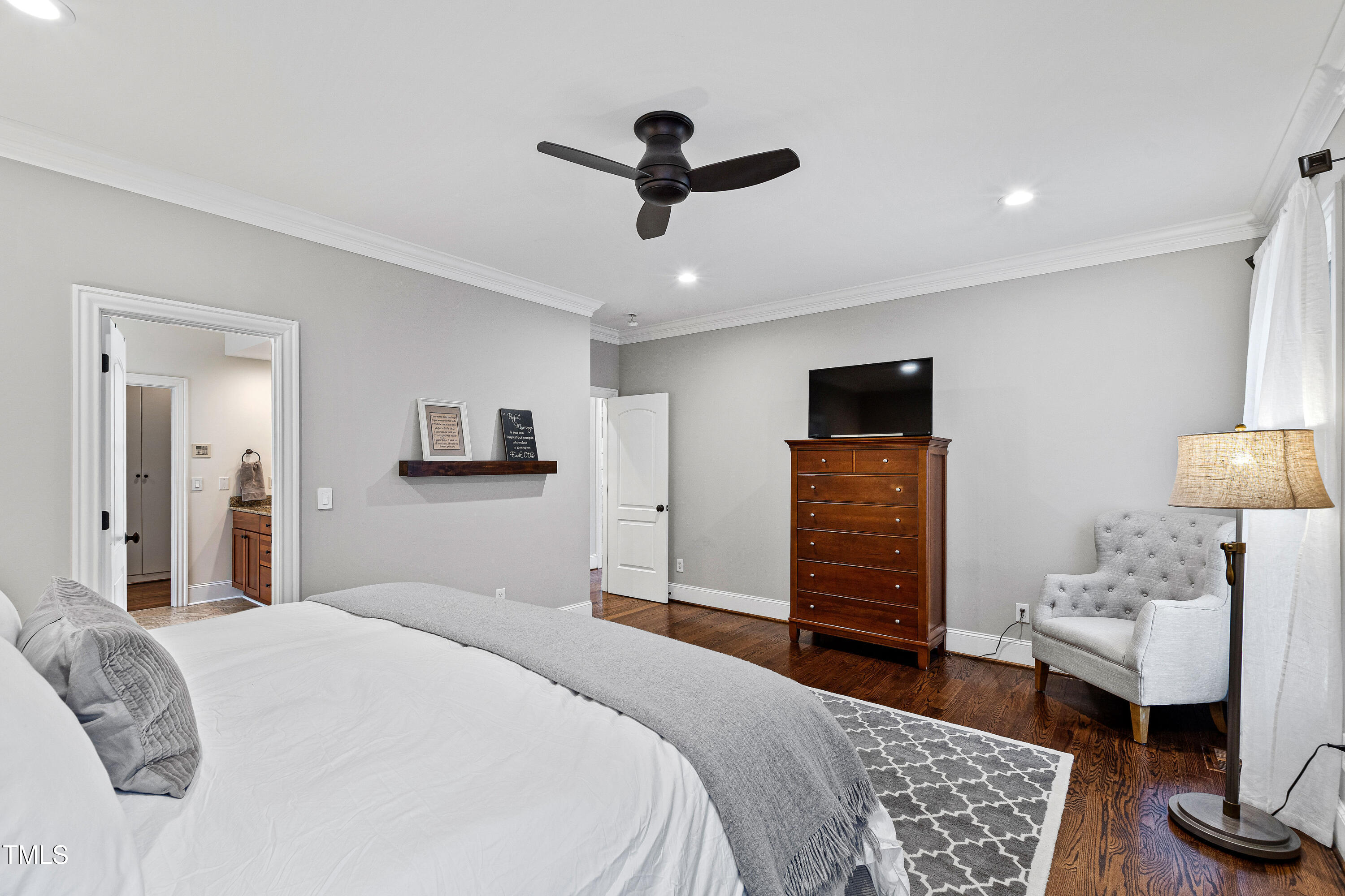 Don't miss the cleverly designed wine closet, a highlight created by the current owners. The spacious laundry room and an inviting first-floor office overlooking the pool area add to the home's appeal. With 4 bedrooms and 4.5 baths, plus a large bonus room currently serving as a gym, this home includes a primary suite that flows seamlessly into a cozy TV room and family room. Abundant windows fill the space with natural light, enhancing the home's welcoming atmosphere. Perfect for entertaining, the floor plan is designed for both indoor and outdoor gatherings. The beautifully landscaped exterior, featuring delightful terraces for al fresco dining, along with a stunning salt water pool, exudes resort-style living. Surrounded by beautiful palm trees, imagine sipping a cocktail or two in this tropical paradise. The pool house, measuring 176.70 square feet, not included in the living area square footage of the house, includes a beautiful kitchen with an induction cooktop and refrigerator, as well as a full bathroom, making it ideal for guests and entertaining while ensuring privacy. Experience the serene lifestyle that 106 Woodkirk offers--a peaceful retreat from the everyday hustle and bustle, yet conveniently located near Chapel Hill, Durham, Duke, UNC, and I-40.