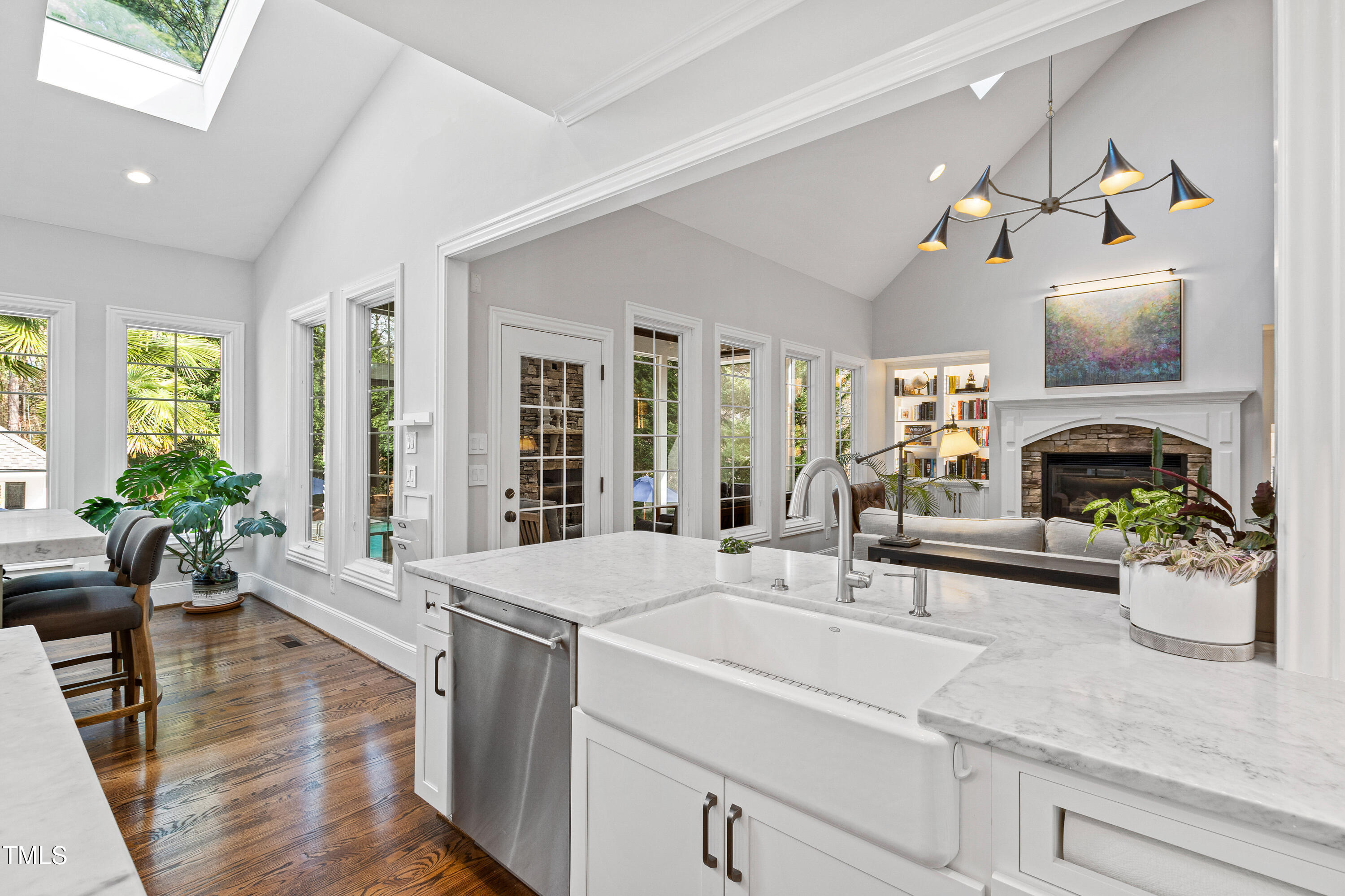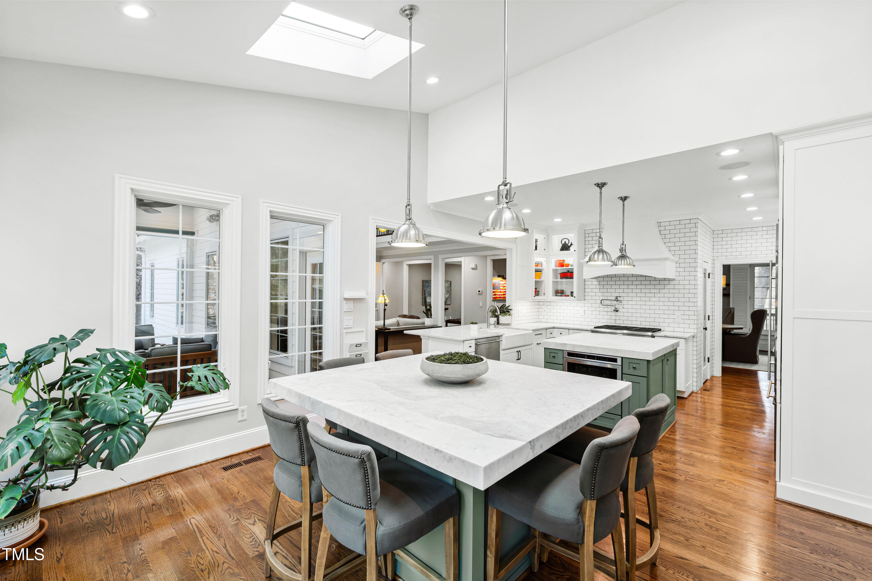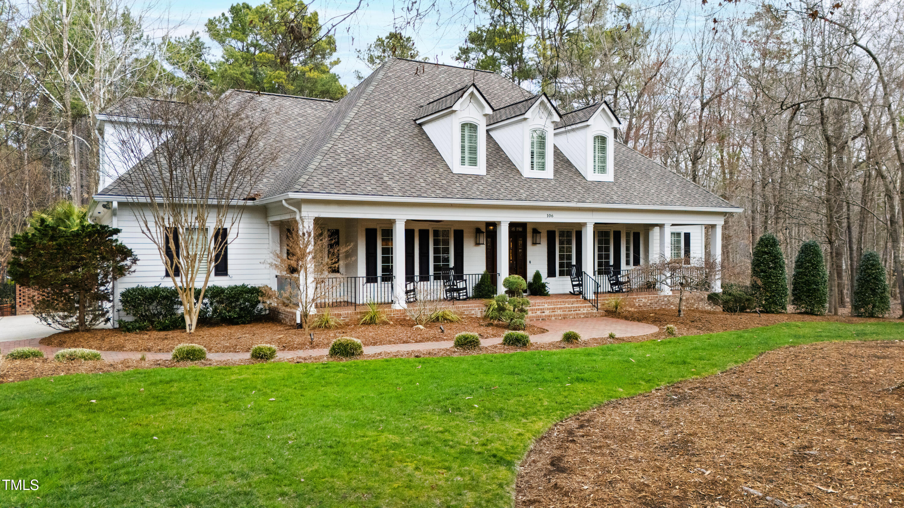 Welcome to 106 Woodkirk. Discover this remarkable home just minutes from downtown Chapel Hill, a true hidden gem set on 3 picturesque acres. This Cape Cod-inspired residence offers an oasis of tranquility from the moment you arrive. Enjoy the beauty of updated hardwood floors and a meticulously remodeled eat-in kitchen by Luxe-Mark Kitchens, featuring high-end Monogram appliances, speed oven, drawer microwave, gas cooktop, and a dedicated cabinet for the KitchenAid mixer.