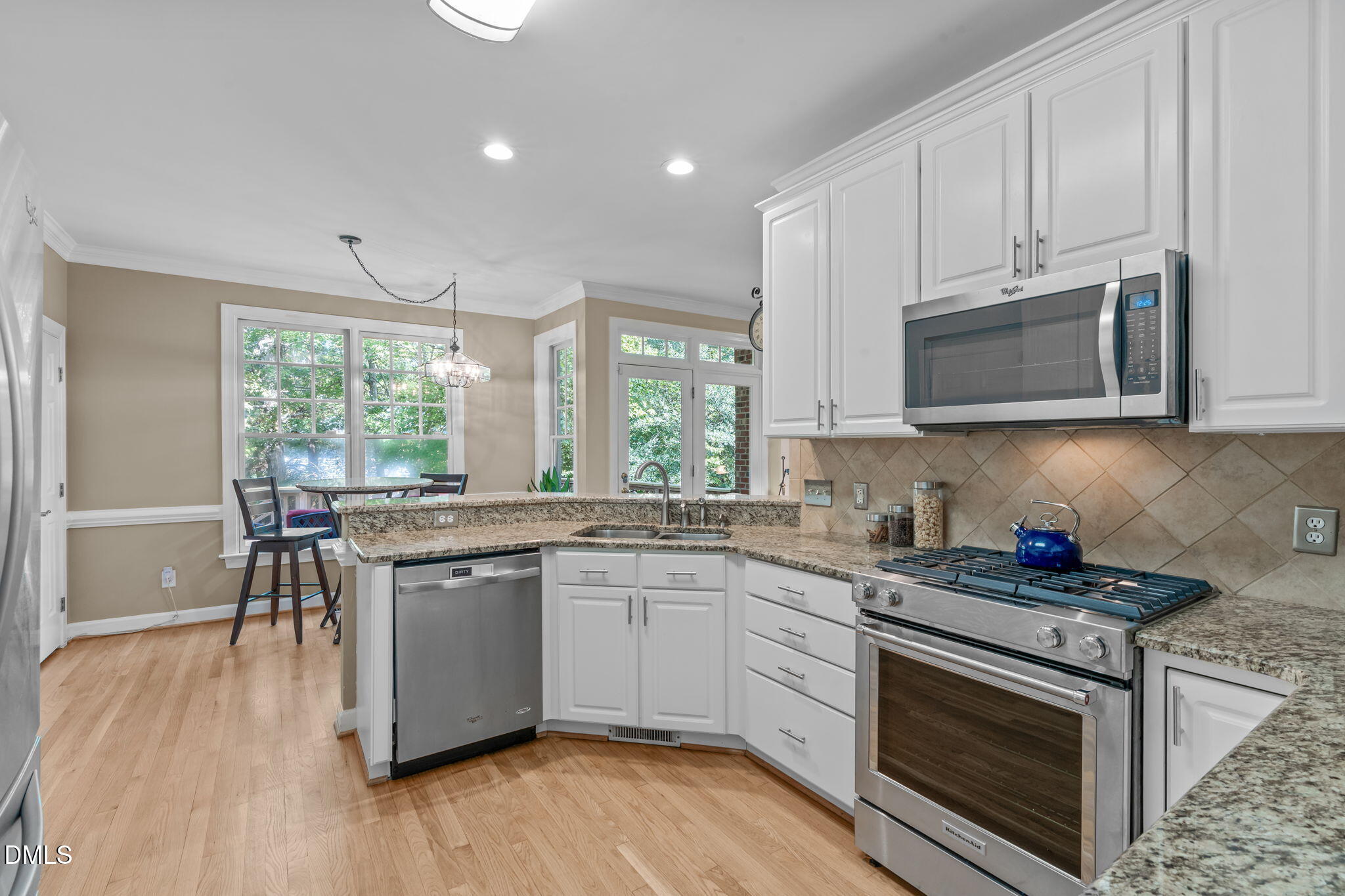 The main level highlights include gleaming hardwood floors, a formal dining room, and an inviting family room with a cozy gas log fireplace. The eat in kitchen features white cabinetry, granite countertops, and a brand new KitchenAid gas range, creating an ideal setting for both everyday meals and entertaining.