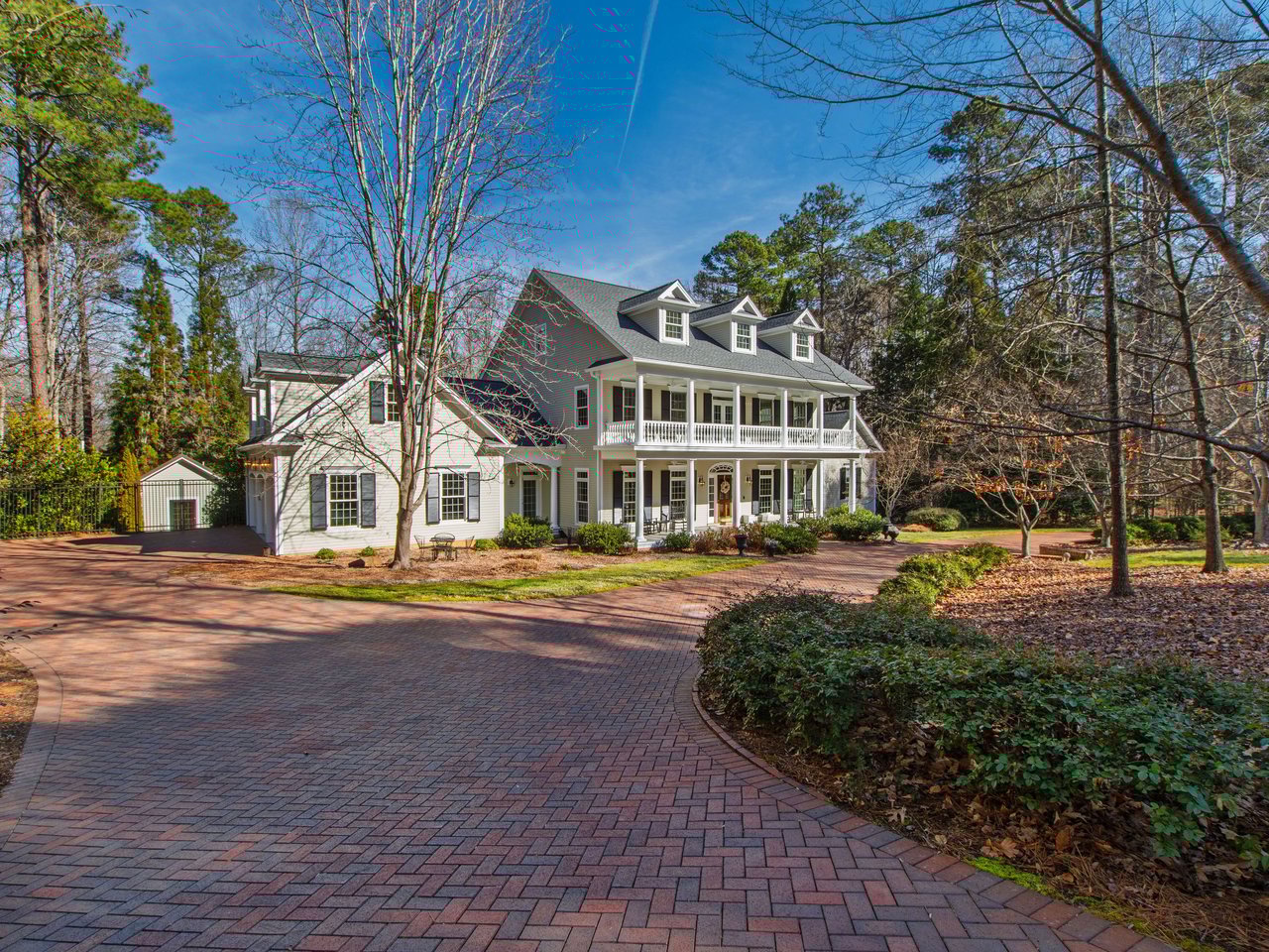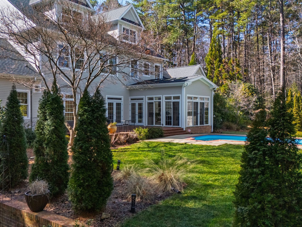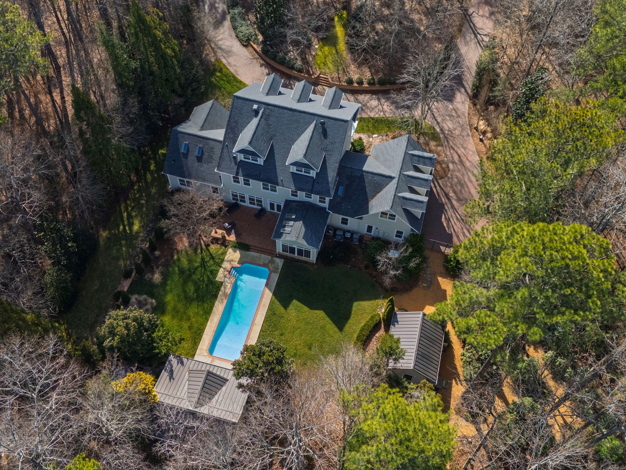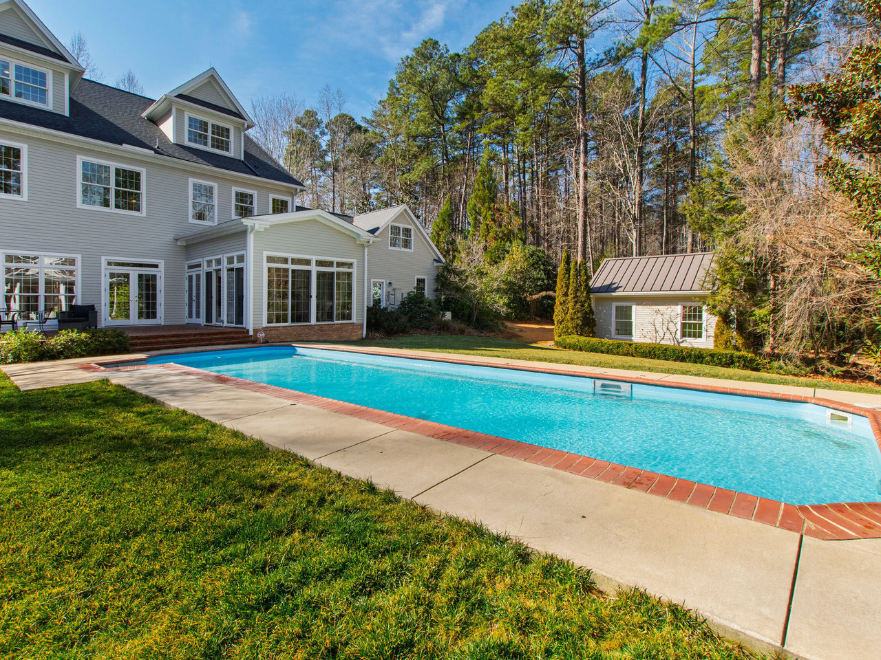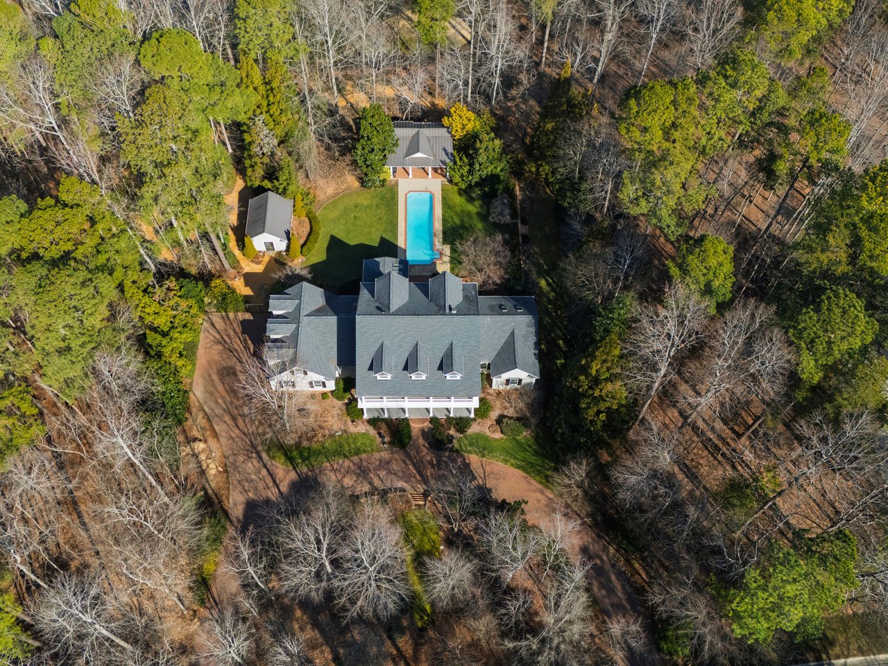 Privately positioned on over 1.6 acres within Chapel Hill's highly regarded The Reserve, and quietly tucked at the end of a peaceful cul-de-sac, this distinguished custom residence offers nearly 7,700 square feet of beautifully considered living across three refined levels, providing both privacy and a true sense of retreat. Designed by its owners with exceptional attention to proportion, flow, and architectural detail, the home balances quiet grandeur with warmth and livability. Expansive windows invite natural light throughout, framing serene woodland views and creating a seamless dialogue between interior elegance and the surrounding landscape. The setting feels tranquil and removed, yet remains moments from the very best of Chapel Hill. The principal suite is thoughtfully situated on the main level, allowing for sophisticated first-floor living. Formal entertaining rooms are gracefully composed, while a richly appointed library offers a more intimate retreat. Every space has been curated to feel elevated, welcoming, and entirely at ease. An exceptional collection of lifestyle amenities further distinguishes the residence, including a private cinema, games room, creative studio, executive offices, whole house generator and elevator access to all floors, ensuring both everyday convenience and long-term livability. Outdoors, the estate transforms into a private resort. A stunning pool and accompanying pool house create a sanctuary reminiscent of a boutique retreat, where summer afternoons unfold effortlessly and evenings are designed for gathering beneath the Carolina sky. The cul-de-sac location enhances the sense of calm, offering a quiet and peaceful environment rarely found at this scale. Beyond the main residence, a charming guest house and separate temperature-controlled studio provide remarkable flexibility for extended family, visitors, or independent work arrangements. Immaculately presented and complete with a three-car garage, this residence exudes quiet confidence. It offers scale, privacy, resort-caliber amenities, and enduring quality in one of Chapel Hill's most established and desirable communities.