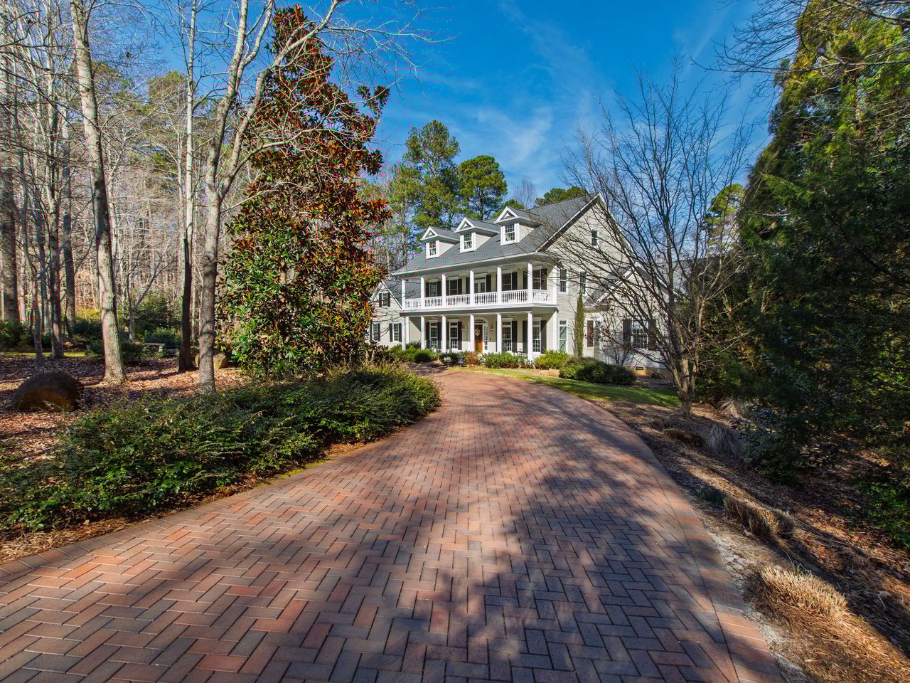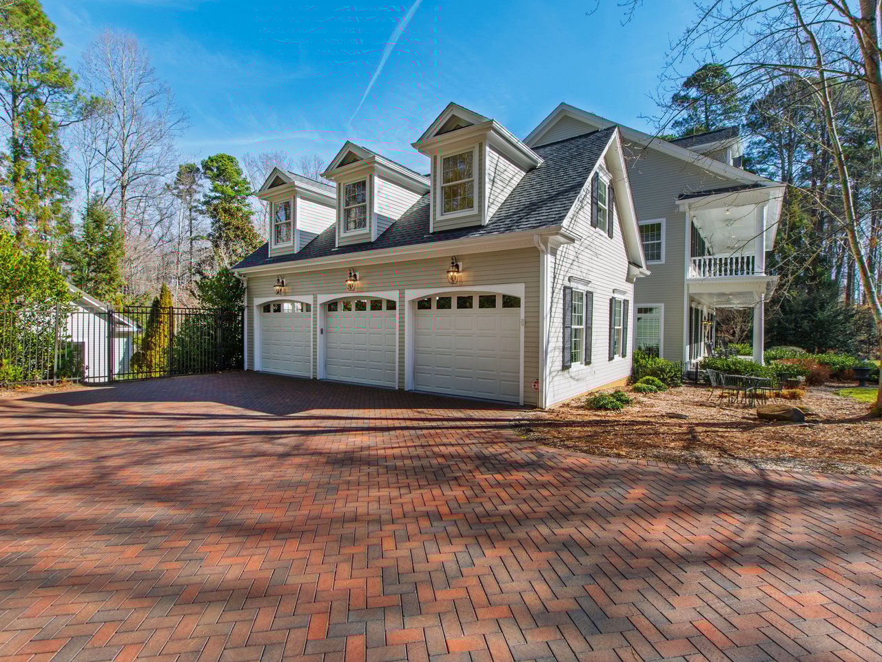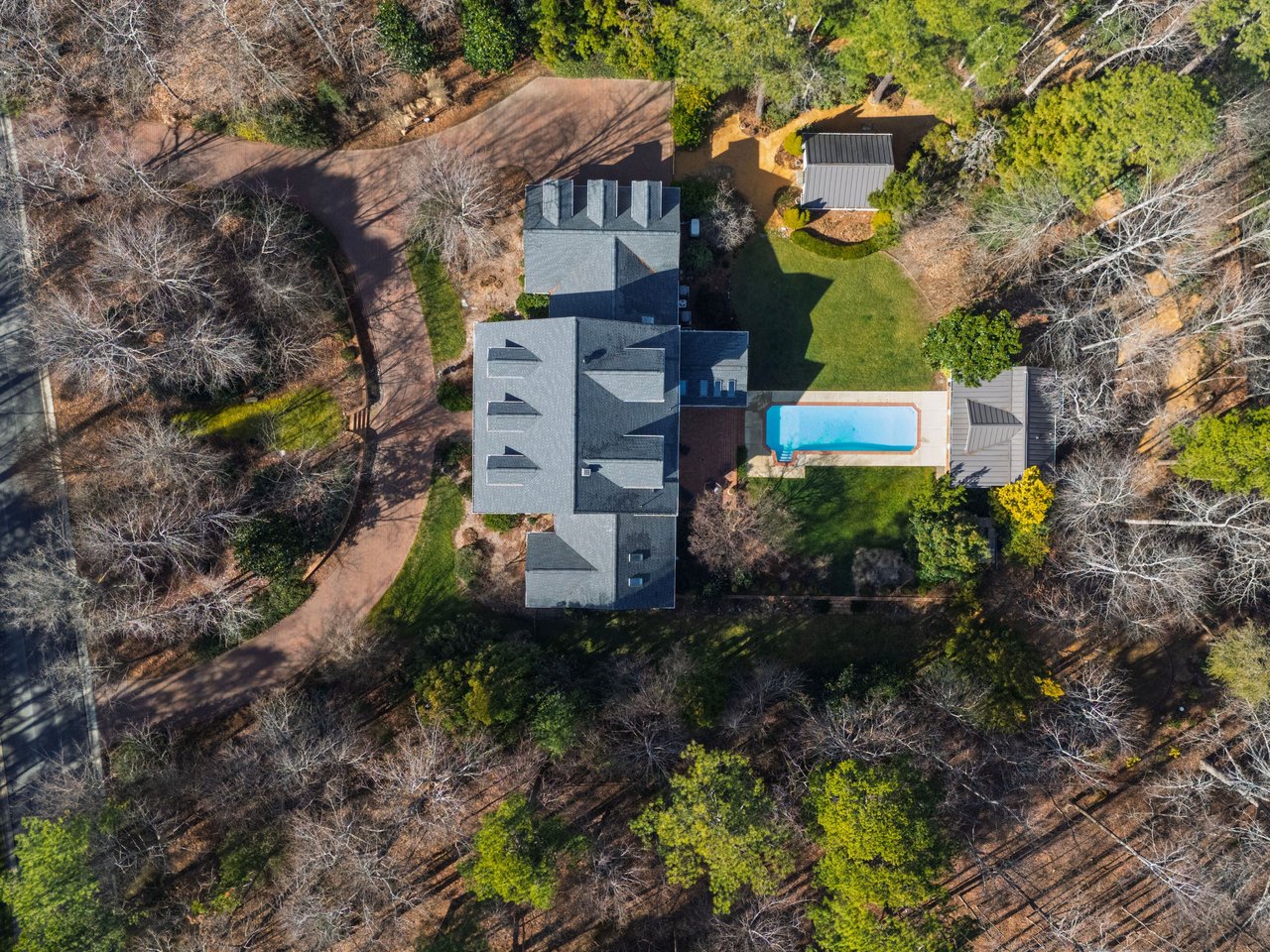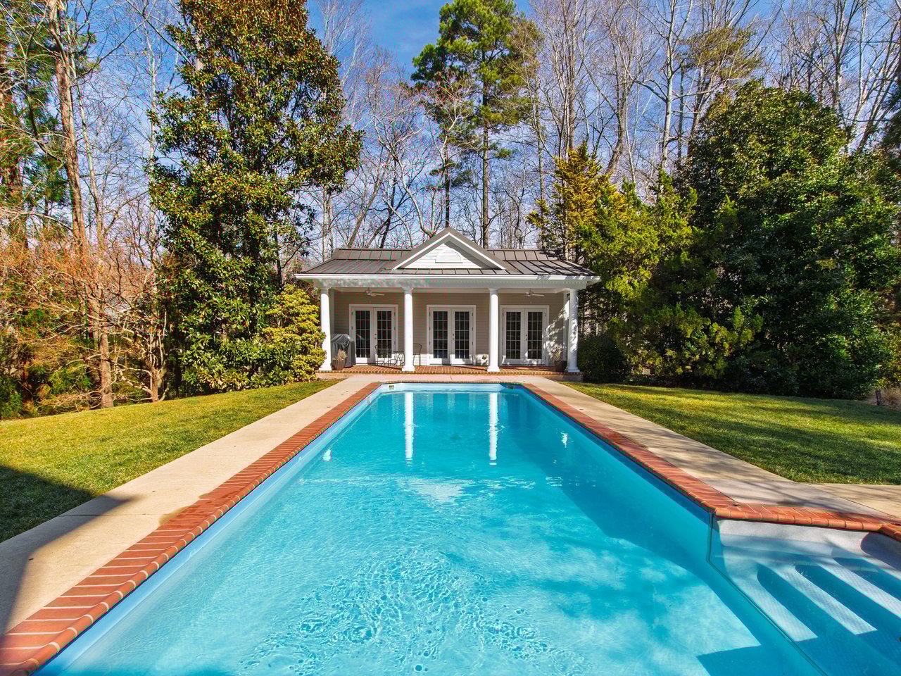 Privately positioned on over 1.6 acres within Chapel Hill's highly regarded The Reserve, and quietly tucked at the end of a peaceful cul-de-sac, this distinguished custom residence offers nearly 7,700 square feet of beautifully considered living across three refined levels, providing both privacy and a true sense of retreat. Designed by its owners with exceptional attention to proportion, flow, and architectural detail, the home balances quiet grandeur with warmth and livability. Expansive windows invite natural light throughout, framing serene woodland views and creating a seamless dialogue between interior elegance and the surrounding landscape. The setting feels tranquil and removed, yet remains moments from the very best of Chapel Hill. The principal suite is thoughtfully situated on the main level, allowing for sophisticated first-floor living. Formal entertaining rooms are gracefully composed, while a richly appointed library offers a more intimate retreat. Every space has been curated to feel elevated, welcoming, and entirely at ease. An exceptional collection of lifestyle amenities further distinguishes the residence, including a private cinema, games room, creative studio, executive offices, whole house generator and elevator access to all floors, ensuring both everyday convenience and long-term livability. Outdoors, the estate transforms into a private resort. A stunning pool and accompanying pool house create a sanctuary reminiscent of a boutique retreat, where summer afternoons unfold effortlessly and evenings are designed for gathering beneath the Carolina sky. The cul-de-sac location enhances the sense of calm, offering a quiet and peaceful environment rarely found at this scale. Beyond the main residence, a charming guest house and separate temperature-controlled studio provide remarkable flexibility for extended family, visitors, or independent work arrangements. Immaculately presented and complete with a three-car garage, this residence exudes quiet confidence. It offers scale, privacy, resort-caliber amenities, and enduring quality in one of Chapel Hill's most established and desirable communities.