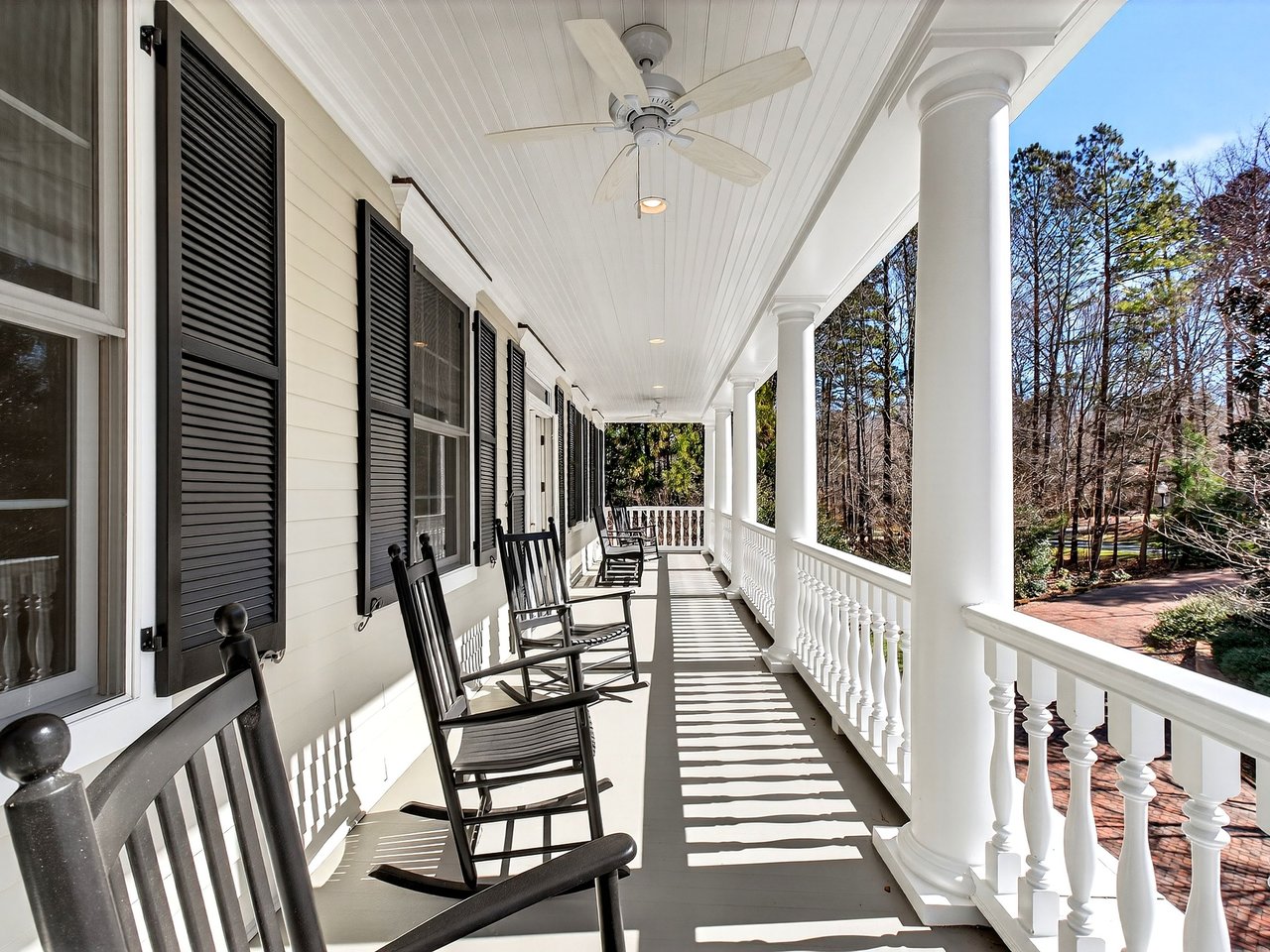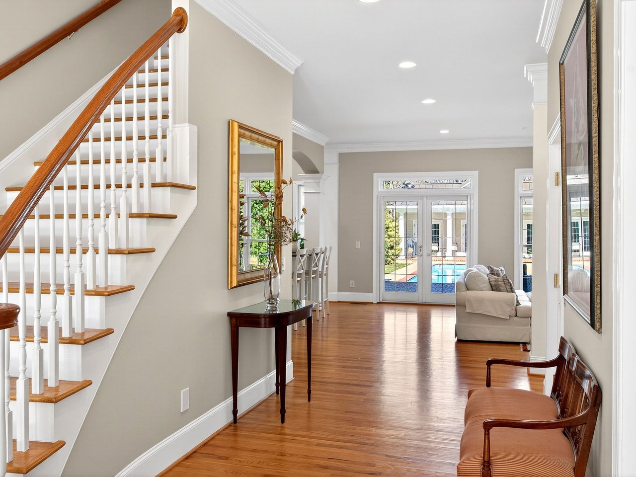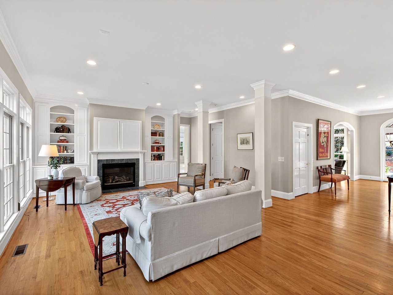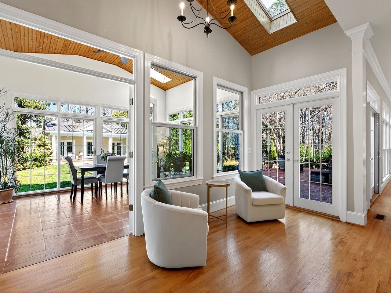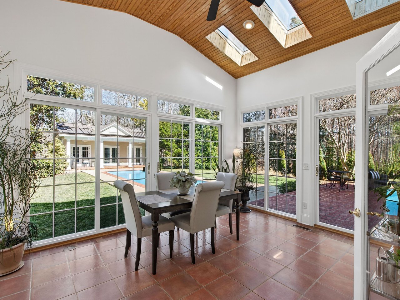 Privately positioned on over 1.6 acres within Chapel Hill's highly regarded The Reserve, and quietly tucked at the end of a peaceful cul-de-sac, this distinguished custom residence offers nearly 7,700 square feet of beautifully considered living across three refined levels, providing both privacy and a true sense of retreat. Designed by its owners with exceptional attention to proportion, flow, and architectural detail, the home balances quiet grandeur with warmth and livability. Expansive windows invite natural light throughout, framing serene woodland views and creating a seamless dialogue between interior elegance and the surrounding landscape. The setting feels tranquil and removed, yet remains moments from the very best of Chapel Hill. The principal suite is thoughtfully situated on the main level, allowing for sophisticated first-floor living. Formal entertaining rooms are gracefully composed, while a richly appointed library offers a more intimate retreat. Every space has been curated to feel elevated, welcoming, and entirely at ease. An exceptional collection of lifestyle amenities further distinguishes the residence, including a private cinema, games room, creative studio, executive offices, whole house generator and elevator access to all floors, ensuring both everyday convenience and long-term livability. Outdoors, the estate transforms into a private resort. A stunning pool and accompanying pool house create a sanctuary reminiscent of a boutique retreat, where summer afternoons unfold effortlessly and evenings are designed for gathering beneath the Carolina sky. The cul-de-sac location enhances the sense of calm, offering a quiet and peaceful environment rarely found at this scale. Beyond the main residence, a charming guest house and separate temperature-controlled studio provide remarkable flexibility for extended family, visitors, or independent work arrangements. Immaculately presented and complete with a three-car garage, this residence exudes quiet confidence. It offers scale, privacy, resort-caliber amenities, and enduring quality in one of Chapel Hill's most established and desirable communities.