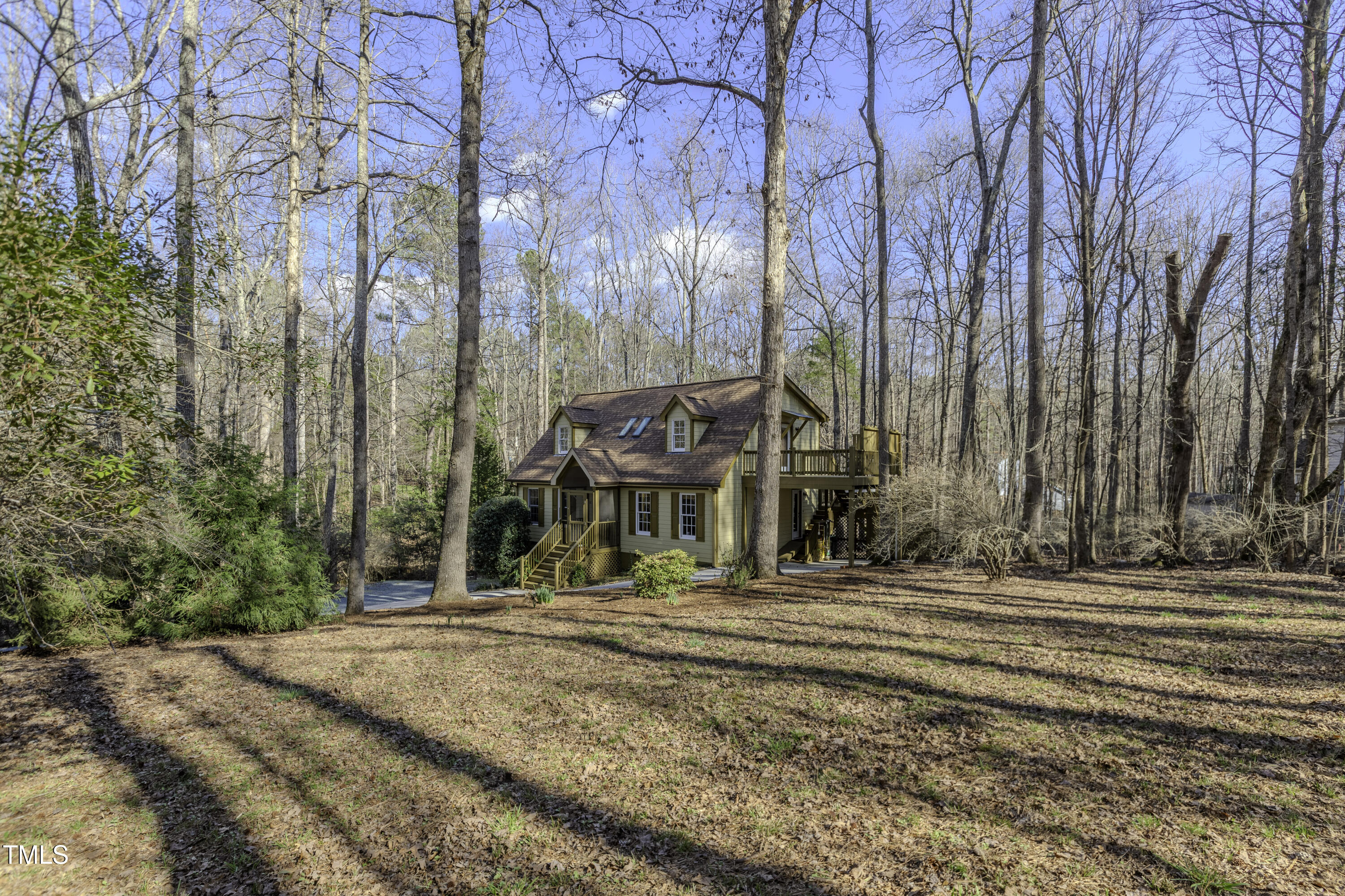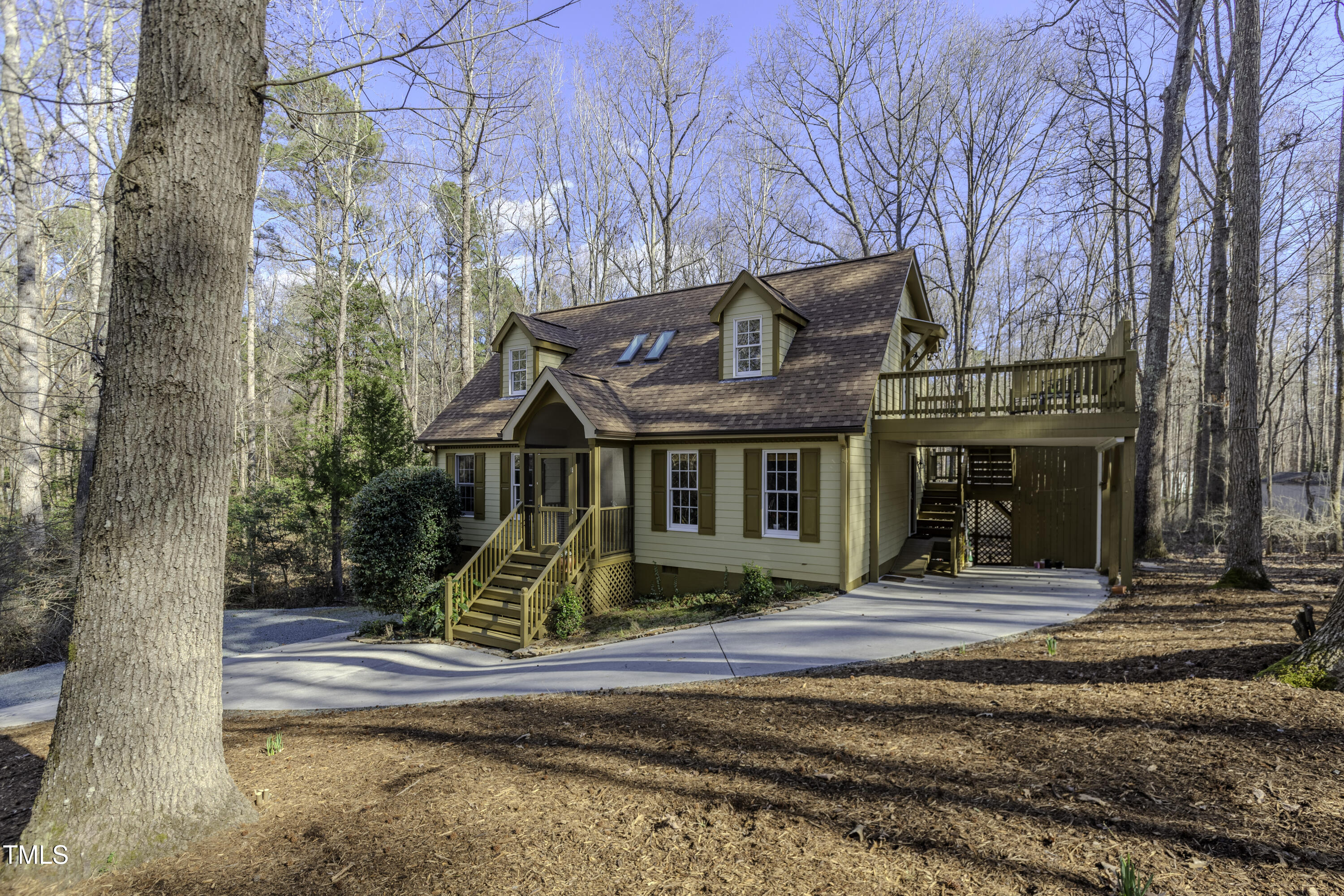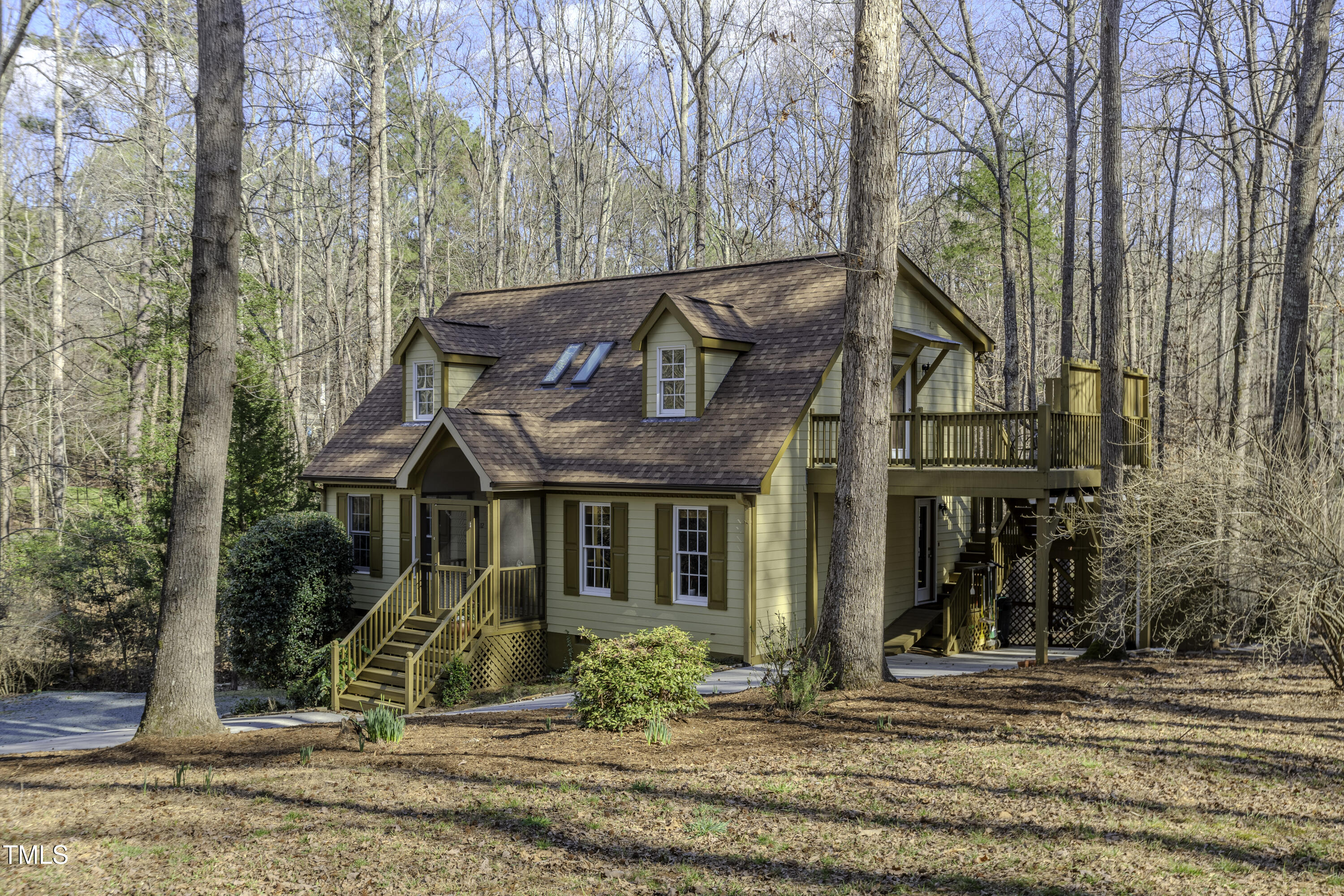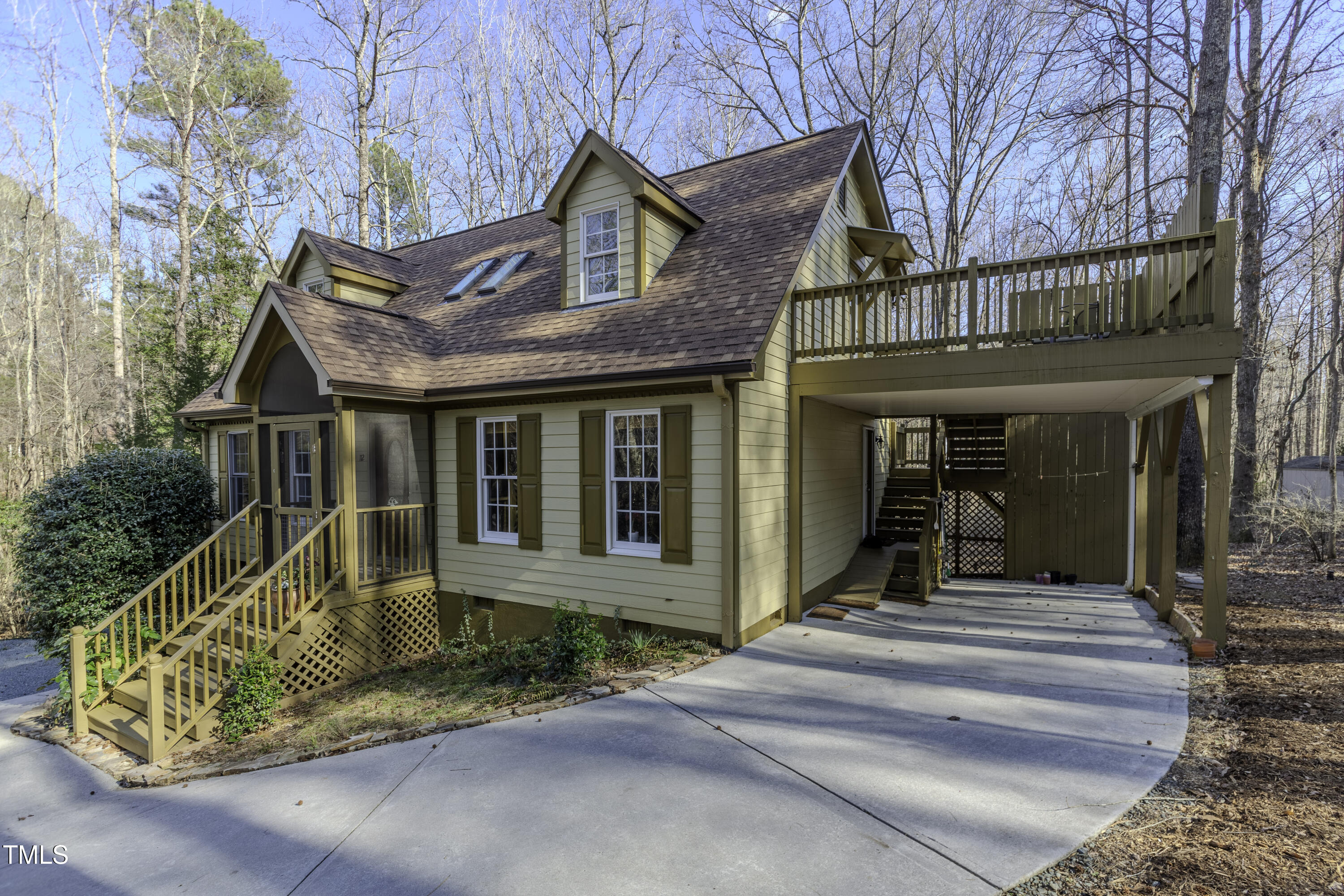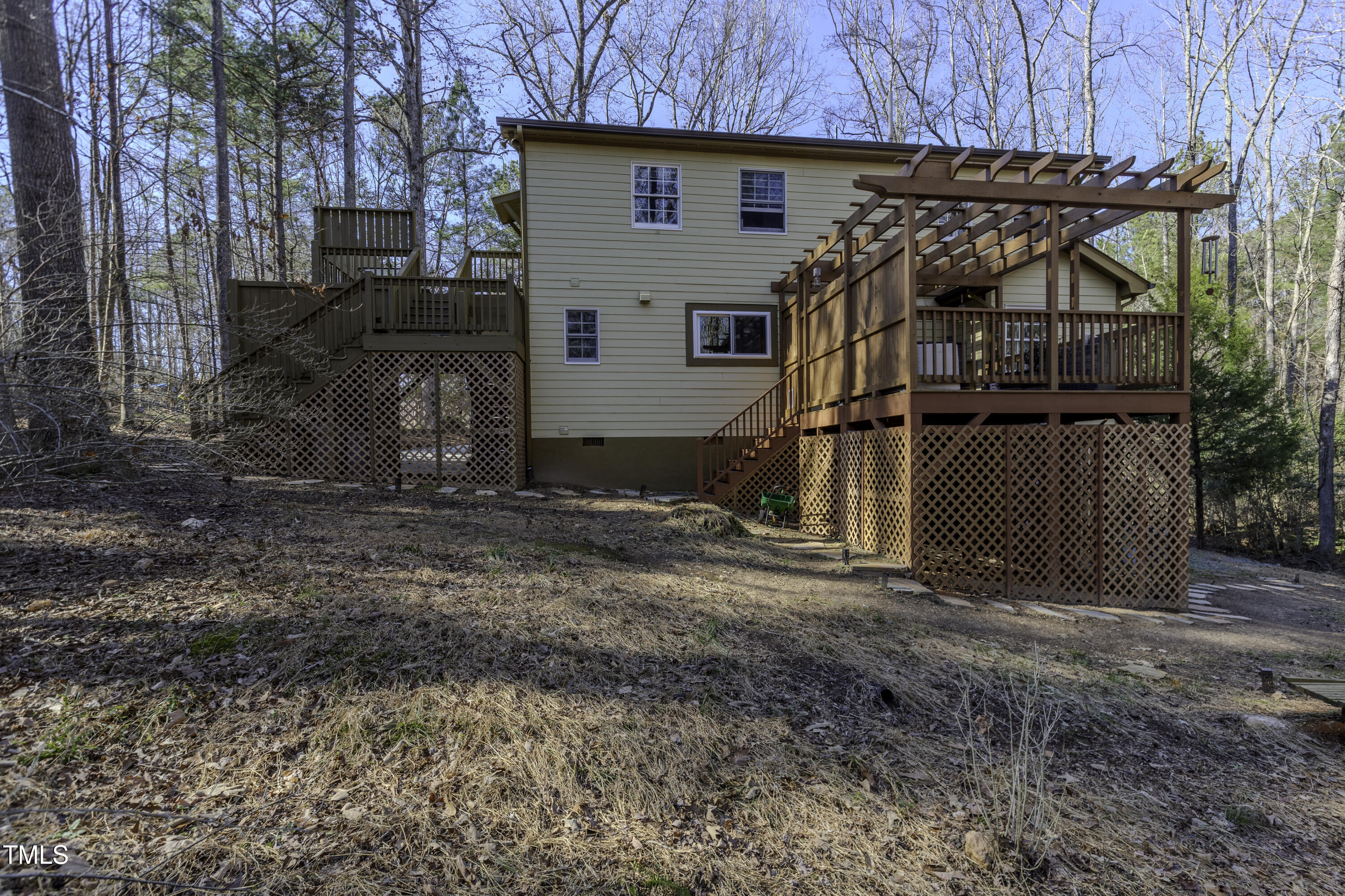 Immaculate 2-bedroom creekside home with 3-bedroom proportions, paved driveway, front screened landing, rear deck with pergola, large side deck, attached carport and walk-in crawl space. Extra high ceiling and solatubes in living space add beautiful natural light. Main floor primary features vaulted ceiling and sky light. New slate flooring (not pictured) and granite countertops in primary bath and walk-in closet. Upstairs bedroom suite with private entrance features a kitchenette, private deck and direct access to shared bath. New roof and gutters within the last 2 years, HVAC approximately 7 years old, new kitchen. Original owner. Very attractive neighborhood accessible to Chapel Hill and Carrboro.