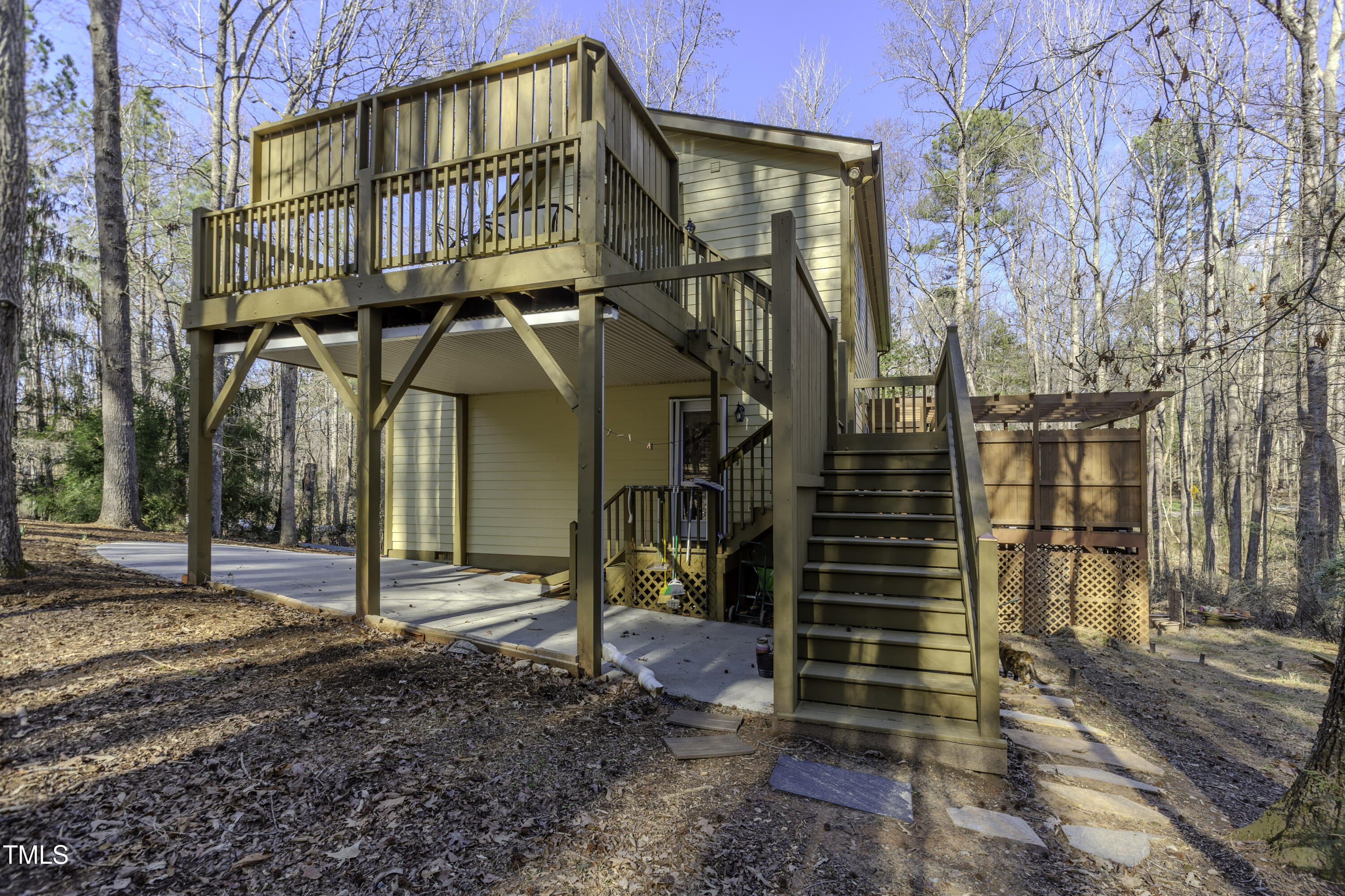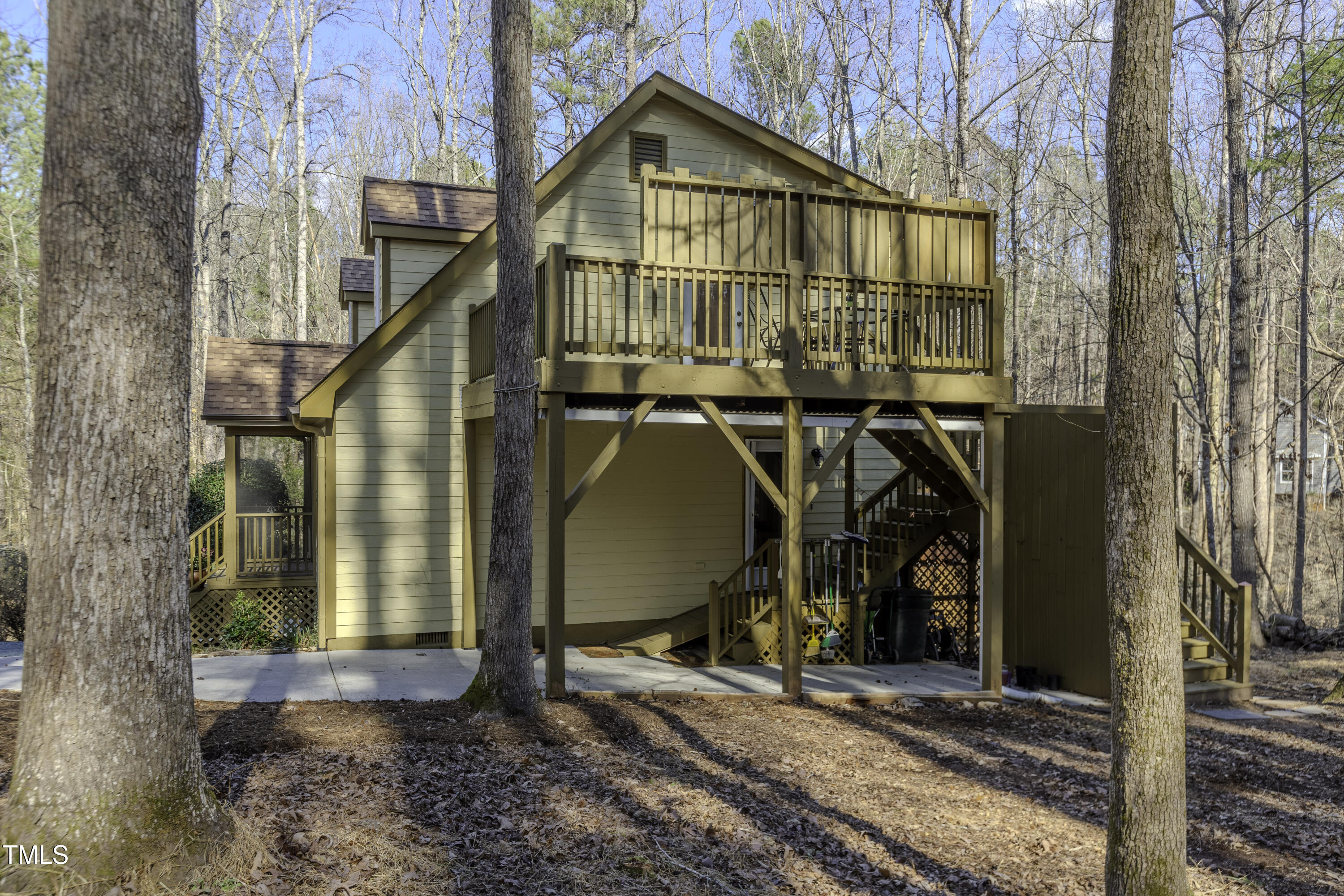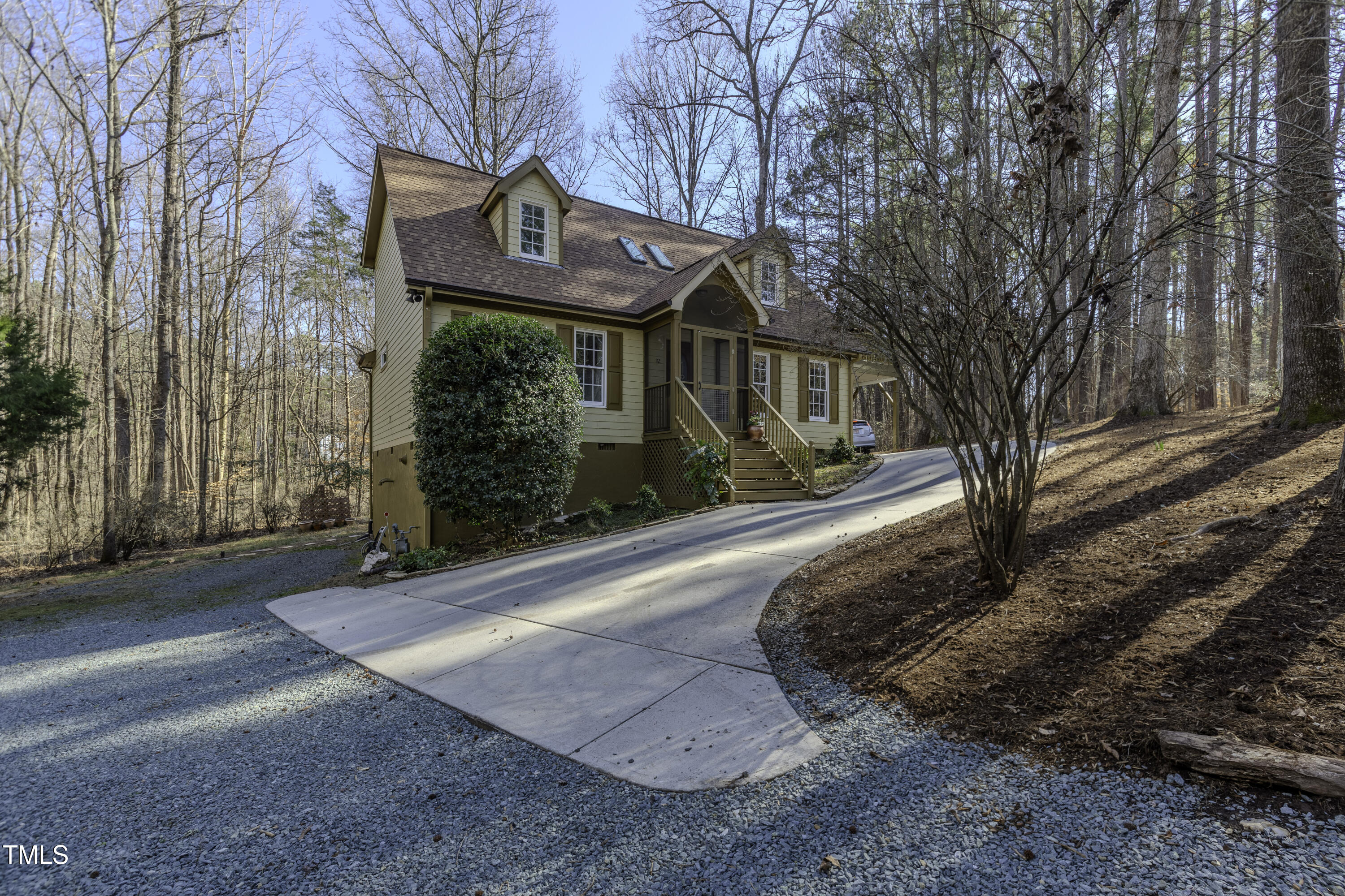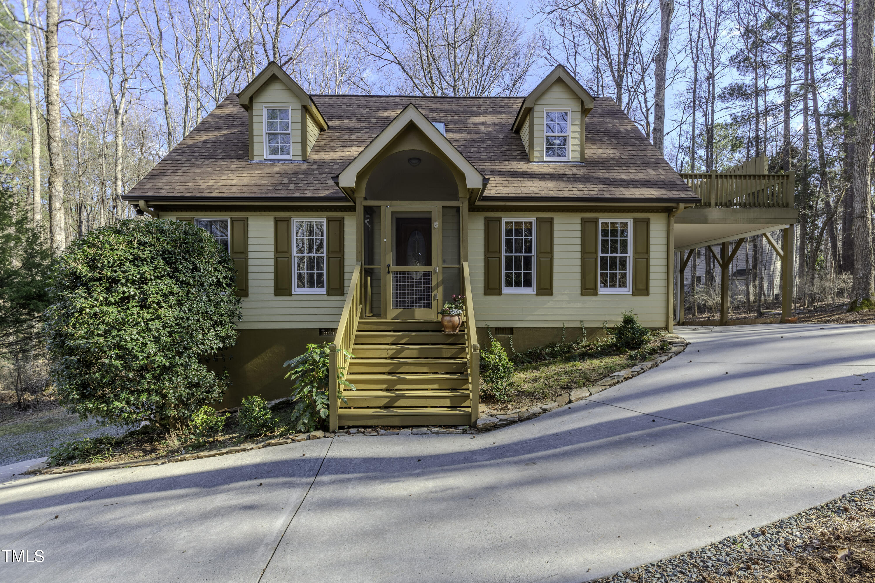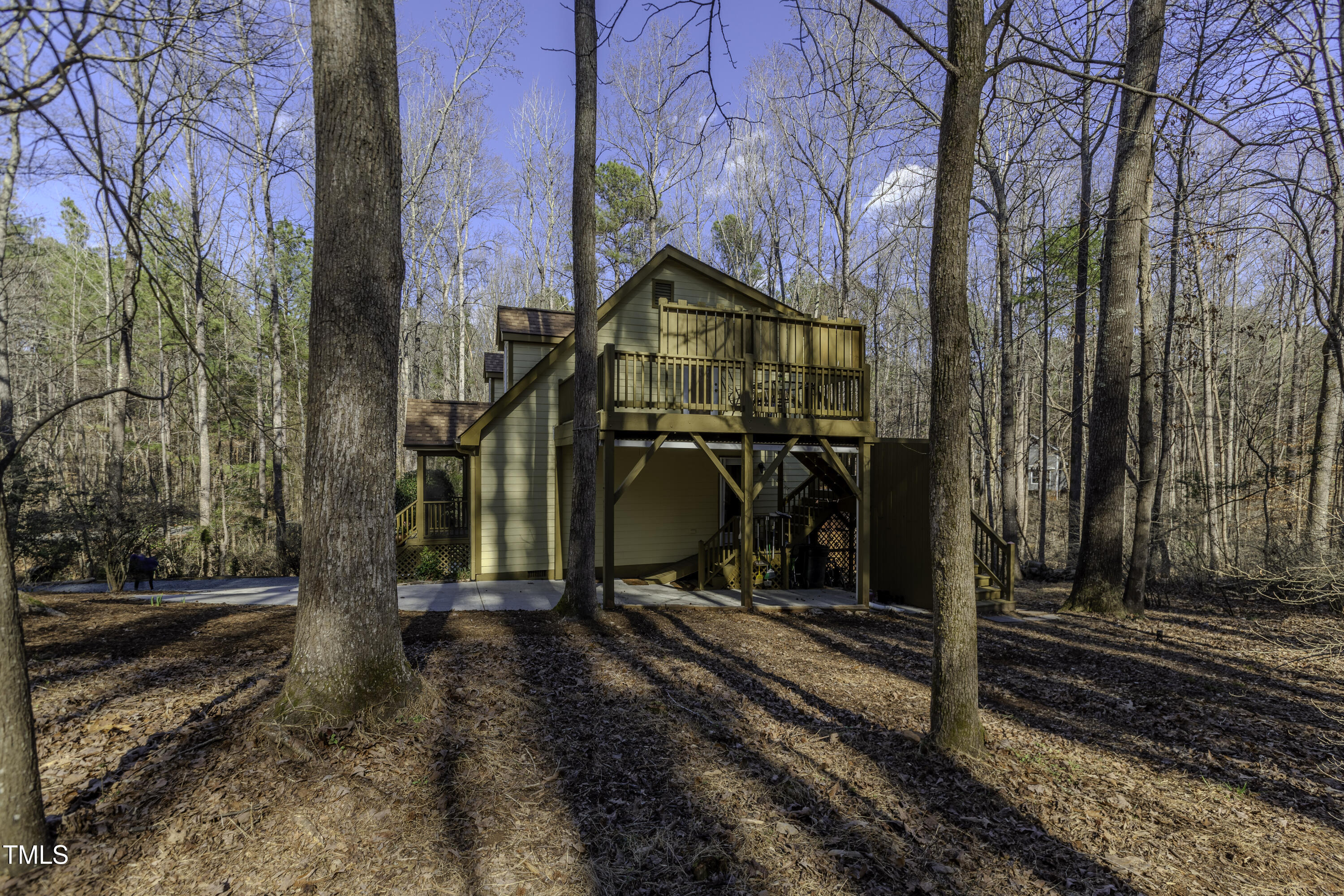 Immaculate 2-bedroom creekside home with 3-bedroom proportions, paved driveway, front screened landing, rear deck with pergola, large side deck, attached carport and walk-in crawl space. Extra high ceiling and solatubes in living space add beautiful natural light. Main floor primary features vaulted ceiling and sky light. New slate flooring (not pictured) and granite countertops in primary bath and walk-in closet. Upstairs bedroom suite with private entrance features a kitchenette, private deck and direct access to shared bath. New roof and gutters within the last 2 years, HVAC approximately 7 years old, new kitchen. Original owner. Very attractive neighborhood accessible to Chapel Hill and Carrboro.