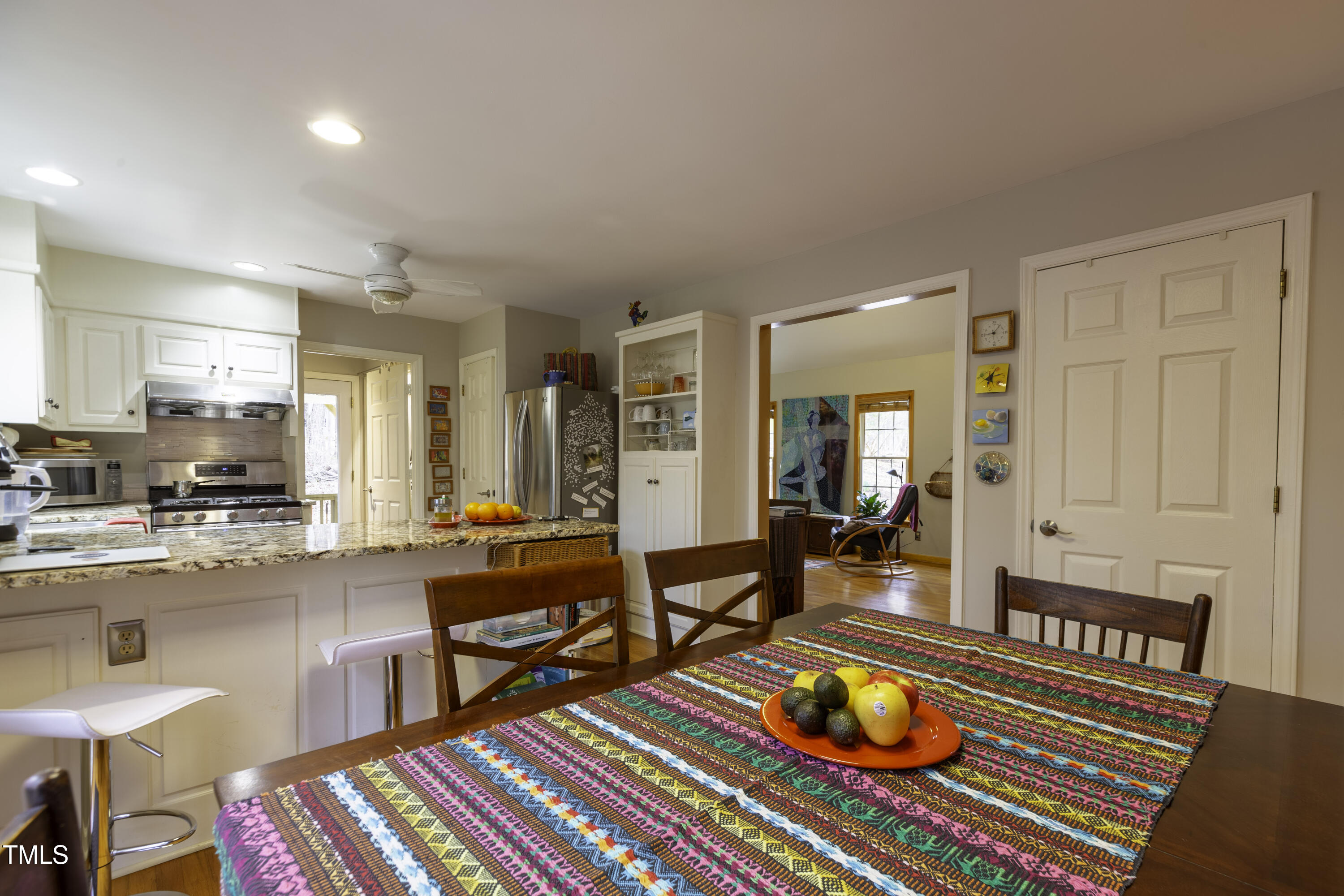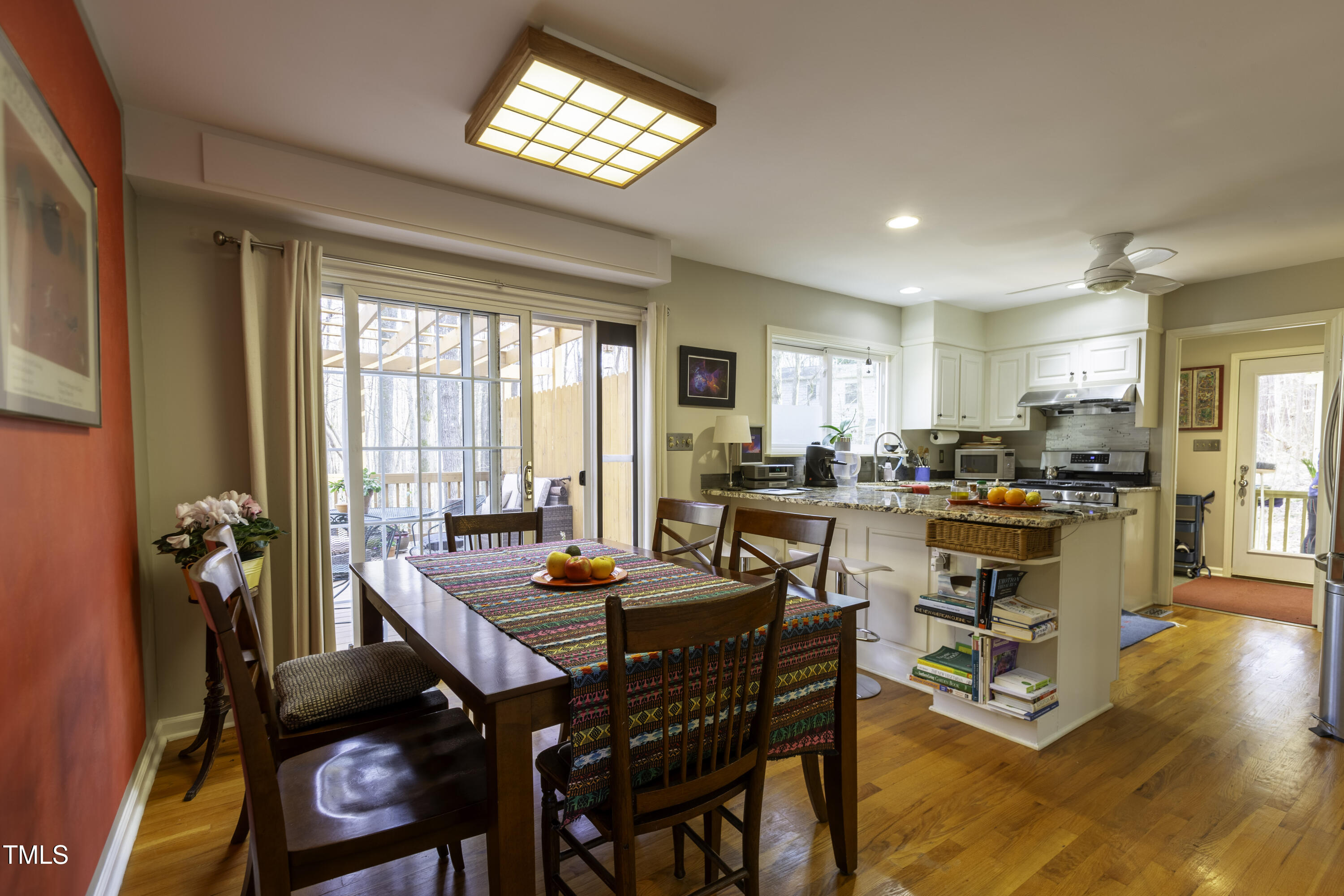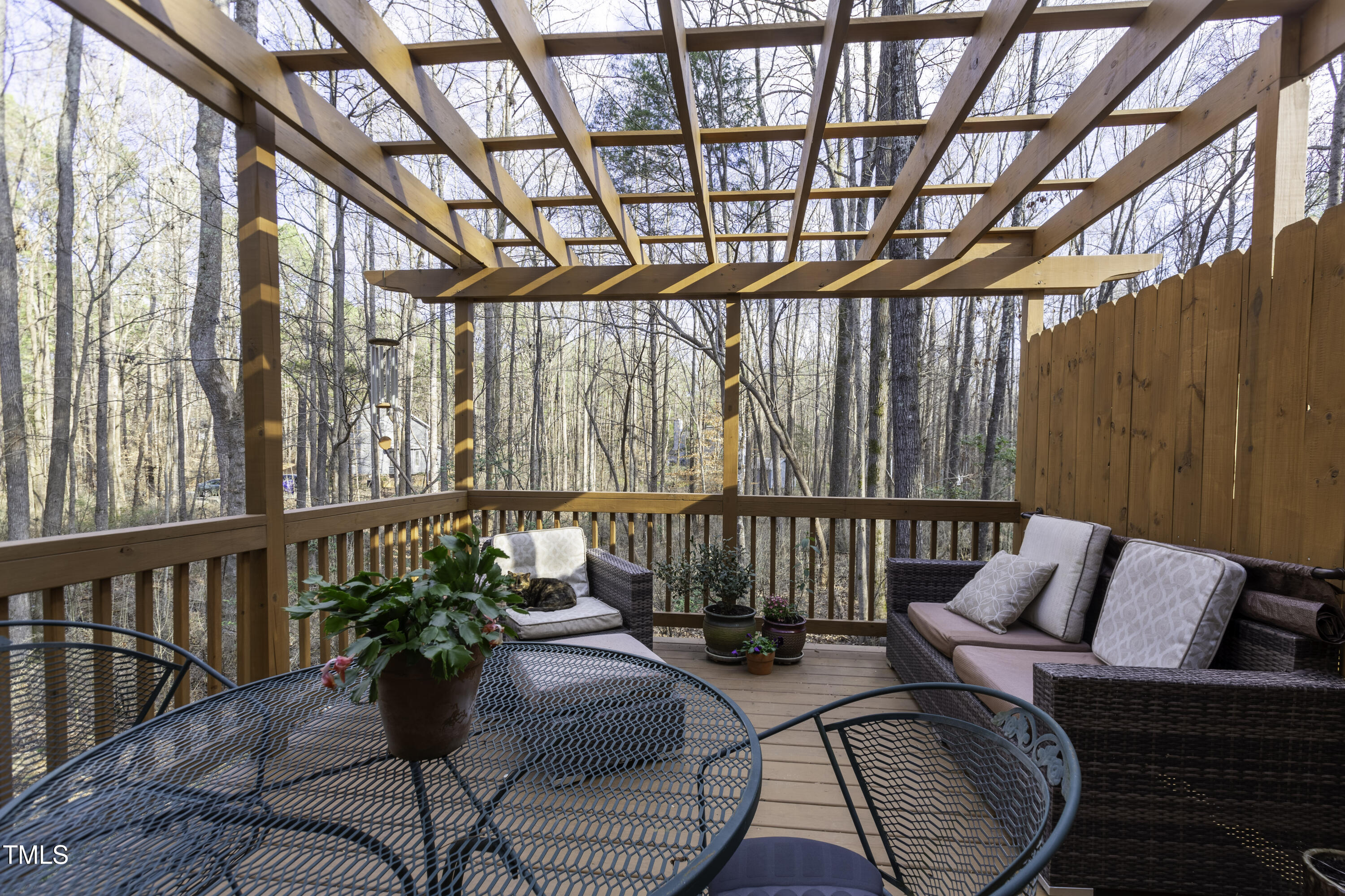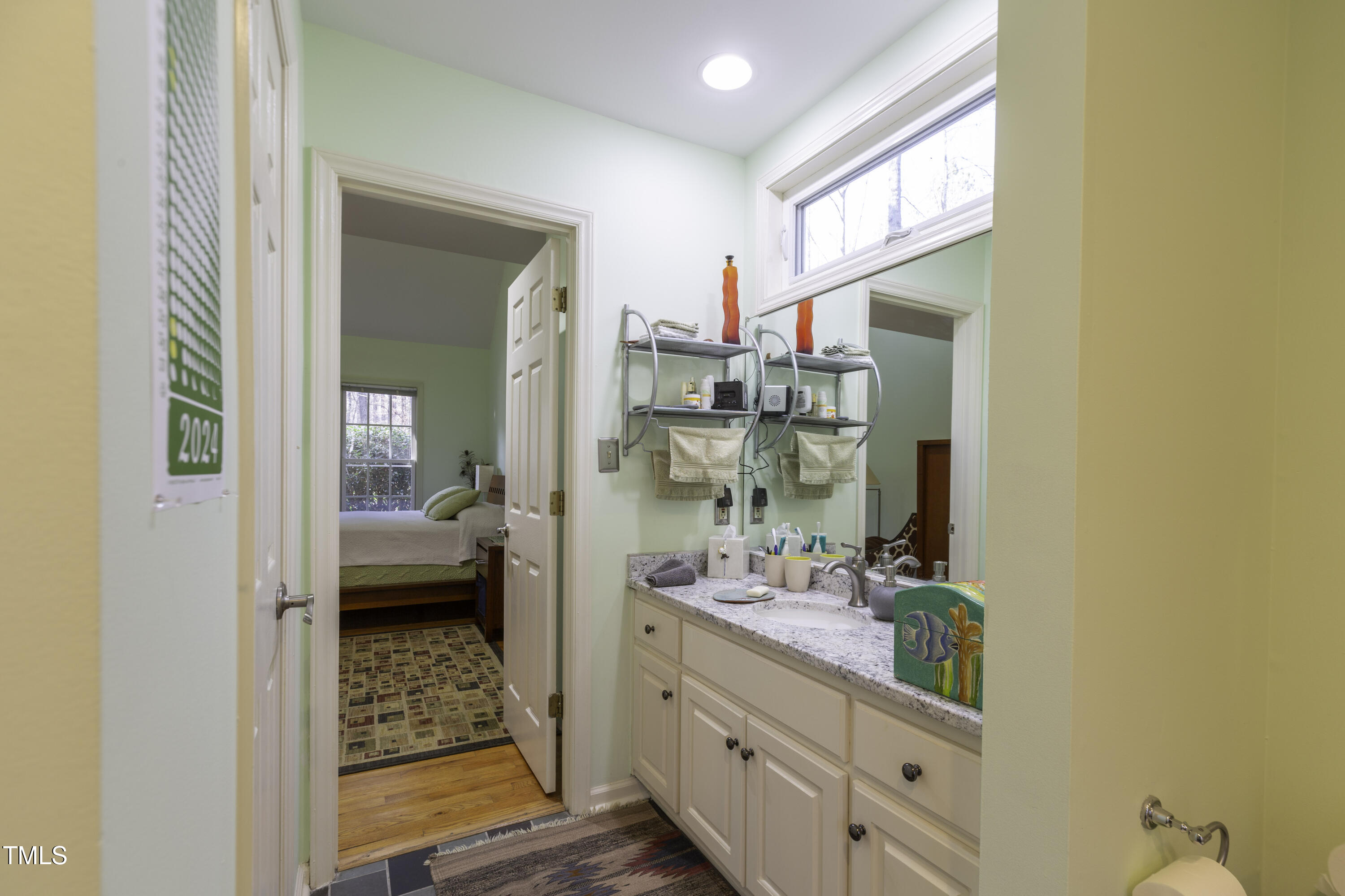 Immaculate 2-bedroom creekside home with 3-bedroom proportions, paved driveway, front screened landing, rear deck with pergola, large side deck, attached carport and walk-in crawl space. Extra high ceiling and solatubes in living space add beautiful natural light. Main floor primary features vaulted ceiling and sky light. New slate flooring (not pictured) and granite countertops in primary bath and walk-in closet. Upstairs bedroom suite with private entrance features a kitchenette, private deck and direct access to shared bath. New roof and gutters within the last 2 years, HVAC approximately 7 years old, new kitchen. Original owner. Very attractive neighborhood accessible to Chapel Hill and Carrboro.