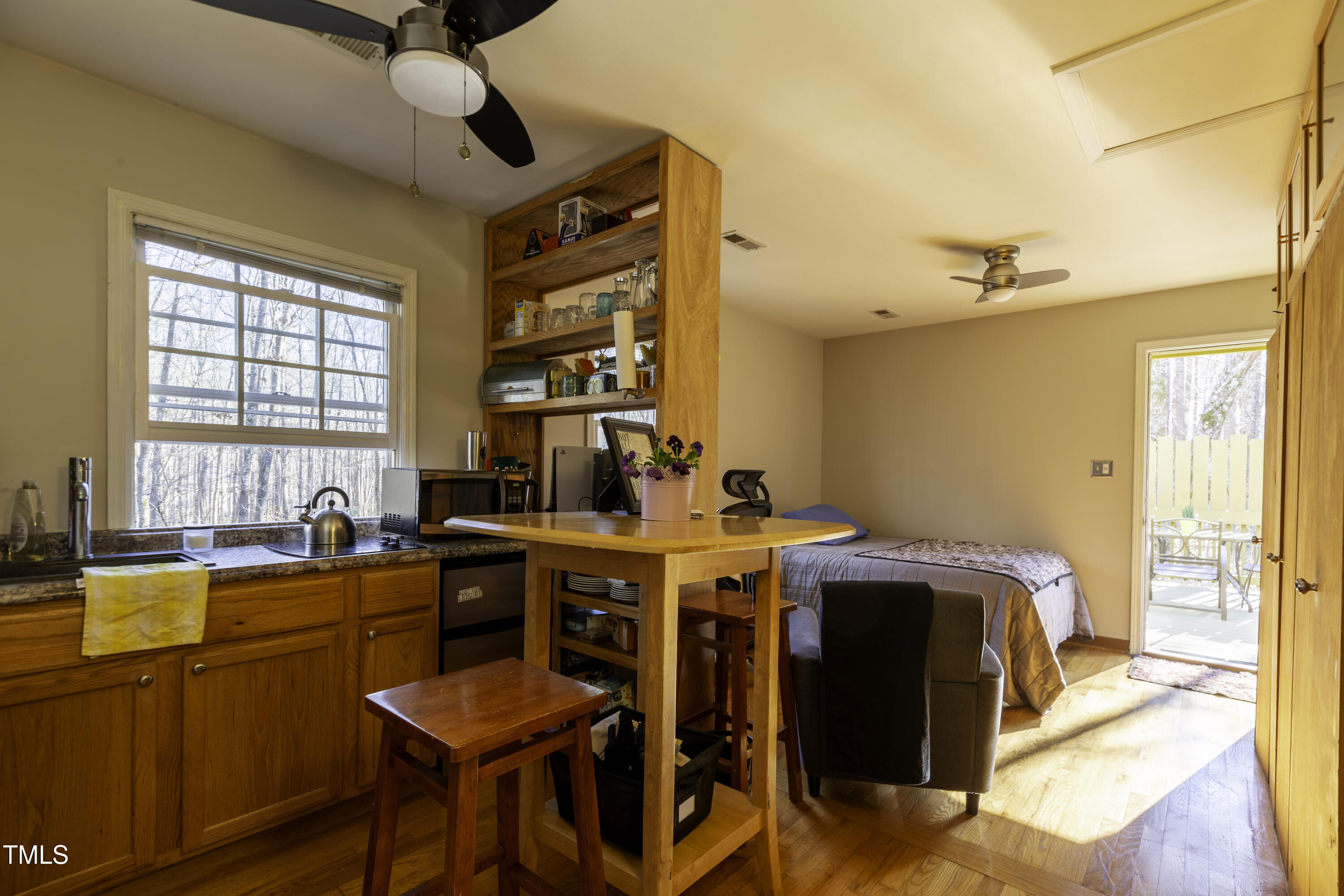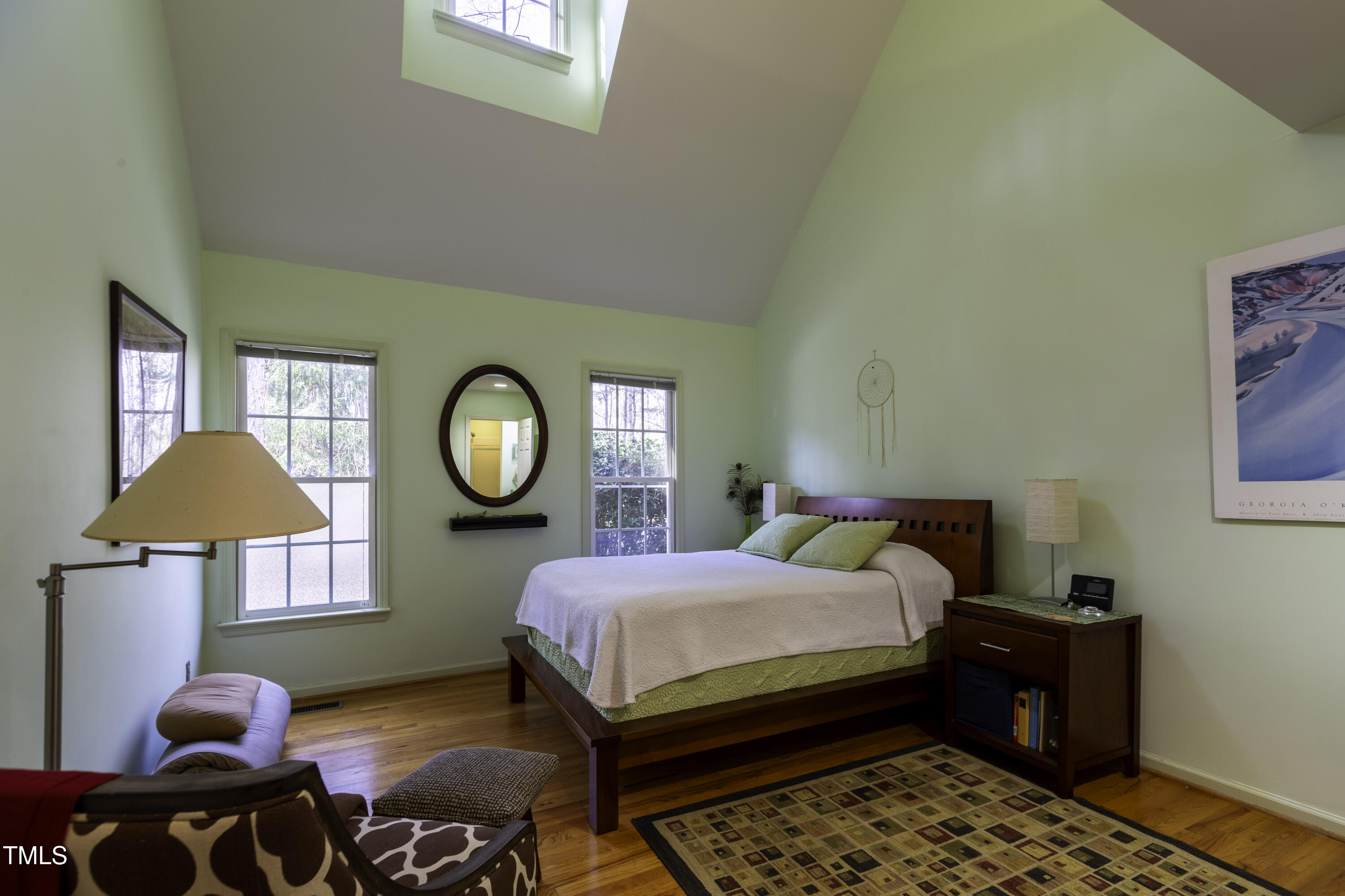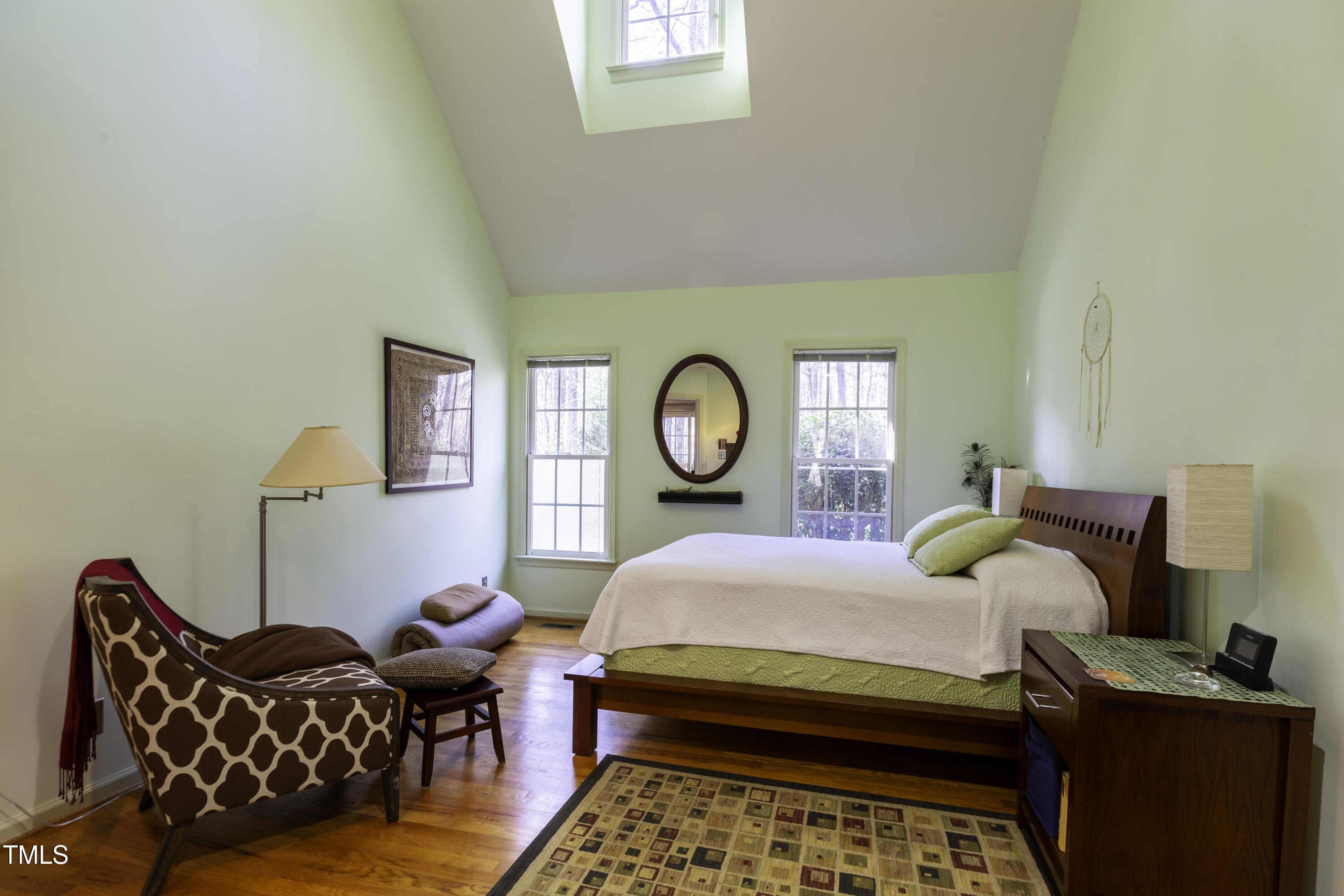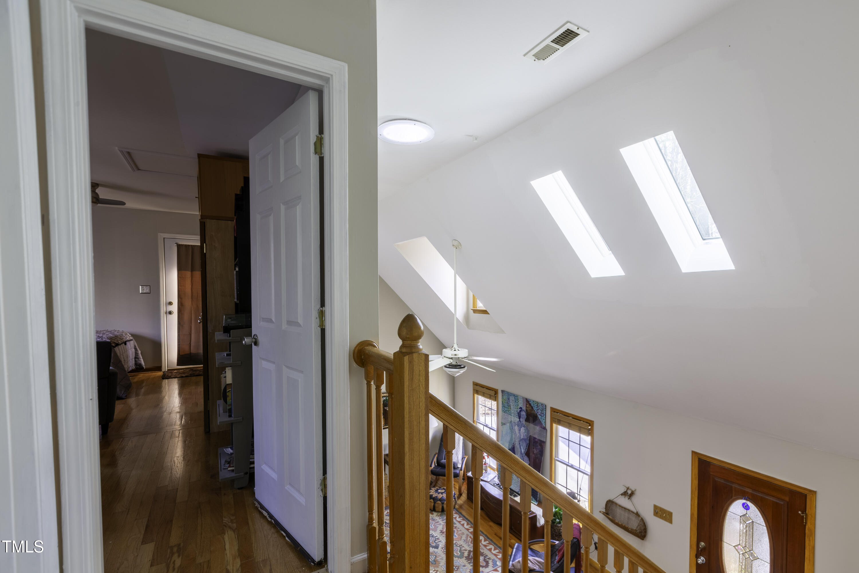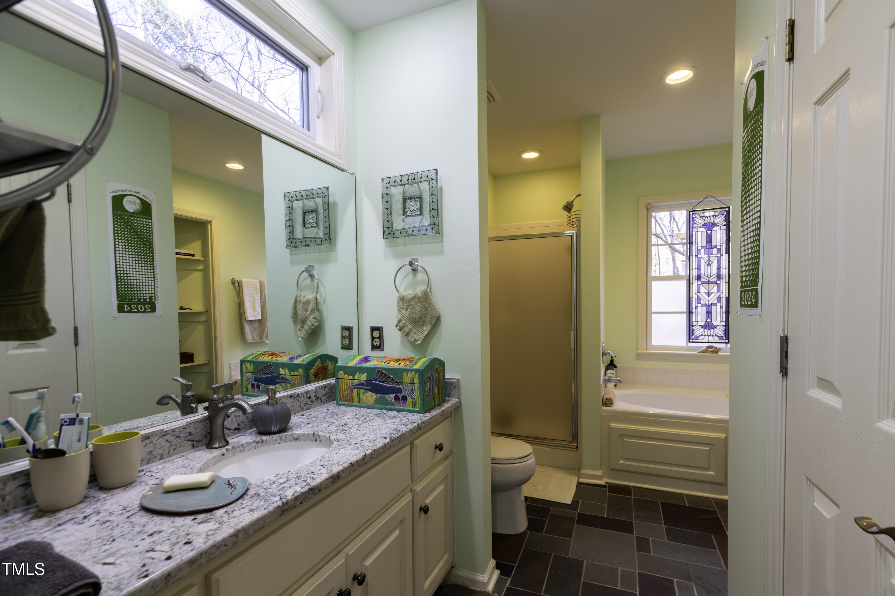 Immaculate 2-bedroom creekside home with 3-bedroom proportions, paved driveway, front screened landing, rear deck with pergola, large side deck, attached carport and walk-in crawl space. Extra high ceiling and solatubes in living space add beautiful natural light. Main floor primary features vaulted ceiling and sky light. New slate flooring (not pictured) and granite countertops in primary bath and walk-in closet. Upstairs bedroom suite with private entrance features a kitchenette, private deck and direct access to shared bath. New roof and gutters within the last 2 years, HVAC approximately 7 years old, new kitchen. Original owner. Very attractive neighborhood accessible to Chapel Hill and Carrboro.