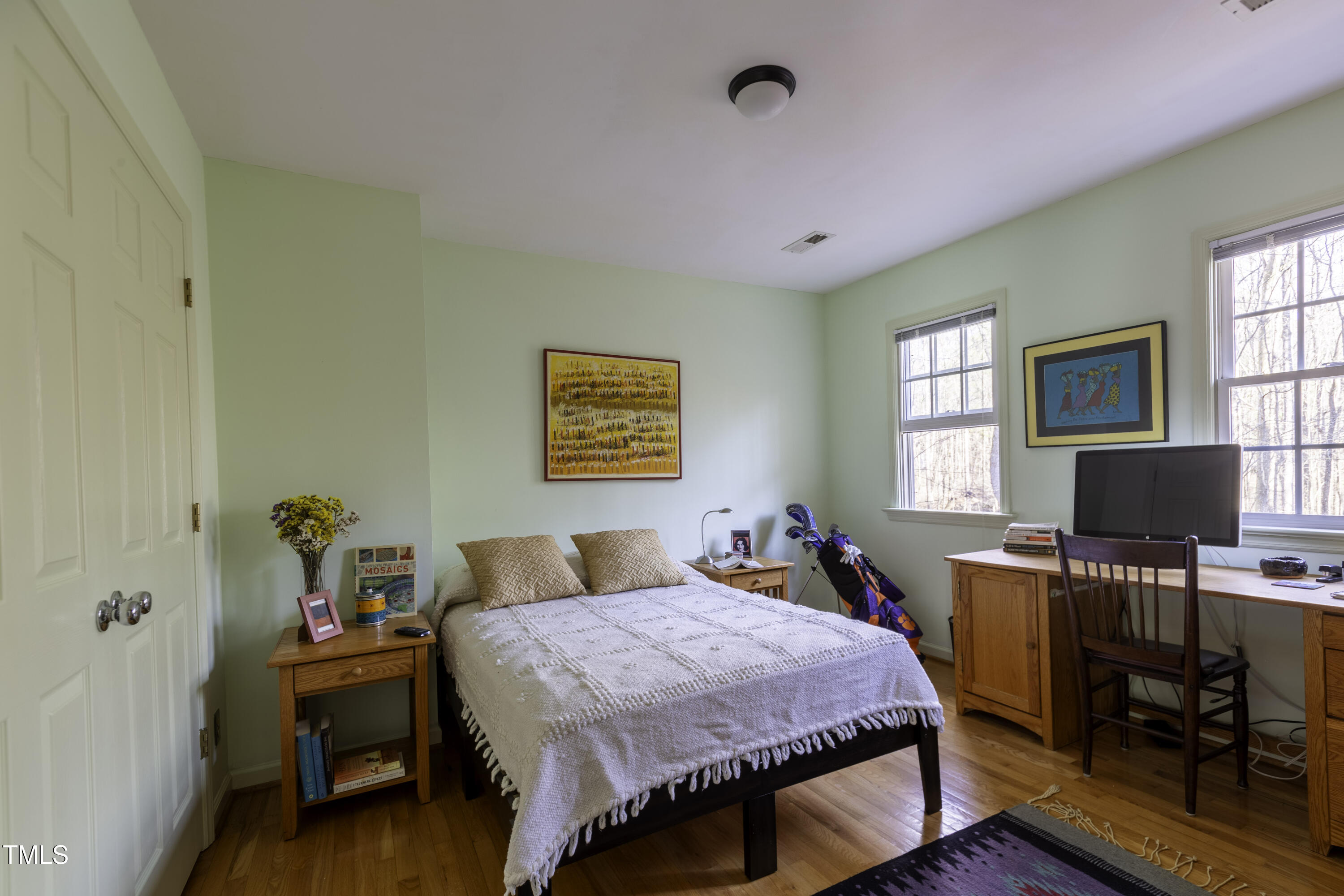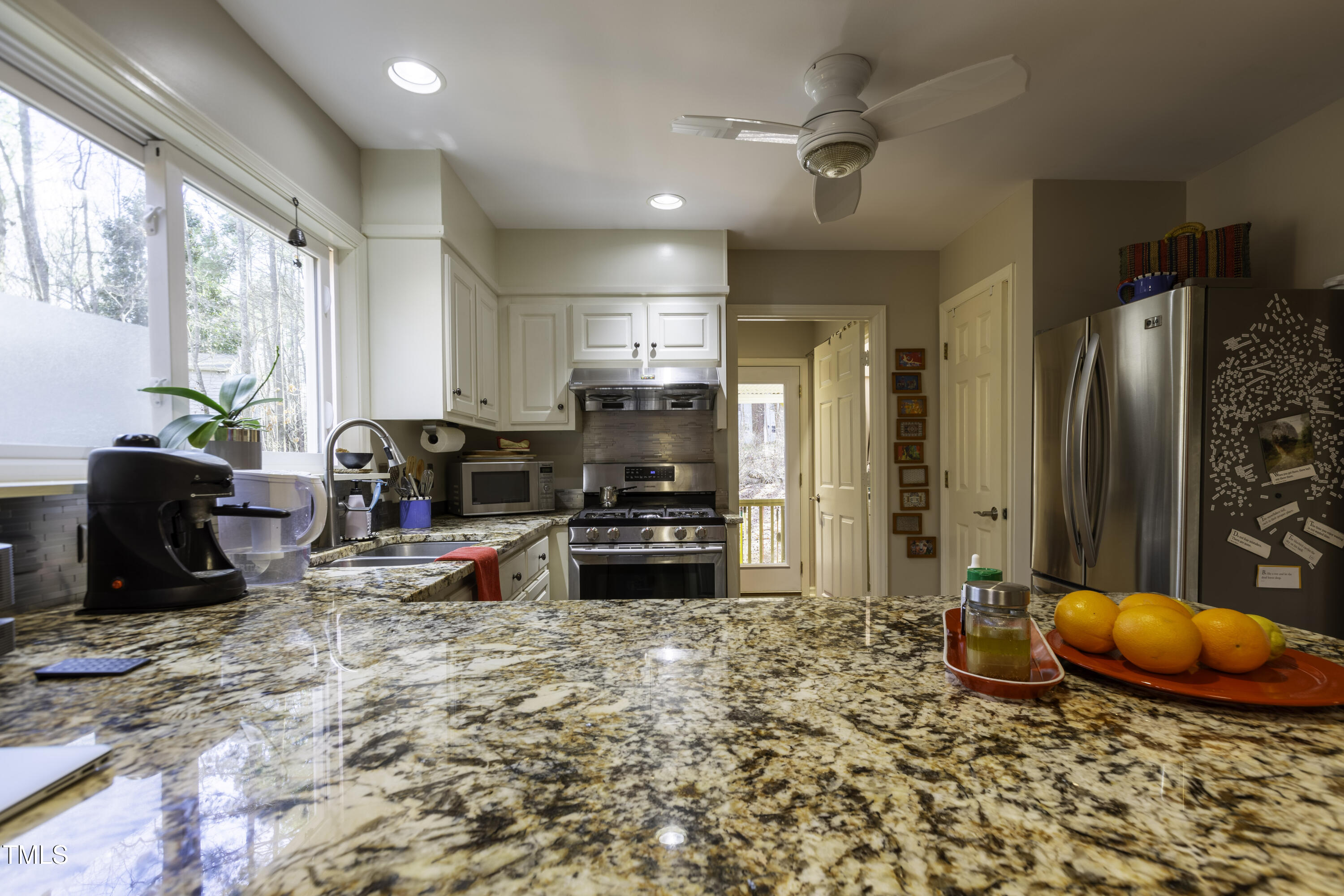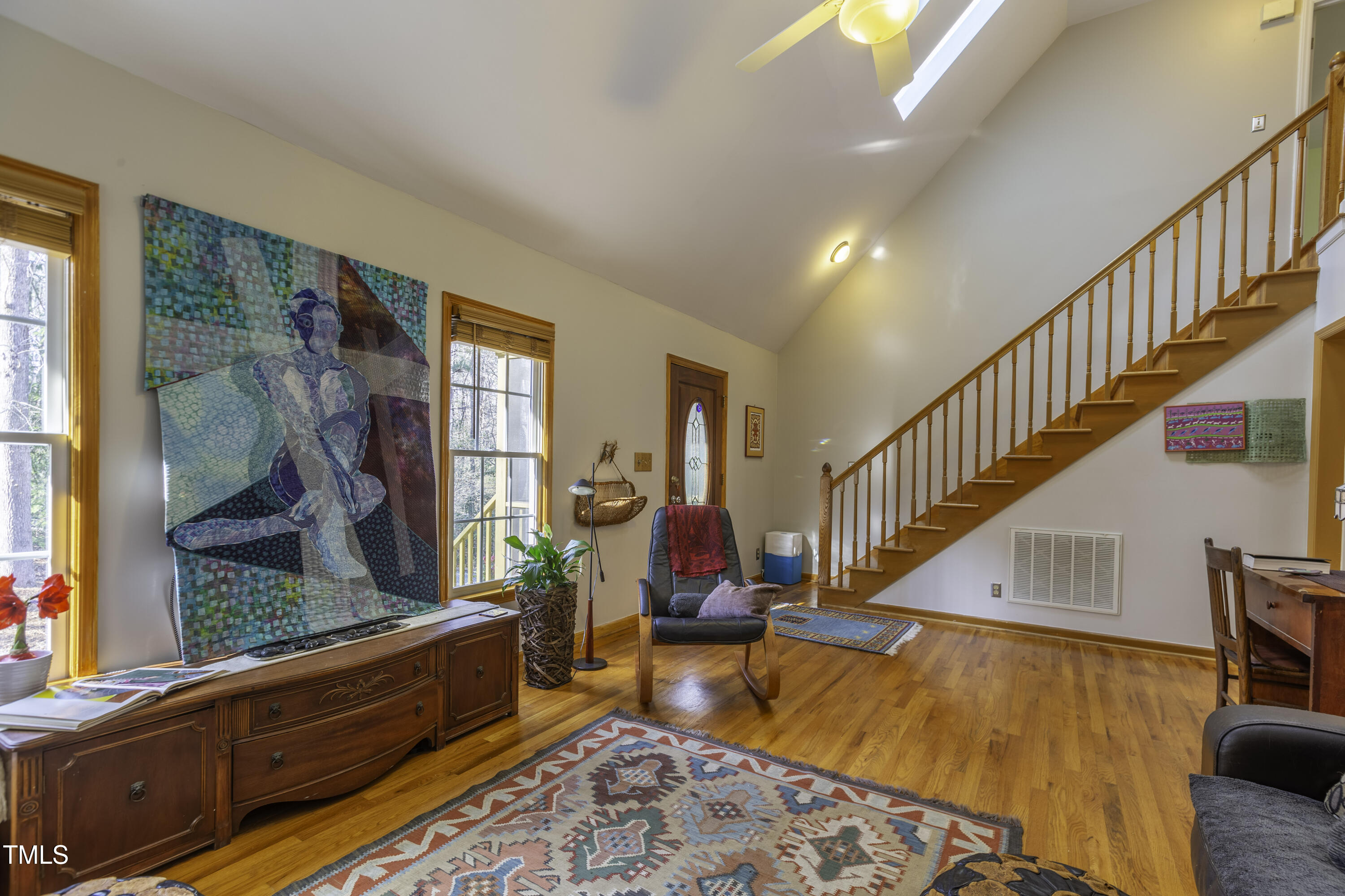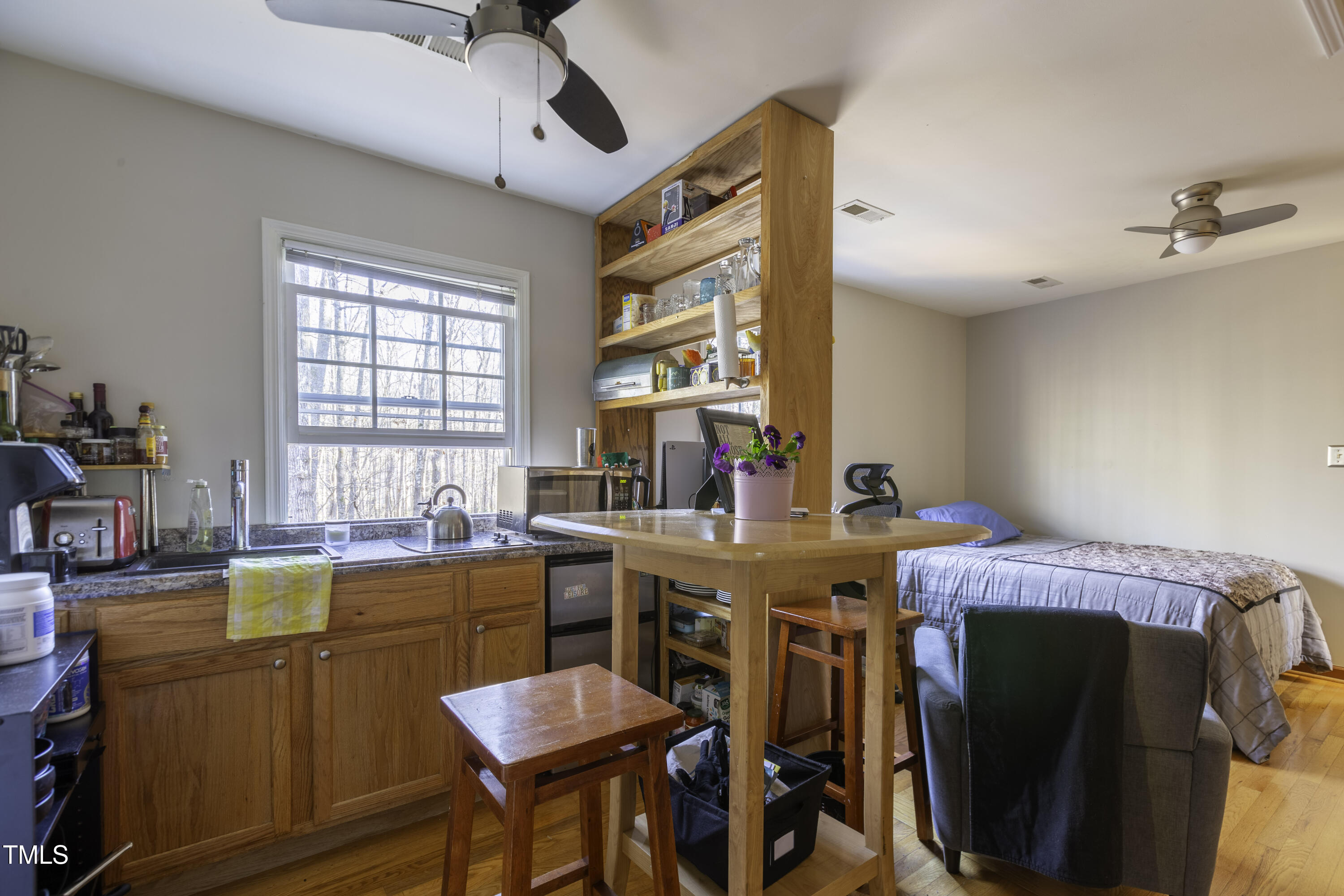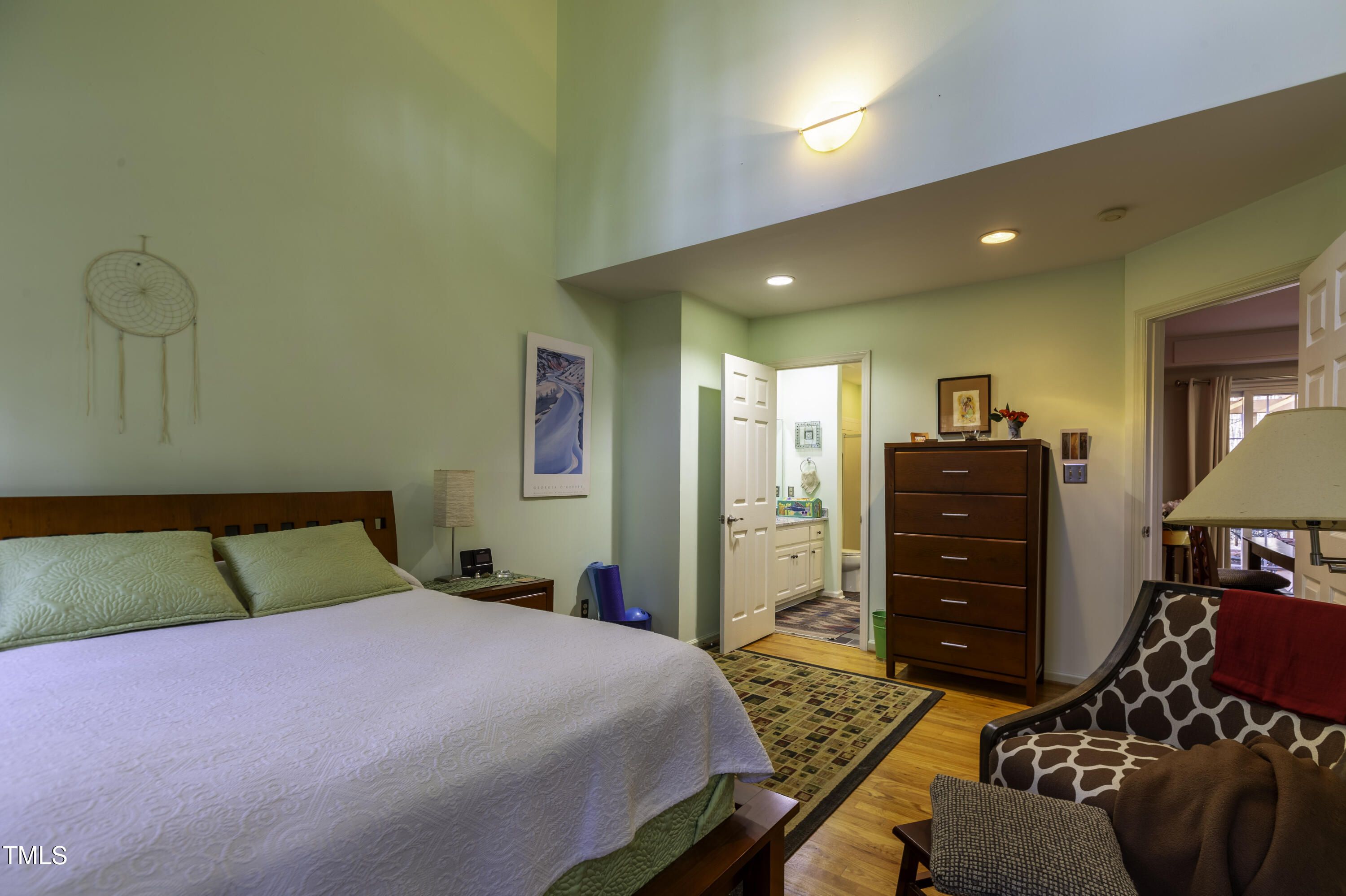 Immaculate 2-bedroom creekside home with 3-bedroom proportions, paved driveway, front screened landing, rear deck with pergola, large side deck, attached carport and walk-in crawl space. Extra high ceiling and solatubes in living space add beautiful natural light. Main floor primary features vaulted ceiling and sky light. New slate flooring (not pictured) and granite countertops in primary bath and walk-in closet. Upstairs bedroom suite with private entrance features a kitchenette, private deck and direct access to shared bath. New roof and gutters within the last 2 years, HVAC approximately 7 years old, new kitchen. Original owner. Very attractive neighborhood accessible to Chapel Hill and Carrboro.