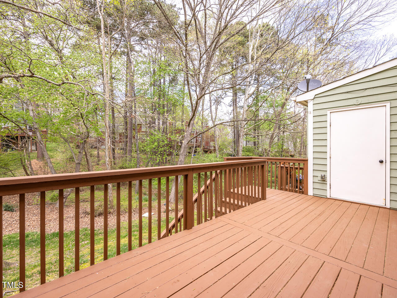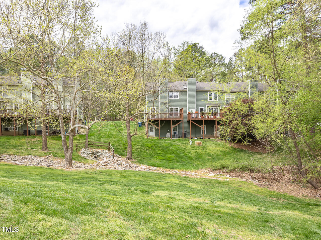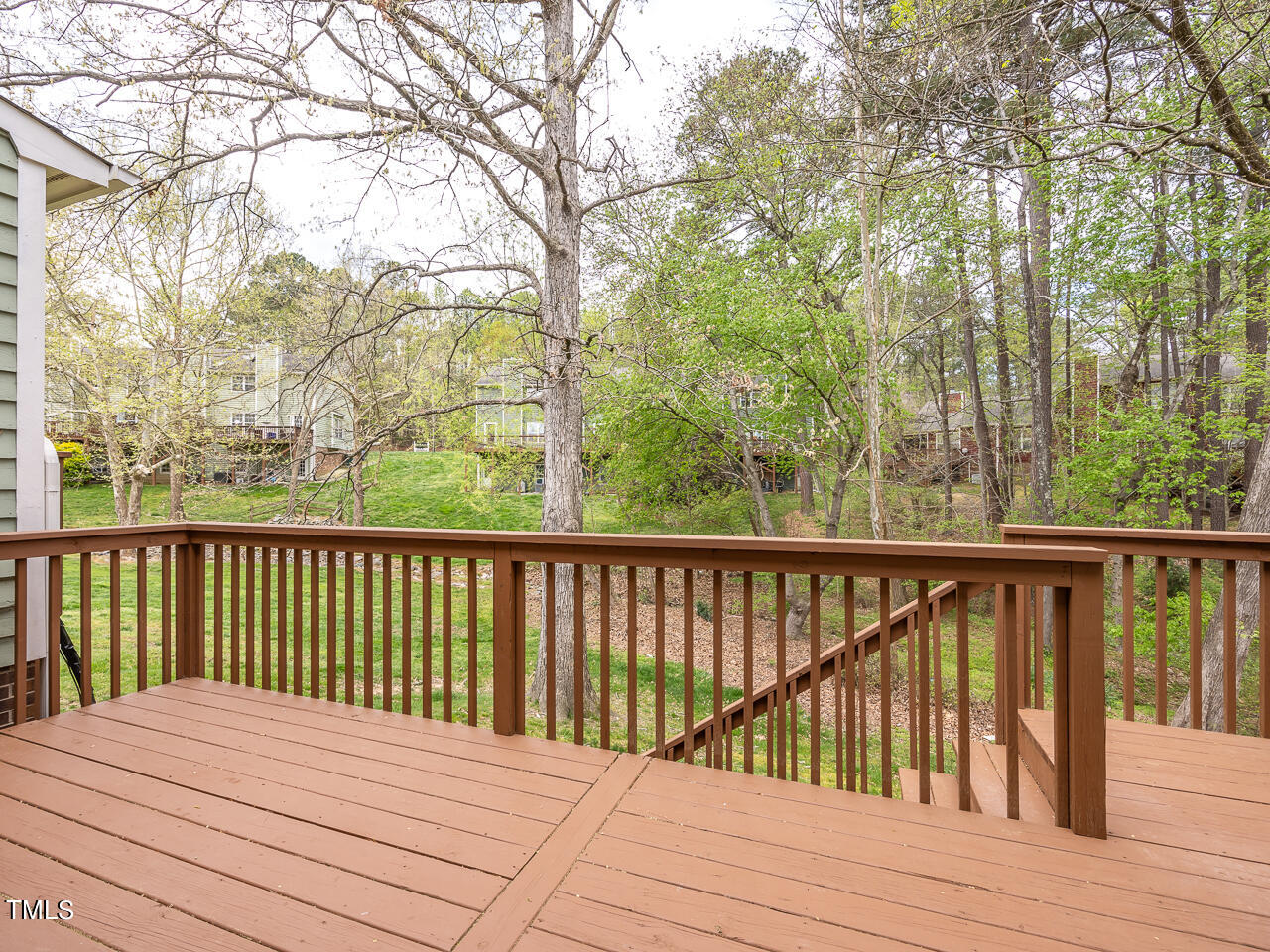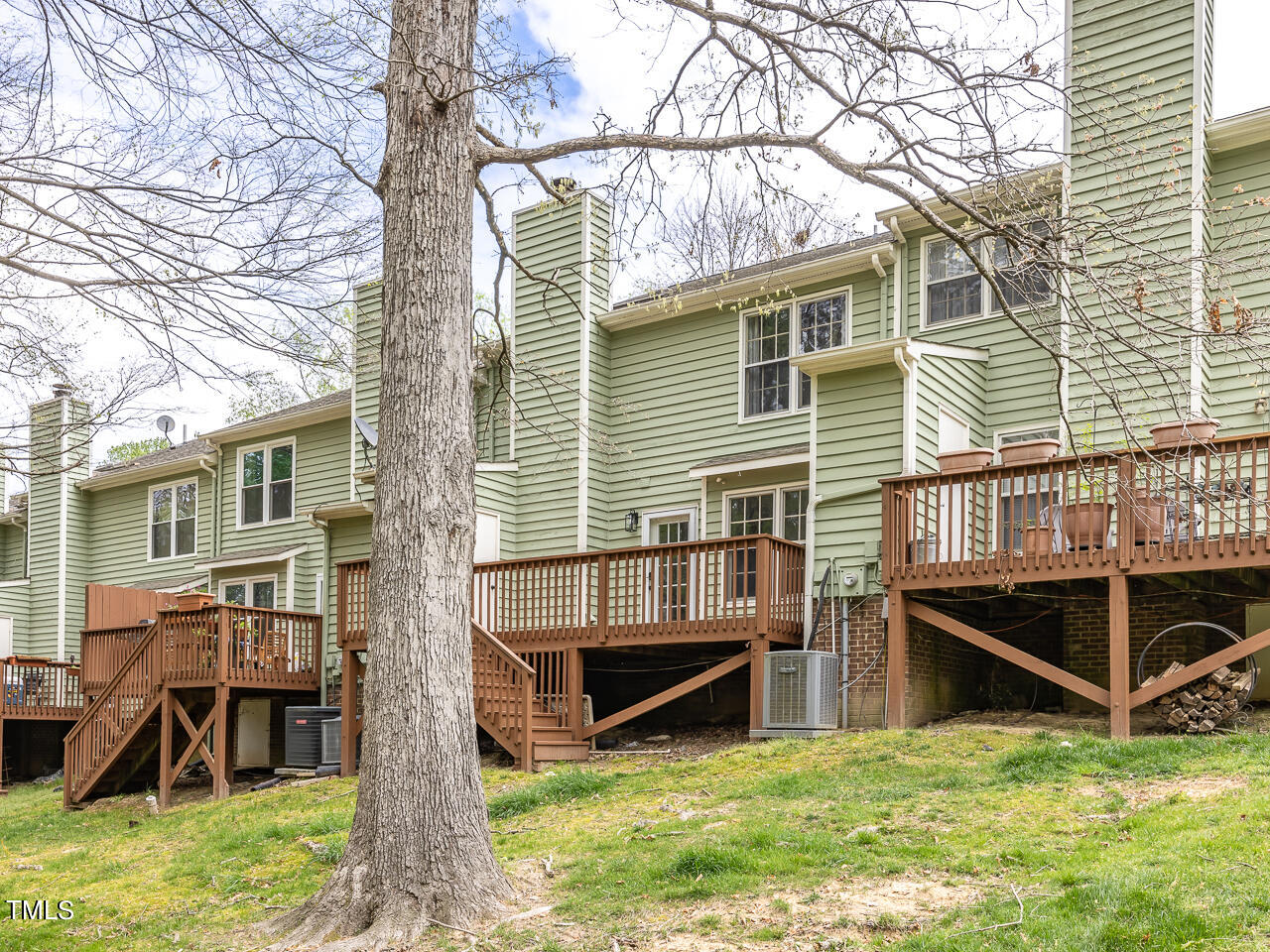 The best that Woodcroft has to offer - a serene place to call home with all conveniences close by. The fresh landscaping at the front door welcomes you to a light, bright, move-in-ready home. A brand new HVAC, maintenance free LVP flooring, quartz countertops, stainless steel appliances, chic light fixtures...the list of updates goes on and on. Rare and coveted floorplan features first floor double door office plus three spacious bedrooms upstairs including vaulted ceiling primary suite with naturally skylit bathroom and walk in closet. Relax in the cozy den with wood burning fireplace or open the door to expansive deck that overlooks private natural area with wildlife and creek. Plenty of space for roommates or guests, updated bathrooms, covered front porch and 6 miles of walking trails throughout the neighborhood with direct access to the American Tobacco Trail. No headaches, no design updates to think about....just move right in!