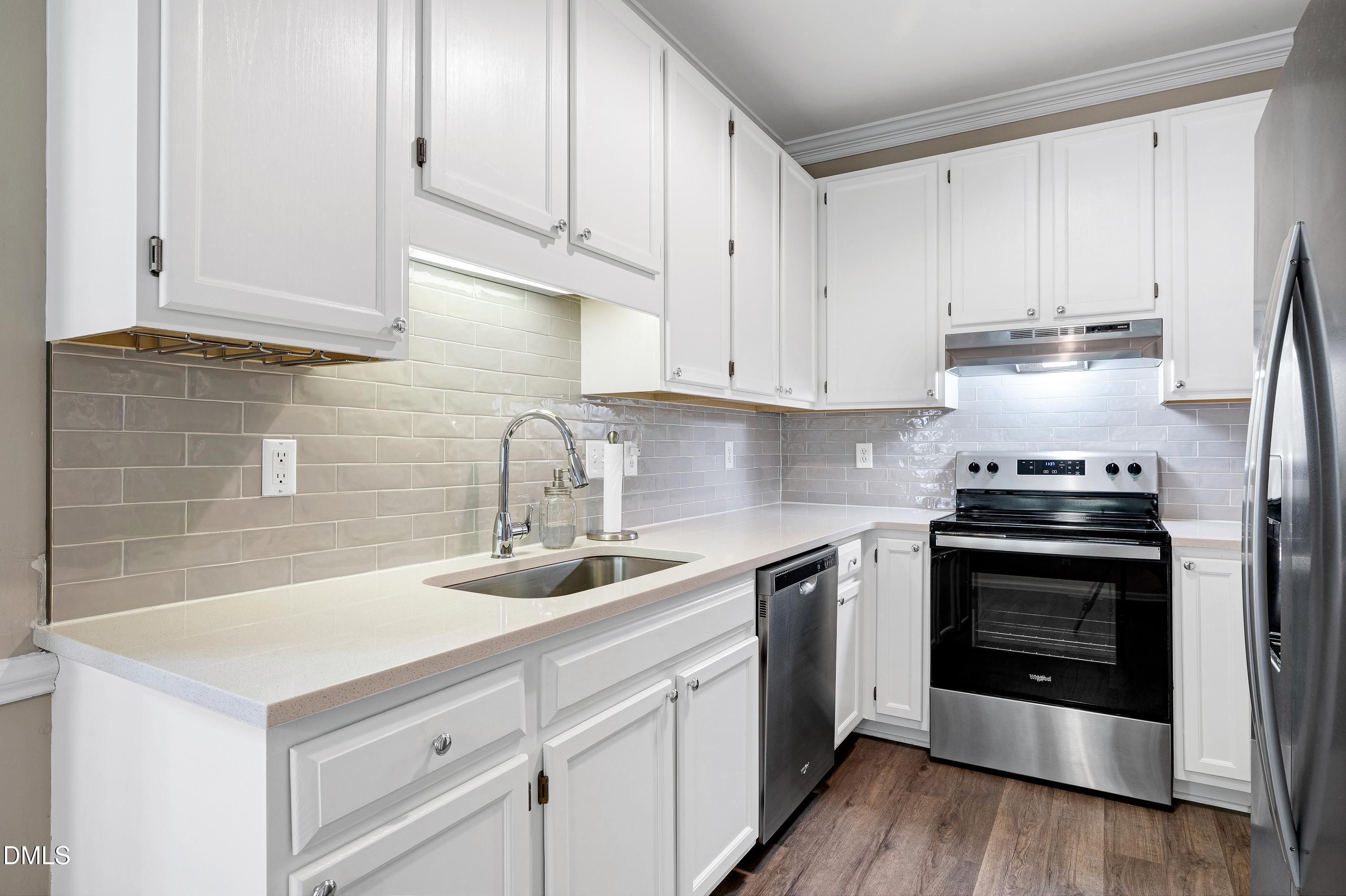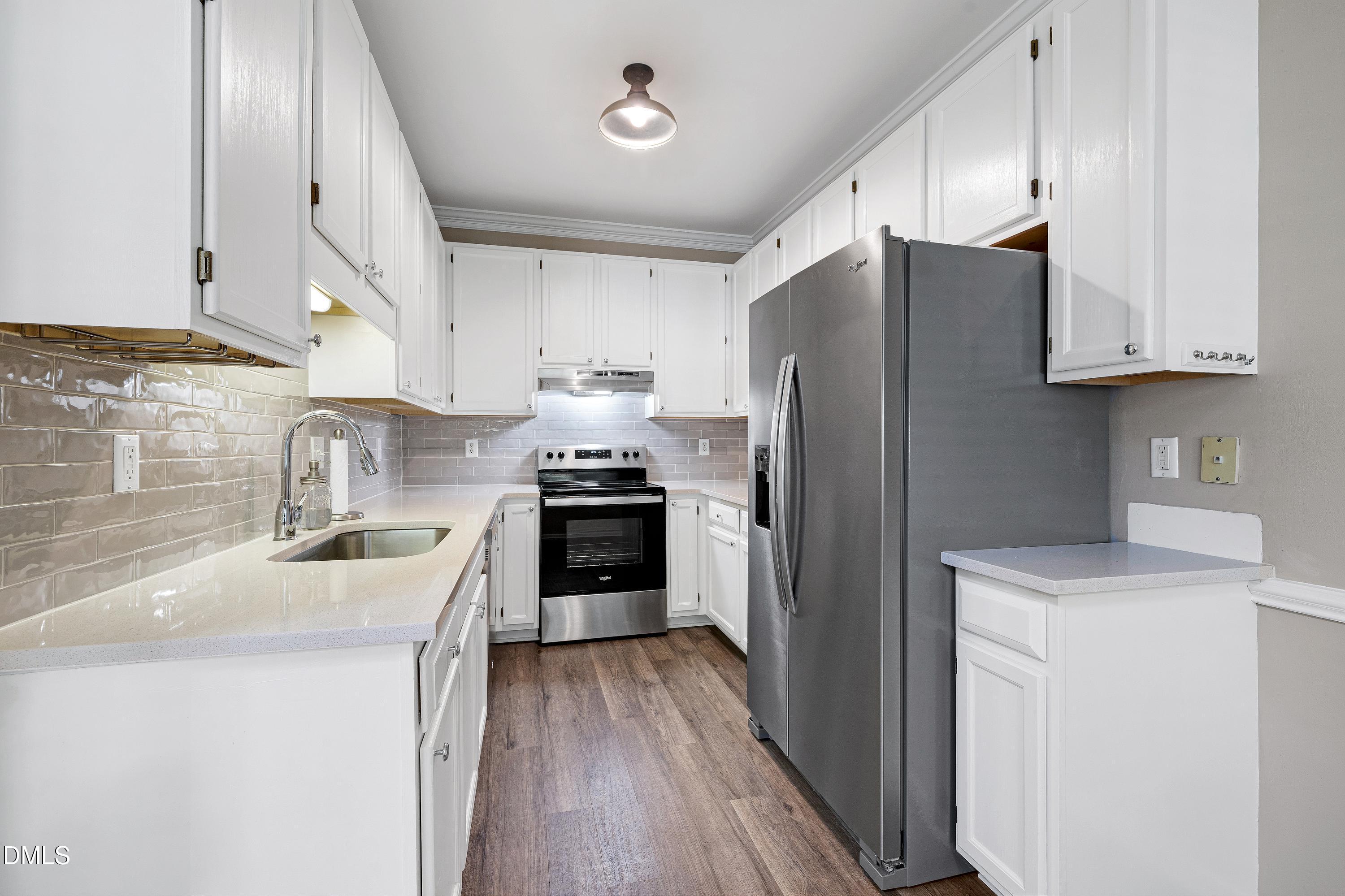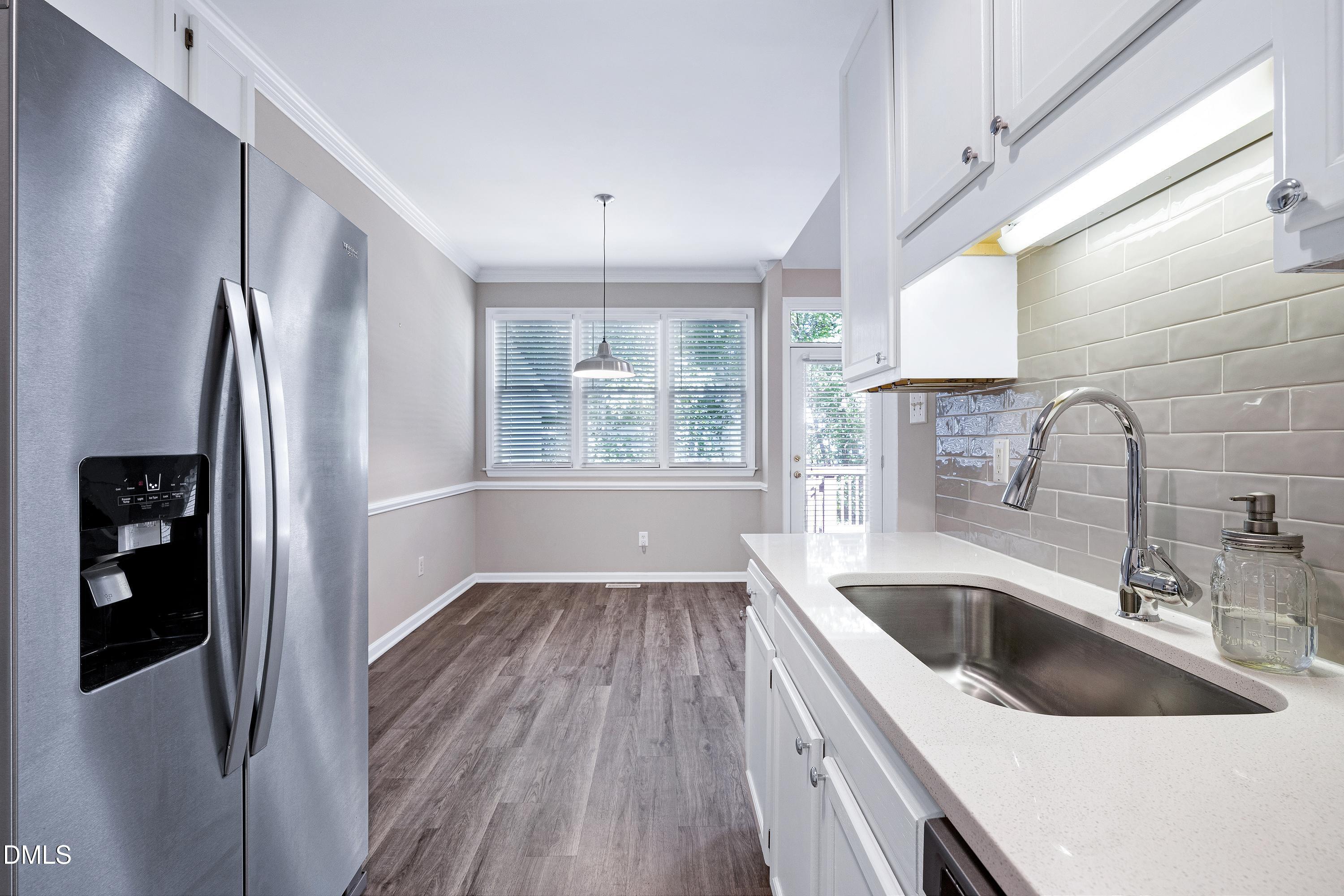 You will absolutely fall in love with this adorable townhome- it's the best location in Cary with great schools, fantastic restaurants, Bond Park, the downtown Cary Park, Fenton Shopping Plaza and cool coffee shops, gyms and culture! The home is imaculate, move -in ready and like new! Open floor plan with gorgeous LVP flooring, brand new contemporary light fixtures, recessed lighting and recently installed creamy white, new kitchen cabinets and custom quartz countertops and new stainless appliances- including the refrigerator! Bright and spacious with a primary bedroom on the main level featuring large closets, ceiling fan and spa bath! Unique characteristics throughout with 2 story cathedral ceiling that joins the dining and living room seamlessly, skylight, corner fireplace and mantle! Upstairs is a loft, a massive second primary bedroom 21x14 with room for an office! Spa bath, walk in closet and laundry room with washer and dryer. Massive outdoor deck with stairs and a privacy gate. Private, wooded view is beautiful! Pool, clubhouse and yard maintenance included. New shrubbery to be added to the front yard soon! HOA covers the roof and most exterior maintenance!