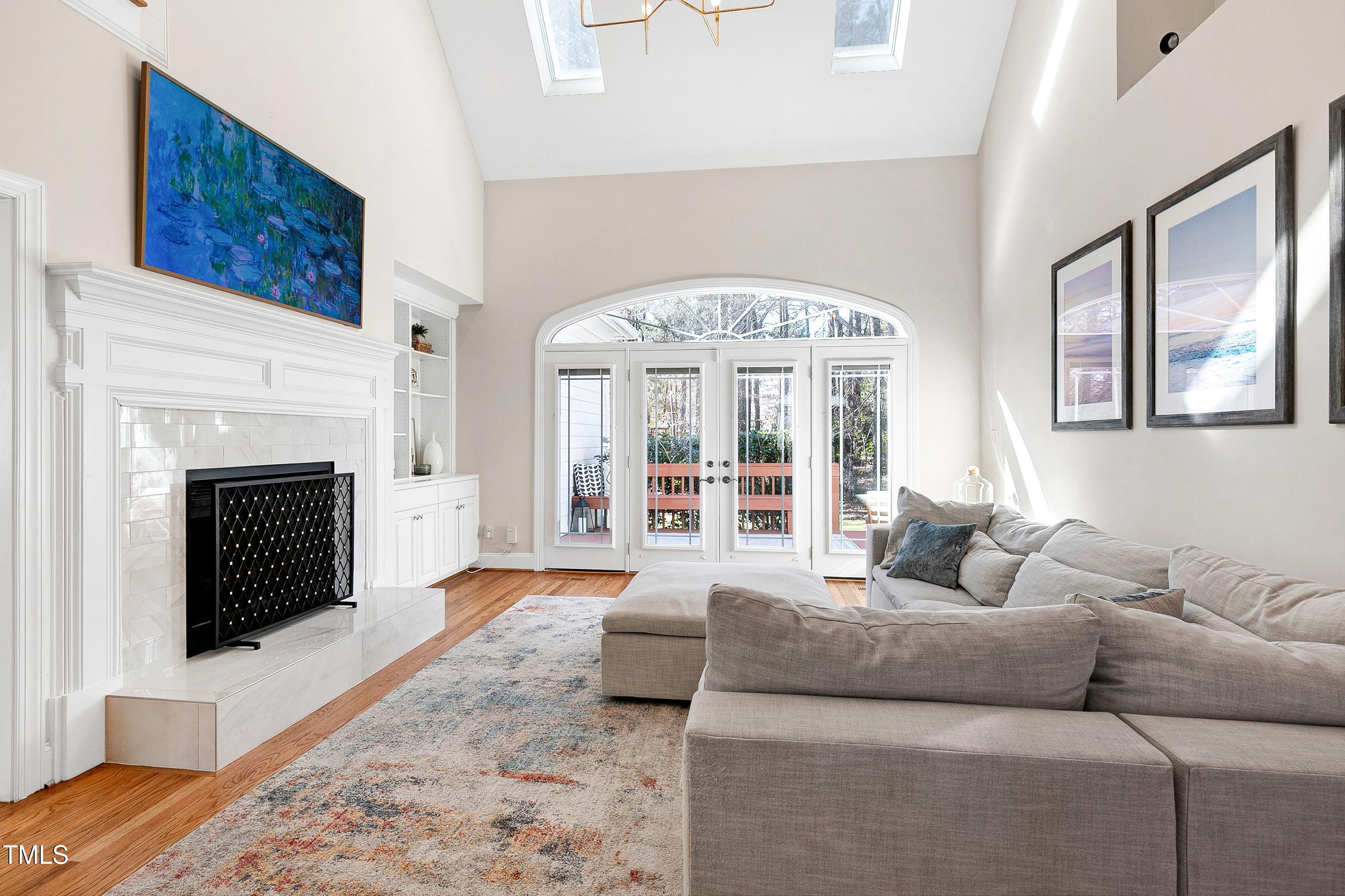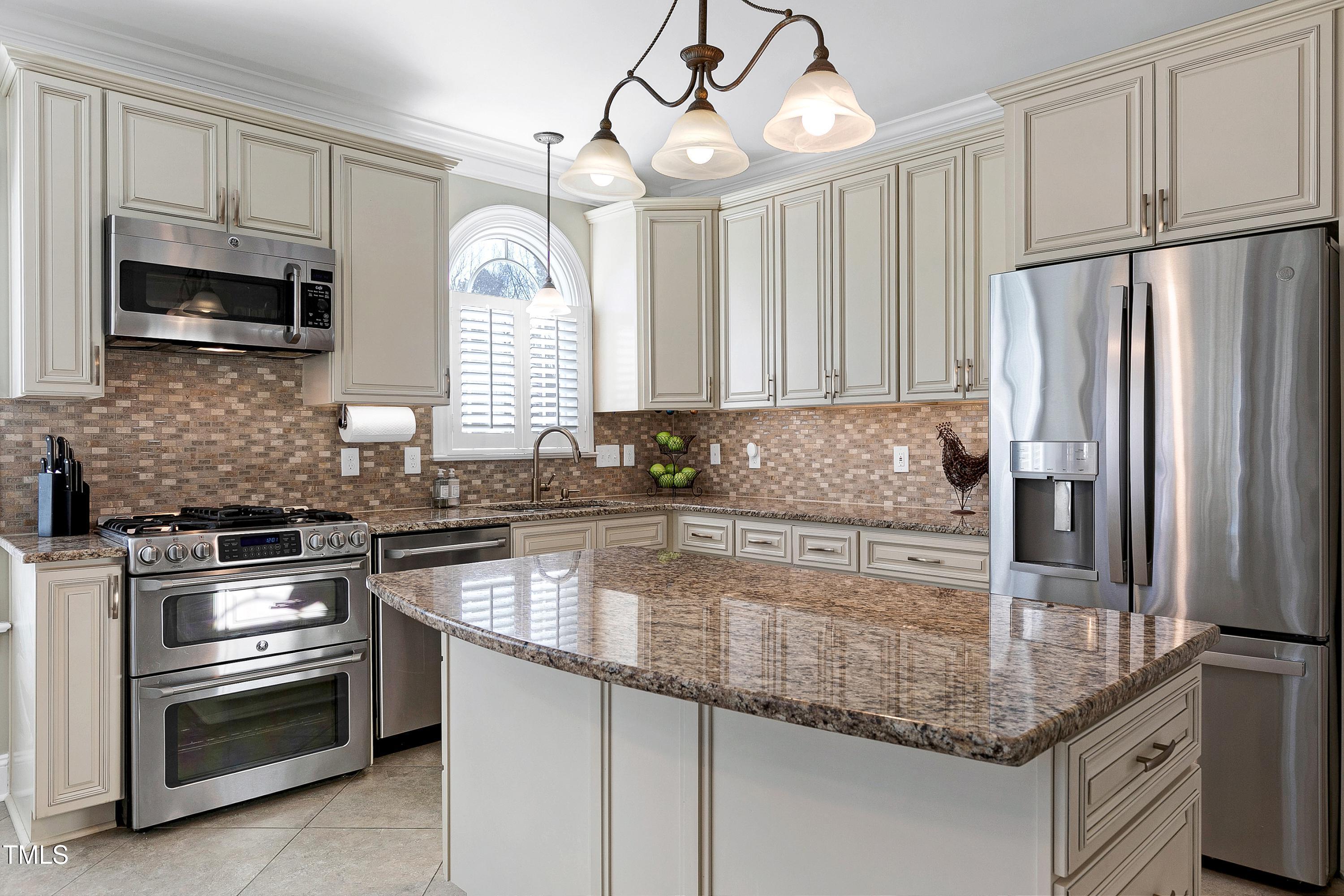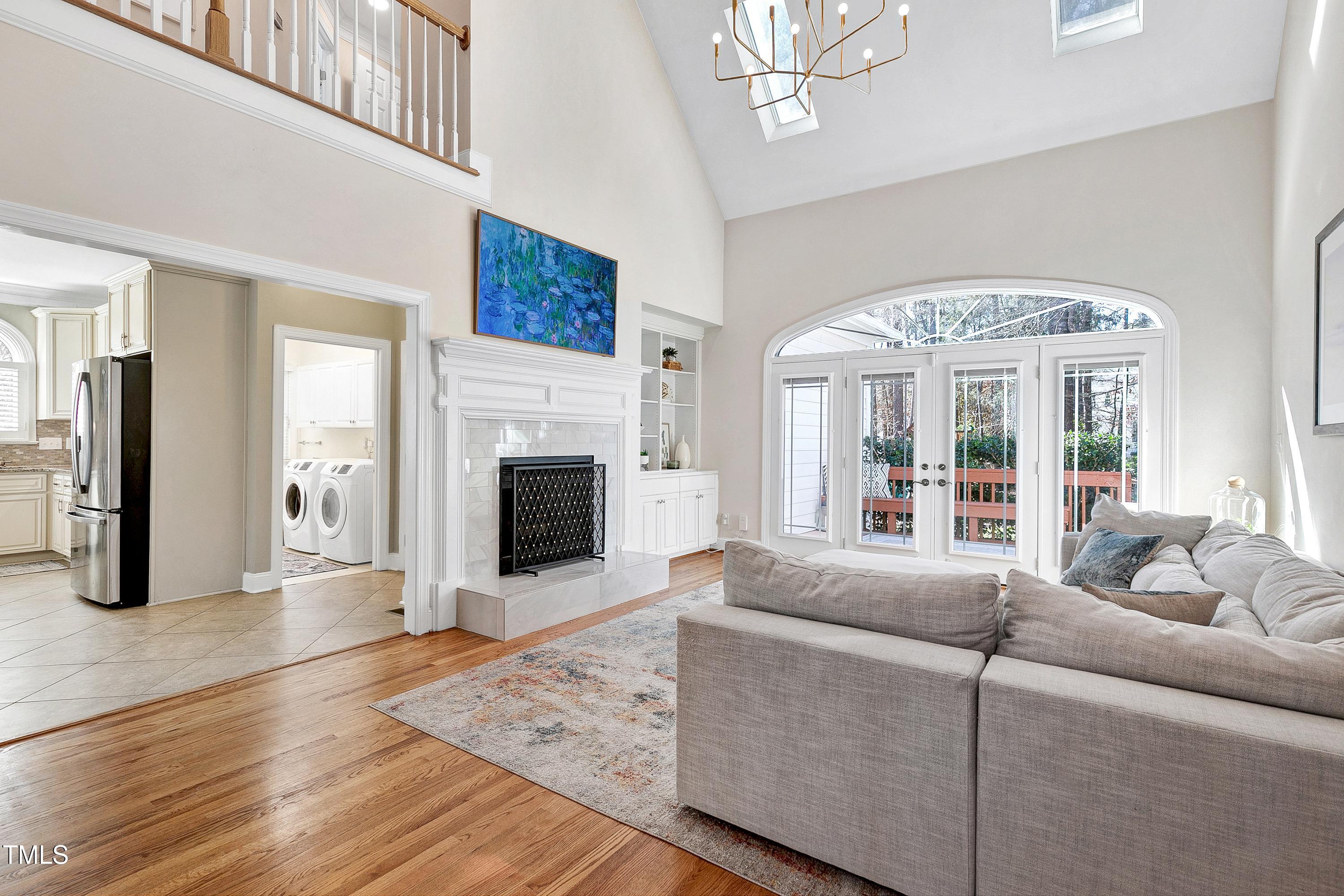 A generous sized foyer separates the formal living room and the versatility of an office/dining room. Entertaining is a pleasure in the bright and spacious family room featuring a stunning natural stone fireplace, built-ins, skylights and stylish lighting. Double garden doors enhance this space and allows for easy flow outside to the tranquility of the wooded backyard. Open-concept living with seamless transition to a large gourmet eat-in kitchen, featuring SS appliances, granite counter tops, center island, and walk-in pantry.