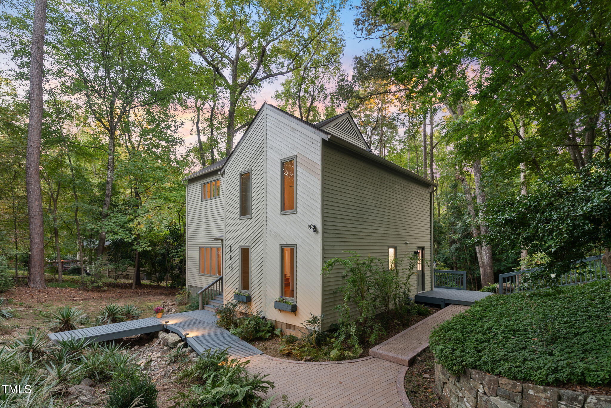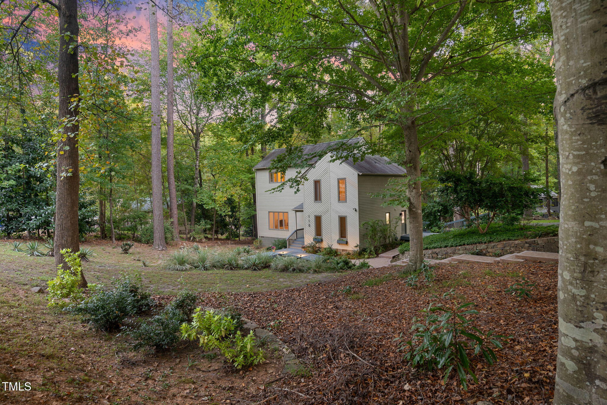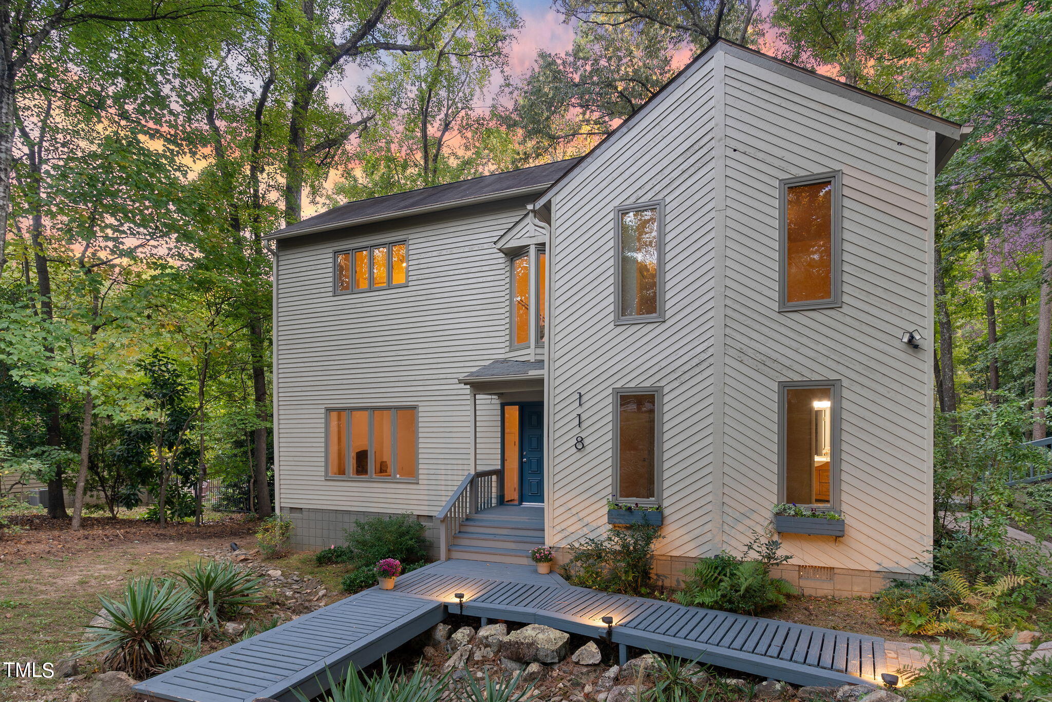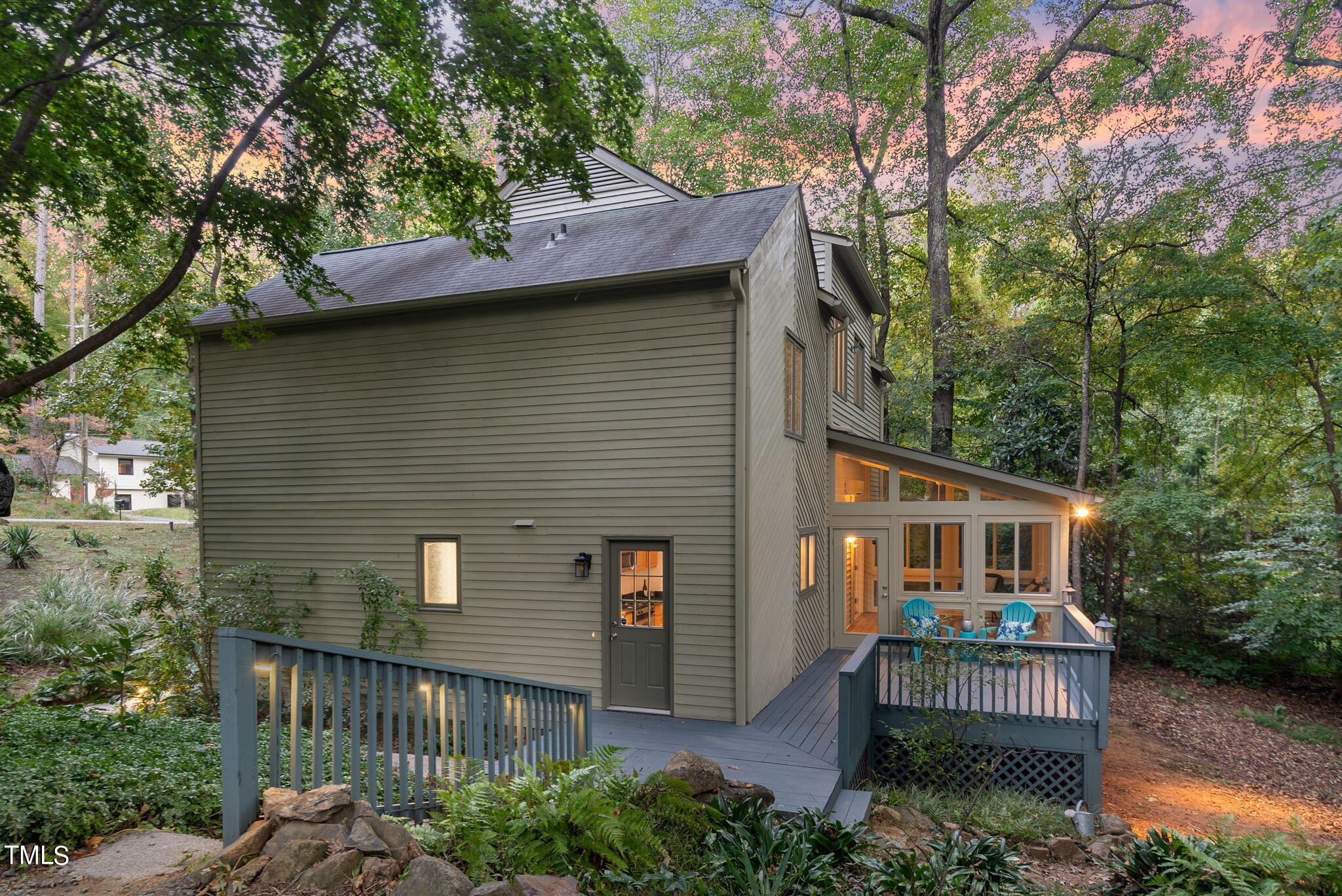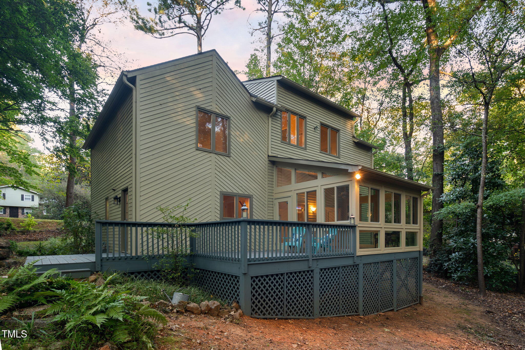 Welcome to this stunning home nestled in the sought-after North Forest Hills neighborhood, located within the top-rated Chapel Hill-Carrboro school district. This home's unique architecture makes for a truly special living experience. Step into the light-filled 4-season room with brand new flooring, overlooking a serene, private, tree-lined backyard that connects to a spacious deck--perfect for outdoor entertaining. The professionally landscaped yard adds to the home's beauty and tranquility.