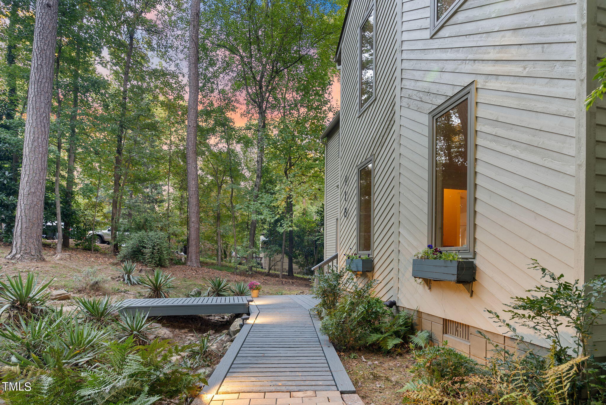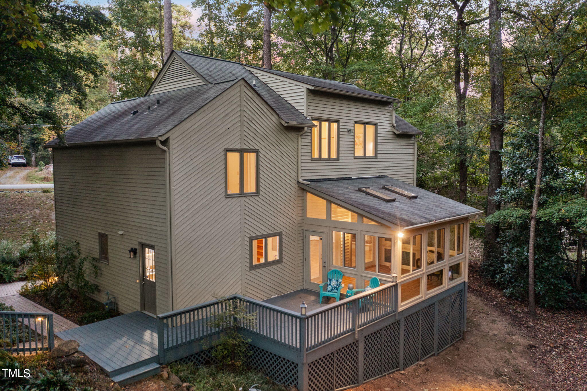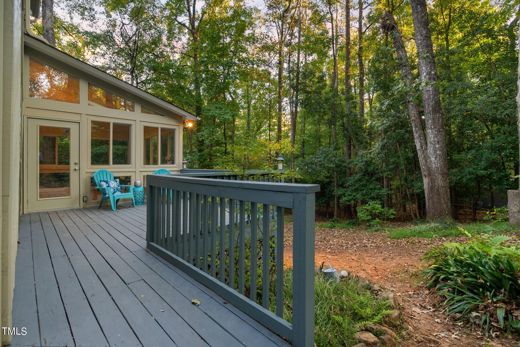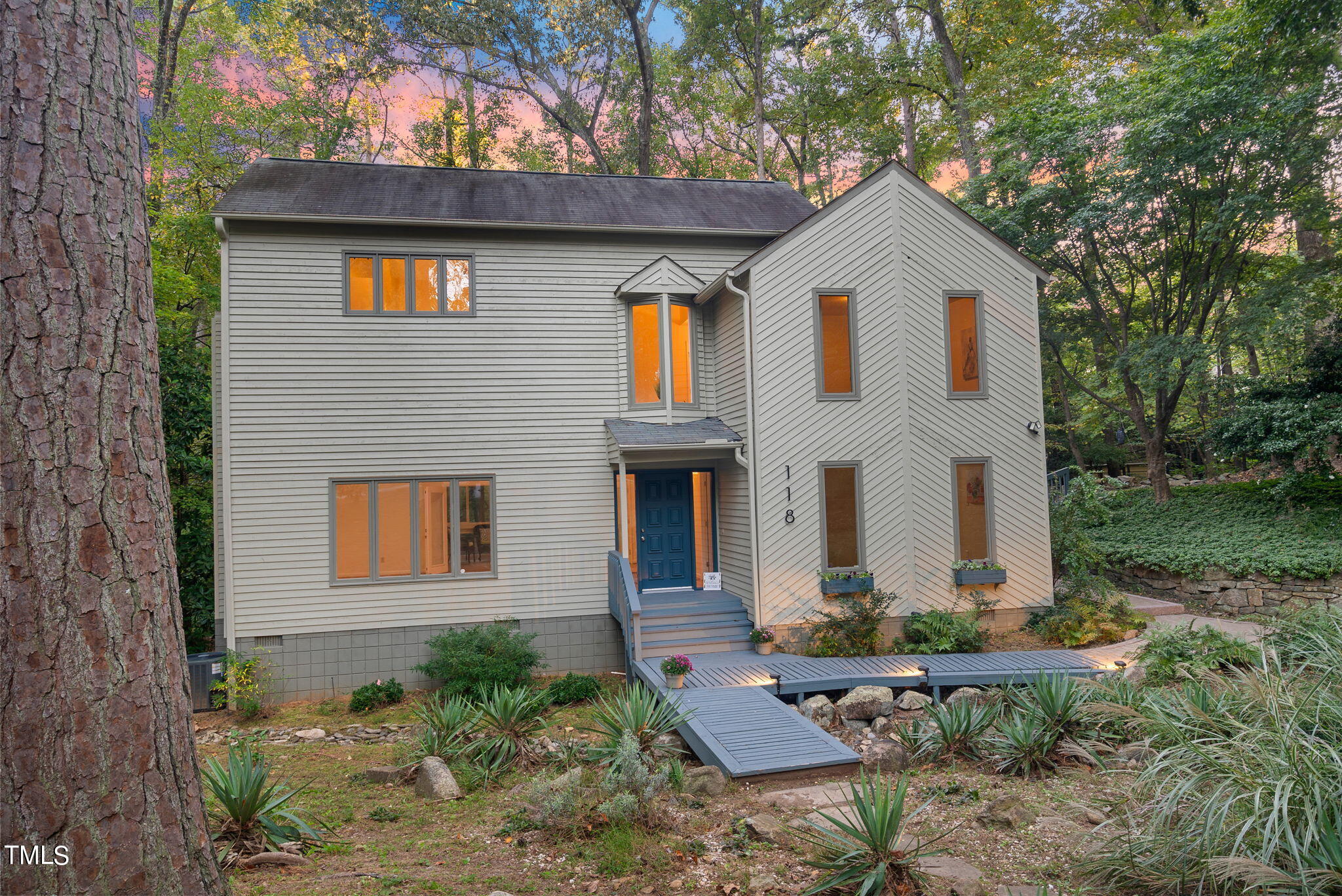 Welcome to this stunning home nestled in the sought-after North Forest Hills neighborhood, located within the top-rated Chapel Hill-Carrboro school district. This home's unique architecture makes for a truly special living experience. Step into the light-filled 4-season room with brand new flooring, overlooking a serene, private, tree-lined backyard that connects to a spacious deck--perfect for outdoor entertaining. The professionally landscaped yard adds to the home's beauty and tranquility.