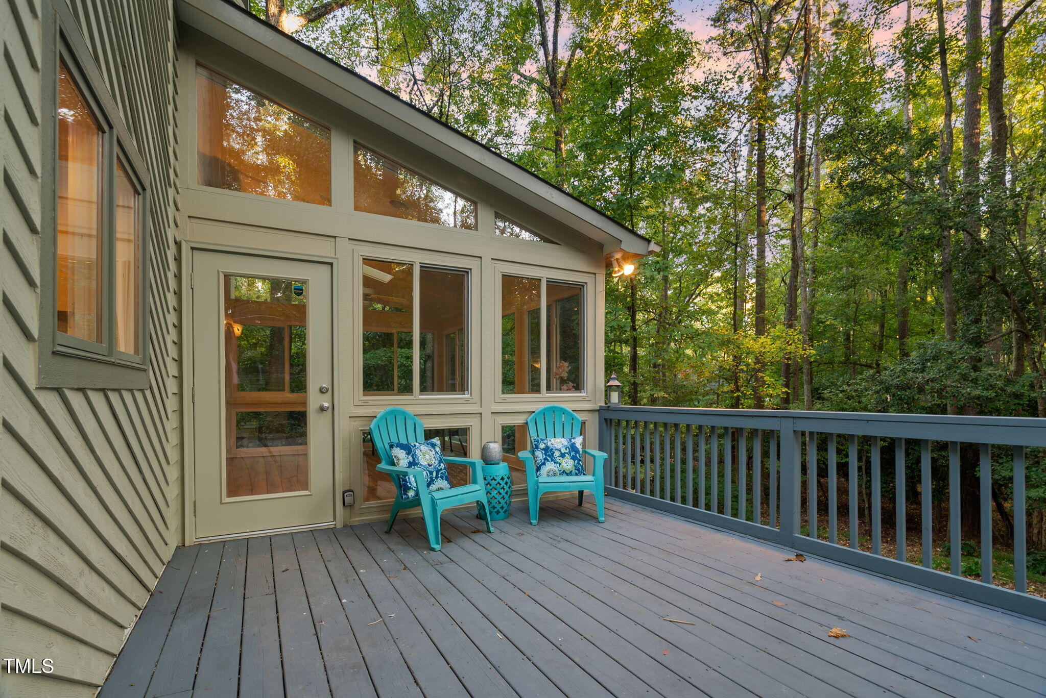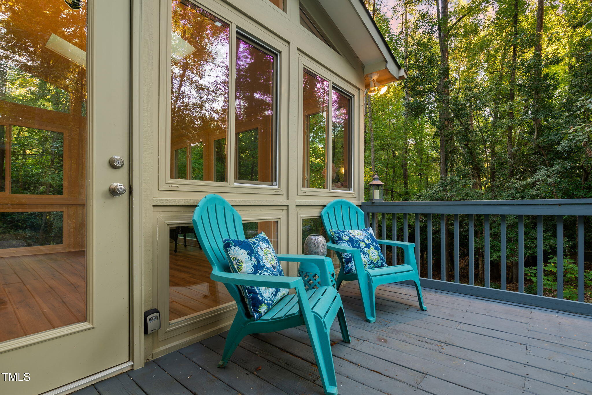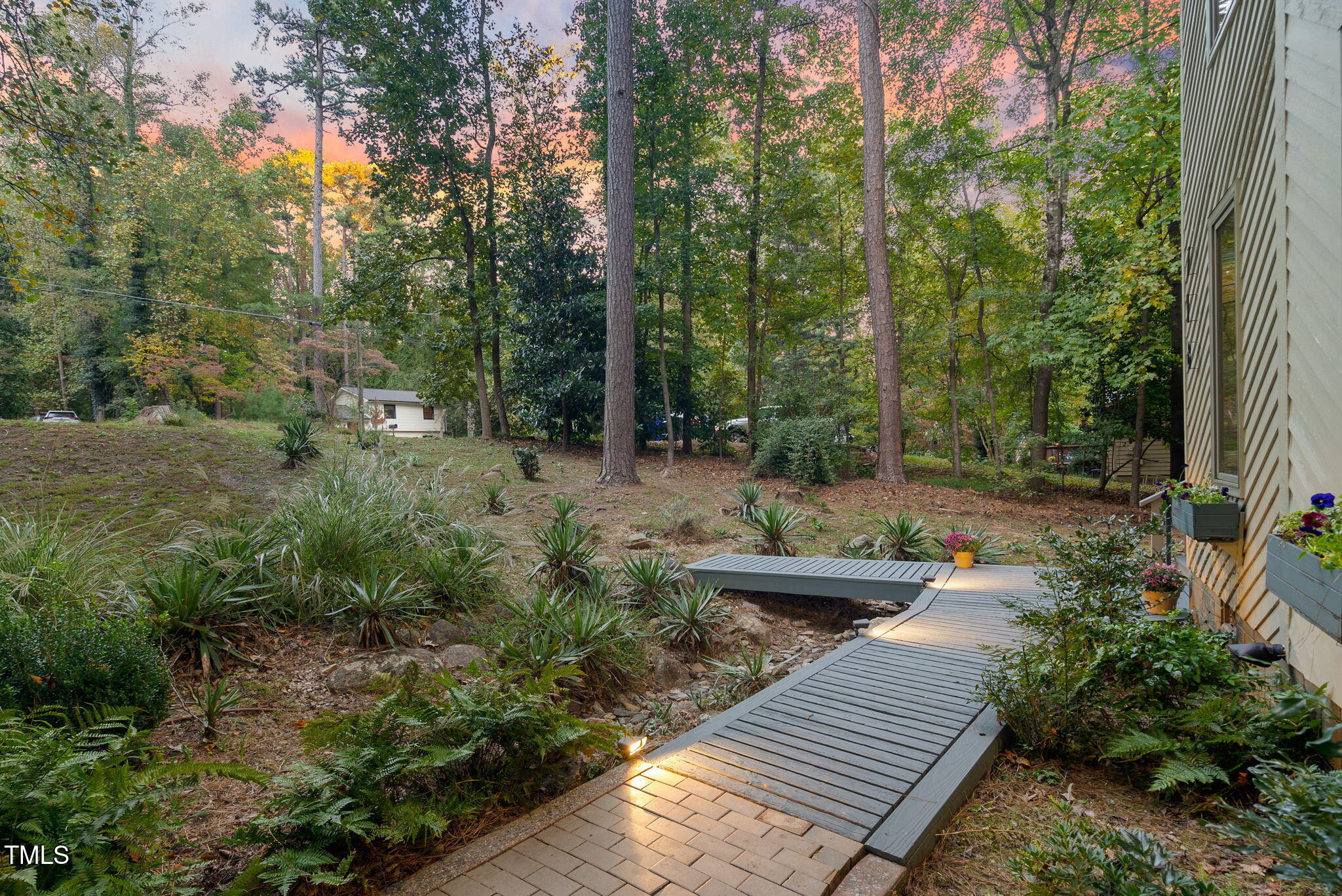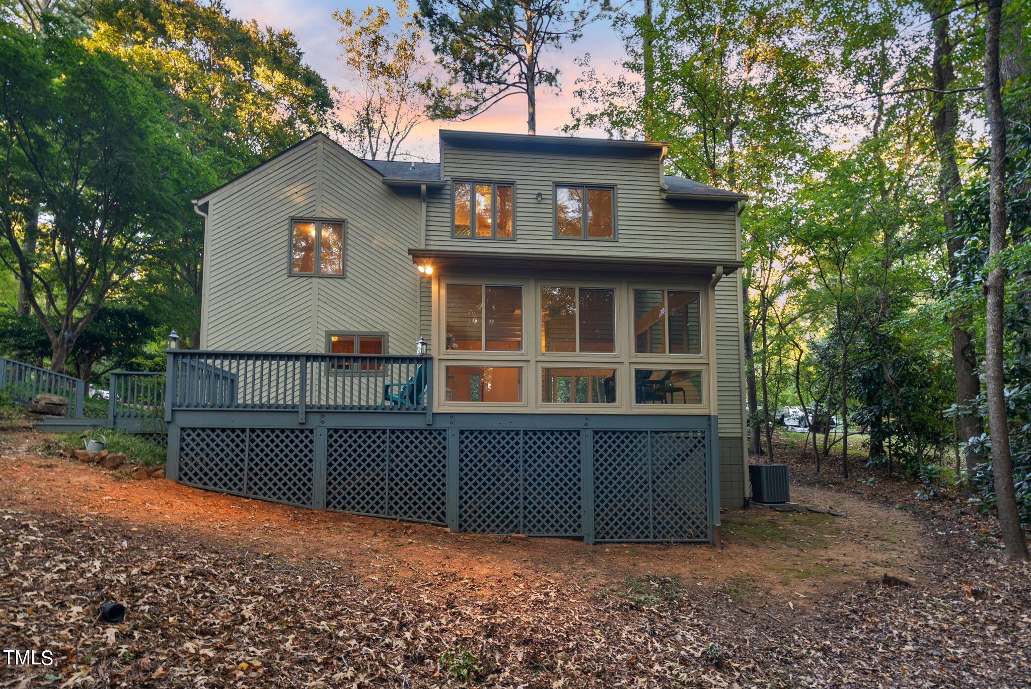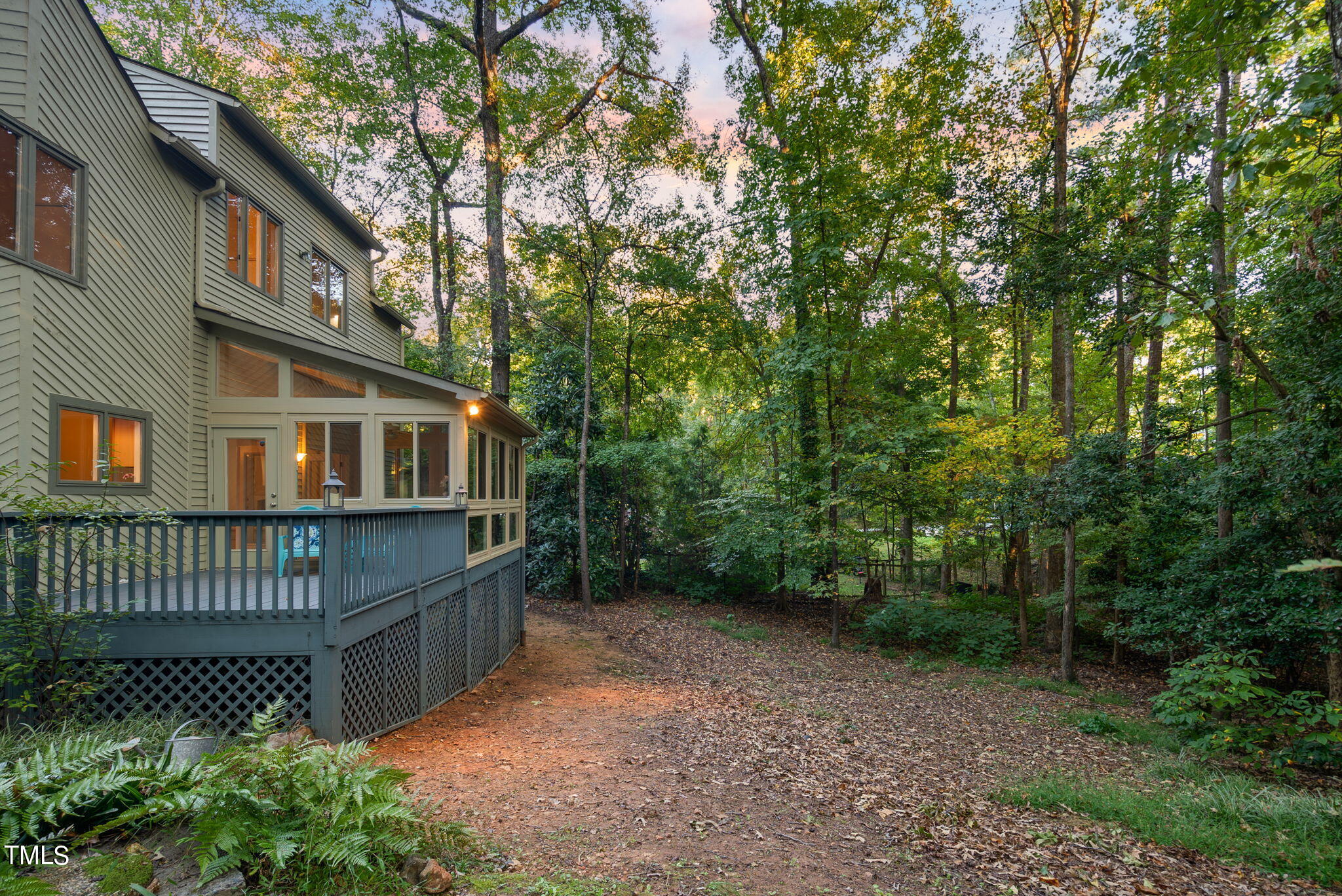 Welcome to this stunning home nestled in the sought-after North Forest Hills neighborhood, located within the top-rated Chapel Hill-Carrboro school district. This home's unique architecture makes for a truly special living experience. Step into the light-filled 4-season room with brand new flooring, overlooking a serene, private, tree-lined backyard that connects to a spacious deck--perfect for outdoor entertaining. The professionally landscaped yard adds to the home's beauty and tranquility.