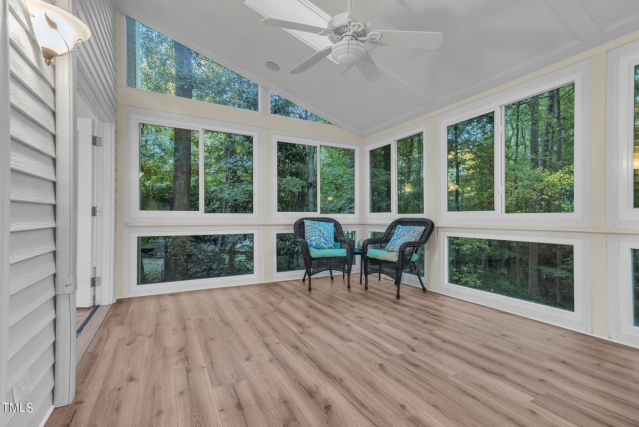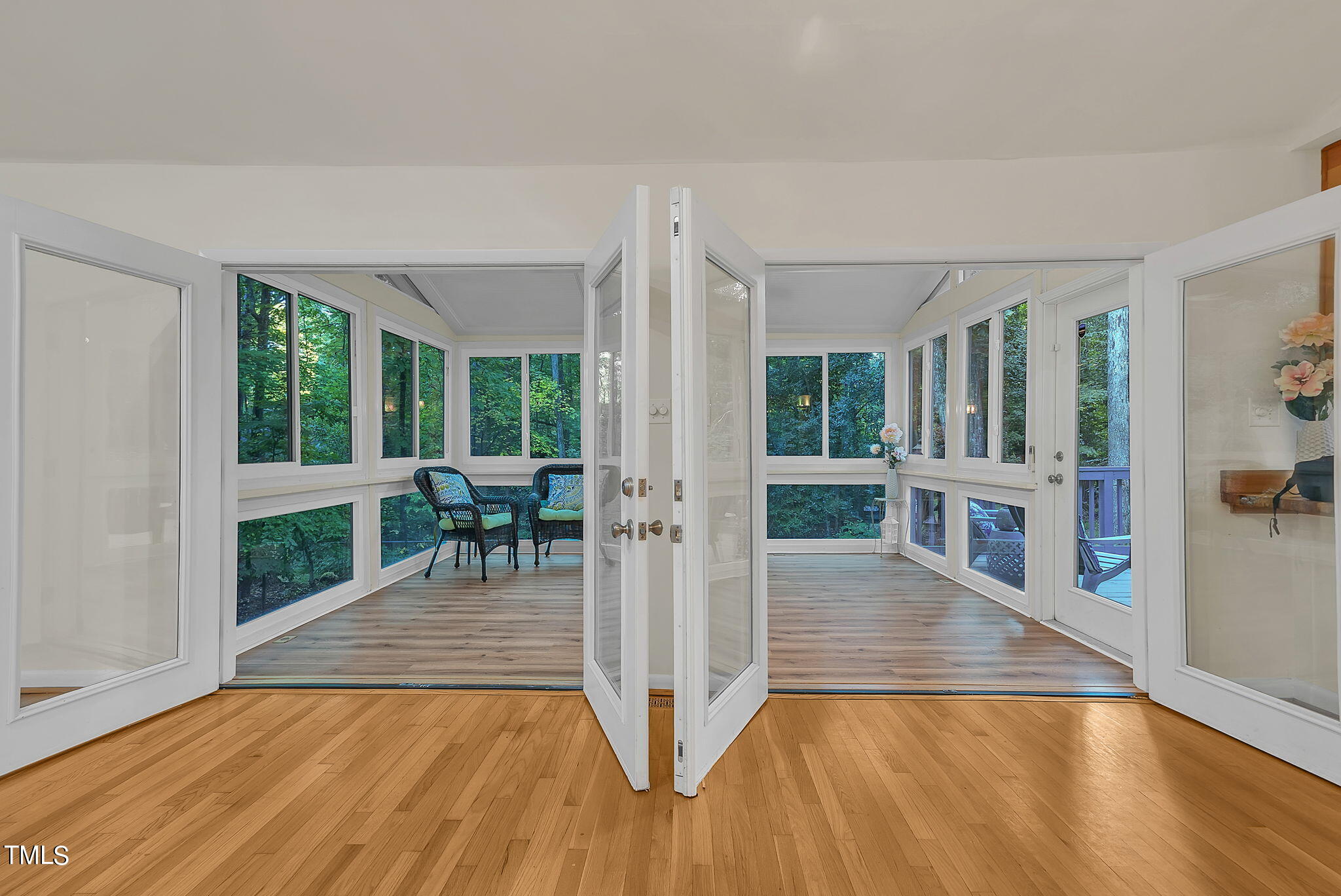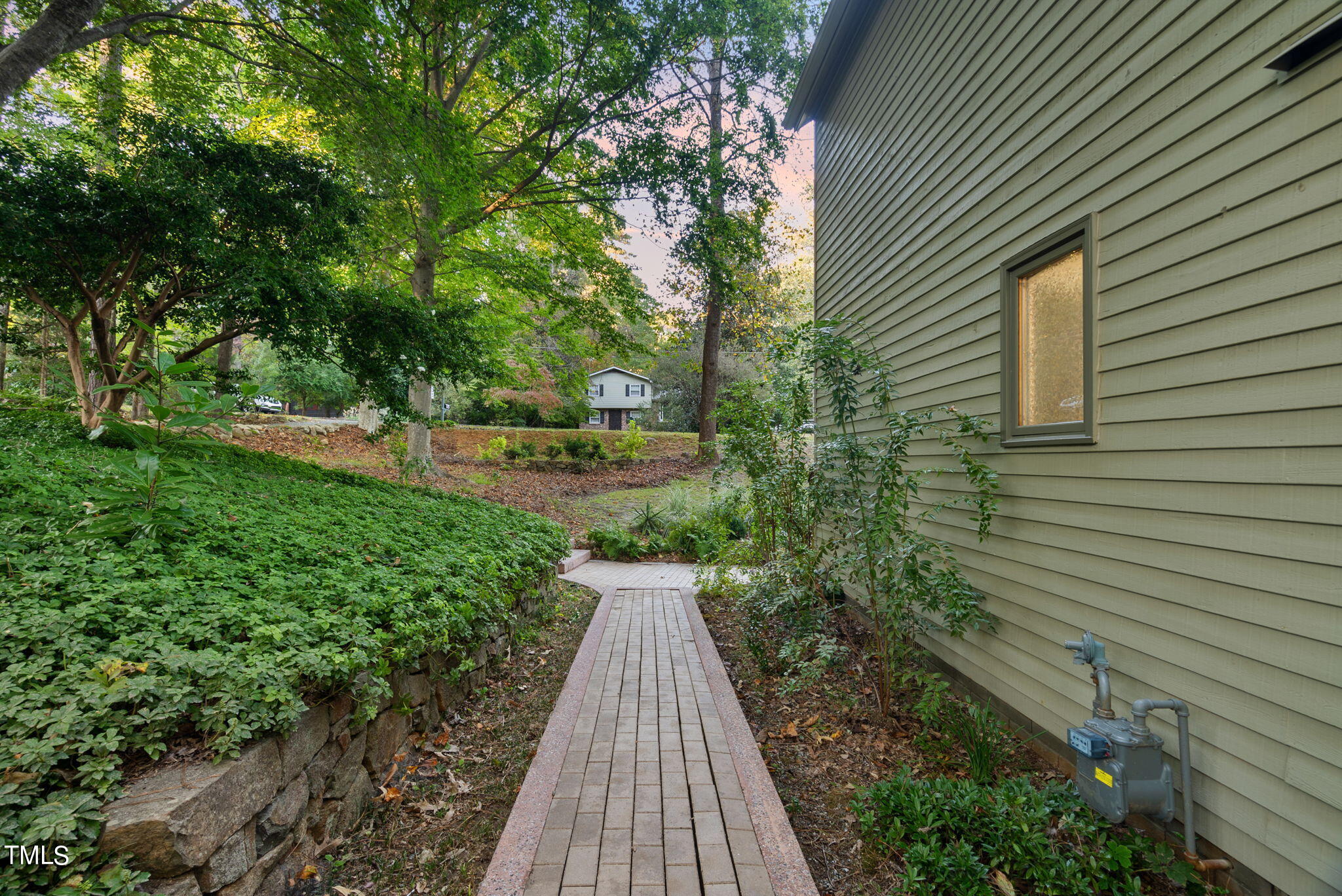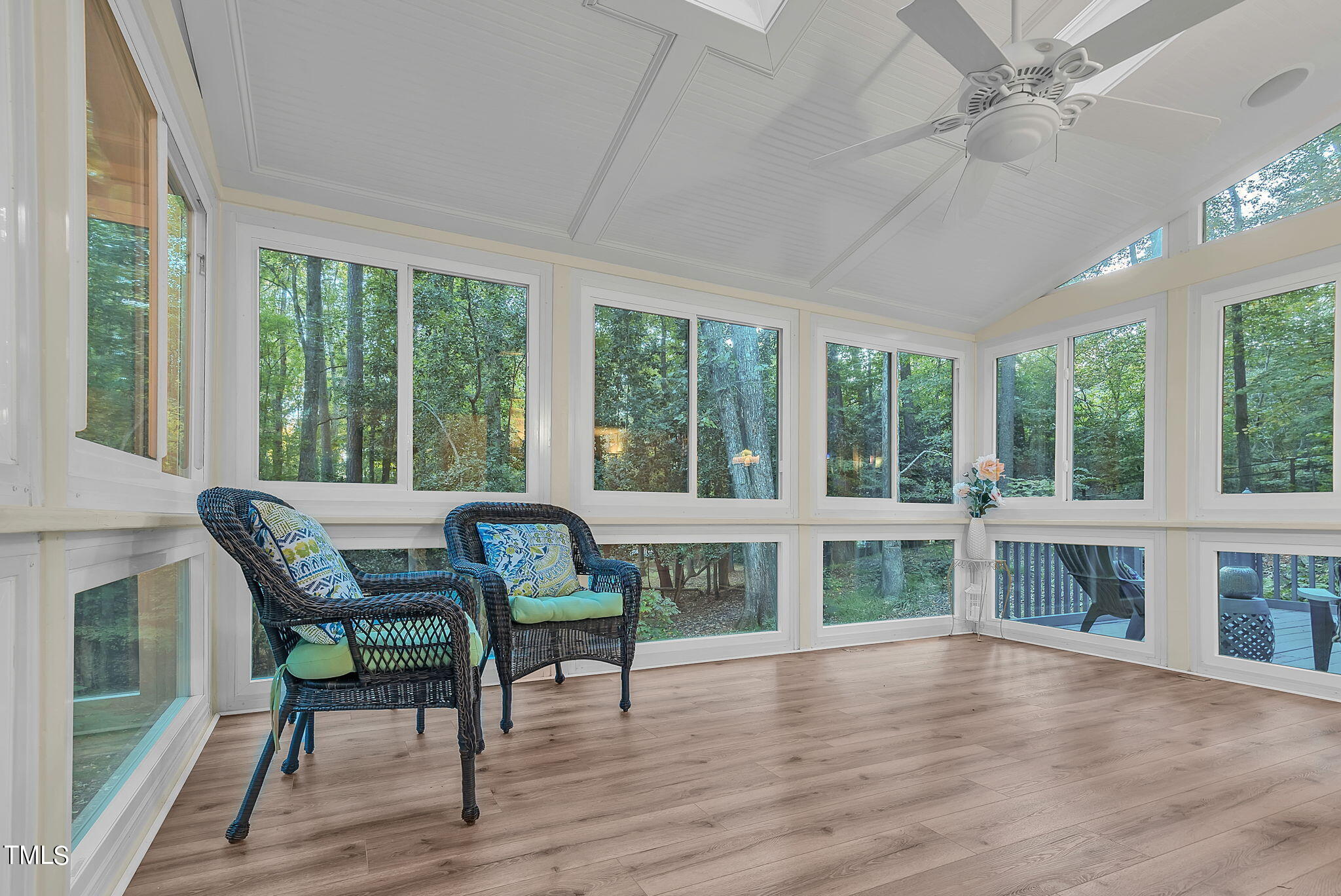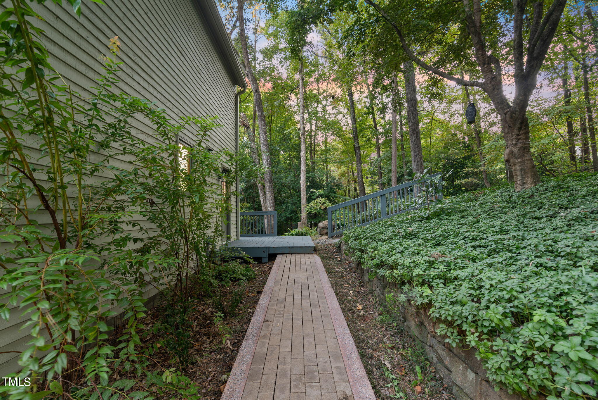Welcome to this stunning home nestled in the sought-after North Forest Hills neighborhood, located within the top-rated Chapel Hill-Carrboro school district. This home's unique architecture makes for a truly special living experience. Step into the light-filled 4-season room with brand new flooring, overlooking a serene, private, tree-lined backyard that connects to a spacious deck--perfect for outdoor entertaining. The professionally landscaped yard adds to the home's beauty and tranquility.