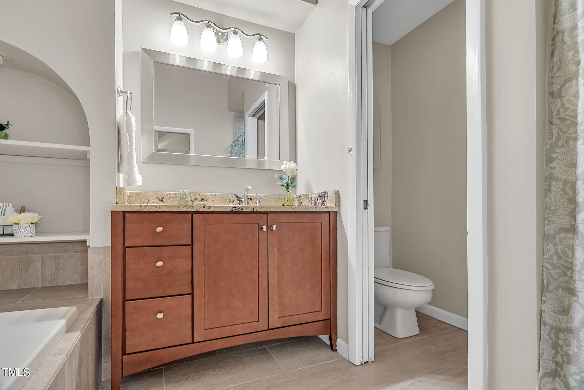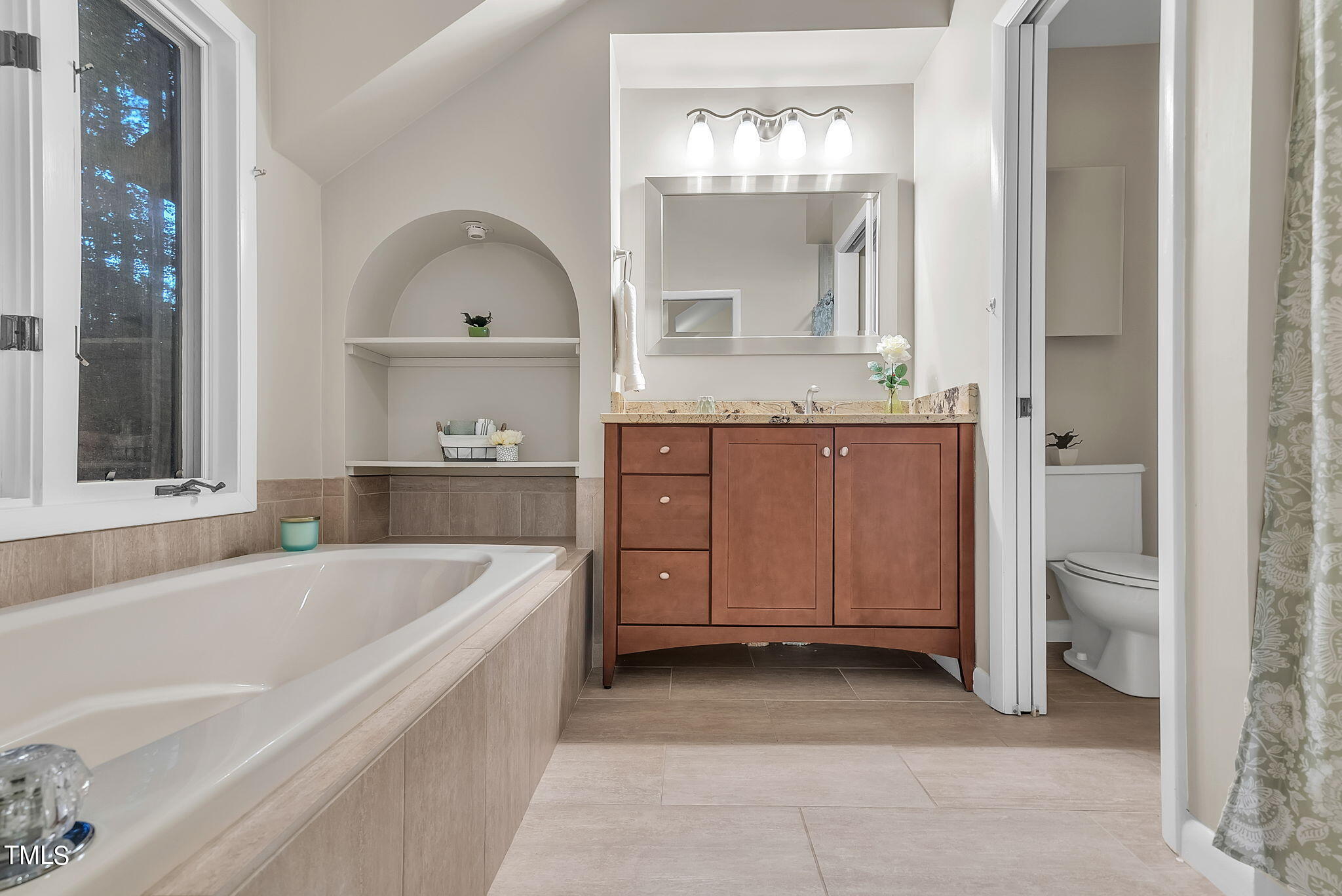 Inside, vaulted ceilings and fresh paint create a bright and welcoming atmosphere. The kitchen features granite countertops, stainless steel appliances, and a second prep sink, ideal for culinary enthusiasts. The dreamy primary suite on the third level offers ultimate privacy, complete with a large walk-in closet, a garden tub, and a walk-in shower. A potential second primary suite on the main level provides flexible living options.