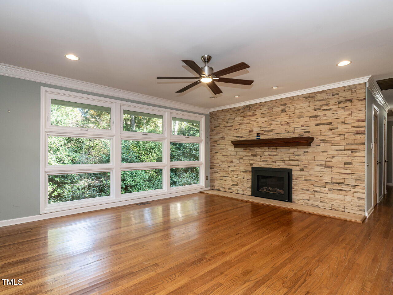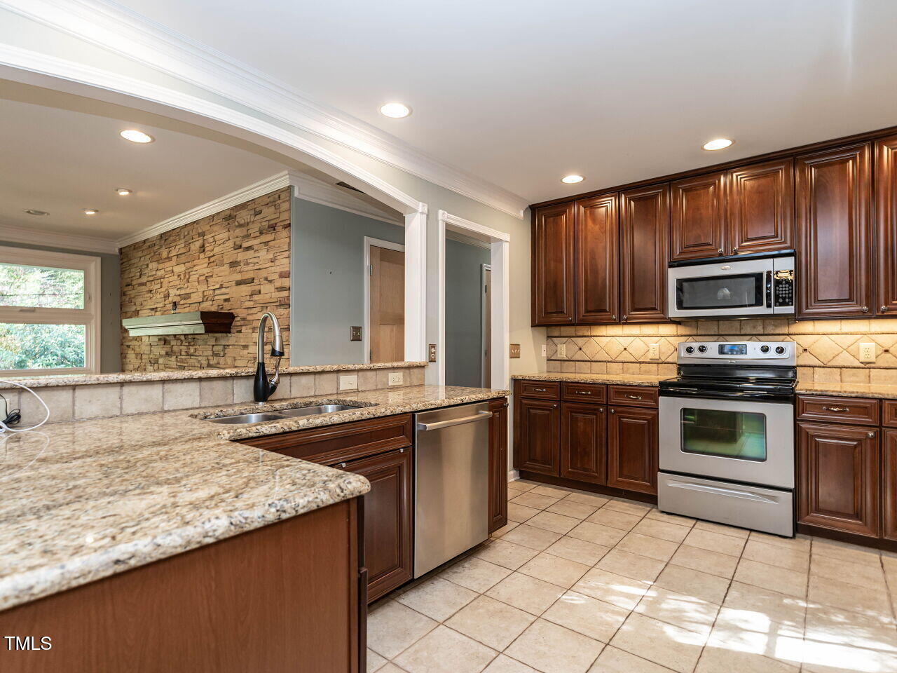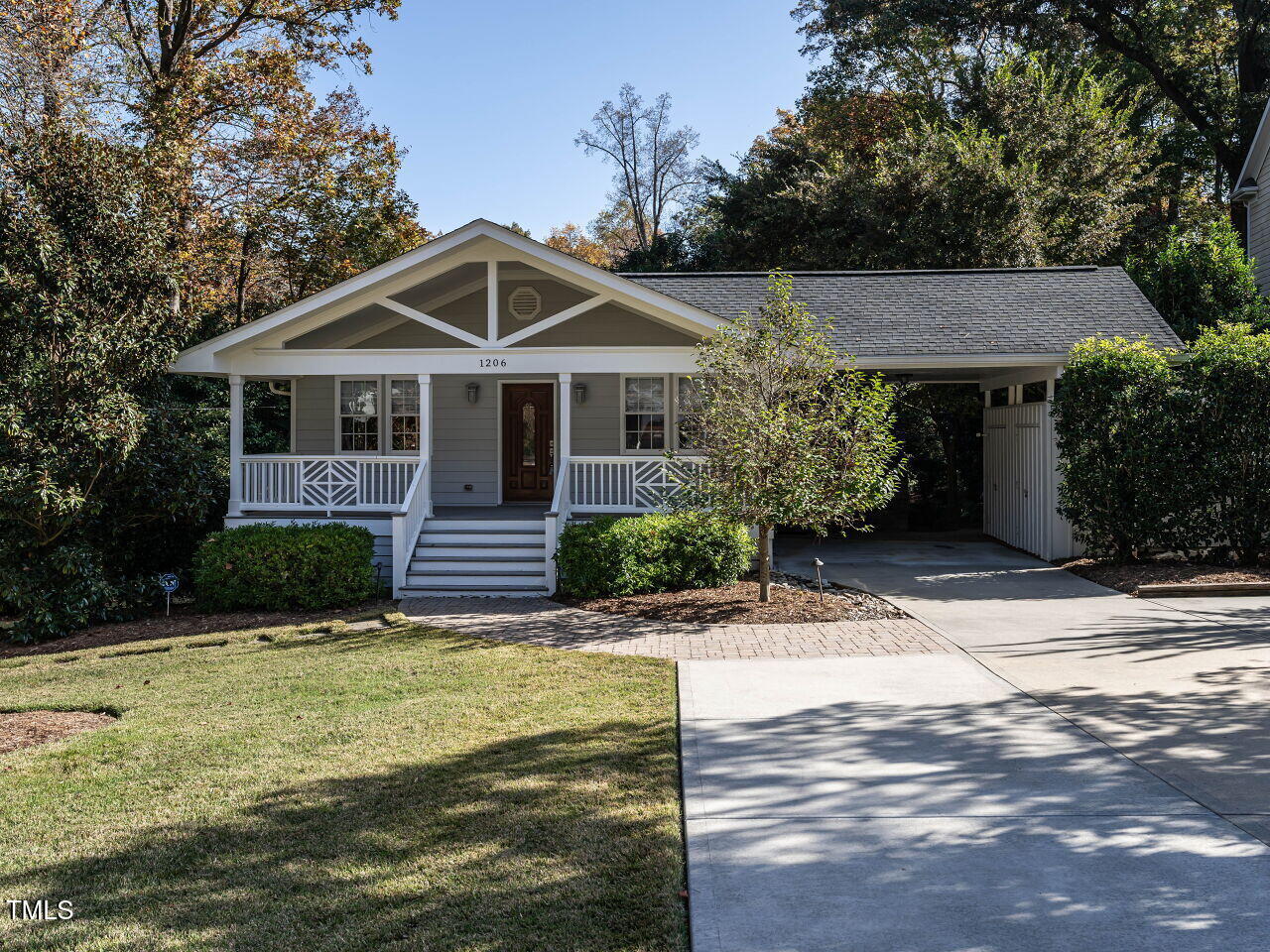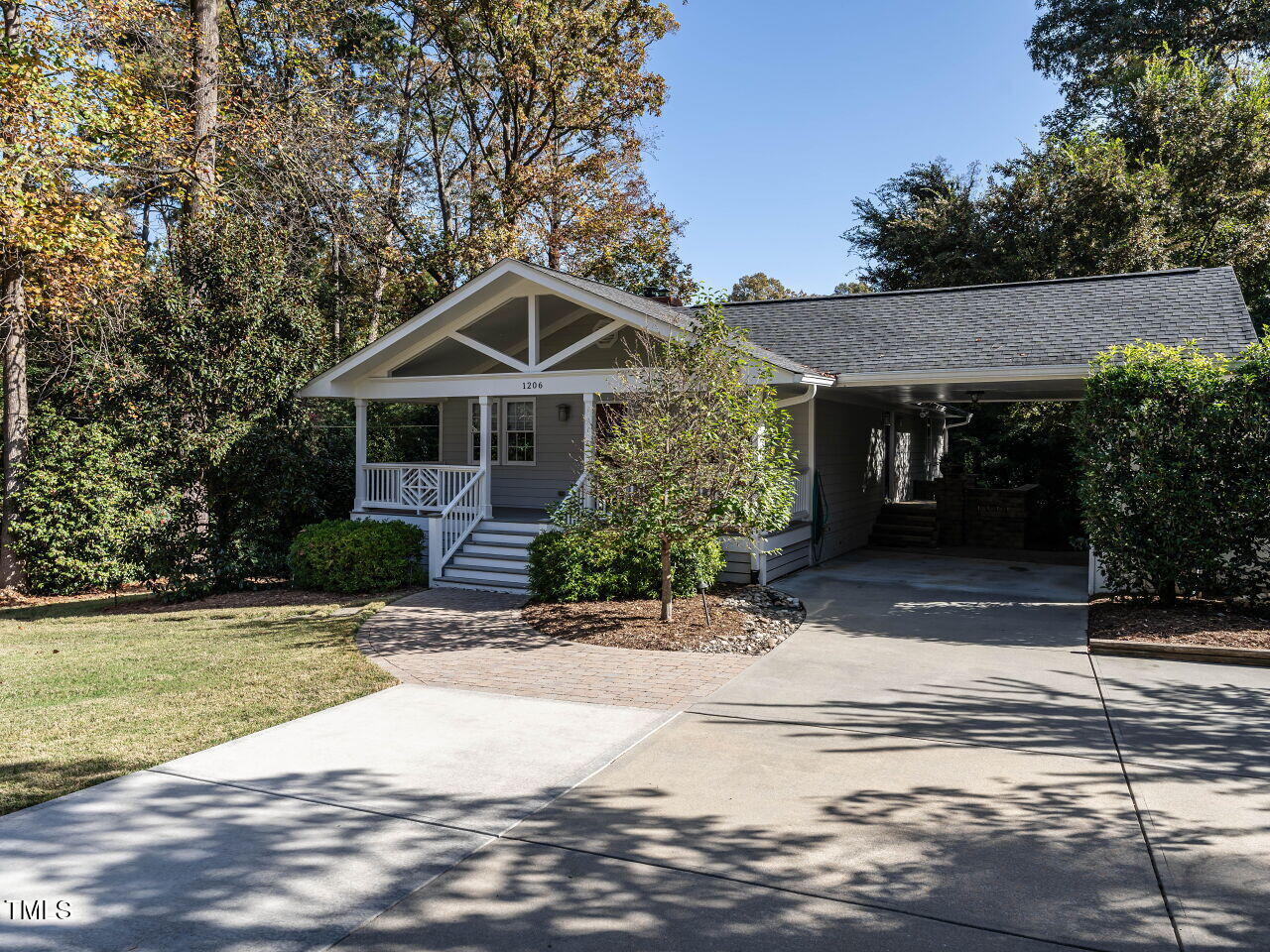 Charming ranch with covered front porch and finished daylight basement framed by a well-groomed, .42-acre lot - the open plan features spacious light-filled rooms with access to numerous outdoor spaces - the family room boasts a ''wall of windows'' plus a stacked stone wall with gas fireplace - the centrally located, updated kitchen features stainless steel appliances, tile floor and side access to the private terrace - the primary bedroom includes two closets with Jacuzzi soaking tub/shower and oversized vanity - the versatile basement was previously MBR suite and features French doors to massive, wrap-around patio with water feature - excellent schools - attached carport with great storage - concrete drive with ample parking - walk/bike to nearby Ridgewood S/C and Crabtree Creek Greenway - great house!