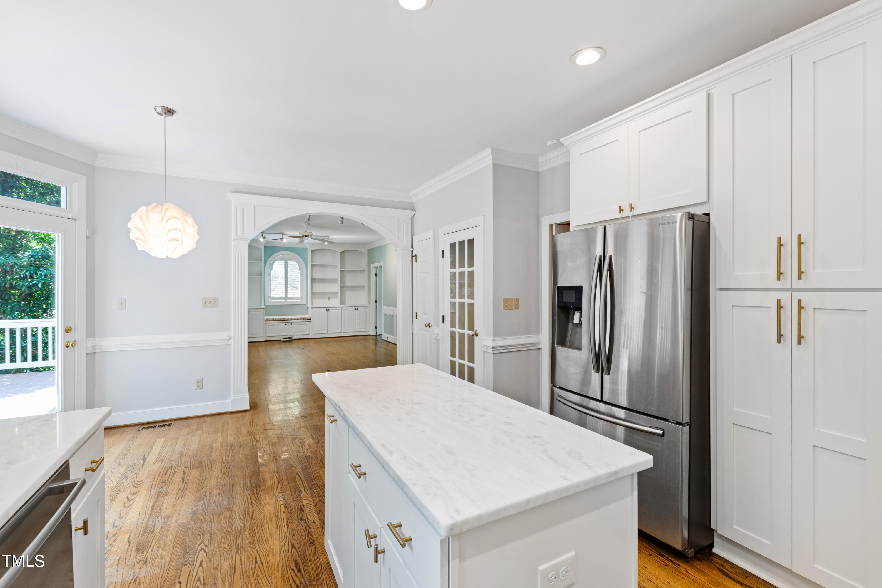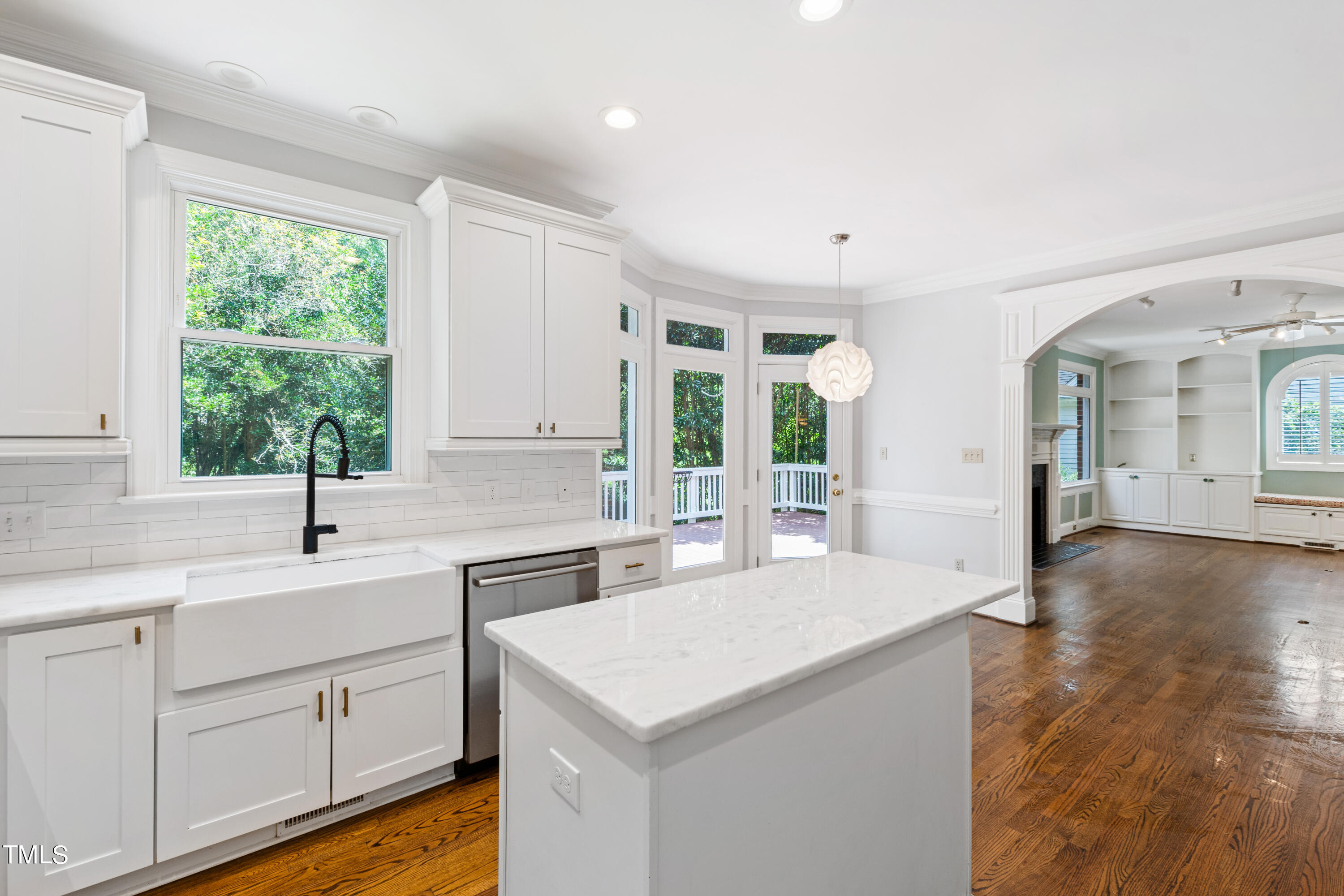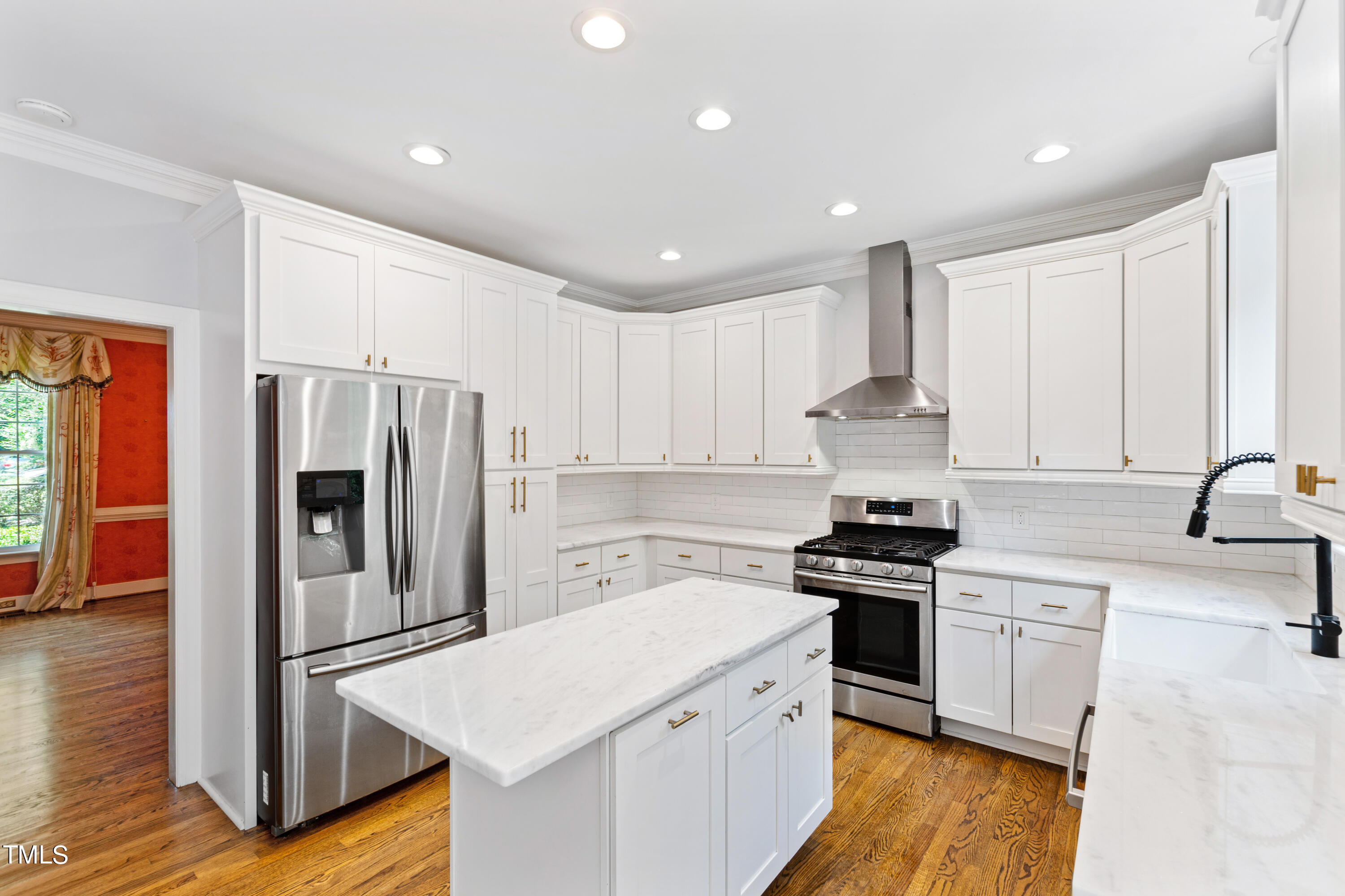 Come visit this warm and inviting traditional brick two-story home located on a quaint cul-de-sac in desirable West Raleigh. Inside you will discover amenities such as 9-foot ceilings, arched doorways, window transoms, oak hardwood flooring, detailed moldings, and a 2-car garage. Recent updates include a renovated kitchen with subway tiled backsplash, marble countertops and stainless-steel appliances. The formal areas open to a gracious foyer with a flighted stairway to the second floor. The family room is spacious and features a wood-burning fireplace with a decorative mantle plus bookshelves and cabinets. The second level features three guest rooms and a primary suite with a renovated primary bath. The lower- level bonus room with a full bath is ideal for games, toys or a space for a home work-out center.