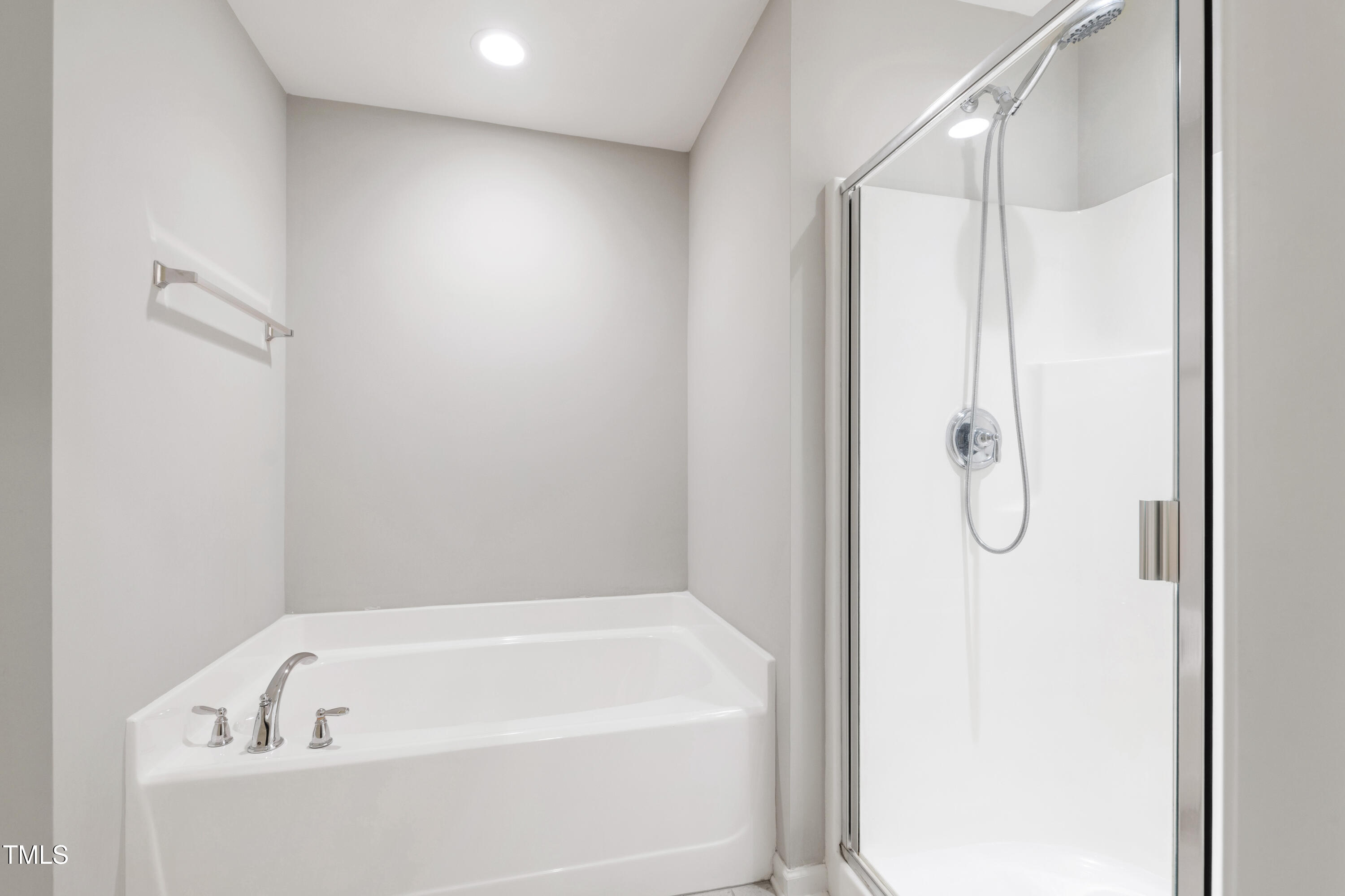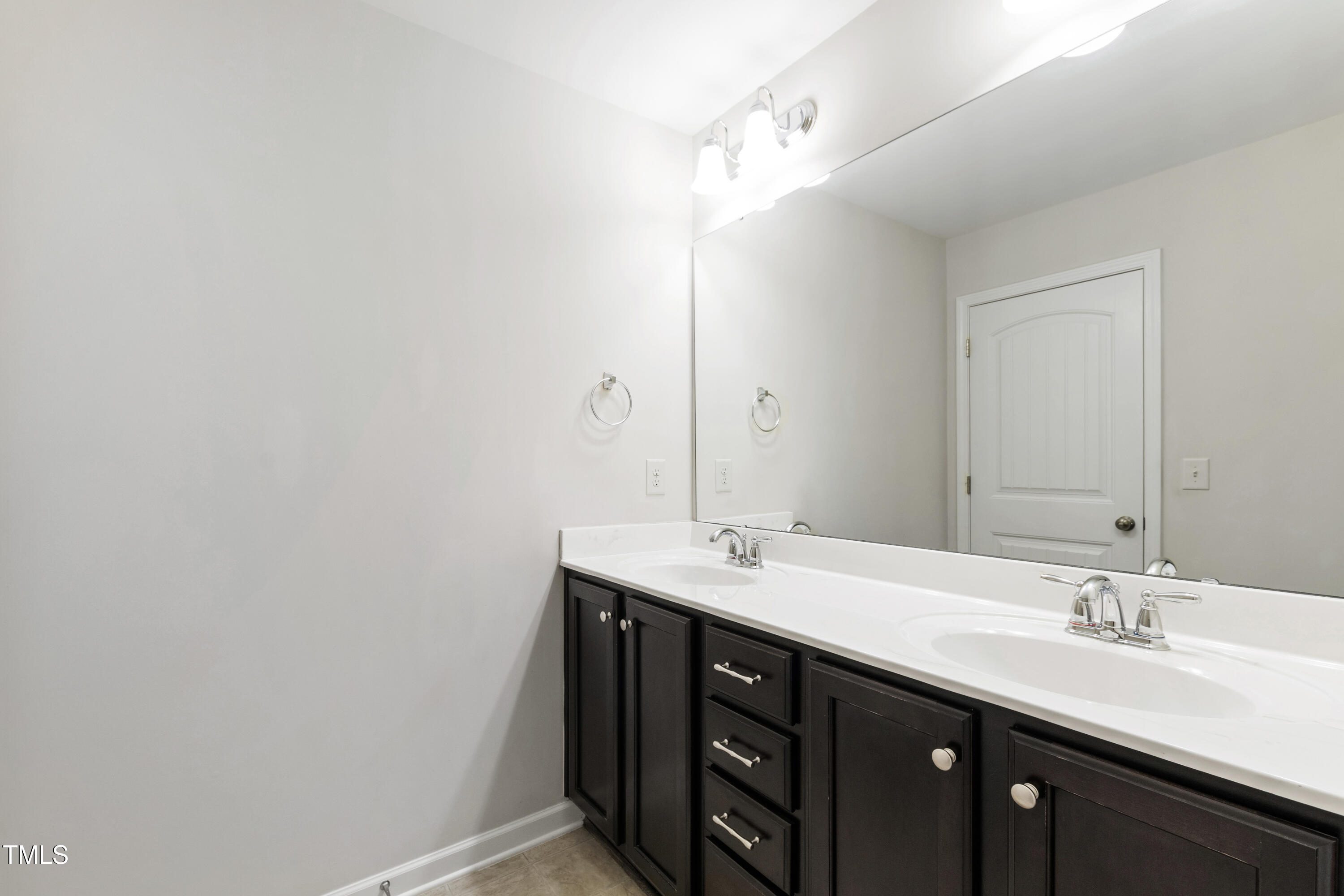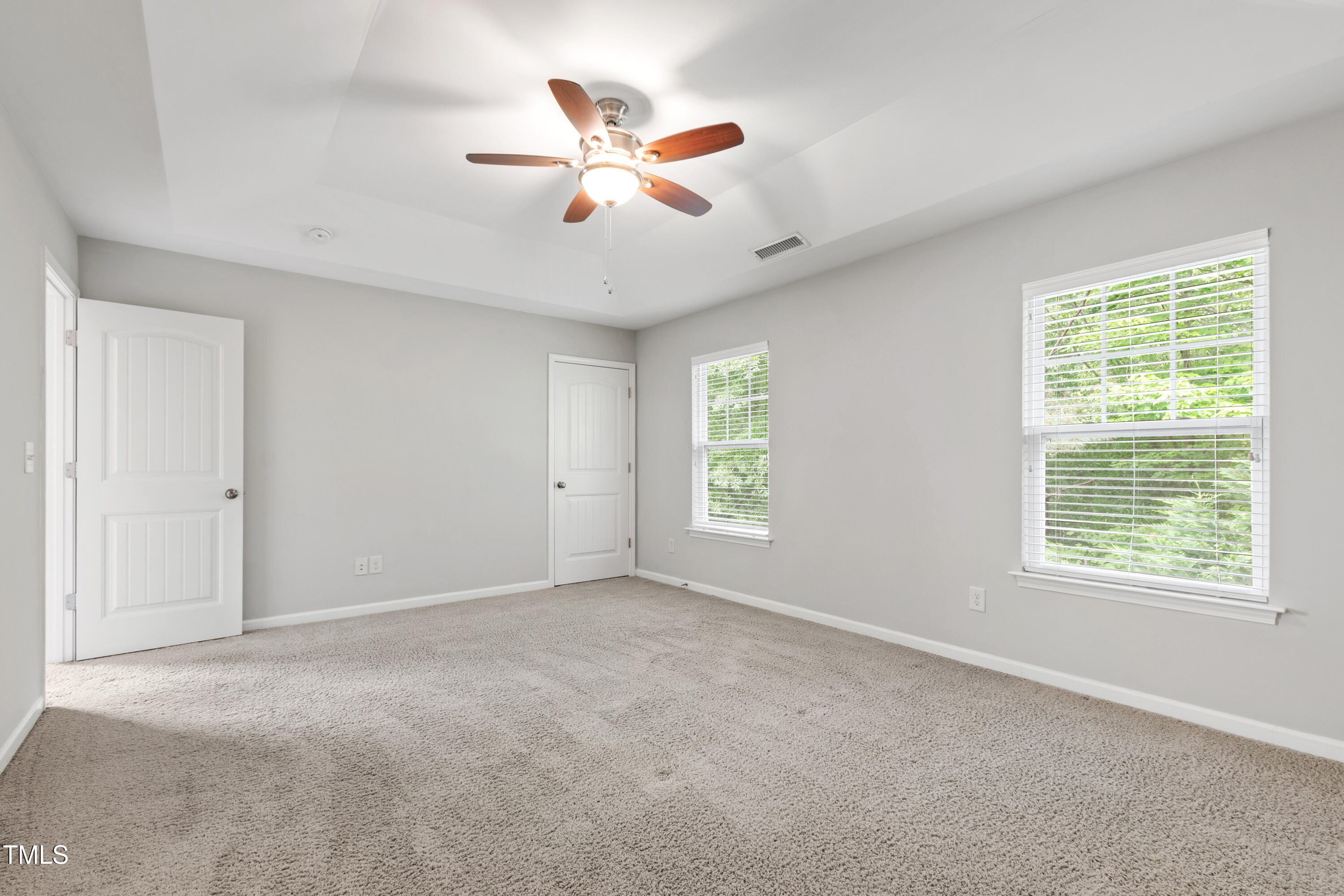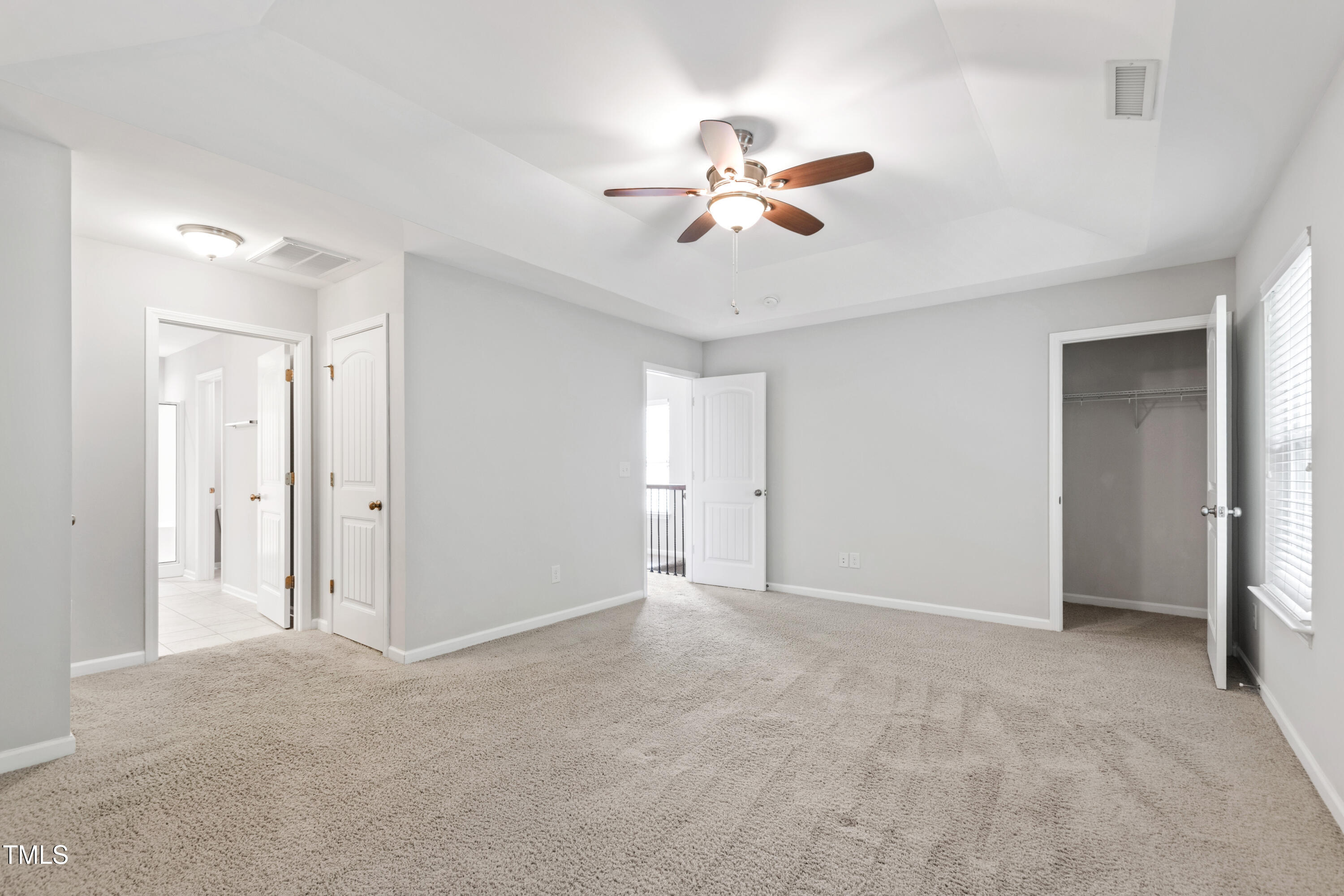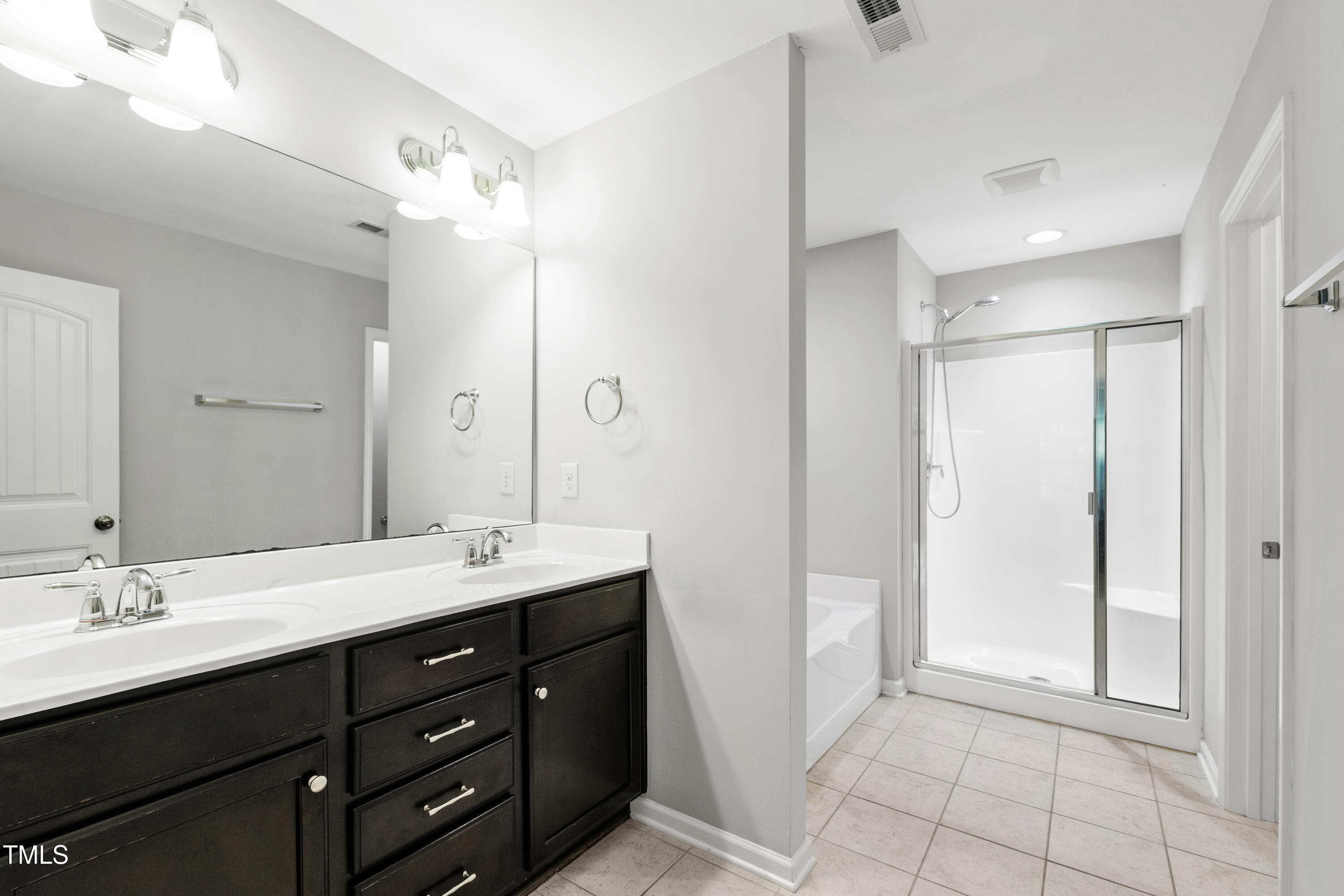 Upstairs, the luxurious primary suite offers a tray ceiling, a generous walk-in closet, and a spa-inspired bathroom complete with dual vanities, a soaking tub, a separate shower, and plenty of storage. Two additional bedrooms and a second full bathroom with dual vanities provide ample space for family or guests. The upstairs laundry area adds convenience, while the attached garage and additional driveway space offer practical functionality.