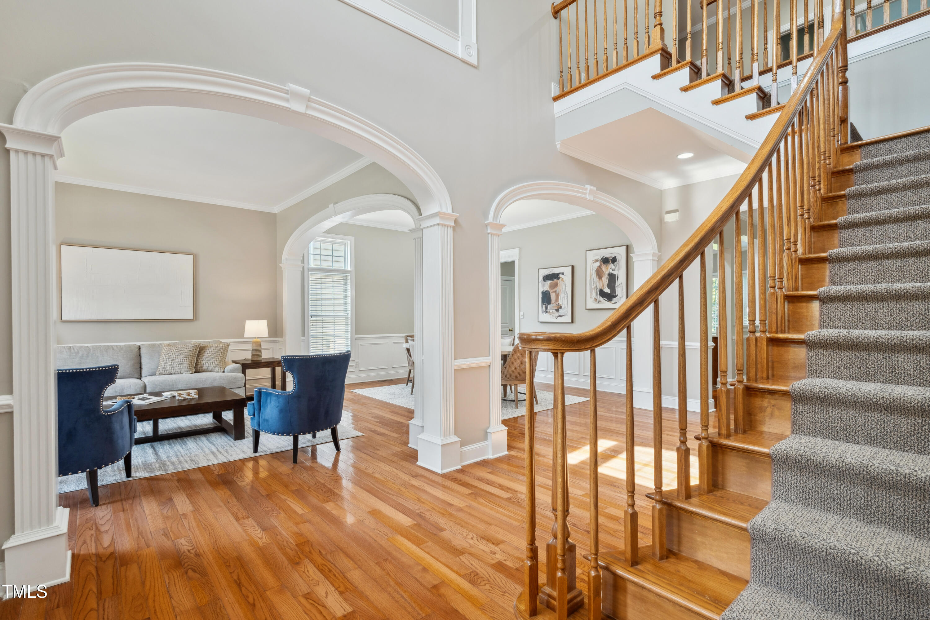 Step into a breathtaking double-height foyer that floods the home with natural light, highlighting the expansive and meticulously designed floorplan. Every detail has been curated to impress--from soaring 10-foot ceilings on the main level and solid hardwood flooring, to refined trim work, graceful curved archways, and a spacious three-car garage.