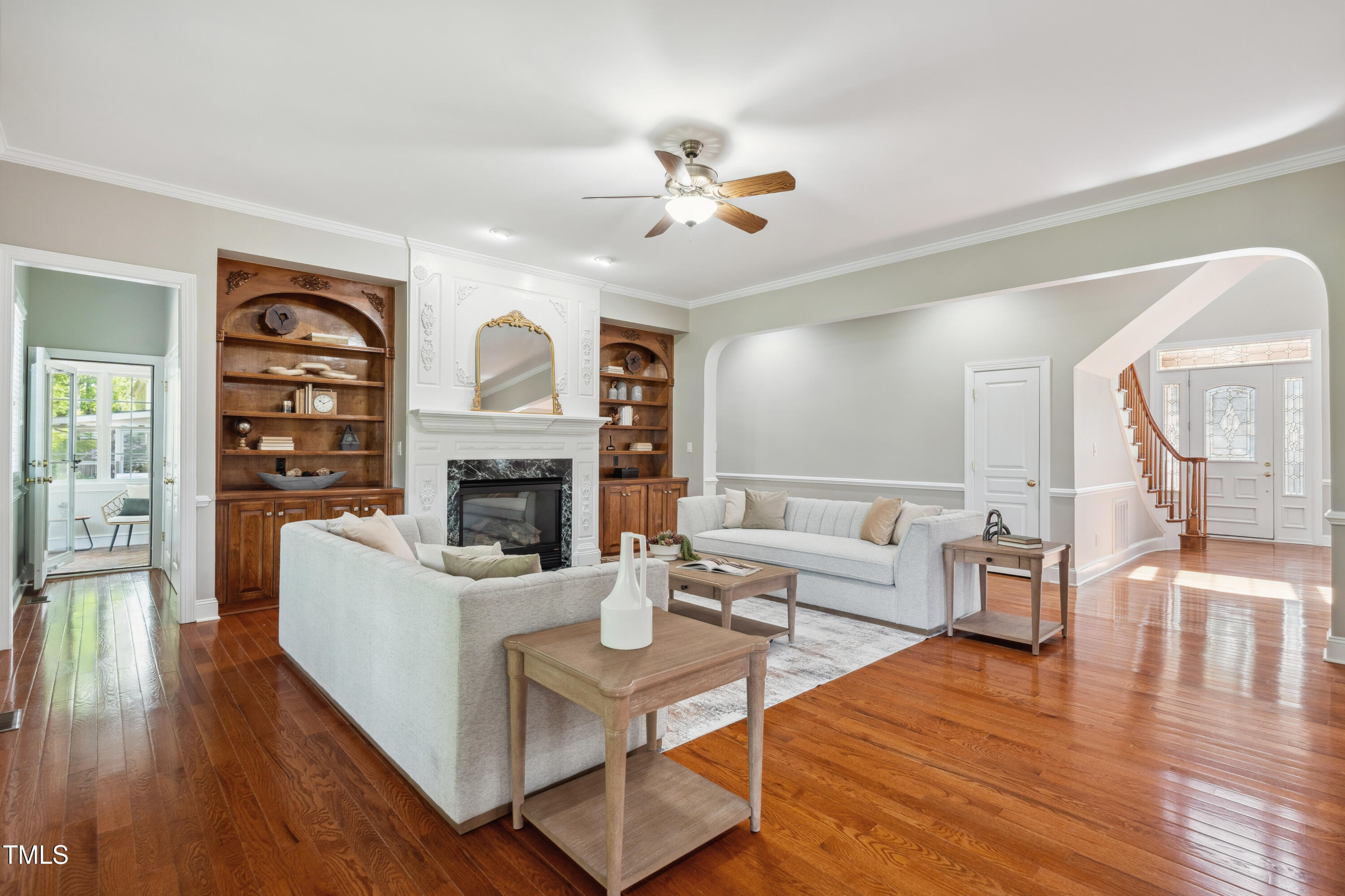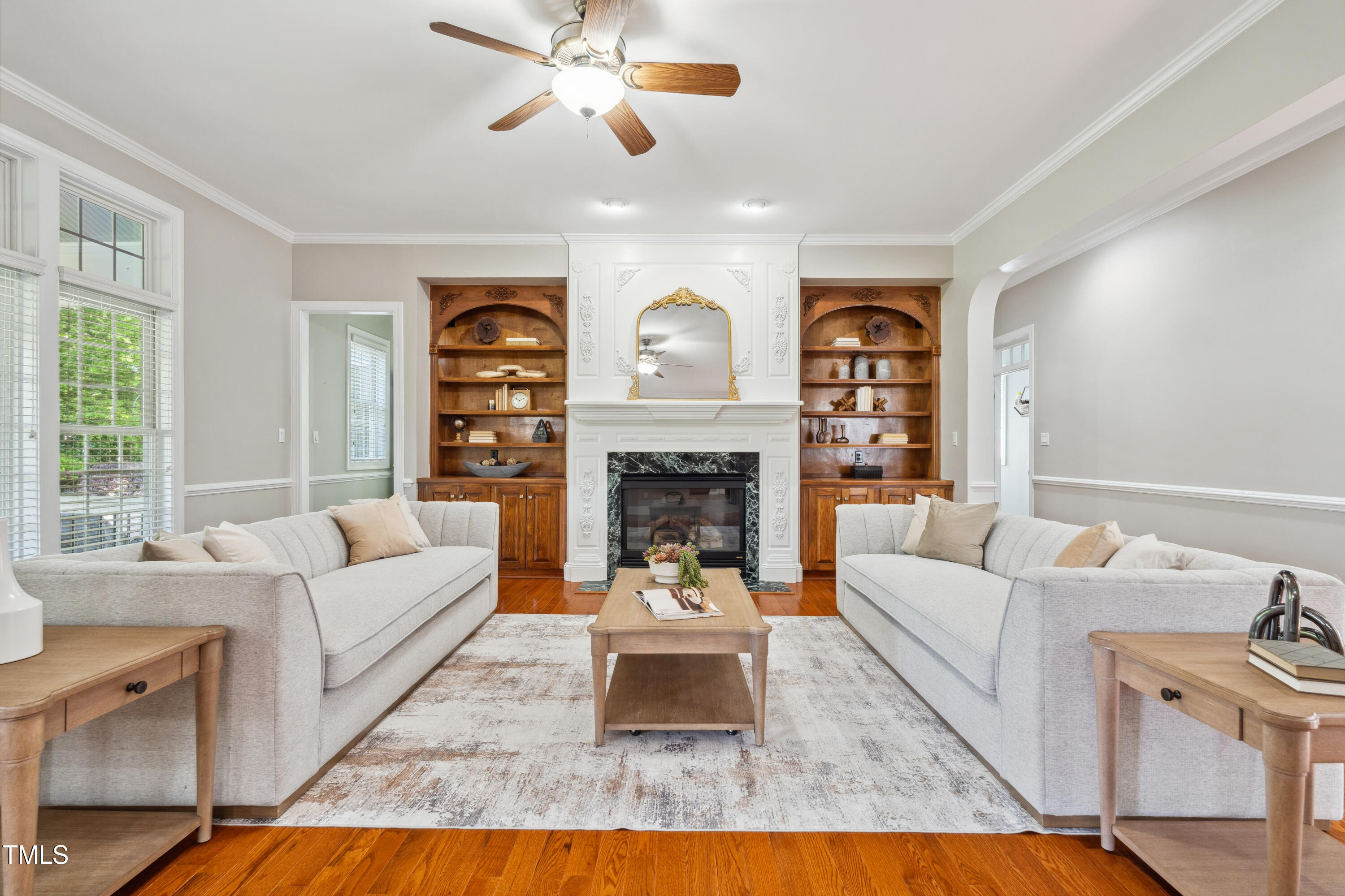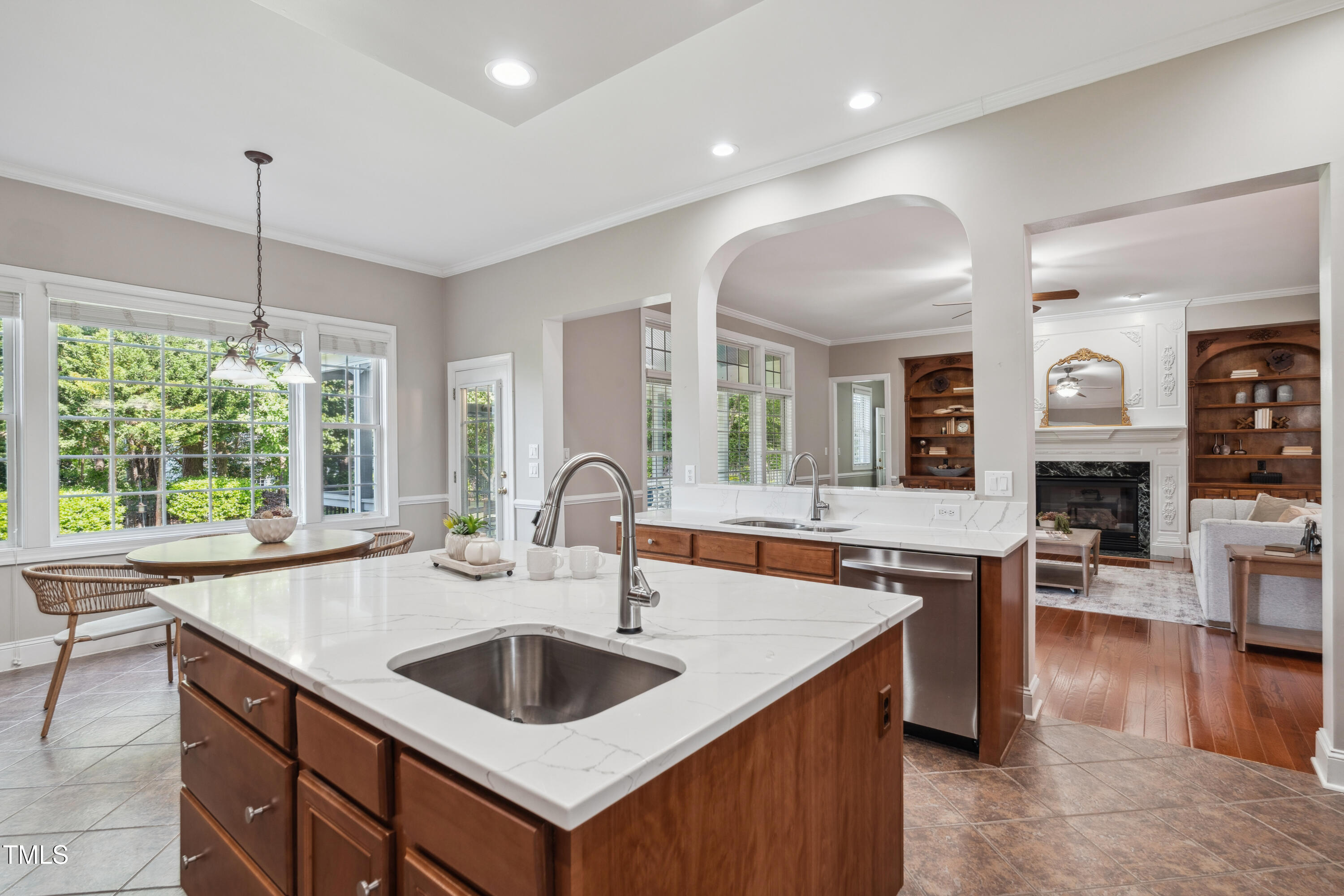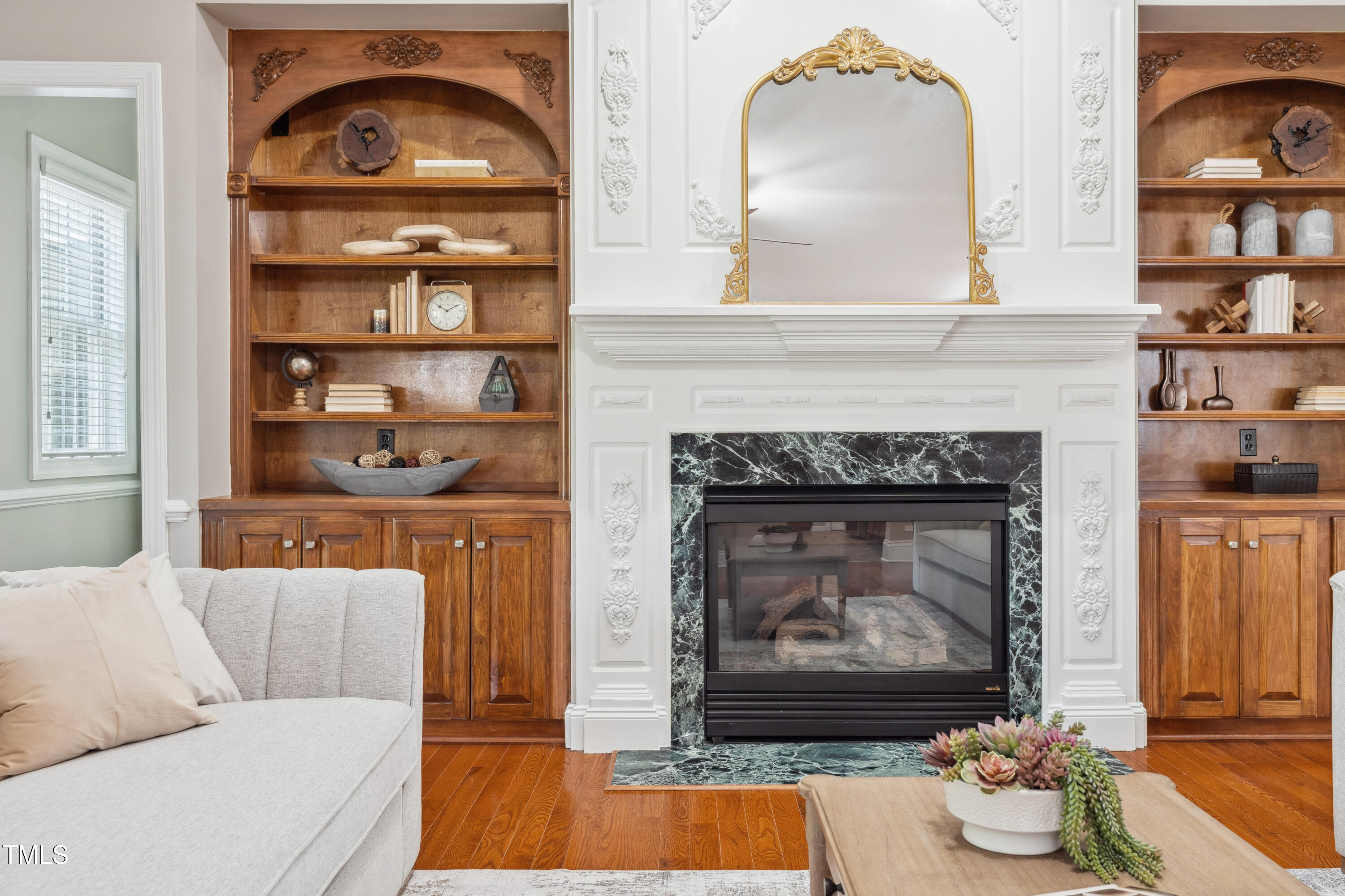 The recently updated kitchen showcases gleaming white quartz countertops, modern stainless steel appliances, and a functional layout perfect for entertaining. Adjacent is a bright and inviting family room with built-in shelving, a natural gas fireplace, and an open-concept design that creates a seamless flow throughout the main living area.