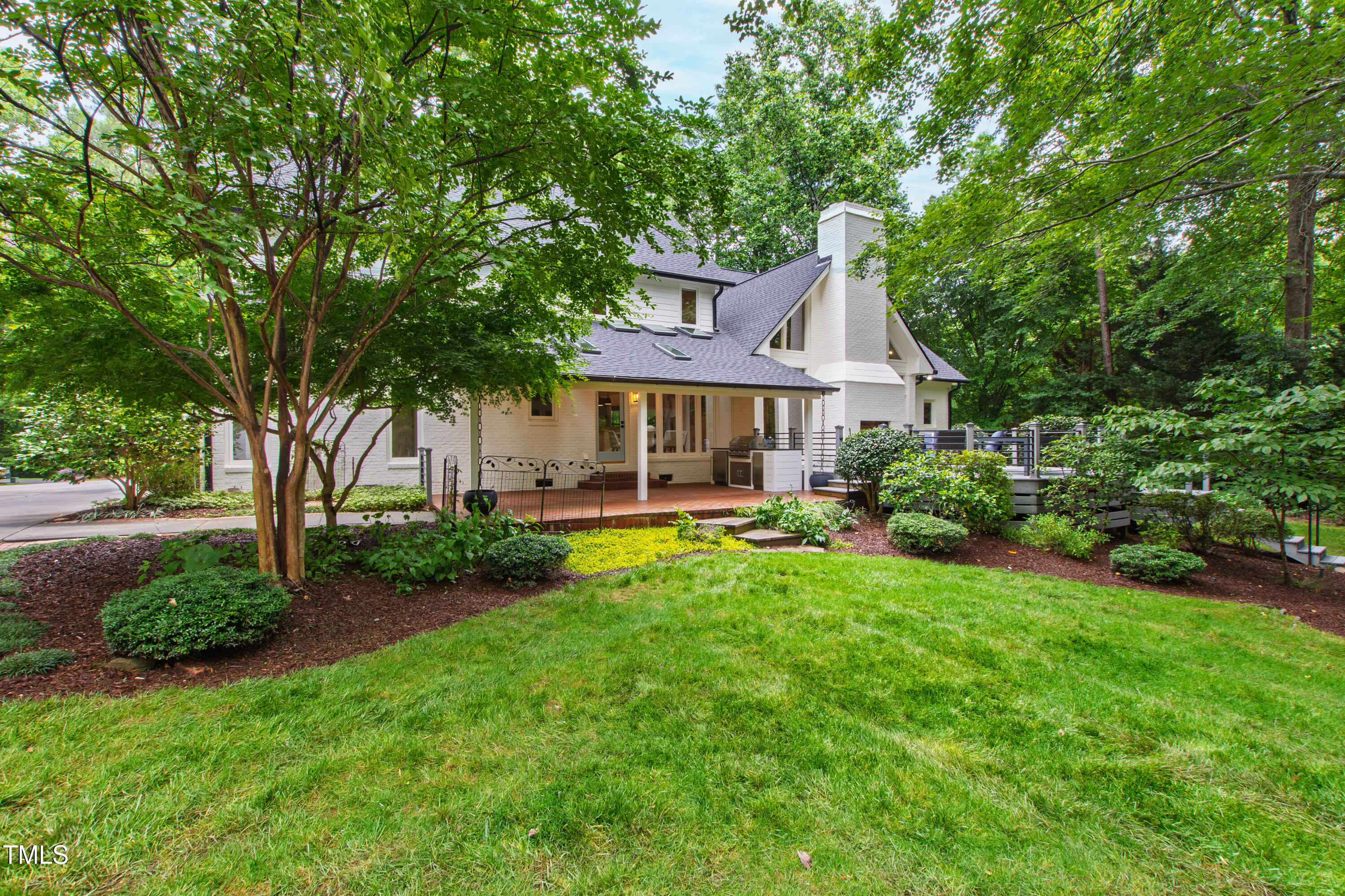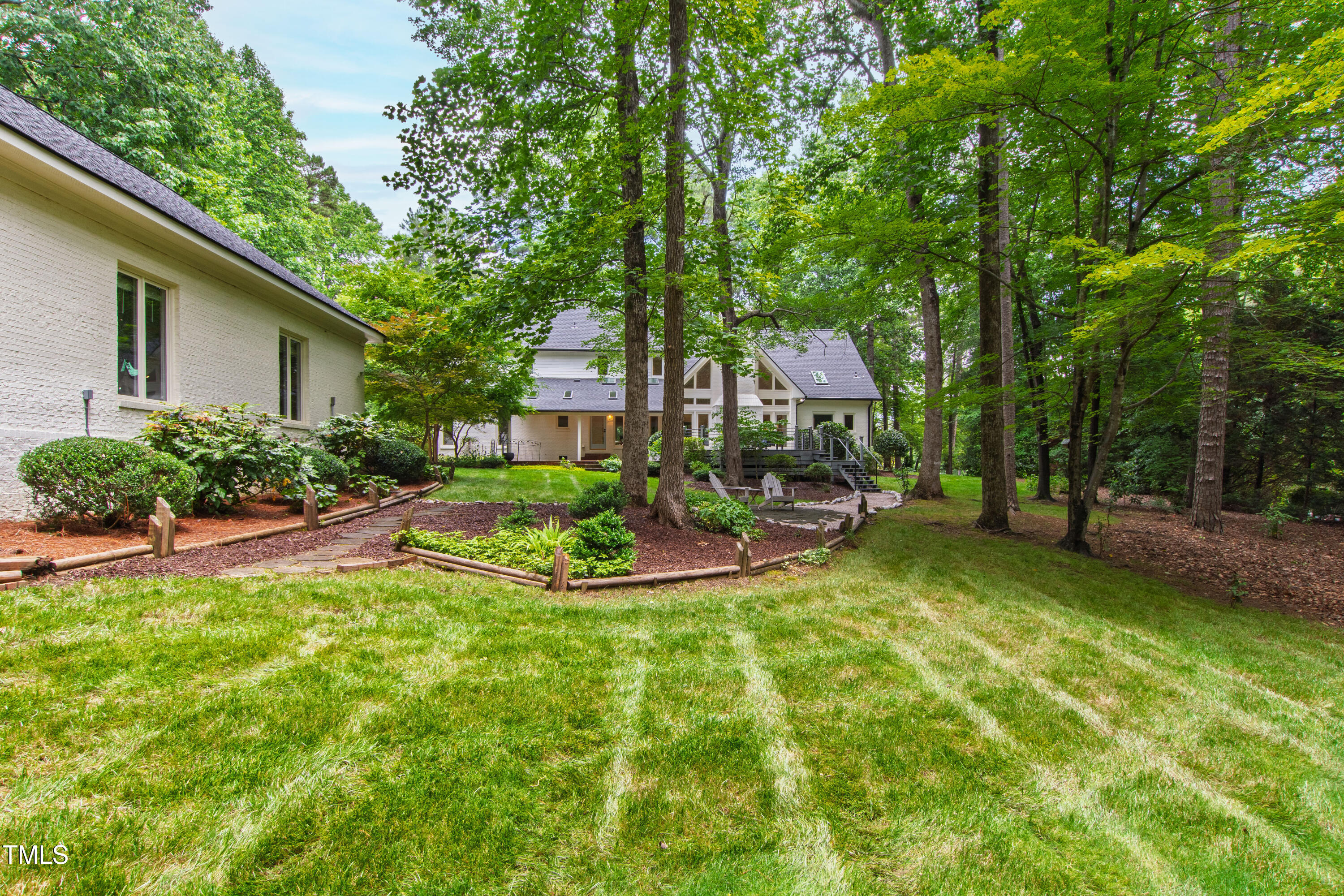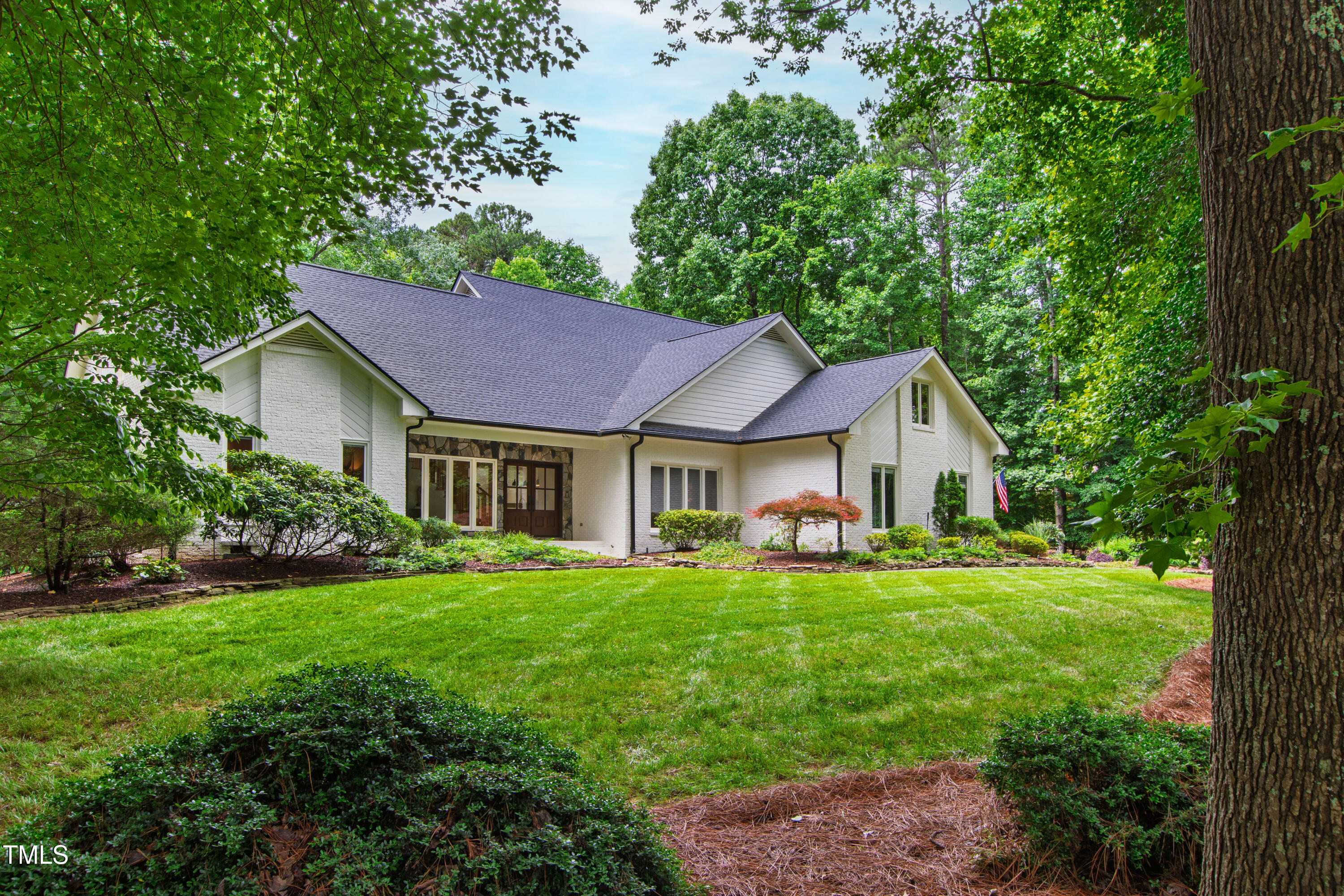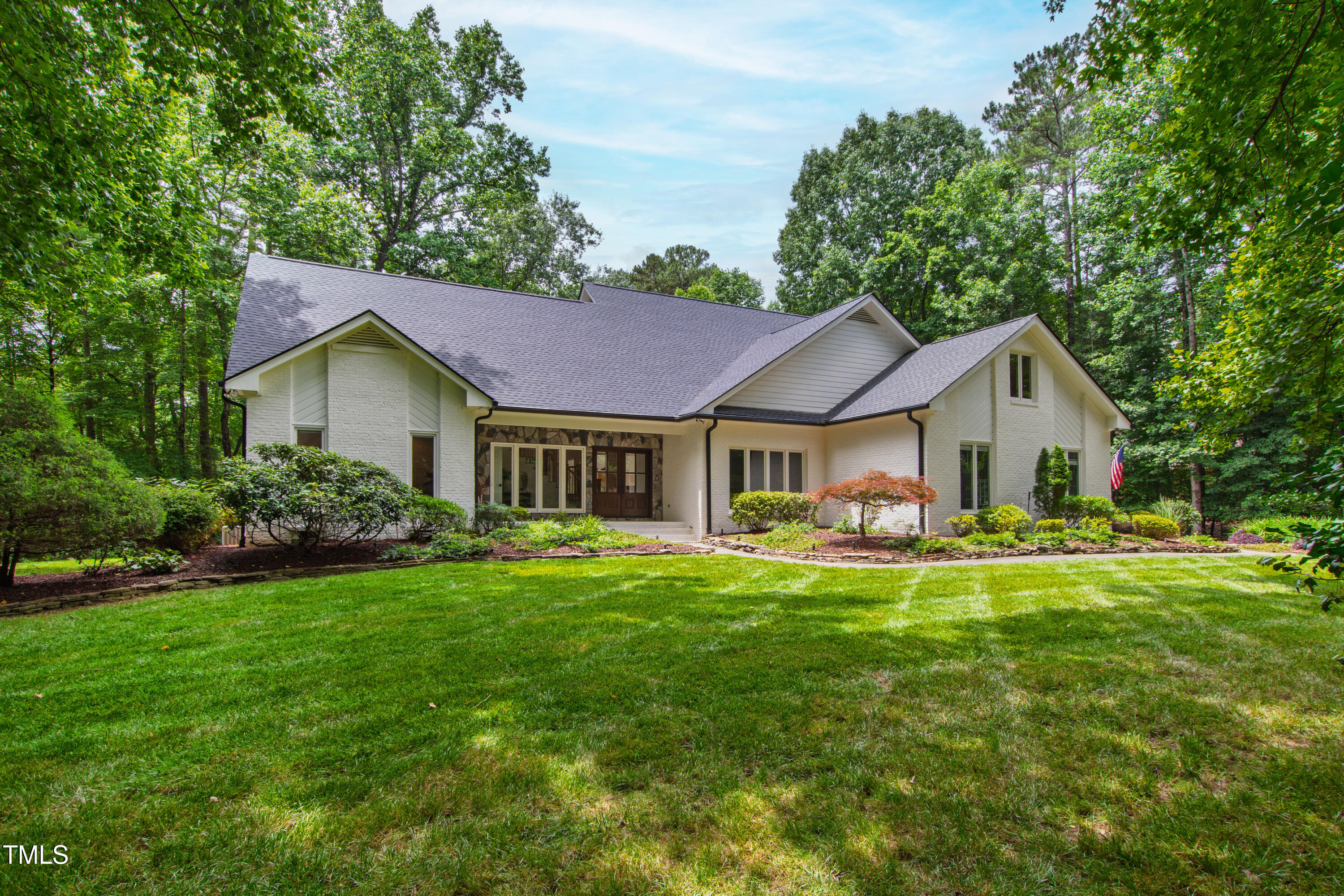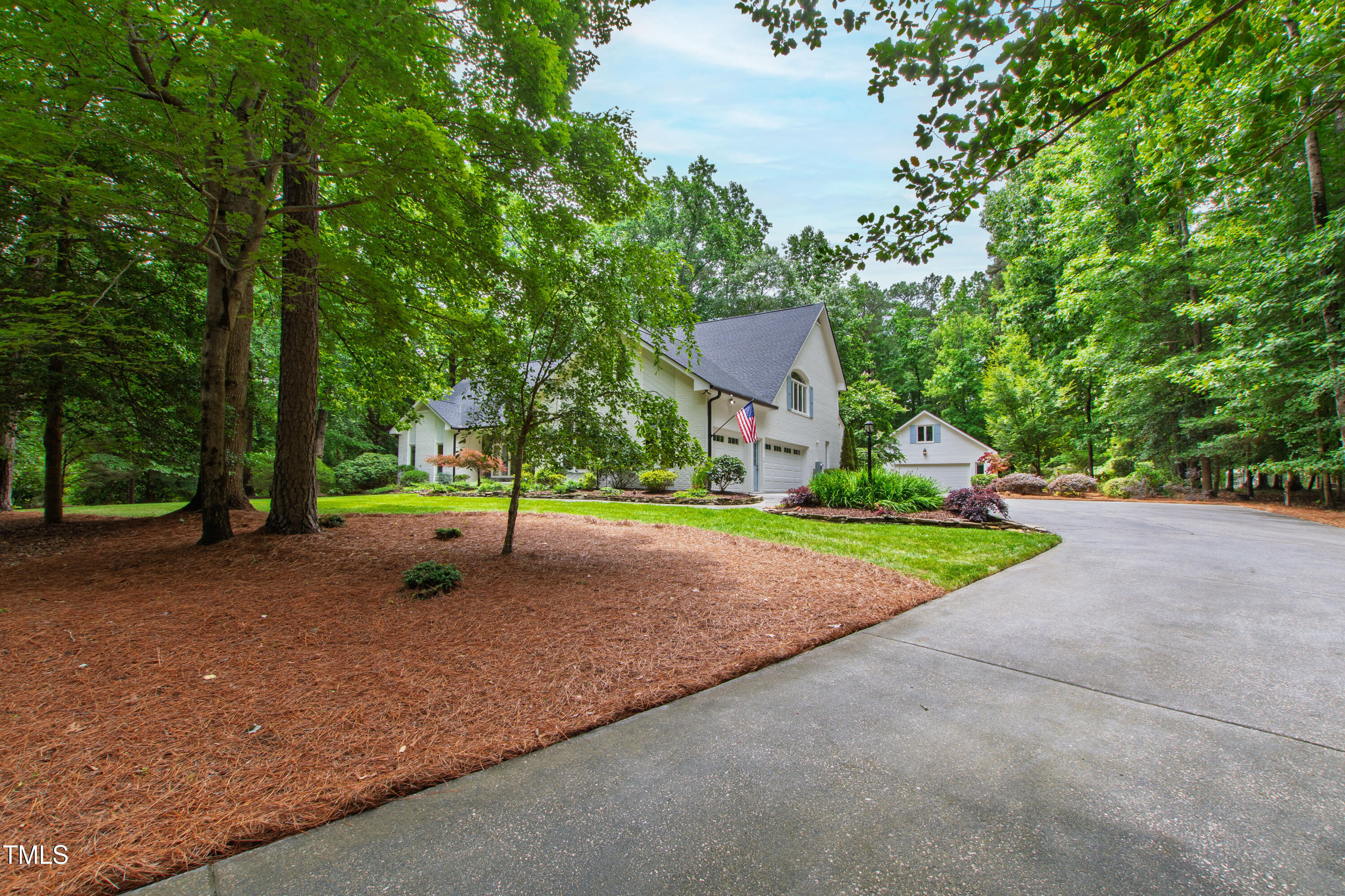 An architectural wonder awaits in this truly one of one property, where captivating modernity wraps in elegant grandeur - welcome to 1301 King Cross Court. Located in one of the most prestigious North Raleigh neighborhoods of Sheffield Manor, this five bedroom property offers unmatched tranquility with accessible convenience to an abundance of life's core amenities. Nestled on a private, strikingly landscaped 2 acre corner lot, this home exudes contemporary character through every touchpoint. The moment you step through the front door, you're greeted by an impressive, vaulted-ceiling family room anchored around a gas-log fireplace - the heart of the home. To the left, you'll find your own private retreat with the idyllic primary suite, boasting expansive dual closets and a sleek bathroom outfitted with a walk-in shower and soaking tub. To the right, the family room is flanked by a gourmet kitchen, sparing no expense with quartzite countertops, stainless steel Miele appliances, oversized farmhouse sink, plentiful cabinets and a seamlessly intertwined breakfast room. Cap the day in the unique and inviting Bourbon Room --an entertainer's delight that blends warmth, style, and character. The floor is completed by an additional bedroom, perfect for a lower level in-law room, home office, or first floor bonus space. Transporting upstairs, you're once again greeted by contemporary finishes and hardwood floors as three spacious bedrooms await, each with their own en-suite offering the ultimate in comfort and privacy for families or guests. An oversized bonus room, complete with a sleek wet bar and an additional flex space, is the perfect setting for movie nights, a game room or second floor entertaining. Outdoor living at its finest, the exterior of this home offers year-round use with a thoughtfully designed covered patio featuring an outdoor bar and grill. Unwind for a cozy evening or fresh summer night on the spacious deck that backs to the double-sided fireplace from the family room. Moving to the grounds, the expansive, beautifully maintained backyard offers plenty of room for anyone looking to add a pool -- yet the property is only a short walk to the community's swimming, tennis and pickleball courts, and scenic nature trails. With a brand new roof and pristine brick siding, this home is the epitome of a move-in ready property in ultimate condition. Rounding out the distinctive and exceptional design of this home, space abounds as you explore the property's generously-sized detached garage - a canvas of opportunity prime for transformation into your next working space, home gym, workshop, secondary garage, storage, or so much more. Every square foot of this stunning abode has been thoughtfully planned and detailed. A combination of remarkable luxury, impeccable condition, private space, and unbeatable accessibility - 1301 King Cross Court is the perfect balance of elegance and comfort for unparalleled, everyday living in an exceptional manner.
