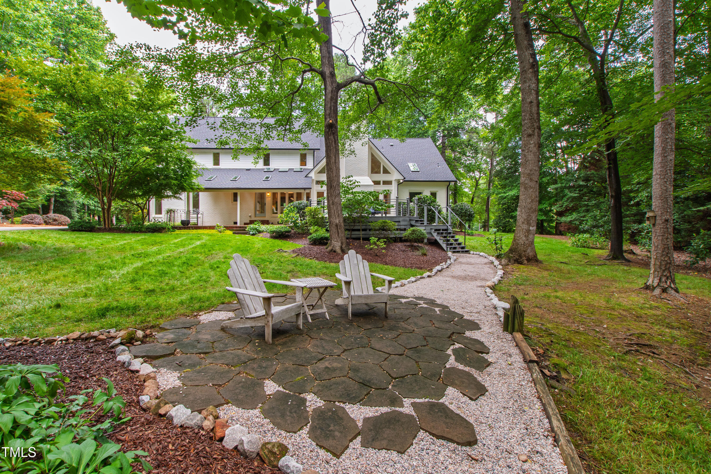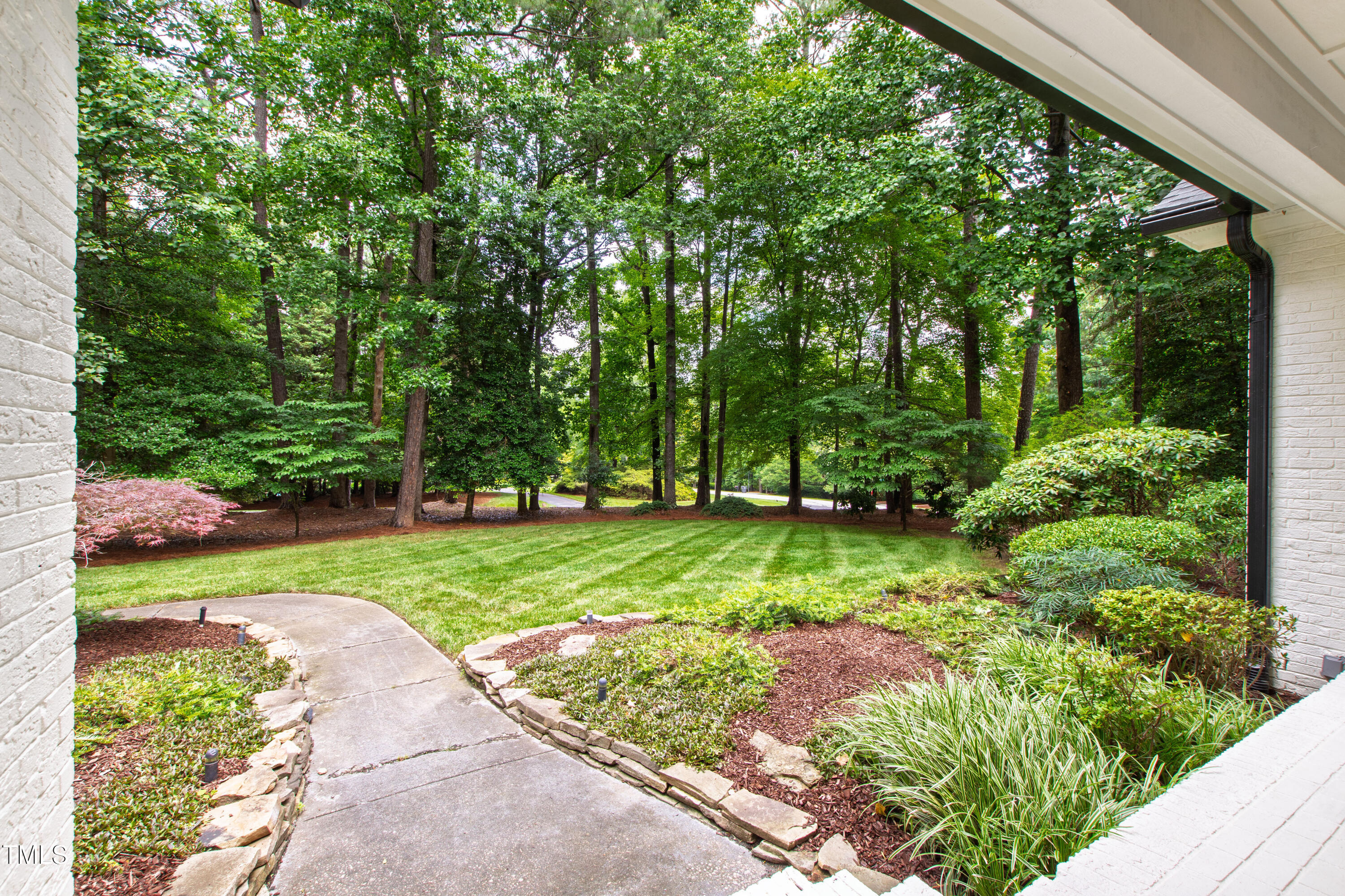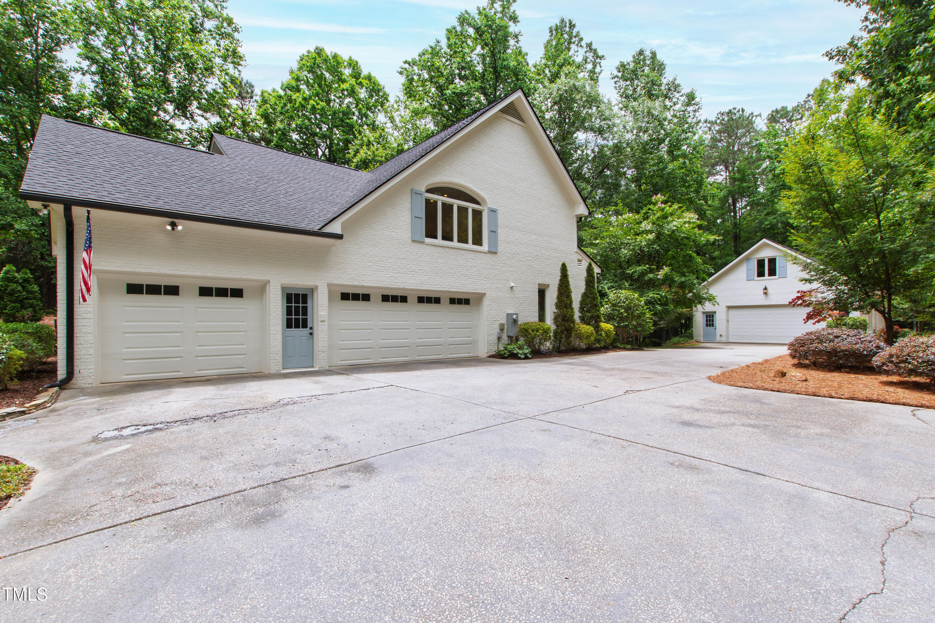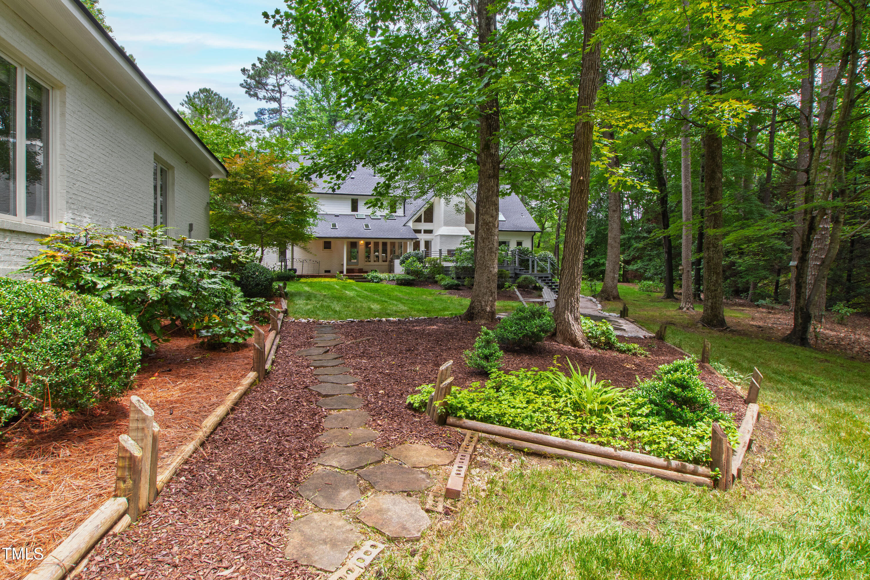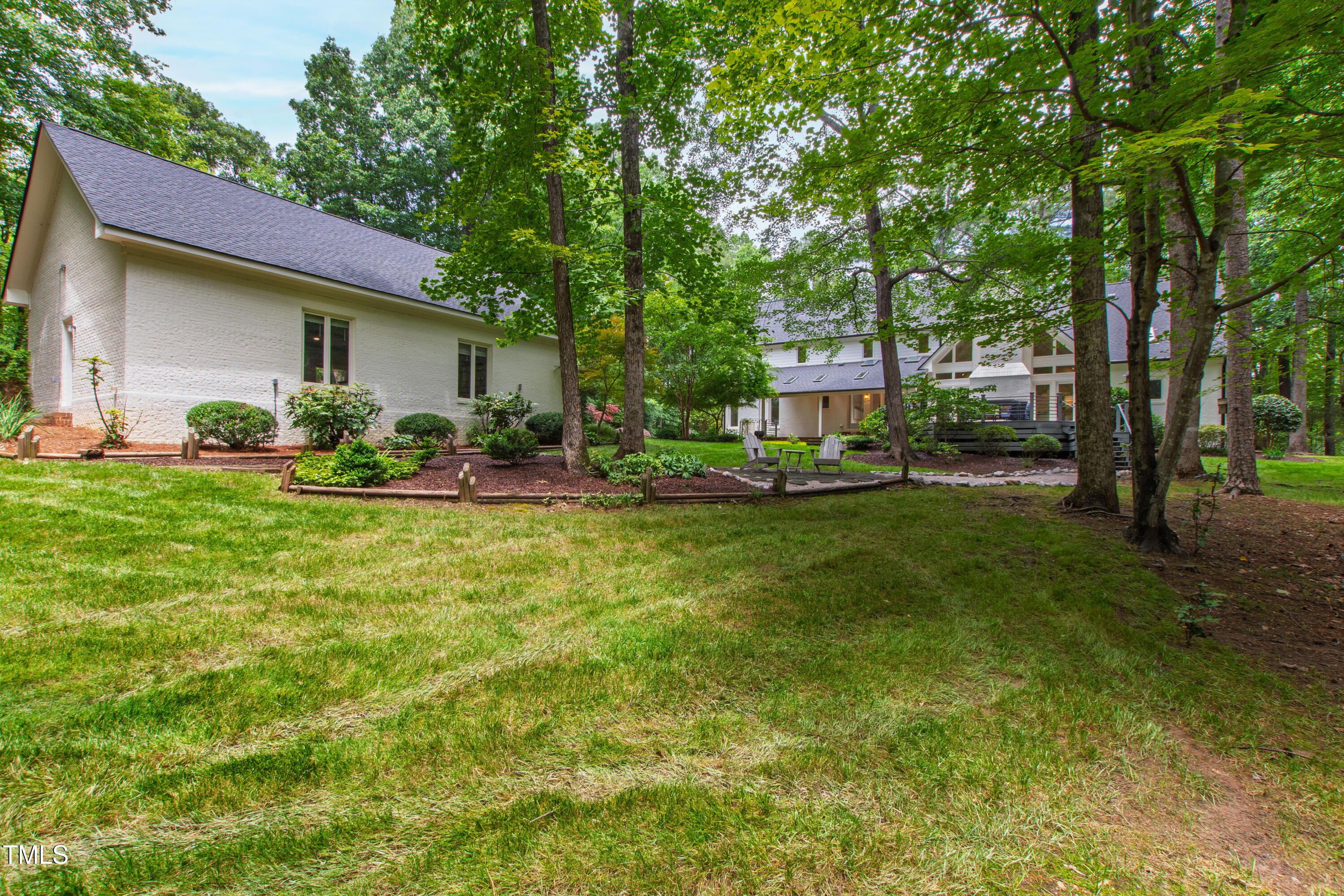 An architectural wonder awaits in this truly one of one property, where captivating modernity wraps in elegant grandeur - welcome to 1301 King Cross Court. Located in one of the most prestigious North Raleigh neighborhoods of Sheffield Manor, this five bedroom property offers unmatched tranquility with accessible convenience to an abundance of life's core amenities. Nestled on a private, strikingly landscaped 2 acre corner lot, this home exudes contemporary character through every touchpoint. The moment you step through the front door, you're greeted by an impressive, vaulted-ceiling family room anchored around a gas-log fireplace - the heart of the home. To the left, you'll find your own private retreat with the idyllic primary suite, boasting expansive dual closets and a sleek bathroom outfitted with a walk-in shower and soaking tub. To the right, the family room is flanked by a gourmet kitchen, sparing no expense with quartzite countertops, stainless steel Miele appliances, oversized farmhouse sink, plentiful cabinets and a seamlessly intertwined breakfast room. Cap the day in the unique and inviting Bourbon Room --an entertainer's delight that blends warmth, style, and character. The floor is completed by an additional bedroom, perfect for a lower level in-law room, home office, or first floor bonus space. Transporting upstairs, you're once again greeted by contemporary finishes and hardwood floors as three spacious bedrooms await, each with their own en-suite offering the ultimate in comfort and privacy for families or guests. An oversized bonus room, complete with a sleek wet bar and an additional flex space, is the perfect setting for movie nights, a game room or second floor entertaining. Outdoor living at its finest, the exterior of this home offers year-round use with a thoughtfully designed covered patio featuring an outdoor bar and grill. Unwind for a cozy evening or fresh summer night on the spacious deck that backs to the double-sided fireplace from the family room. Moving to the grounds, the expansive, beautifully maintained backyard offers plenty of room for anyone looking to add a pool -- yet the property is only a short walk to the community's swimming, tennis and pickleball courts, and scenic nature trails. With a brand new roof and pristine brick siding, this home is the epitome of a move-in ready property in ultimate condition. Rounding out the distinctive and exceptional design of this home, space abounds as you explore the property's generously-sized detached garage - a canvas of opportunity prime for transformation into your next working space, home gym, workshop, secondary garage, storage, or so much more. Every square foot of this stunning abode has been thoughtfully planned and detailed. A combination of remarkable luxury, impeccable condition, private space, and unbeatable accessibility - 1301 King Cross Court is the perfect balance of elegance and comfort for unparalleled, everyday living in an exceptional manner.