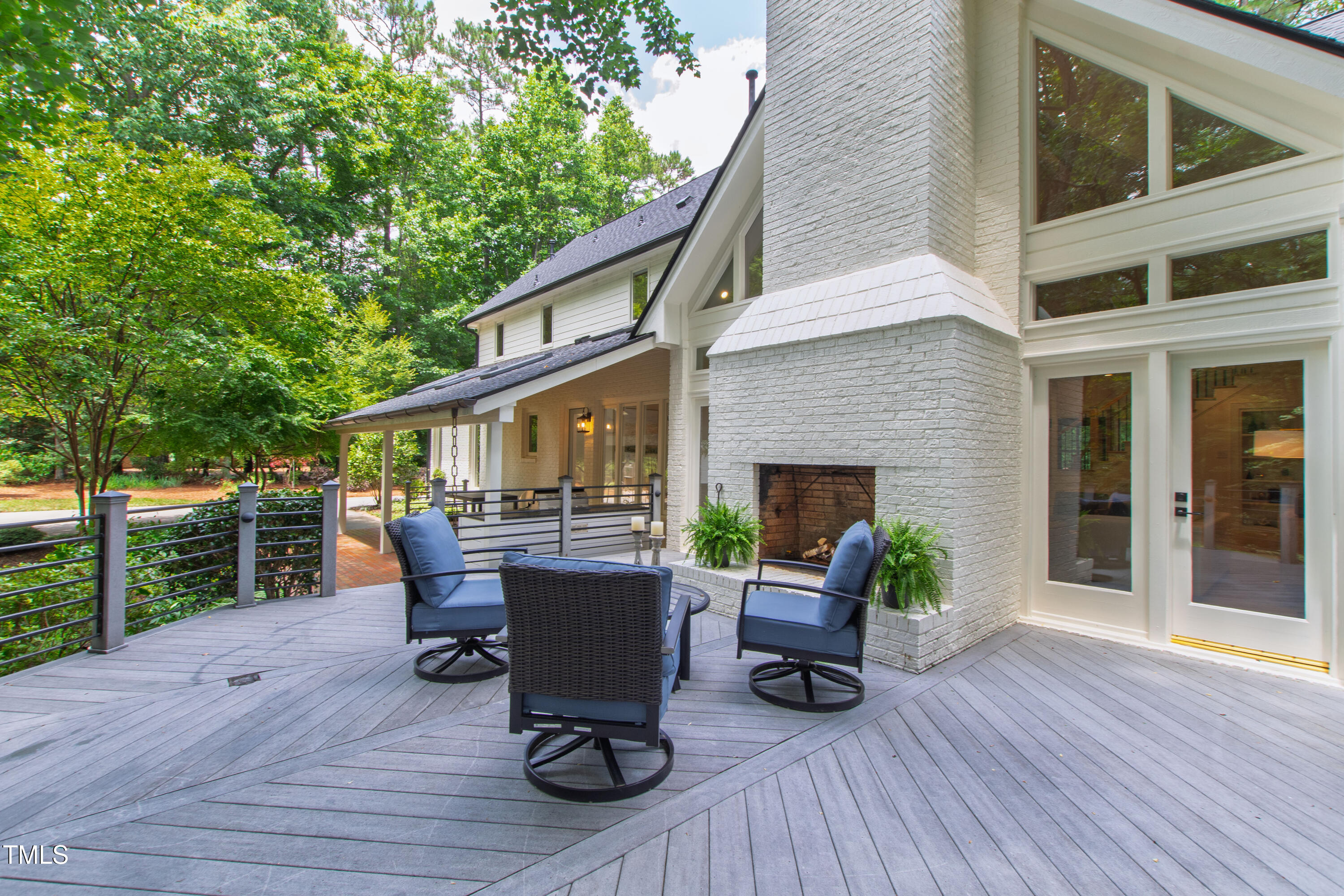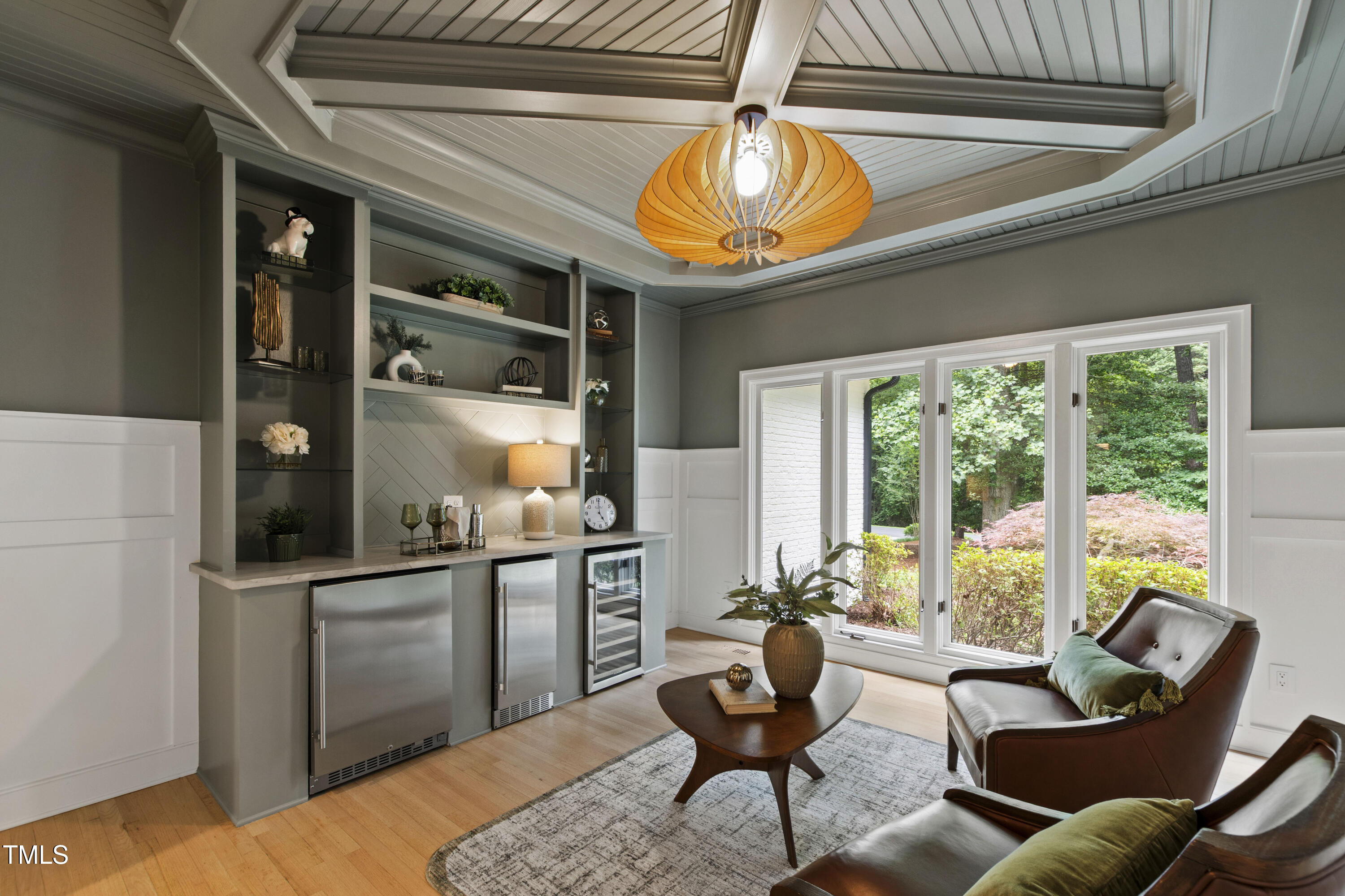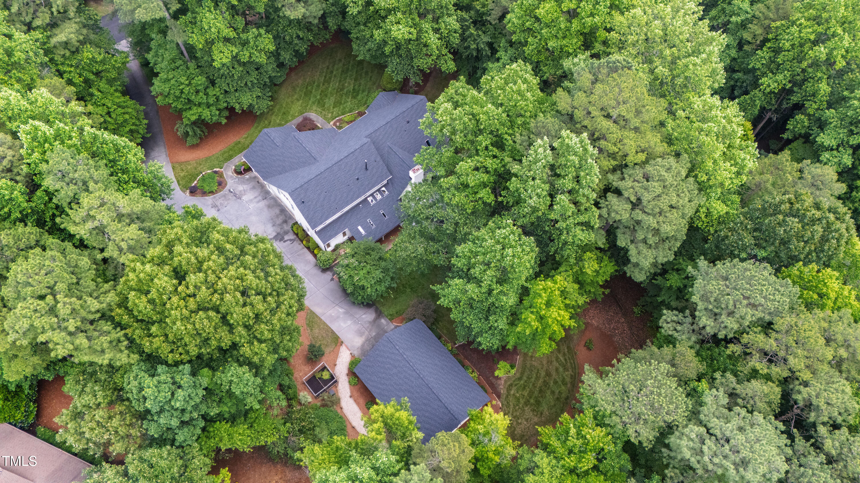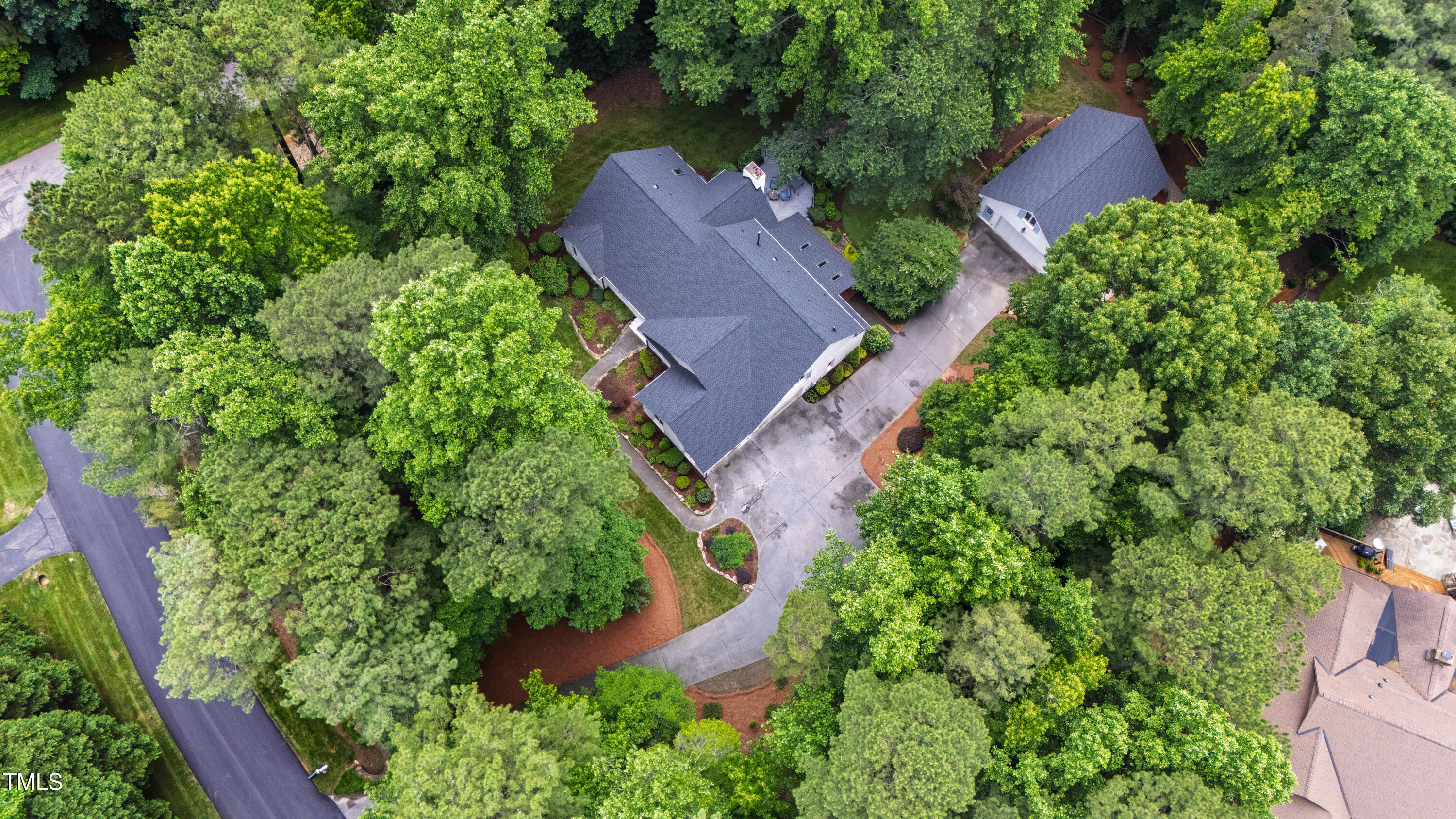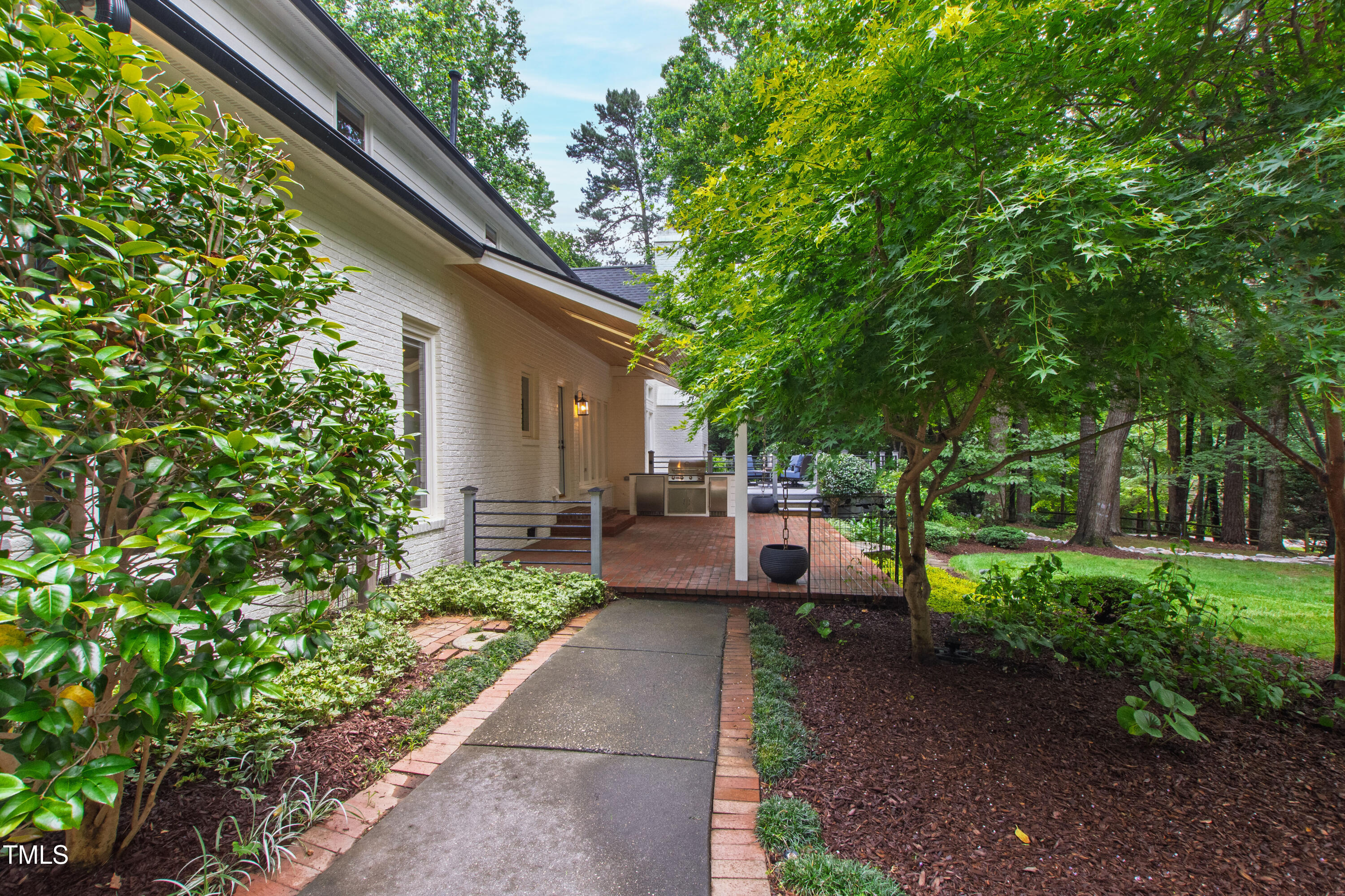 An architectural wonder awaits in this truly one of one property, where captivating modernity wraps in elegant grandeur - welcome to 1301 King Cross Court. Located in one of the most prestigious North Raleigh neighborhoods of Sheffield Manor, this five bedroom property offers unmatched tranquility with accessible convenience to an abundance of life's core amenities. Nestled on a private, strikingly landscaped 2 acre corner lot, this home exudes contemporary character through every touchpoint. The moment you step through the front door, you're greeted by an impressive, vaulted-ceiling family room anchored around a gas-log fireplace - the heart of the home. To the left, you'll find your own private retreat with the idyllic primary suite, boasting expansive dual closets and a sleek bathroom outfitted with a walk-in shower and soaking tub. To the right, the family room is flanked by a gourmet kitchen, sparing no expense with quartzite countertops, stainless steel Miele appliances, oversized farmhouse sink, plentiful cabinets and a seamlessly intertwined breakfast room. Cap the day in the unique and inviting Bourbon Room --an entertainer's delight that blends warmth, style, and character. The floor is completed by an additional bedroom, perfect for a lower level in-law room, home office, or first floor bonus space. Transporting upstairs, you're once again greeted by contemporary finishes and hardwood floors as three spacious bedrooms await, each with their own en-suite offering the ultimate in comfort and privacy for families or guests. An oversized bonus room, complete with a sleek wet bar and an additional flex space, is the perfect setting for movie nights, a game room or second floor entertaining. Outdoor living at its finest, the exterior of this home offers year-round use with a thoughtfully designed covered patio featuring an outdoor bar and grill. Unwind for a cozy evening or fresh summer night on the spacious deck that backs to the double-sided fireplace from the family room. Moving to the grounds, the expansive, beautifully maintained backyard offers plenty of room for anyone looking to add a pool -- yet the property is only a short walk to the community's swimming, tennis and pickleball courts, and scenic nature trails. With a brand new roof and pristine brick siding, this home is the epitome of a move-in ready property in ultimate condition. Rounding out the distinctive and exceptional design of this home, space abounds as you explore the property's generously-sized detached garage - a canvas of opportunity prime for transformation into your next working space, home gym, workshop, secondary garage, storage, or so much more. Every square foot of this stunning abode has been thoughtfully planned and detailed. A combination of remarkable luxury, impeccable condition, private space, and unbeatable accessibility - 1301 King Cross Court is the perfect balance of elegance and comfort for unparalleled, everyday living in an exceptional manner.