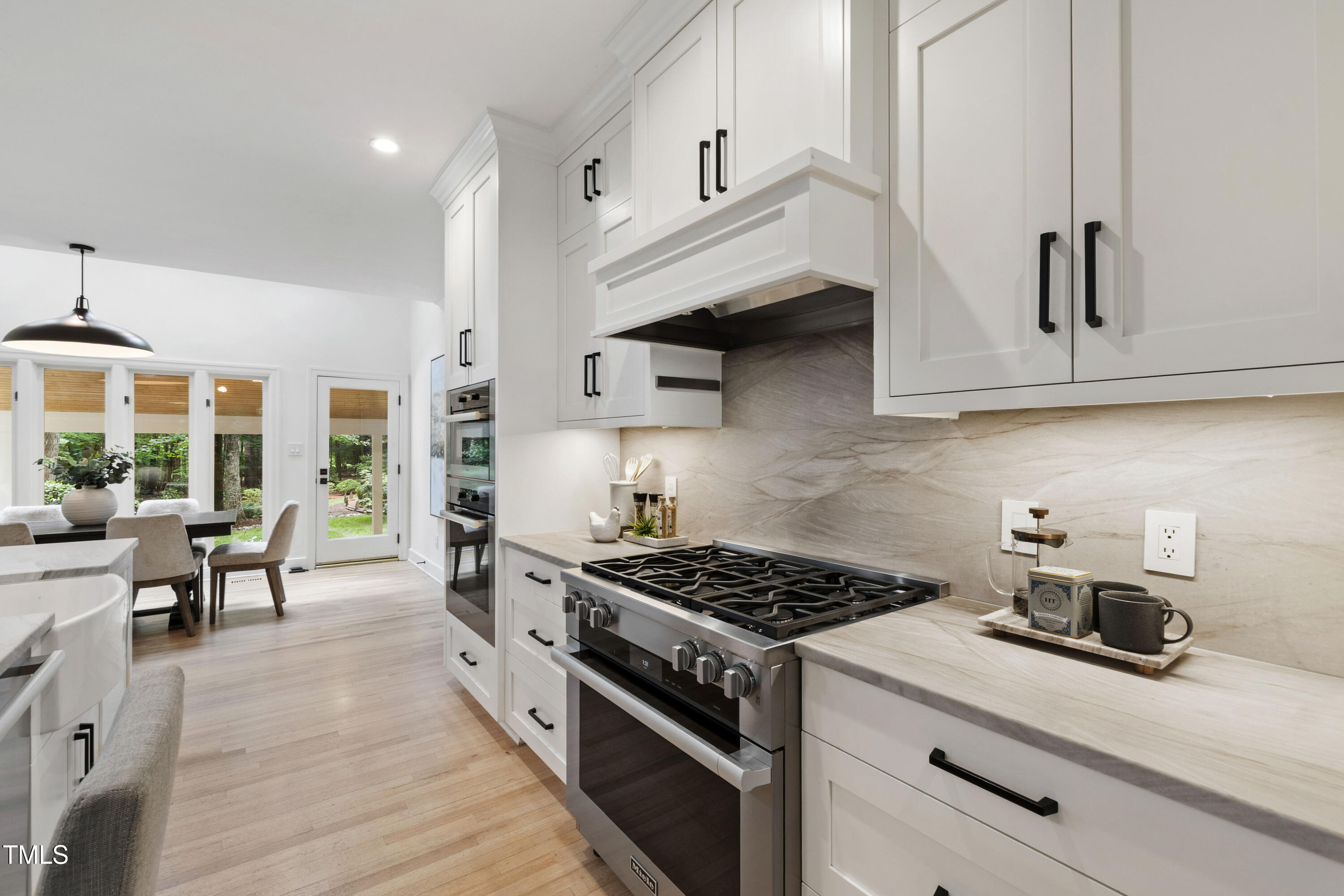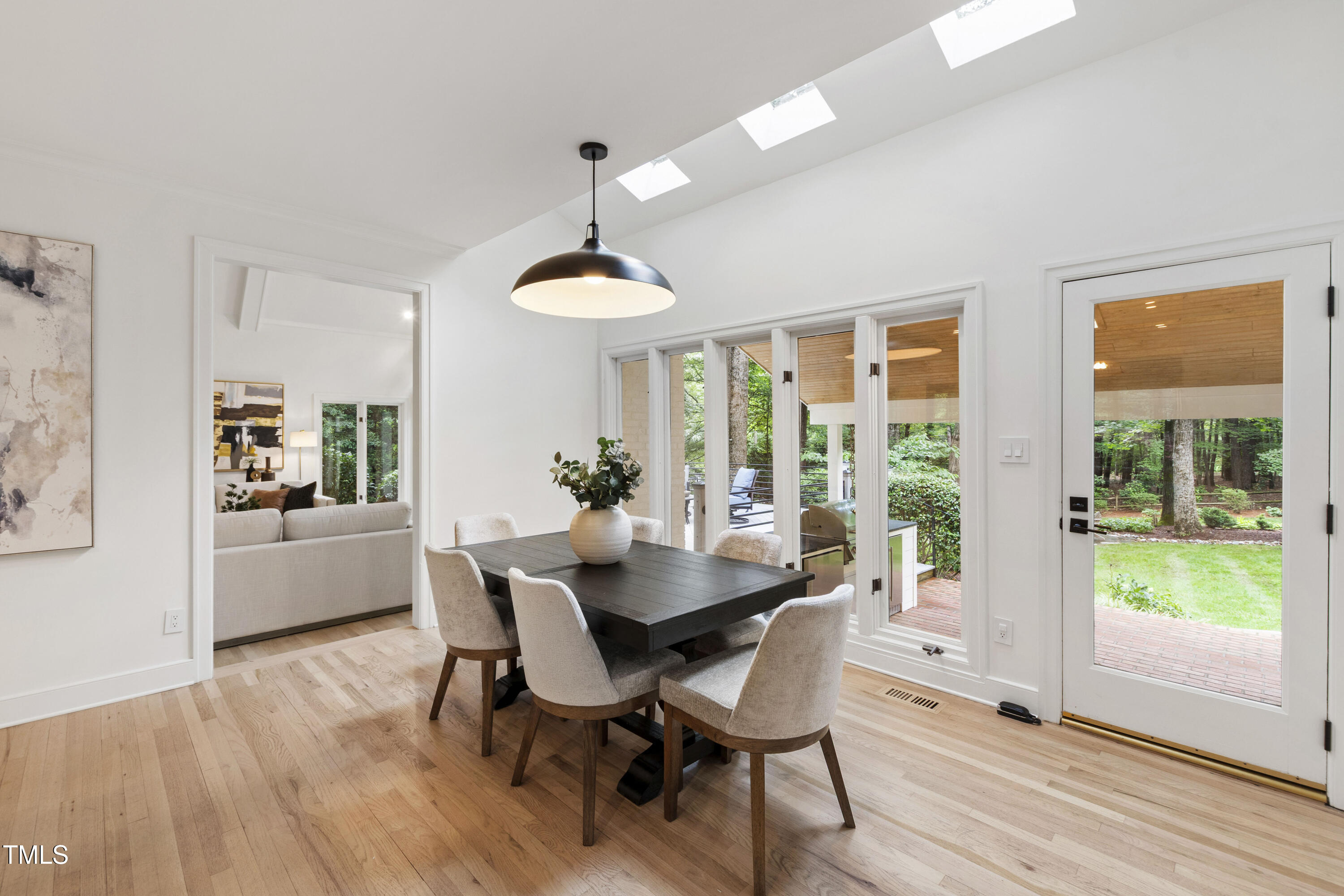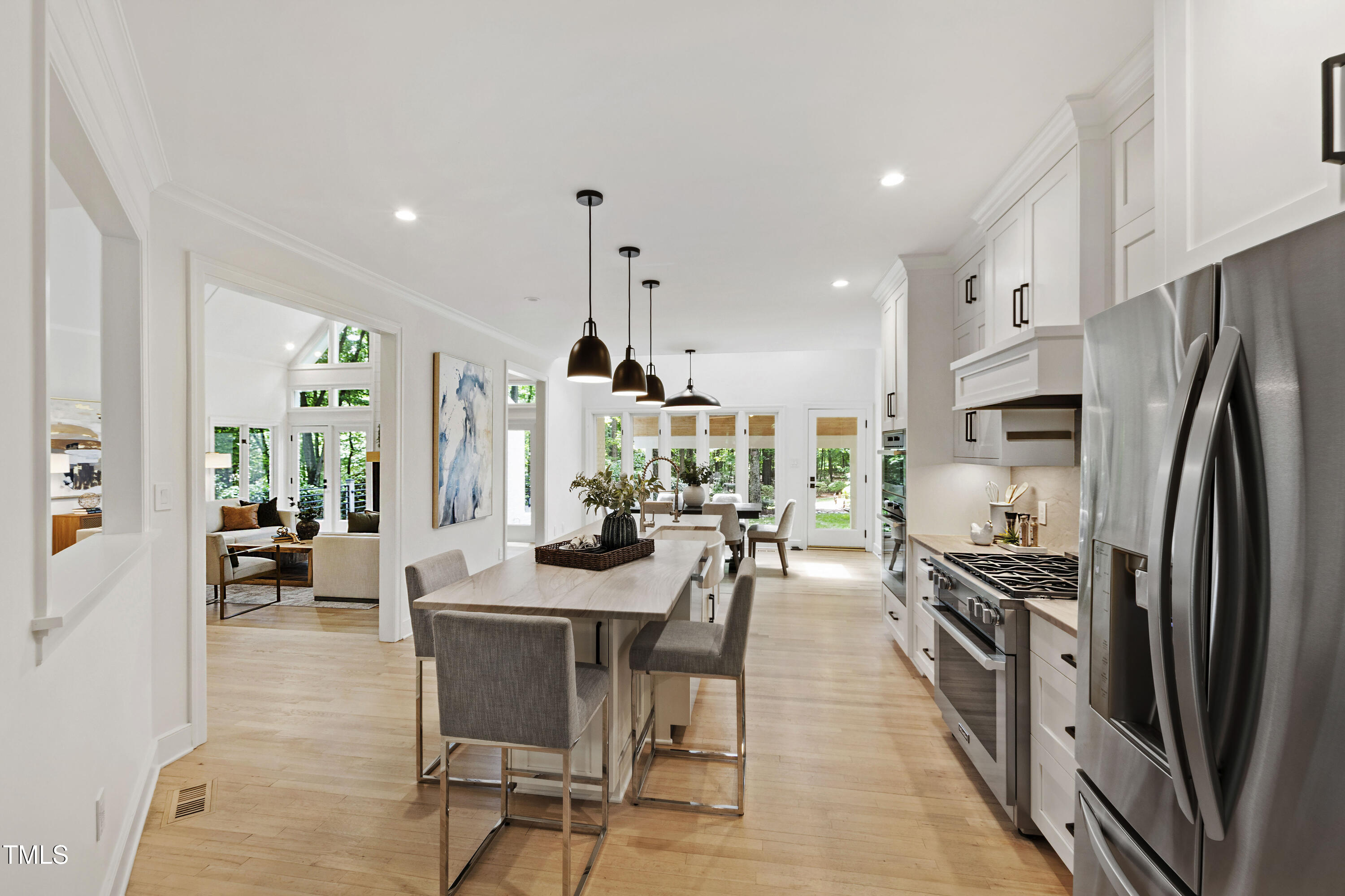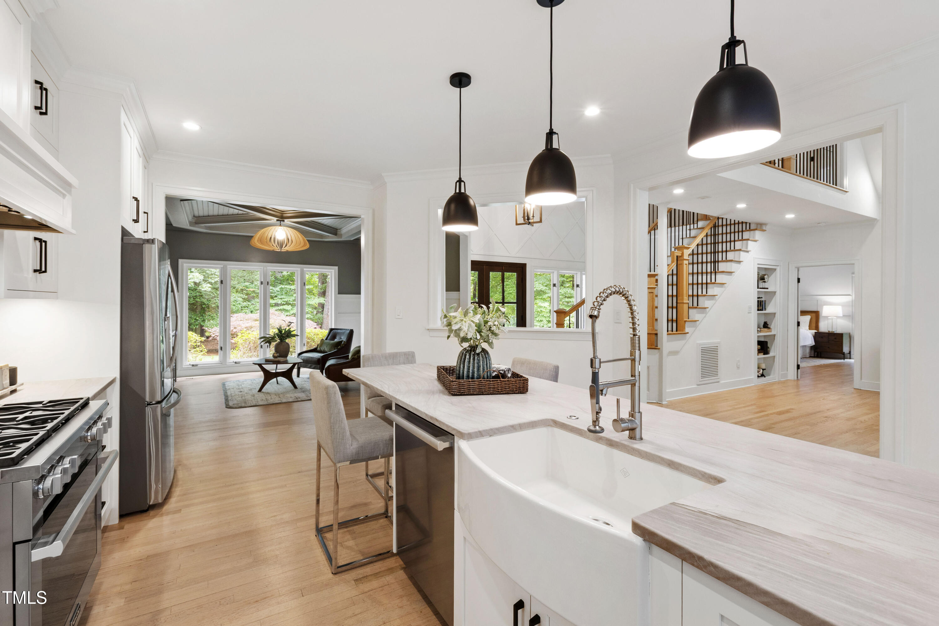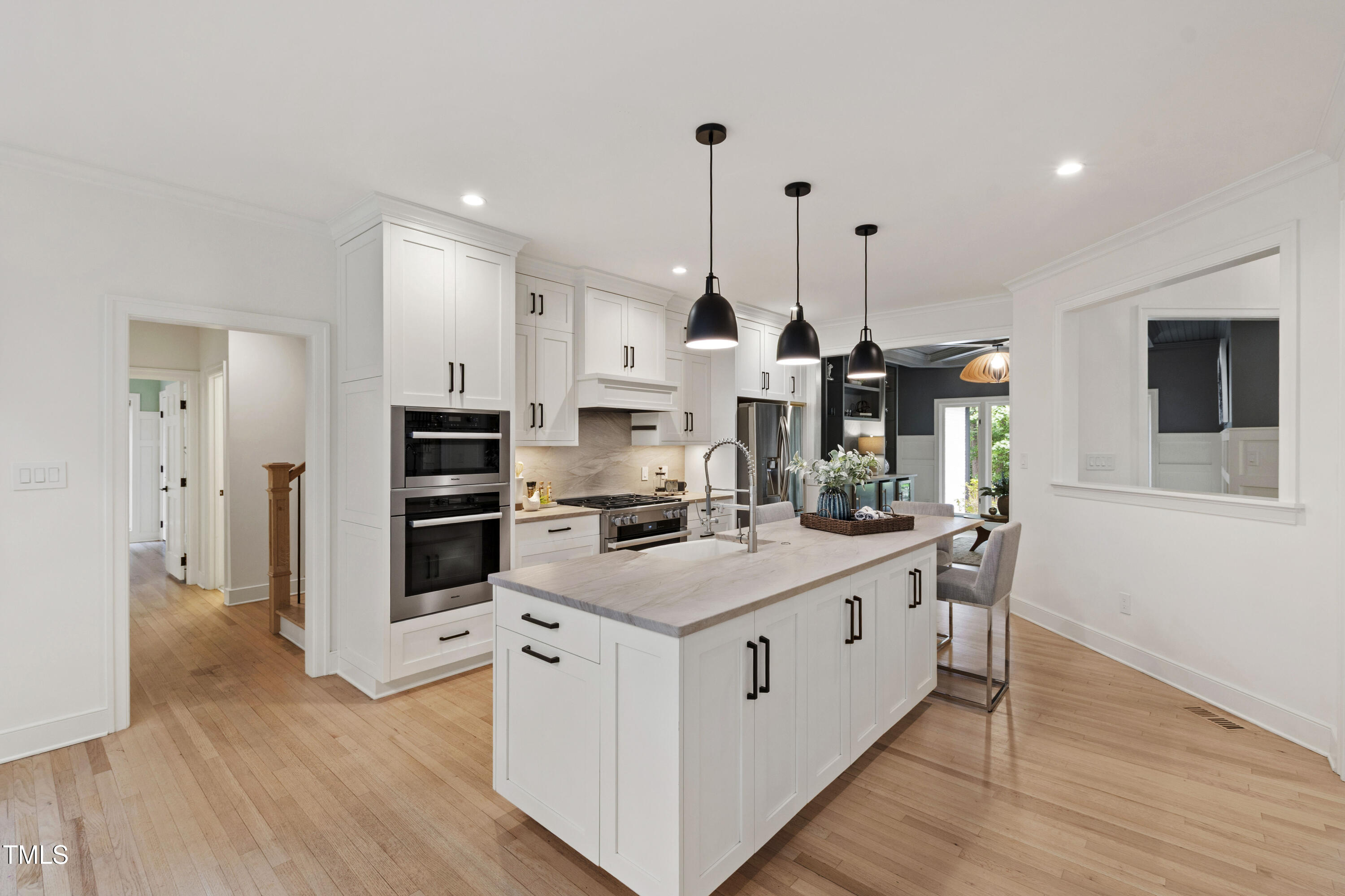 An architectural wonder awaits in this truly one of one property, where captivating modernity wraps in elegant grandeur - welcome to 1301 King Cross Court. Located in one of the most prestigious North Raleigh neighborhoods of Sheffield Manor, this five bedroom property offers unmatched tranquility with accessible convenience to an abundance of life's core amenities. Nestled on a private, strikingly landscaped 2 acre corner lot, this home exudes contemporary character through every touchpoint. The moment you step through the front door, you're greeted by an impressive, vaulted-ceiling family room anchored around a gas-log fireplace - the heart of the home. To the left, you'll find your own private retreat with the idyllic primary suite, boasting expansive dual closets and a sleek bathroom outfitted with a walk-in shower and soaking tub. To the right, the family room is flanked by a gourmet kitchen, sparing no expense with quartzite countertops, stainless steel Miele appliances, oversized farmhouse sink, plentiful cabinets and a seamlessly intertwined breakfast room. Cap the day in the unique and inviting Bourbon Room --an entertainer's delight that blends warmth, style, and character. The floor is completed by an additional bedroom, perfect for a lower level in-law room, home office, or first floor bonus space. Transporting upstairs, you're once again greeted by contemporary finishes and hardwood floors as three spacious bedrooms await, each with their own en-suite offering the ultimate in comfort and privacy for families or guests. An oversized bonus room, complete with a sleek wet bar and an additional flex space, is the perfect setting for movie nights, a game room or second floor entertaining. Outdoor living at its finest, the exterior of this home offers year-round use with a thoughtfully designed covered patio featuring an outdoor bar and grill. Unwind for a cozy evening or fresh summer night on the spacious deck that backs to the double-sided fireplace from the family room. Moving to the grounds, the expansive, beautifully maintained backyard offers plenty of room for anyone looking to add a pool -- yet the property is only a short walk to the community's swimming, tennis and pickleball courts, and scenic nature trails. With a brand new roof and pristine brick siding, this home is the epitome of a move-in ready property in ultimate condition. Rounding out the distinctive and exceptional design of this home, space abounds as you explore the property's generously-sized detached garage - a canvas of opportunity prime for transformation into your next working space, home gym, workshop, secondary garage, storage, or so much more. Every square foot of this stunning abode has been thoughtfully planned and detailed. A combination of remarkable luxury, impeccable condition, private space, and unbeatable accessibility - 1301 King Cross Court is the perfect balance of elegance and comfort for unparalleled, everyday living in an exceptional manner.