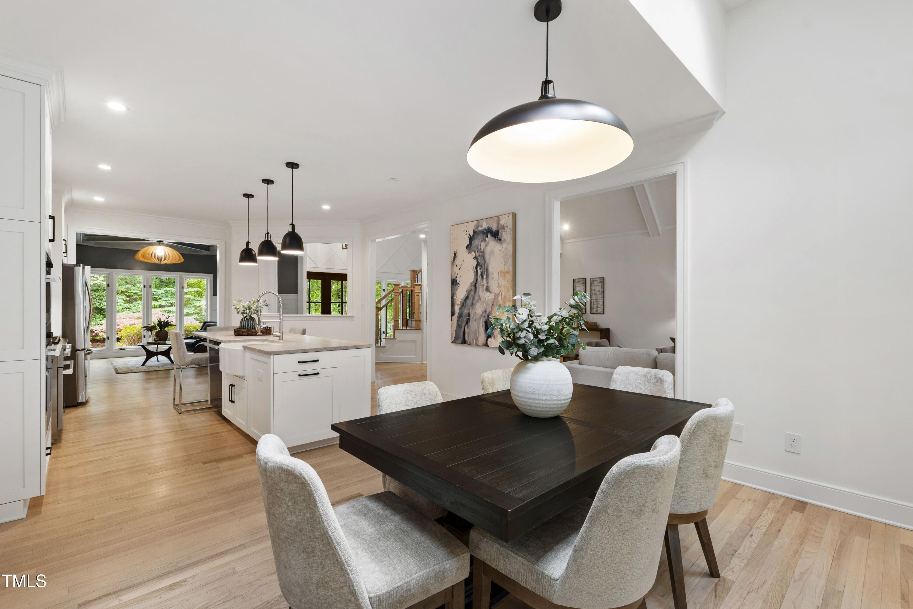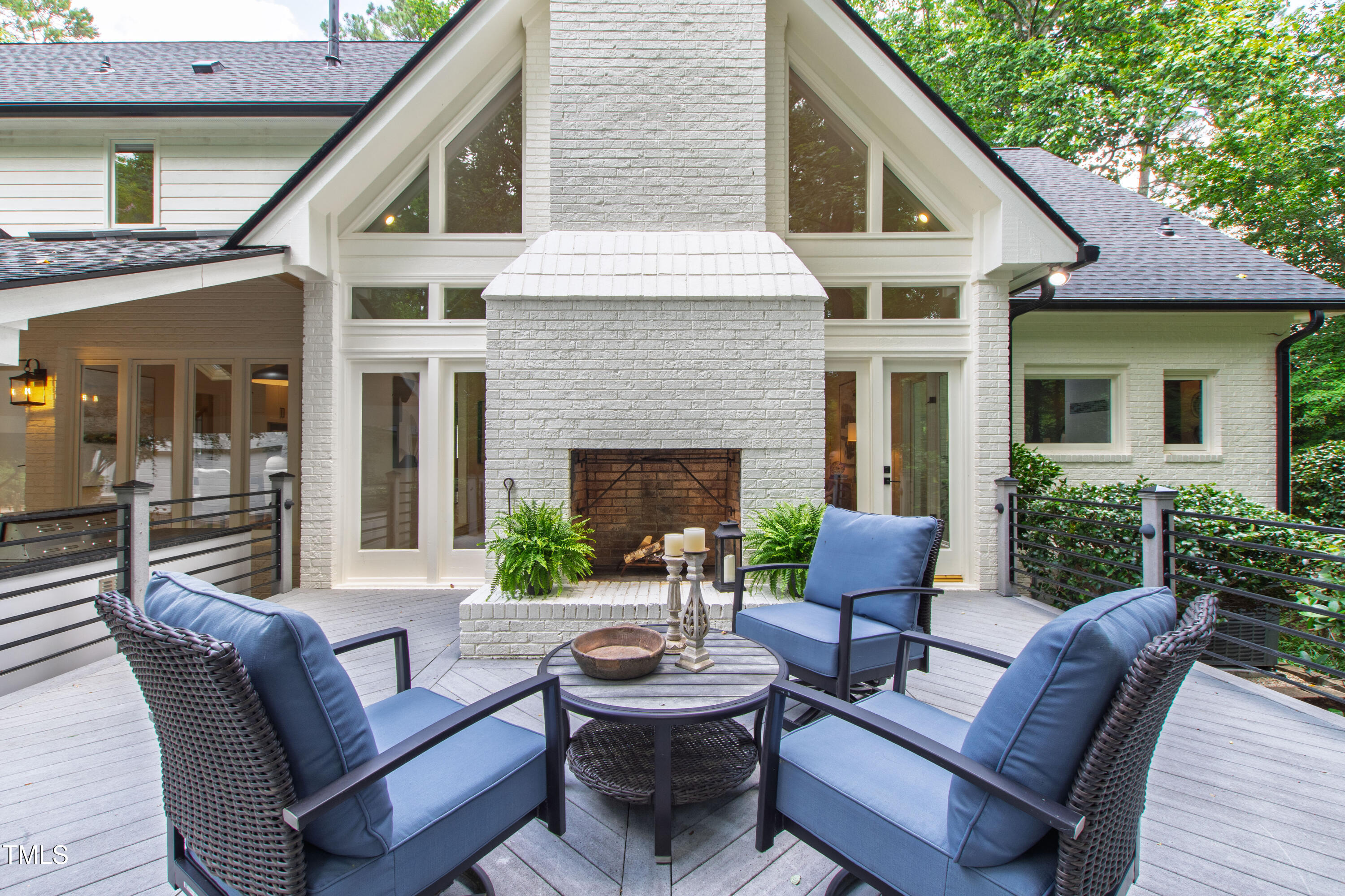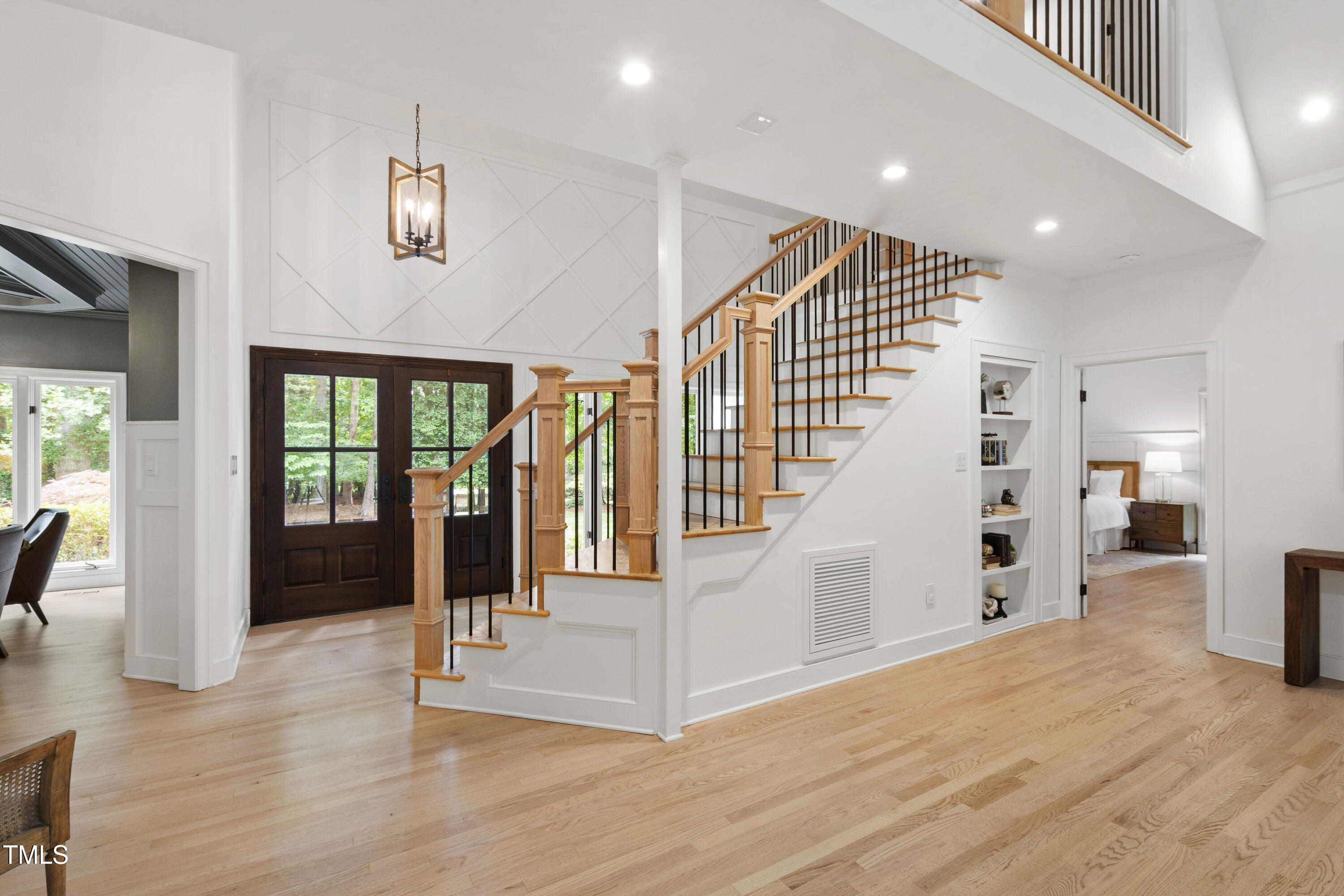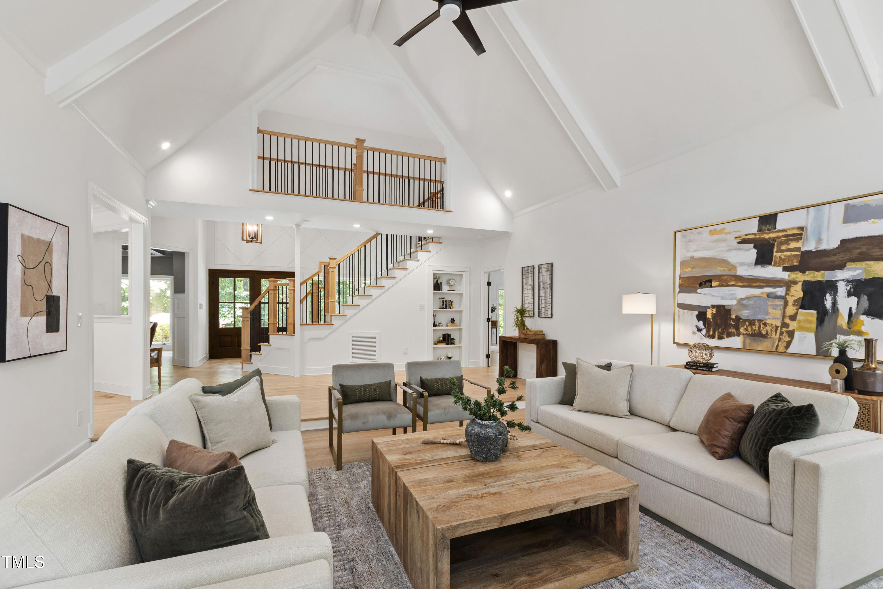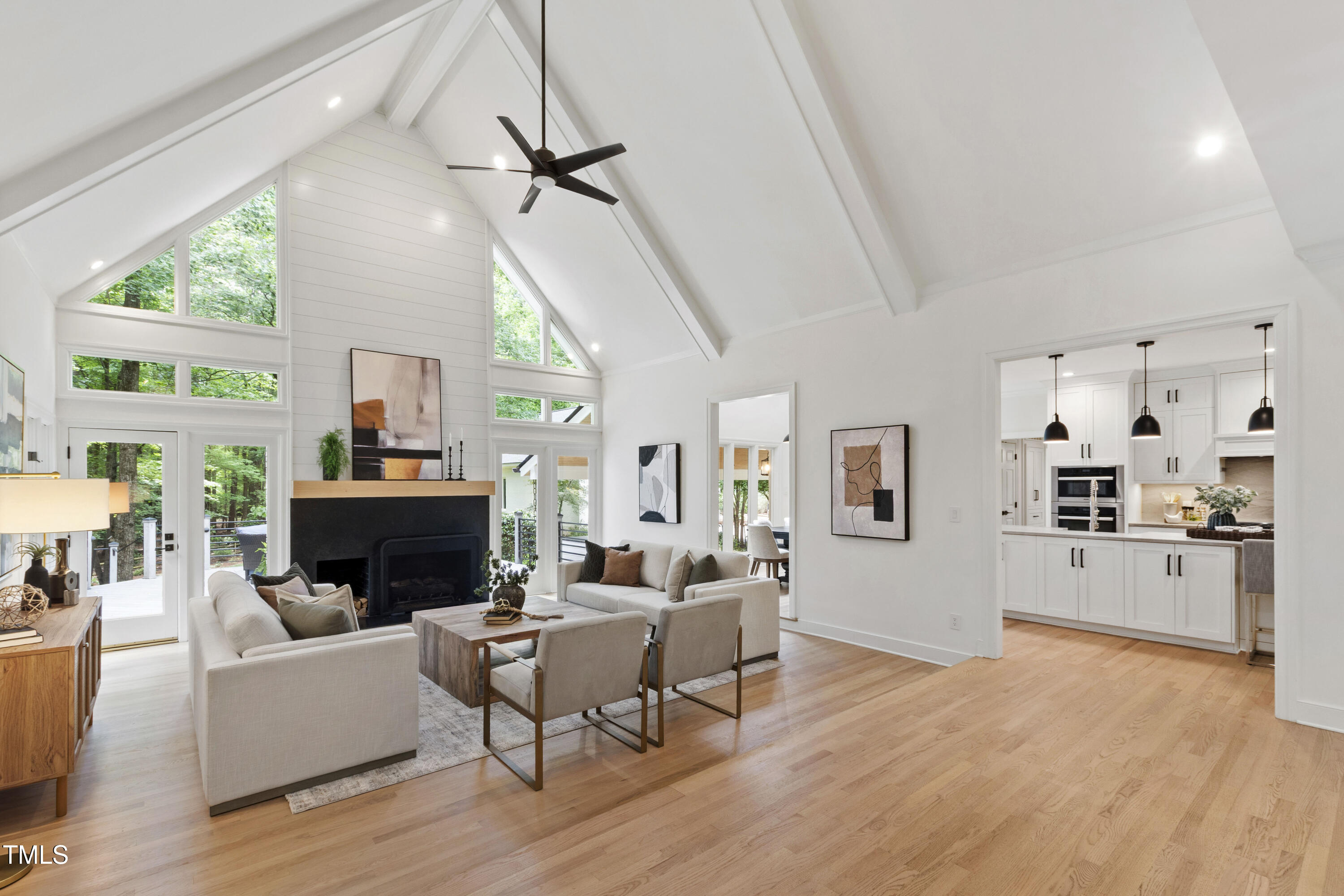An architectural wonder awaits in this truly one of one property, where captivating modernity wraps in elegant grandeur - welcome to 1301 King Cross Court. Located in one of the most prestigious North Raleigh neighborhoods of Sheffield Manor, this five bedroom property offers unmatched tranquility with accessible convenience to an abundance of life's core amenities. Nestled on a private, strikingly landscaped 2 acre corner lot, this home exudes contemporary character through every touchpoint. The moment you step through the front door, you're greeted by an impressive, vaulted-ceiling family room anchored around a gas-log fireplace - the heart of the home. To the left, you'll find your own private retreat with the idyllic primary suite, boasting expansive dual closets and a sleek bathroom outfitted with a walk-in shower and soaking tub. To the right, the family room is flanked by a gourmet kitchen, sparing no expense with quartzite countertops, stainless steel Miele appliances, oversized farmhouse sink, plentiful cabinets and a seamlessly intertwined breakfast room. Cap the day in the unique and inviting Bourbon Room --an entertainer's delight that blends warmth, style, and character. The floor is completed by an additional bedroom, perfect for a lower level in-law room, home office, or first floor bonus space. Transporting upstairs, you're once again greeted by contemporary finishes and hardwood floors as three spacious bedrooms await, each with their own en-suite offering the ultimate in comfort and privacy for families or guests. An oversized bonus room, complete with a sleek wet bar and an additional flex space, is the perfect setting for movie nights, a game room or second floor entertaining. Outdoor living at its finest, the exterior of this home offers year-round use with a thoughtfully designed covered patio featuring an outdoor bar and grill. Unwind for a cozy evening or fresh summer night on the spacious deck that backs to the double-sided fireplace from the family room. Moving to the grounds, the expansive, beautifully maintained backyard offers plenty of room for anyone looking to add a pool -- yet the property is only a short walk to the community's swimming, tennis and pickleball courts, and scenic nature trails. With a brand new roof and pristine brick siding, this home is the epitome of a move-in ready property in ultimate condition. Rounding out the distinctive and exceptional design of this home, space abounds as you explore the property's generously-sized detached garage - a canvas of opportunity prime for transformation into your next working space, home gym, workshop, secondary garage, storage, or so much more. Every square foot of this stunning abode has been thoughtfully planned and detailed. A combination of remarkable luxury, impeccable condition, private space, and unbeatable accessibility - 1301 King Cross Court is the perfect balance of elegance and comfort for unparalleled, everyday living in an exceptional manner.
