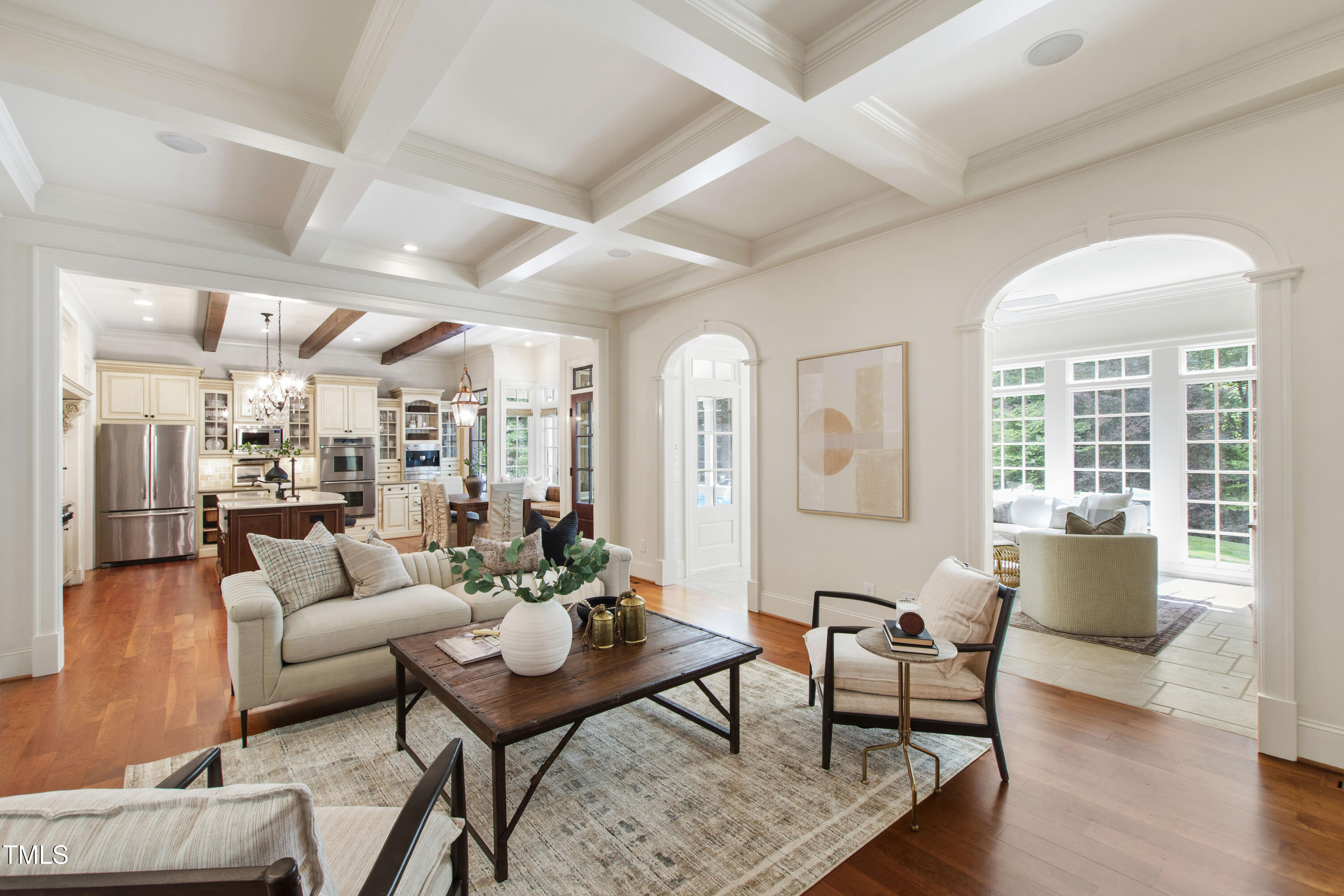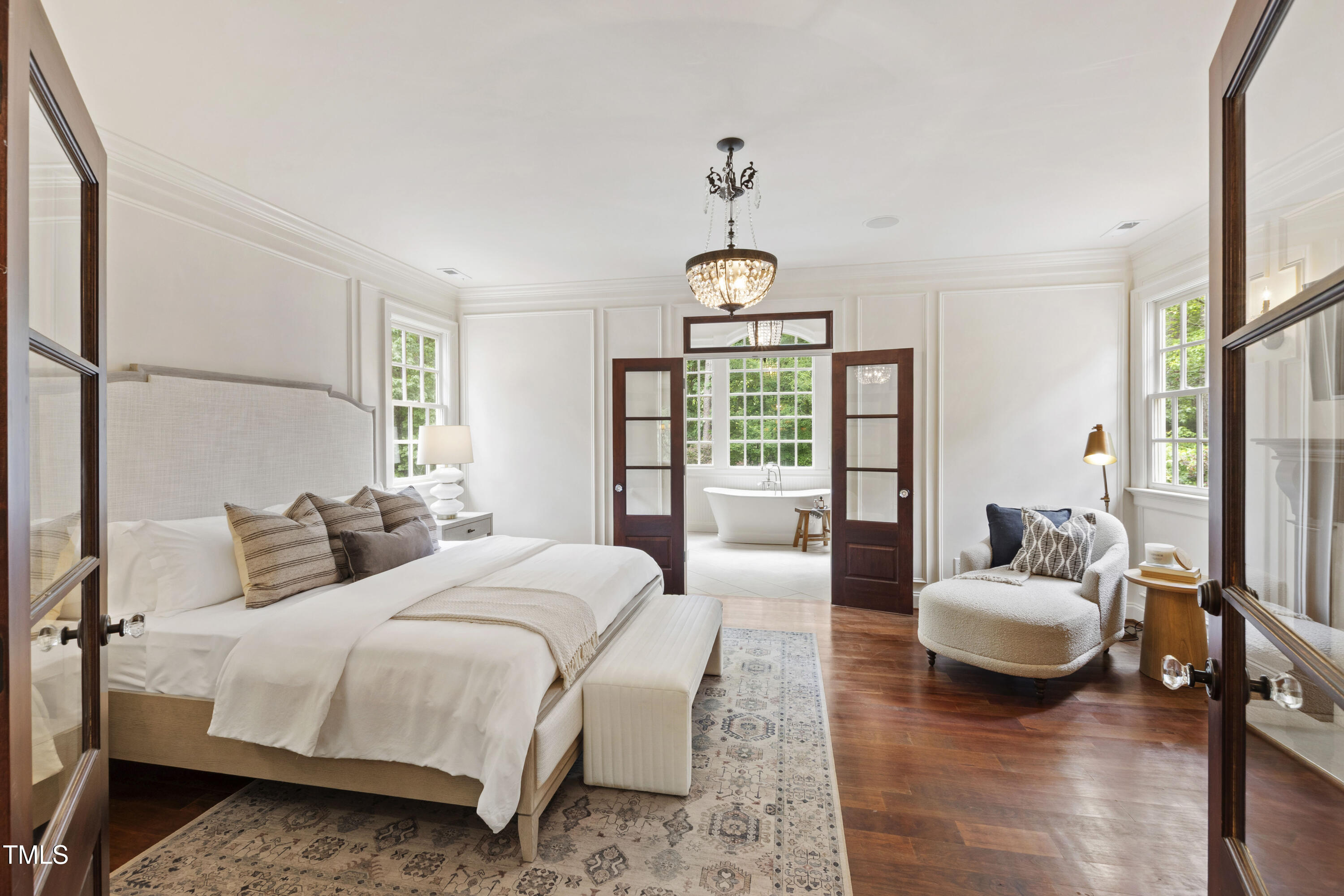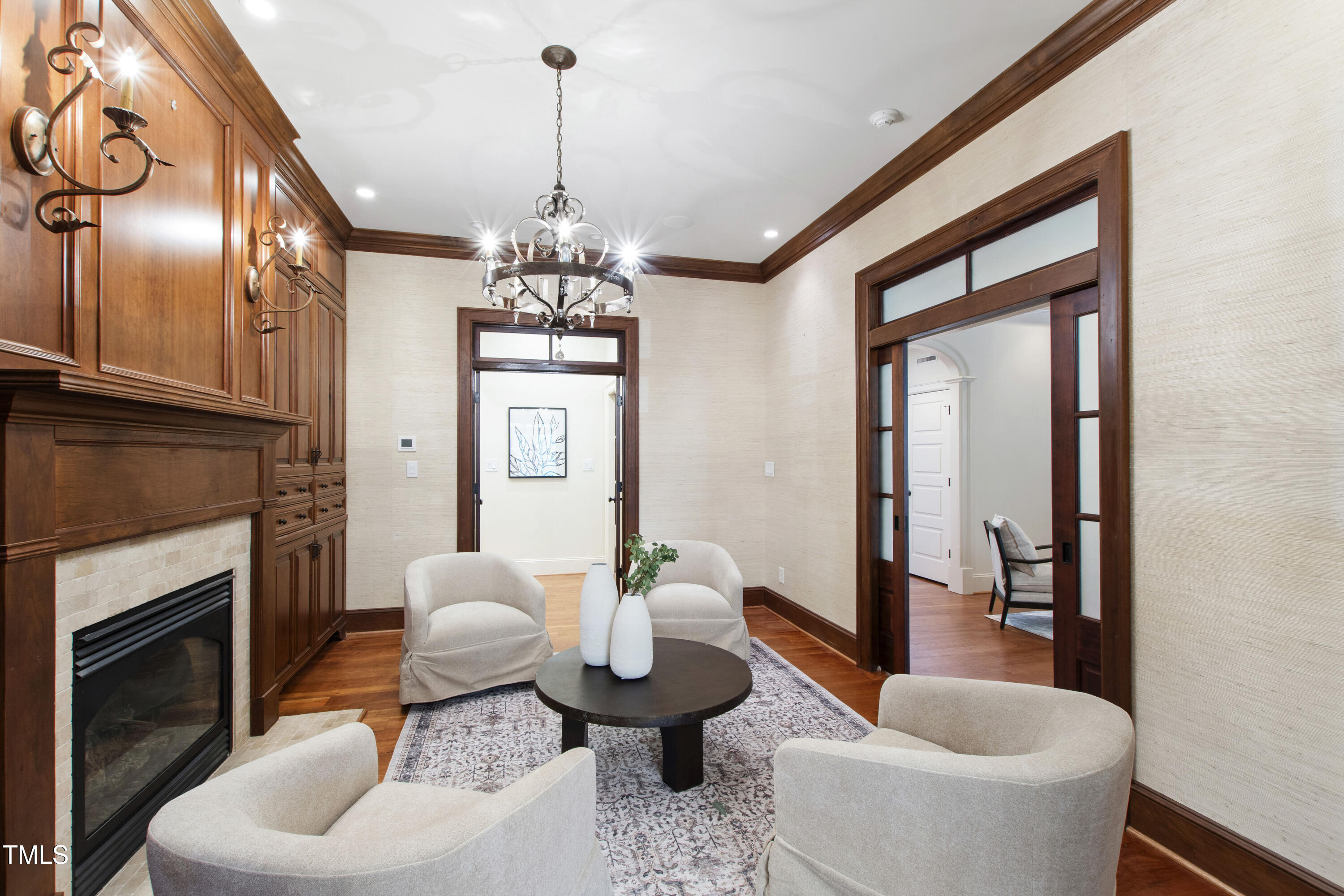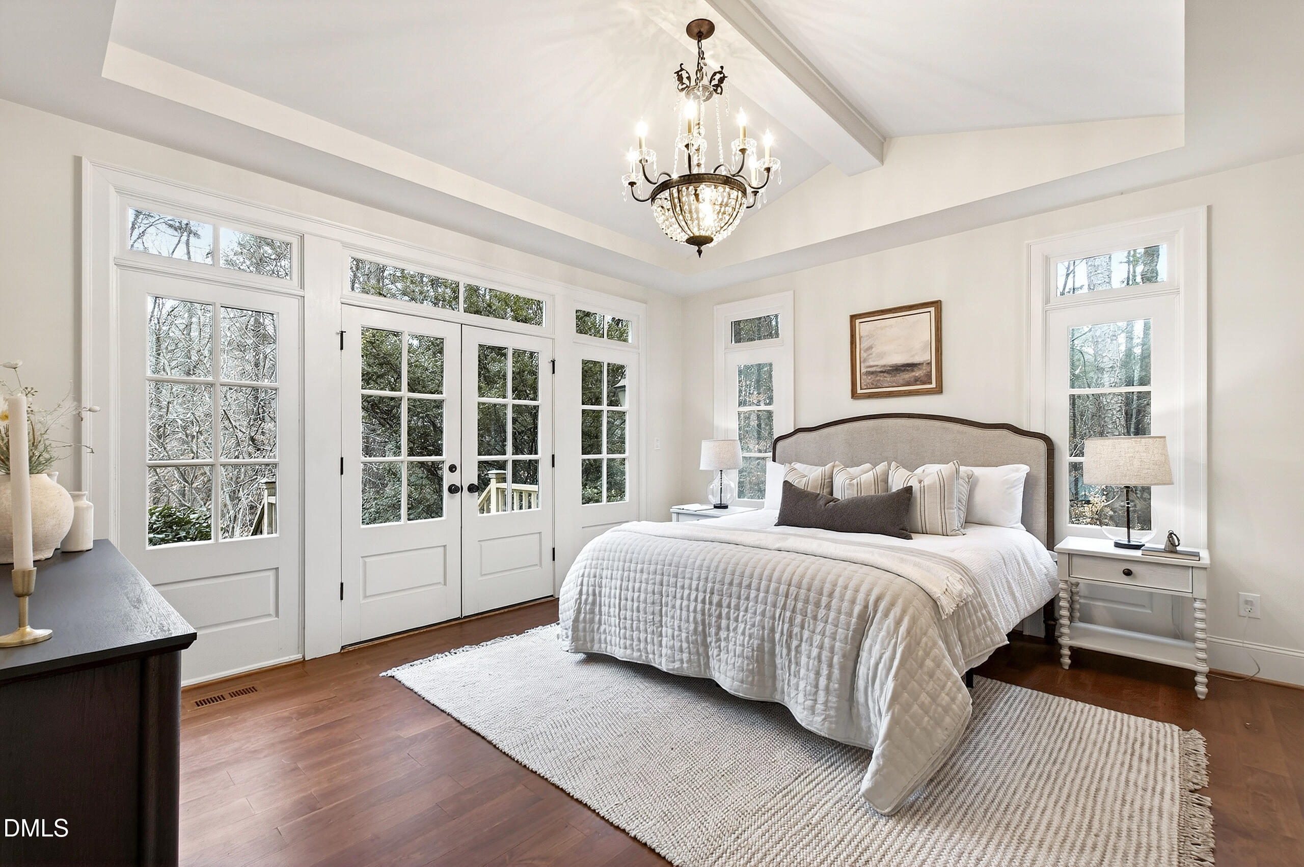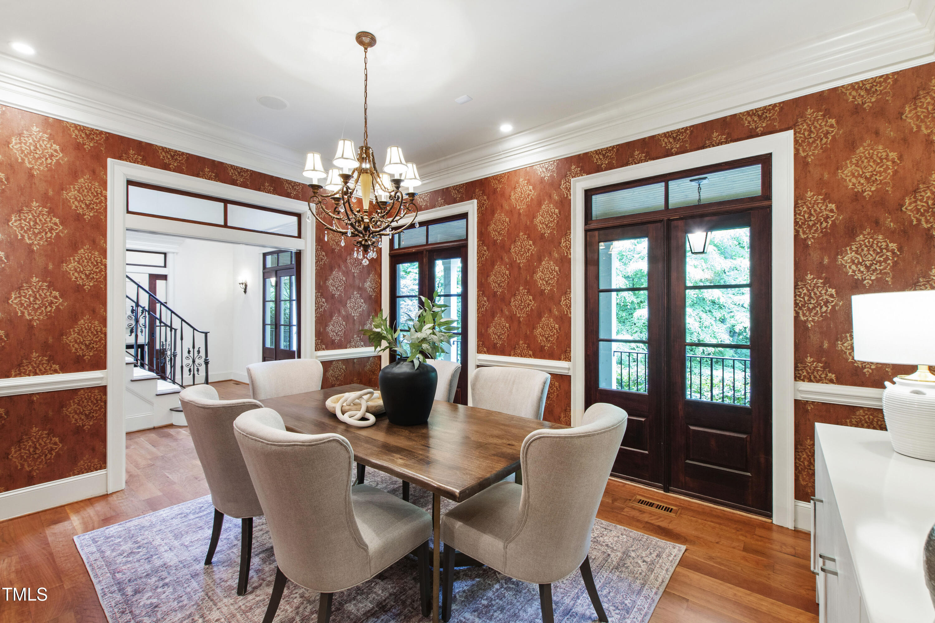 Welcome to an unparalleled custom-built masterpiece, gracefully situated on 3.25 serene acres within The Shire, an exclusive enclave of only nine homesites spanning over 90 wooded acres. Enjoy the tranquility of a private estate, mere minutes - just four miles - from the vibrant heart of Downtown Chapel Hill, UNC Hospital, and Carrboro. Step inside and be captivated by a residence that has been meticulously maintained and thoughtfully designed. Grand vaulted ceilings, dazzling chandeliers, and a magnificent staircase immediately evoke a sense of refined opulence, while an abundance of bright, open windows bathes the interior in natural light. The gourmet kitchen is a chef's delight boasting Silestone countertops, gas range, a double oven, a generous walk-in pantry, a built-in Miele coffee machine, and a discreet butler's pantry - making entertaining an absolute breeze. Memorable gatherings will be a delight to host in the separate formal dining room. A recently added main-level primary suite features vaulted ceilings, private wooded views, an elegant primary bathroom with a walk-in shower, large soaker tub, and an expansive walk-in closet. The cozy sitting room with gas fireplace and plentiful storage possibilities sets the perfect tone for a relaxing oasis. The bright sunroom provides a picturesque vantage point, overlooking your sprawling private lot and the inviting in-ground pool. Upstairs, a second main suite truly defines sanctuary with a cozy fireplace, leading to a bright, luxurious bathroom appointed with both a rejuvenating walk-in shower and a deep soaker tub. Two additional spacious bedrooms and a versatile bonus room offer endless possibilities for recreation, a home theater, a private gym, or additional personalized living space. Outside, the fenced backyard is an entertainer's paradise, complete with a heating-capable pool, and breathtaking private views. Seamless indoor-outdoor living is perfected with a charming screened back porch and an additional covered porch. Beyond its beauty, 131 Lavinia offers unmatched convenience, located directly off Highway 54 for swift access to local hospitals, UNC, Chapel Hill/Carrboro, and major highways. Modern amenities abound, including a comprehensive security system, central vacuum system, a fully integrated home entertainment center encompassing the entire home, a rain-sensor irrigation system, and a reliable backup generator. This residence isn't just a home; it's a lifestyle of sophistication and comfort, meticulously crafted for discerning tastes.