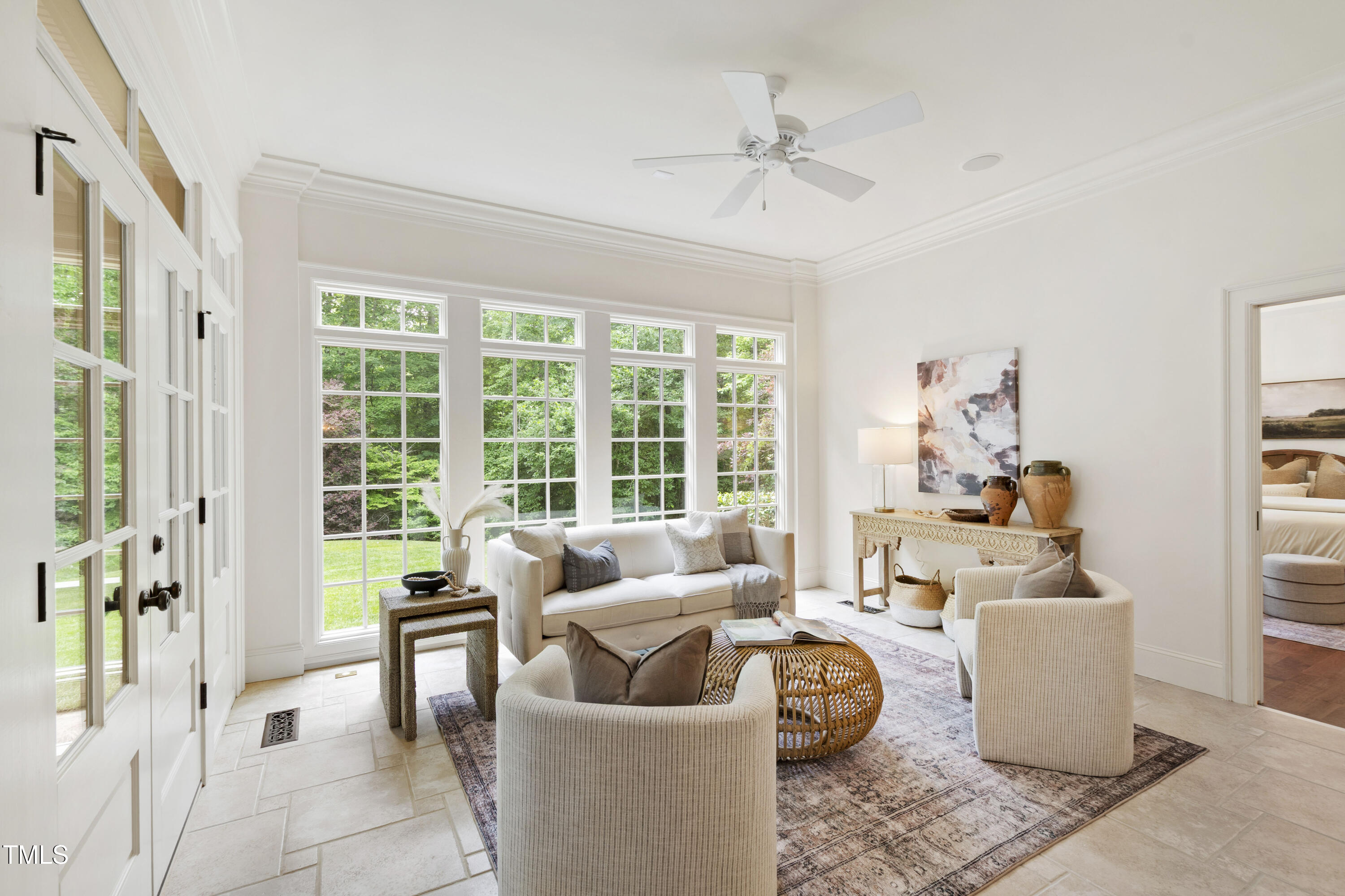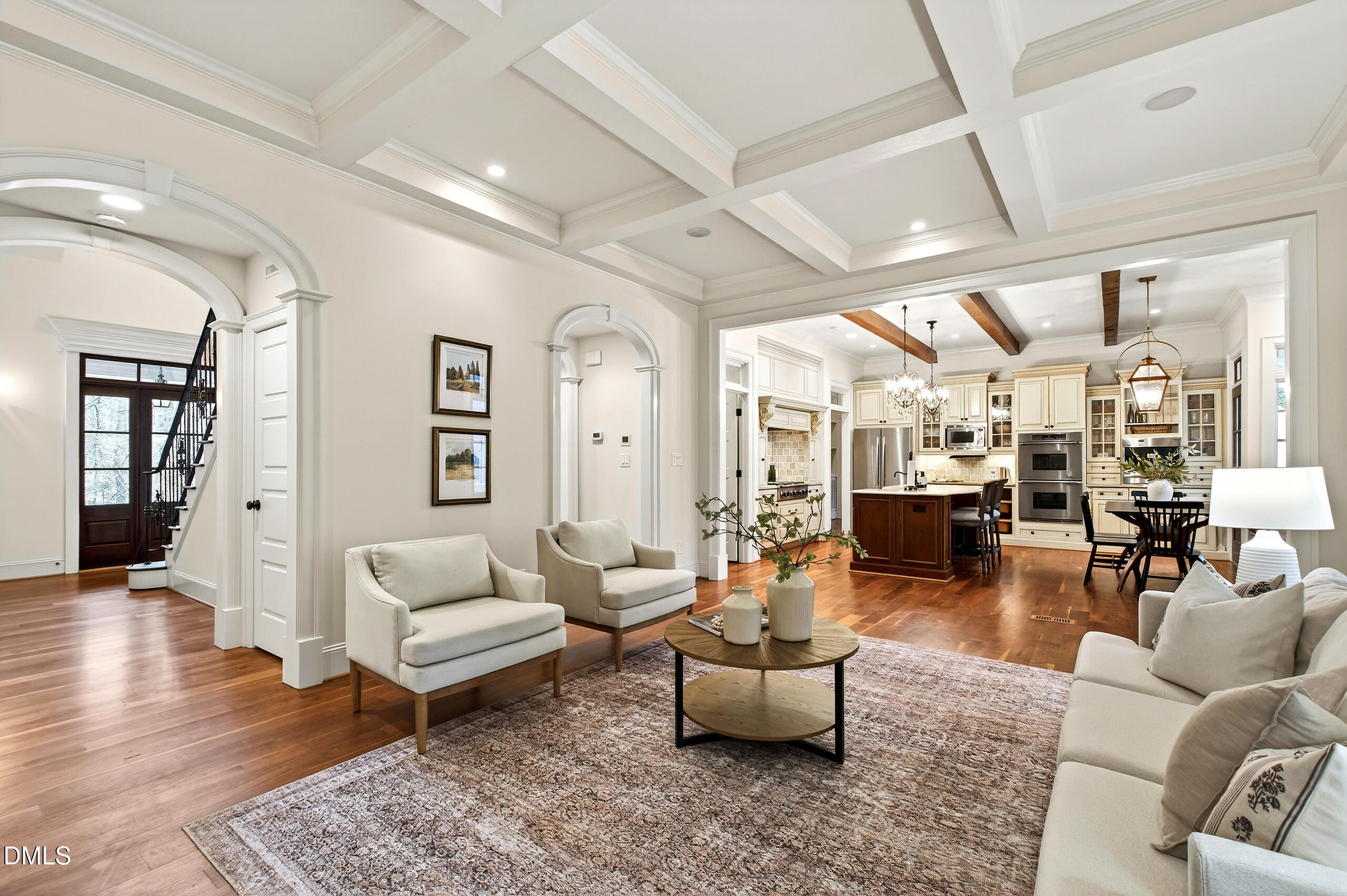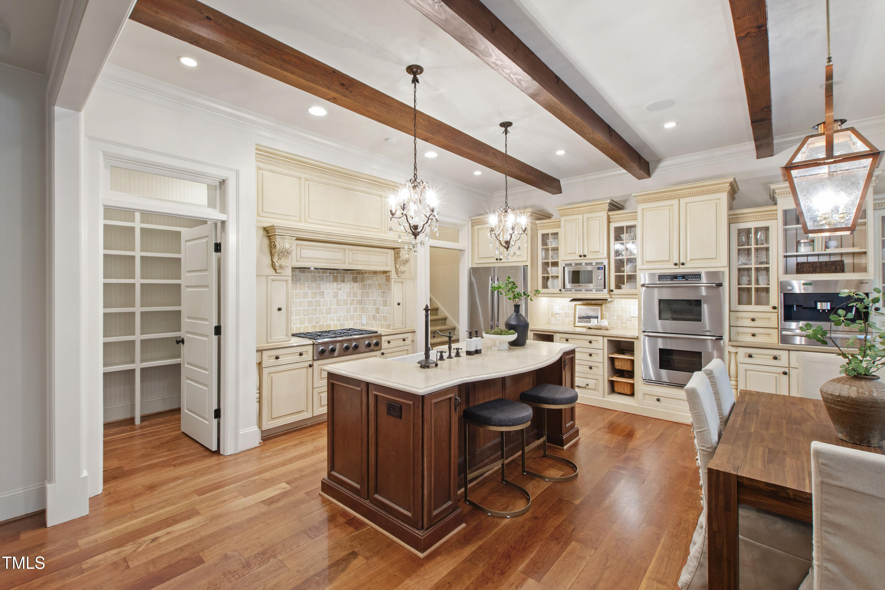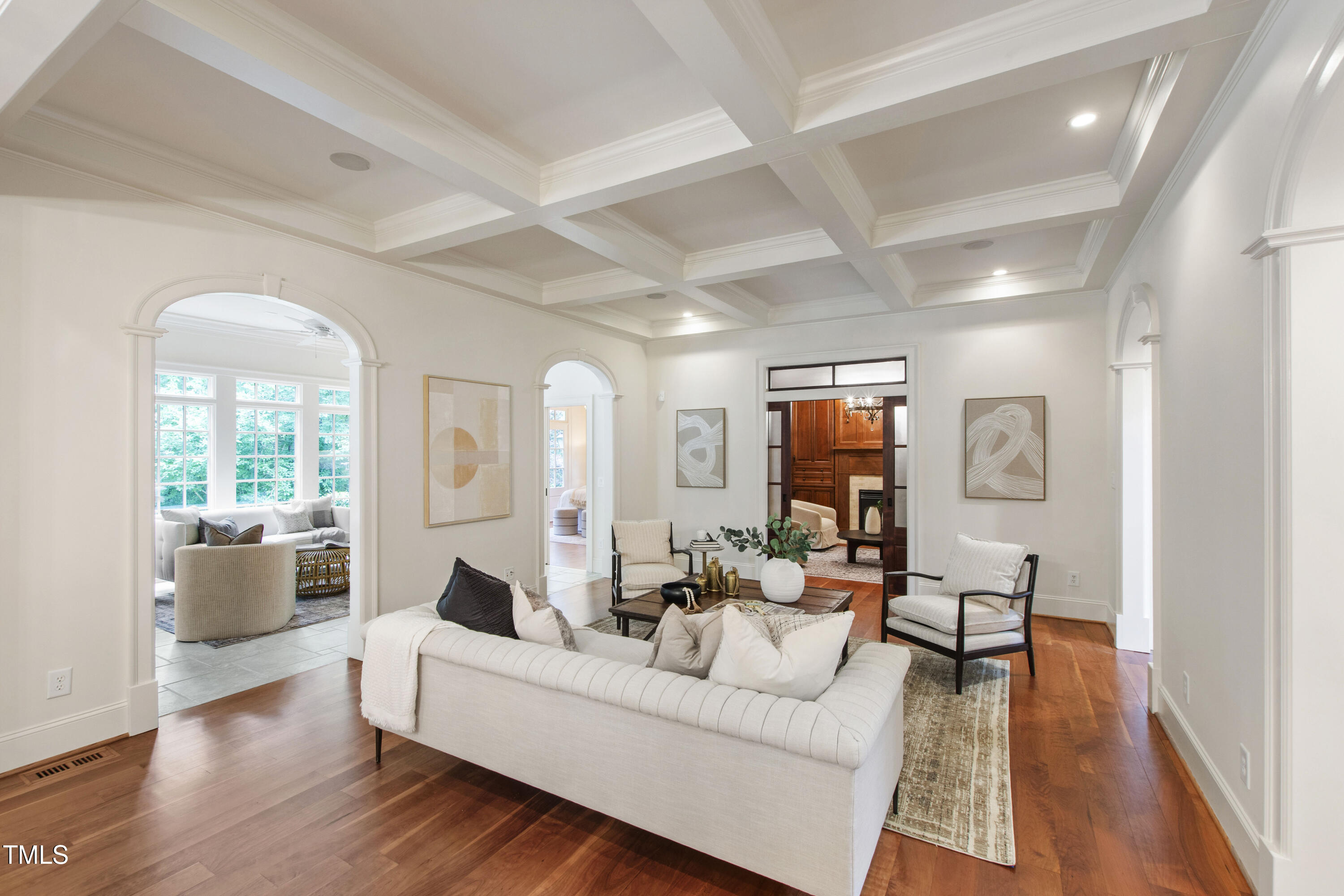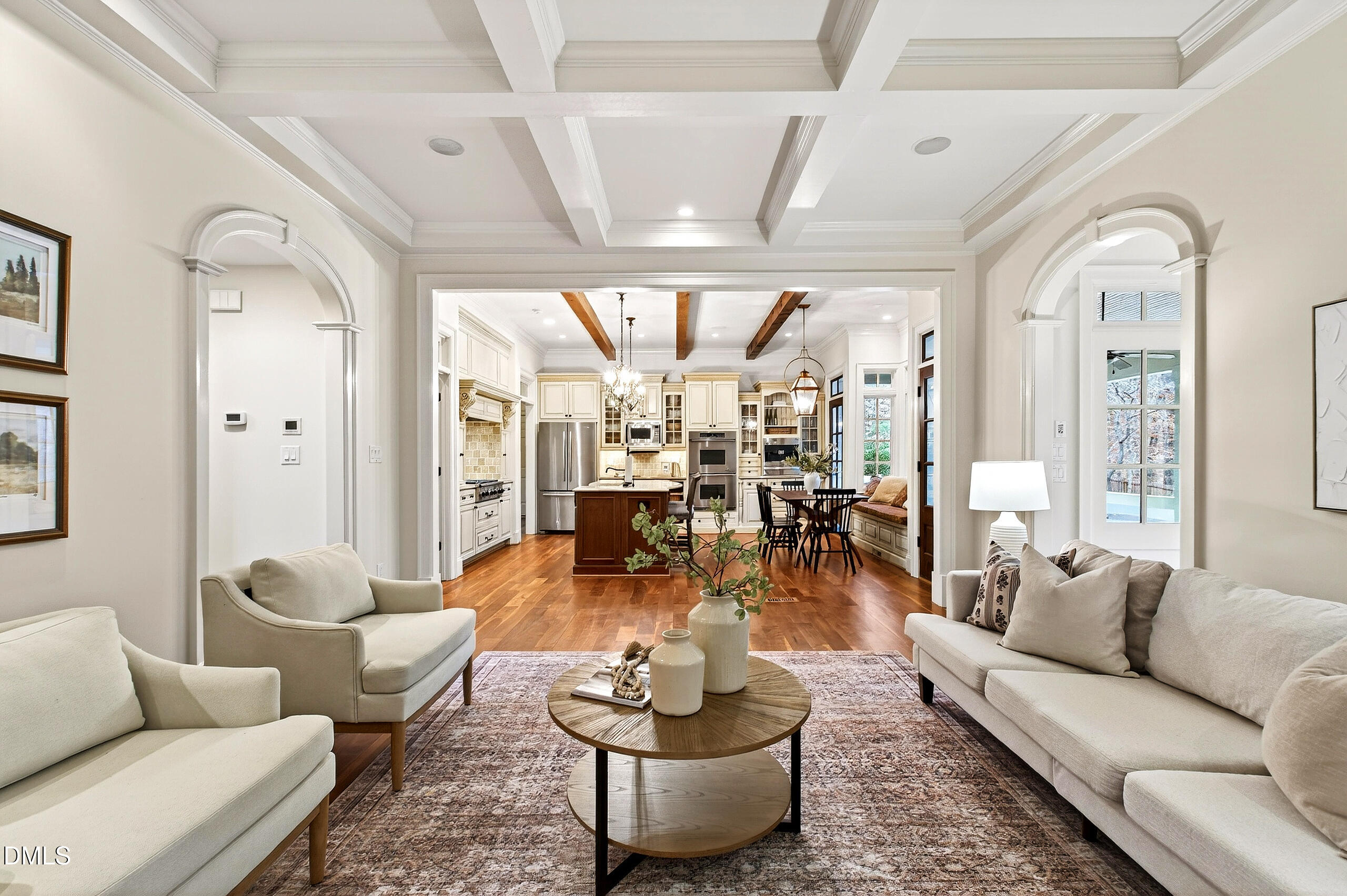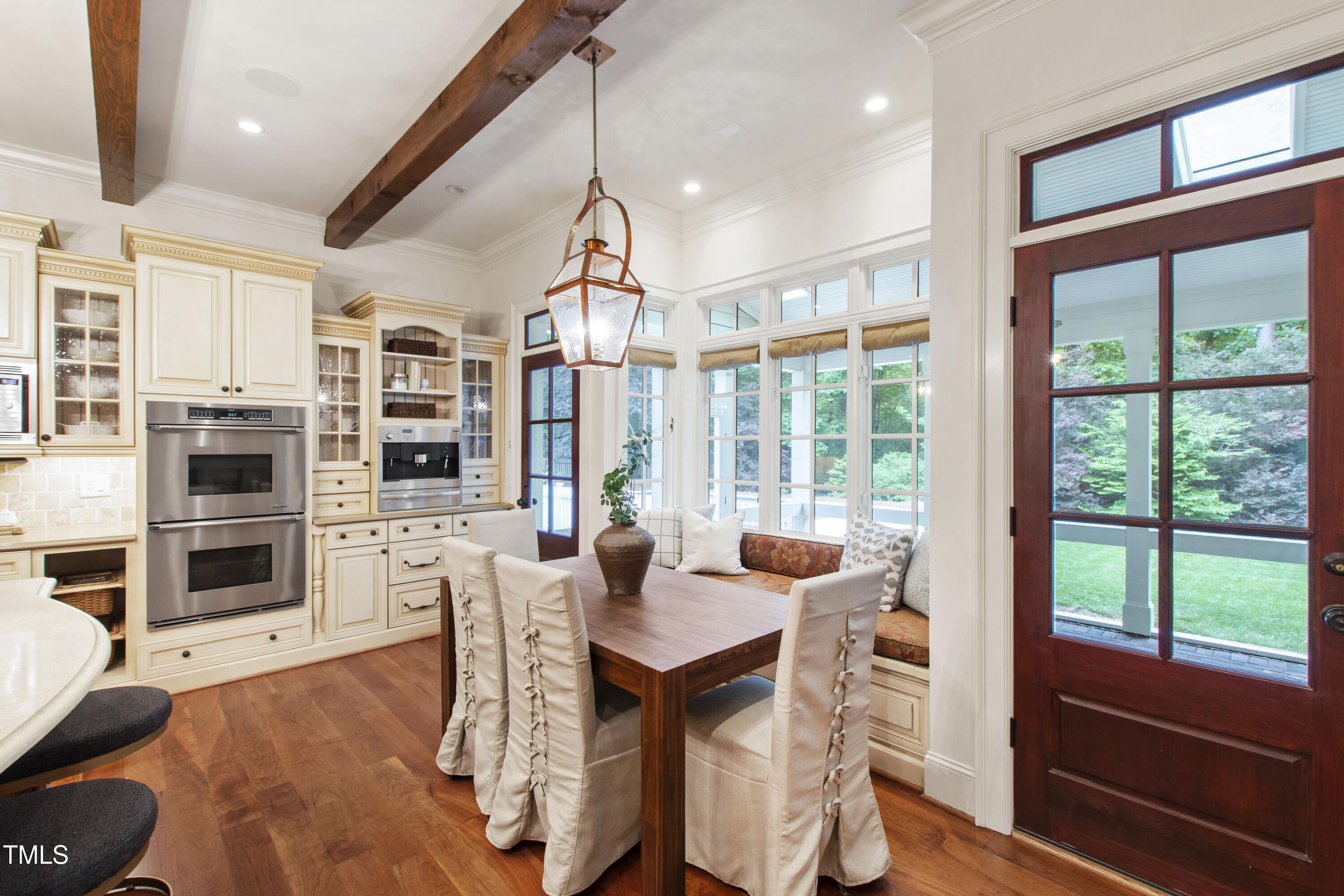 Welcome to an unparalleled custom-built masterpiece, gracefully situated on 3.25 serene acres within The Shire, an exclusive enclave of only nine homesites spanning over 90 wooded acres. Enjoy the tranquility of a private estate, mere minutes - just four miles - from the vibrant heart of Downtown Chapel Hill, UNC Hospital, and Carrboro. Step inside and be captivated by a residence that has been meticulously maintained and thoughtfully designed. Grand vaulted ceilings, dazzling chandeliers, and a magnificent staircase immediately evoke a sense of refined opulence, while an abundance of bright, open windows bathes the interior in natural light. The gourmet kitchen is a chef's delight boasting Silestone countertops, gas range, a double oven, a generous walk-in pantry, a built-in Miele coffee machine, and a discreet butler's pantry - making entertaining an absolute breeze. Memorable gatherings will be a delight to host in the separate formal dining room. A recently added main-level primary suite features vaulted ceilings, private wooded views, an elegant primary bathroom with a walk-in shower, large soaker tub, and an expansive walk-in closet. The cozy sitting room with gas fireplace and plentiful storage possibilities sets the perfect tone for a relaxing oasis. The bright sunroom provides a picturesque vantage point, overlooking your sprawling private lot and the inviting in-ground pool. Upstairs, a second main suite truly defines sanctuary with a cozy fireplace, leading to a bright, luxurious bathroom appointed with both a rejuvenating walk-in shower and a deep soaker tub. Two additional spacious bedrooms and a versatile bonus room offer endless possibilities for recreation, a home theater, a private gym, or additional personalized living space. Outside, the fenced backyard is an entertainer's paradise, complete with a heating-capable pool, and breathtaking private views. Seamless indoor-outdoor living is perfected with a charming screened back porch and an additional covered porch. Beyond its beauty, 131 Lavinia offers unmatched convenience, located directly off Highway 54 for swift access to local hospitals, UNC, Chapel Hill/Carrboro, and major highways. Modern amenities abound, including a comprehensive security system, central vacuum system, a fully integrated home entertainment center encompassing the entire home, a rain-sensor irrigation system, and a reliable backup generator. This residence isn't just a home; it's a lifestyle of sophistication and comfort, meticulously crafted for discerning tastes.