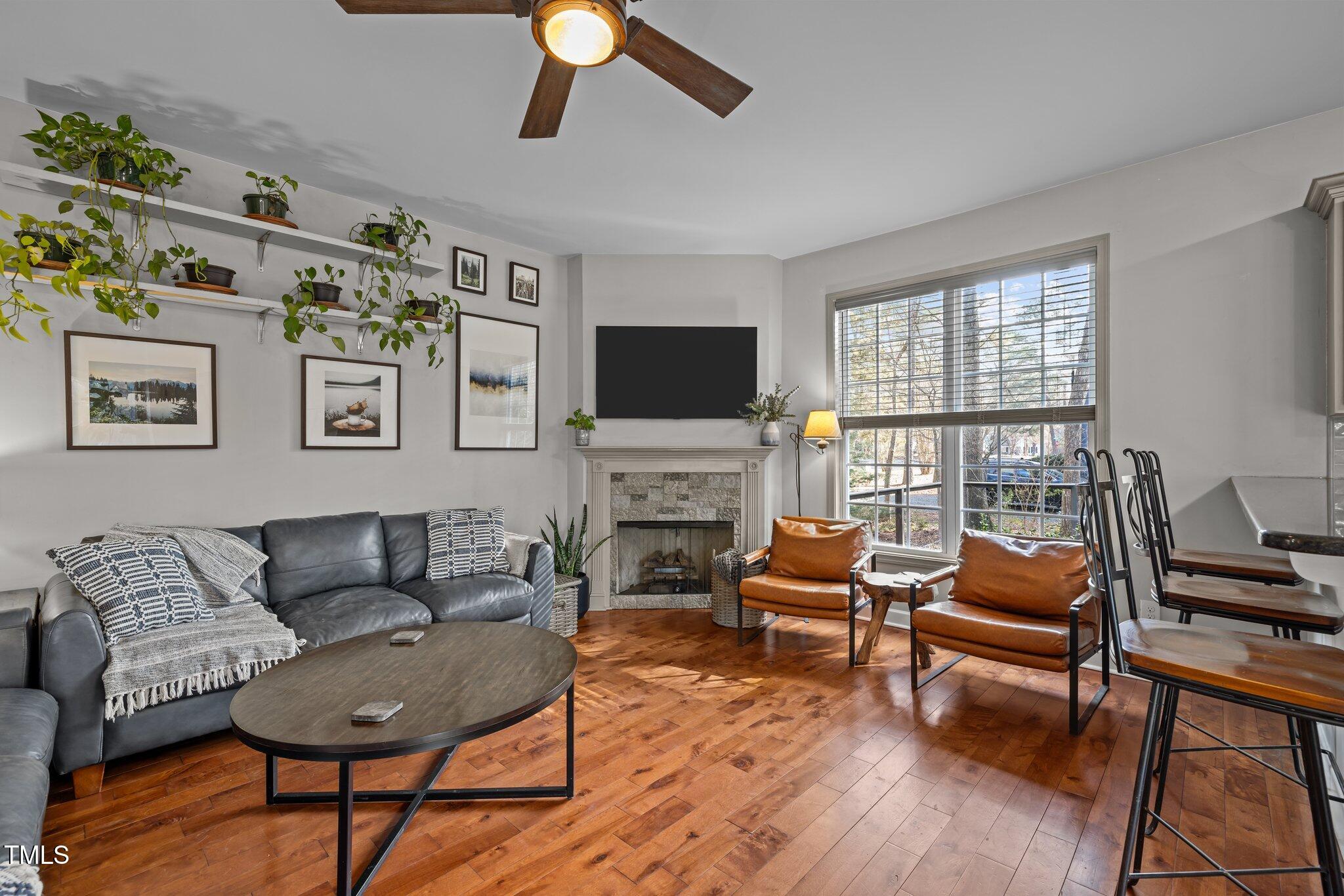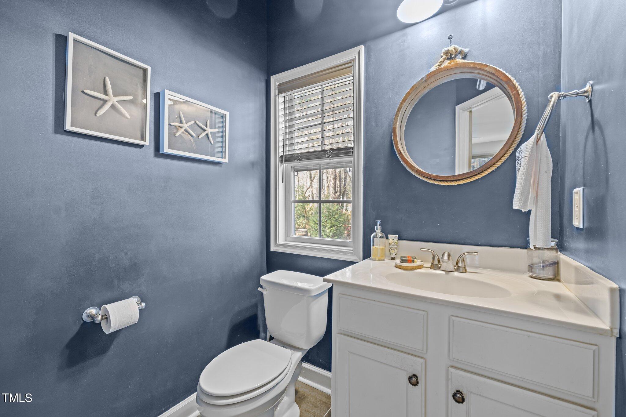 The family room features a stone-surround gas log fireplace, wiring for a flat-screen TV above, and an updated ceiling fan with light. A charming powder room on the main level features custom paint, a decorative mirror, and a white vanity.