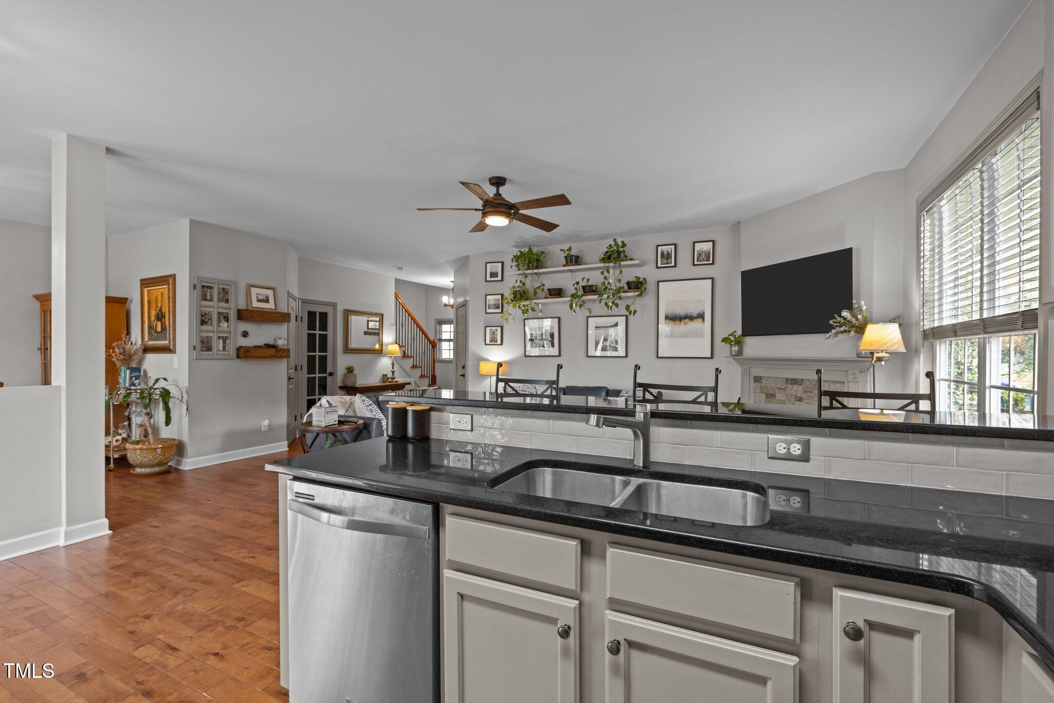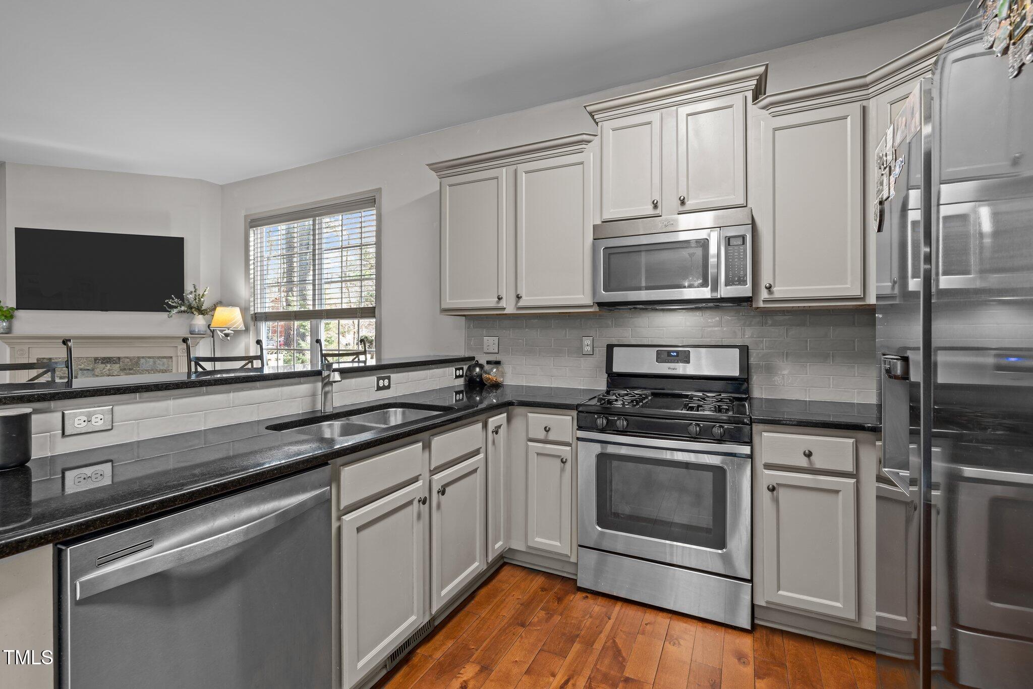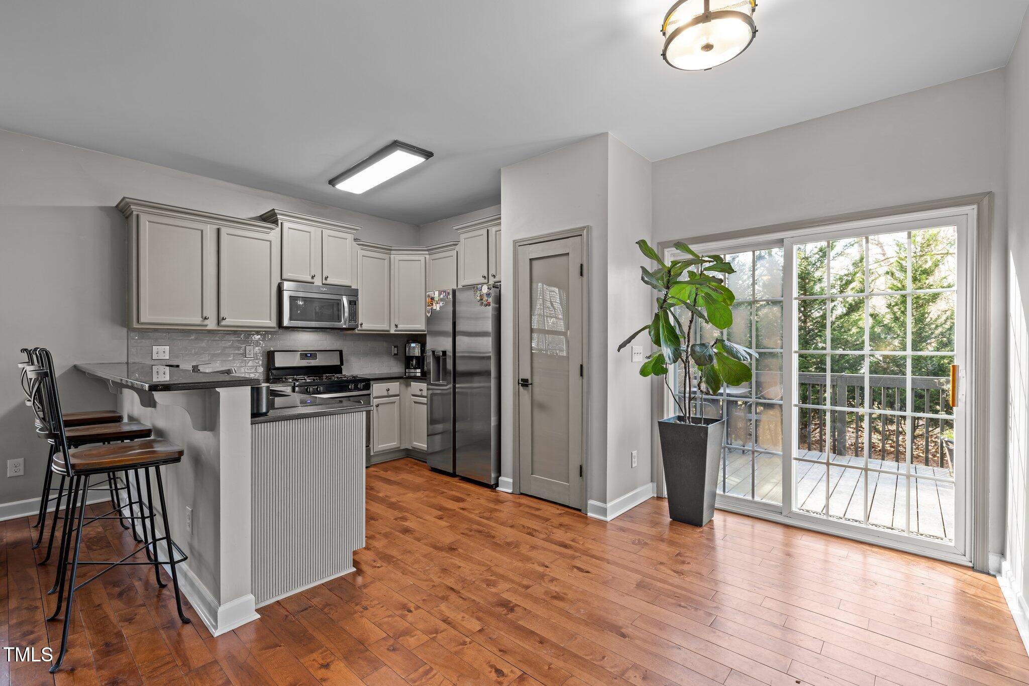 The open-concept kitchen serves as the heart of the home, overlooking the family room and dining area. It features granite countertops, a subway tile backsplash, stylish gray shaker cabinets with crown trim, a breakfast bar, and a frosted glass pantry door. Stainless steel appliances include a gas cooktop, built-in microwave, and dishwasher. The breakfast nook, highlighted by an updated drum shade light fixture, opens onto a spacious deck through sliding glass doors--ideal for indoor-outdoor living.