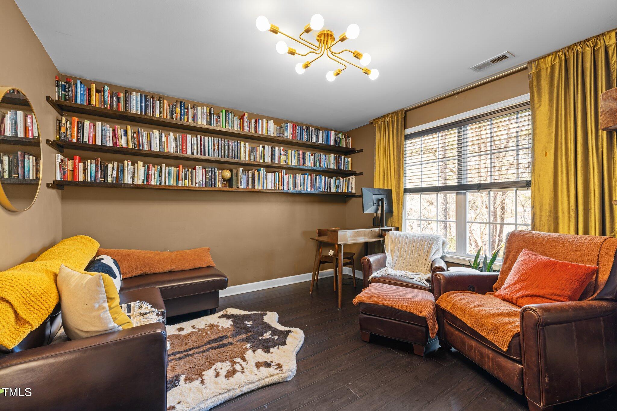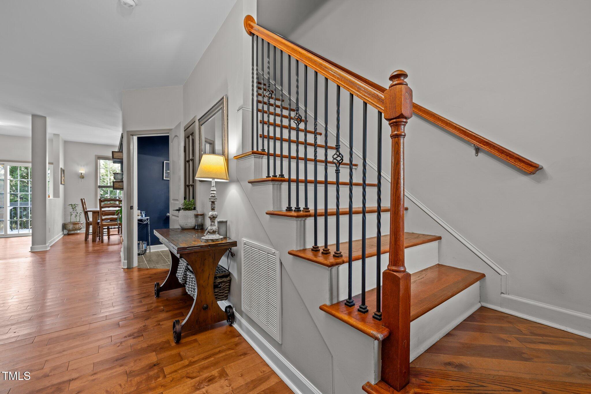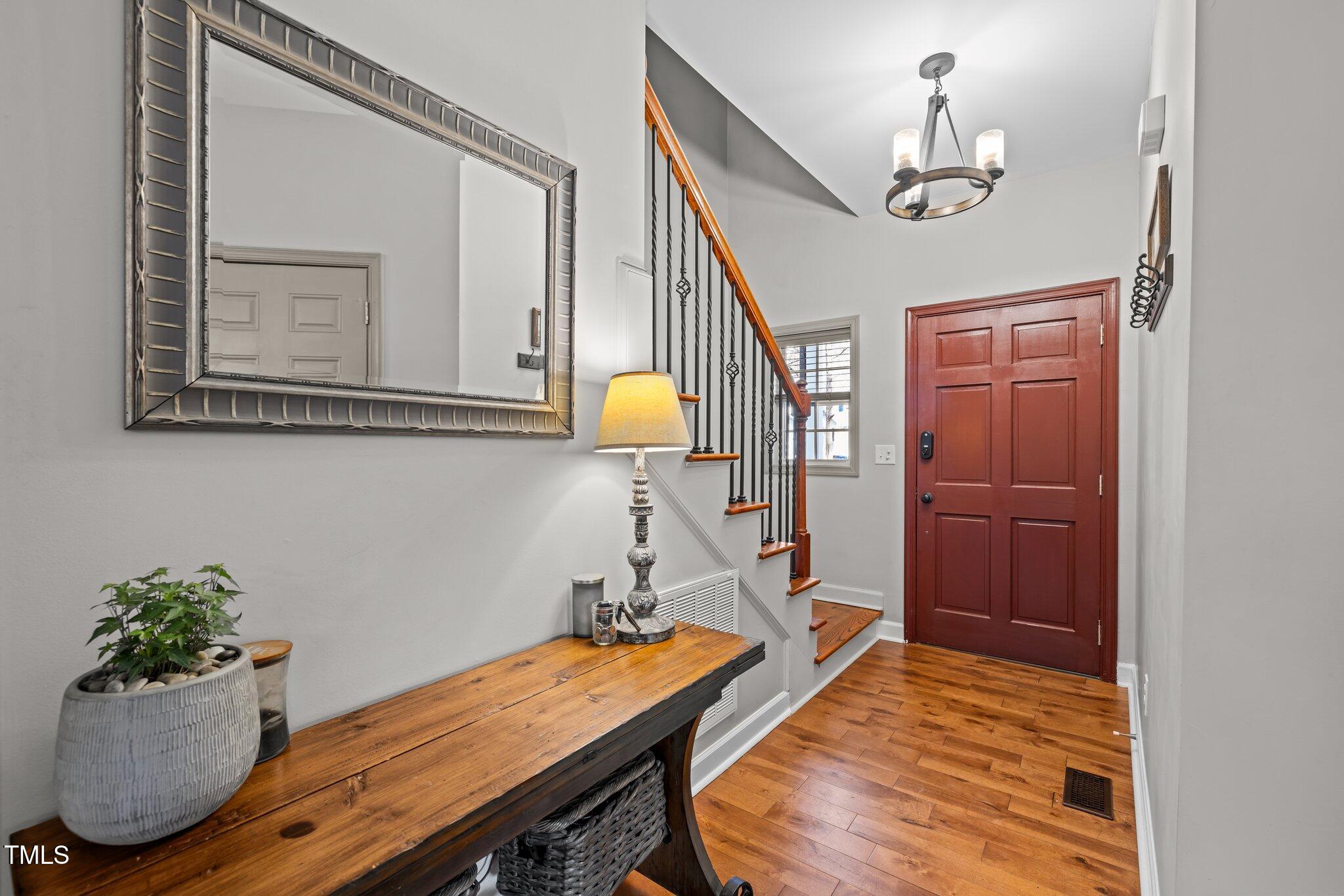 Step inside to a welcoming foyer with a stylish chandelier and gorgeous hardwood floors that flow seamlessly throughout both levels--perfect for an allergy-friendly environment.