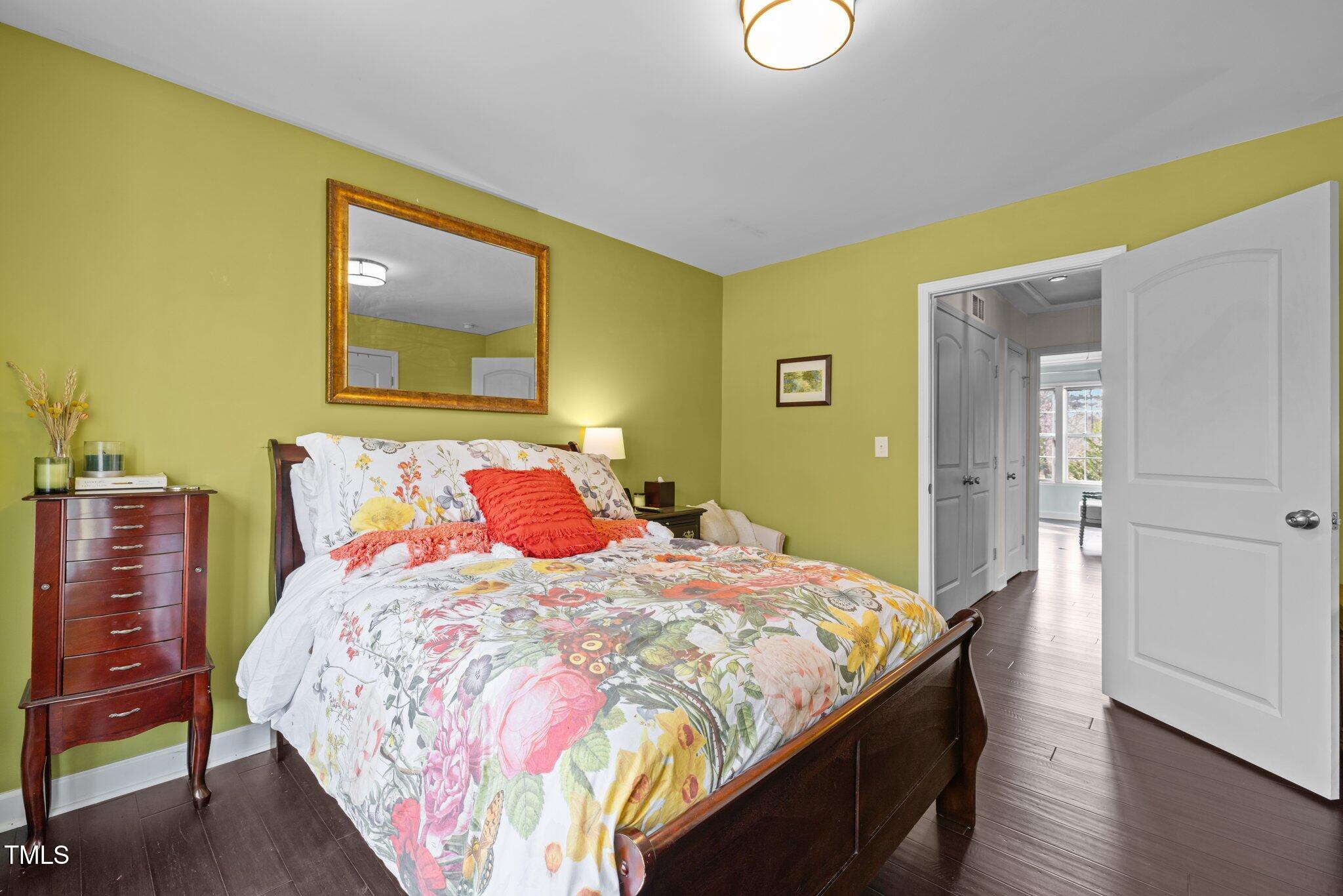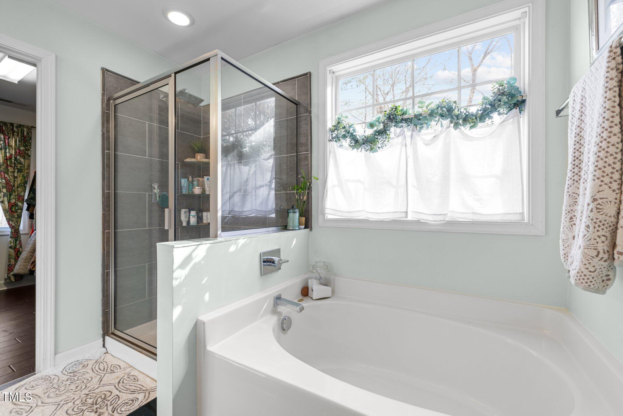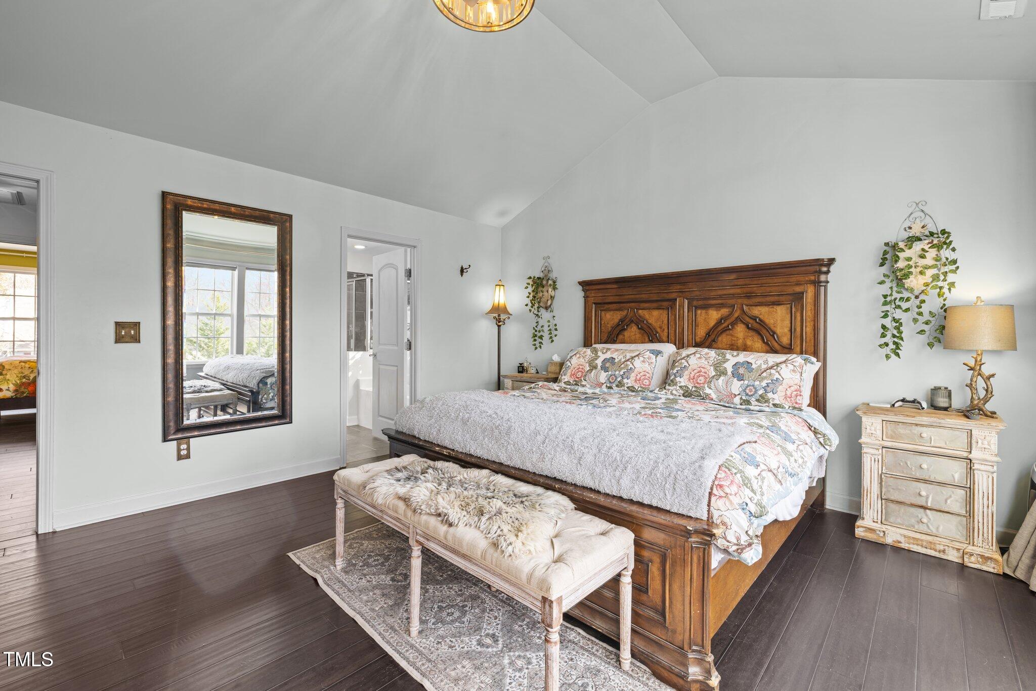 Upstairs, you'll find a bright and spacious owner's suite, featuring a vaulted ceiling, designer fandelier, and four single casement windows overlooking the private backyard. The spa-style ensuite bath offers tile flooring, a dual vanity with white cabinetry, upgraded chrome waterfall faucets, beveled glass mirrors, and a soaking tub with an upgraded faucet, plus a separate tiled shower.Two additional bedrooms offer ample space--one currently used as a flex space with a glass door and built-in bookcase shelving.