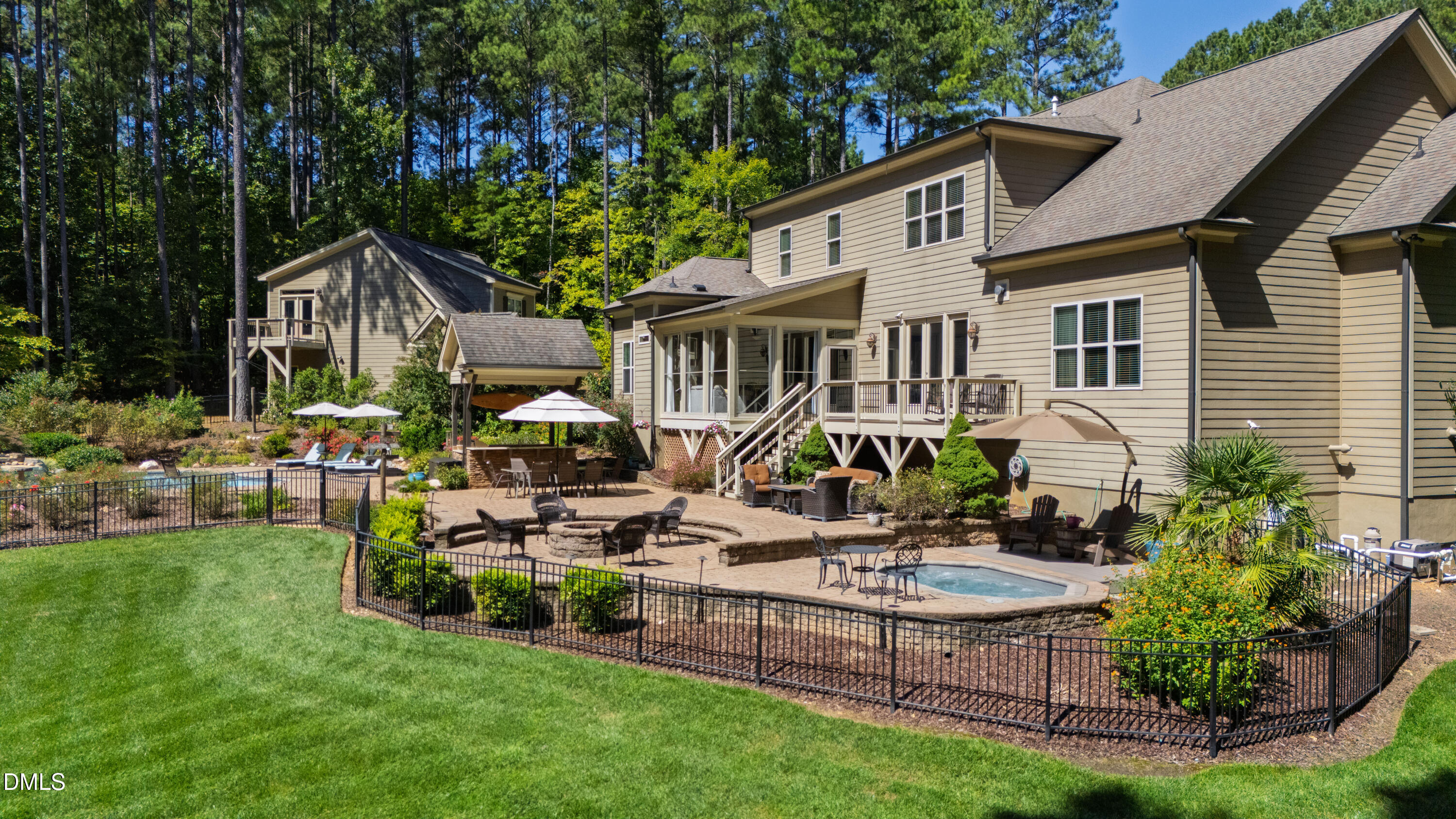 Outside, enjoy resort-style amenities including a covered outdoor grill area, patio with fire pit, inground pool, hot tub, and lush gardens--all framed by a private wall of trees that enhances both peace and privacy. Sightings of wildlife, walking and biking trails along with the lake are close by for outdoor enthusiasts.
