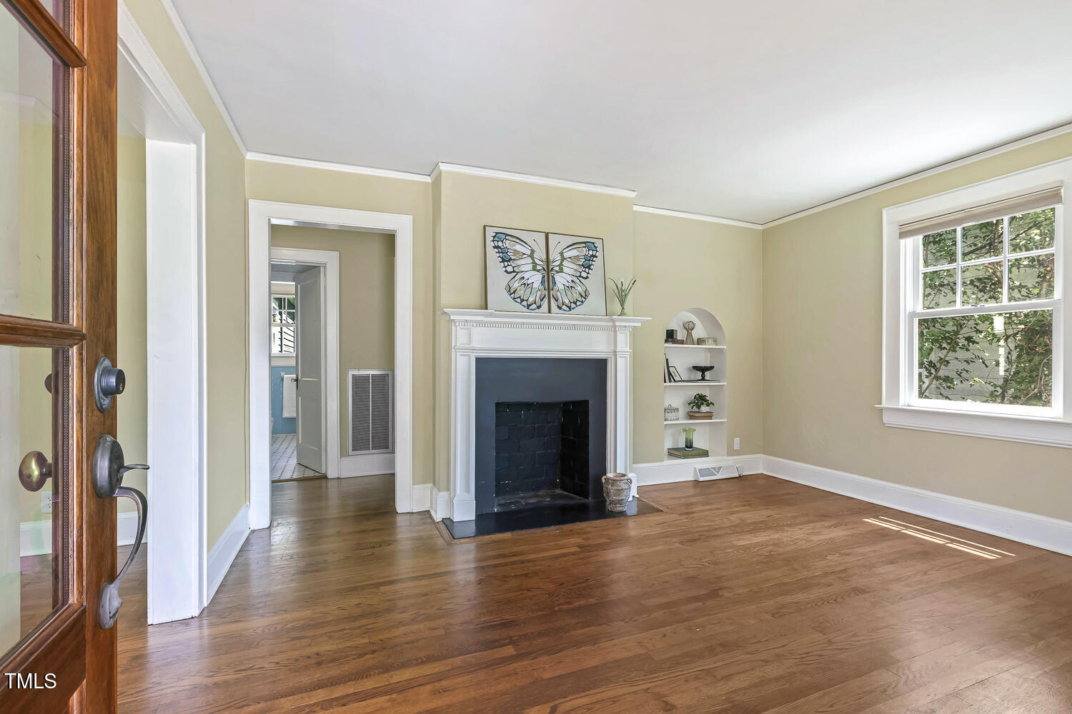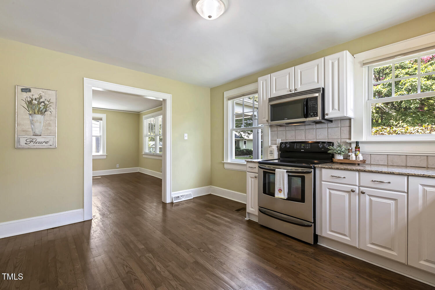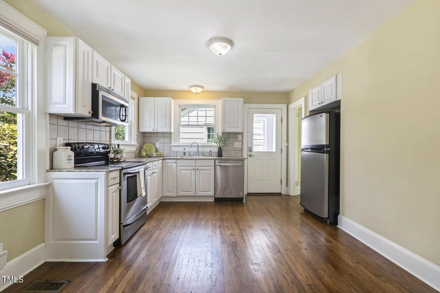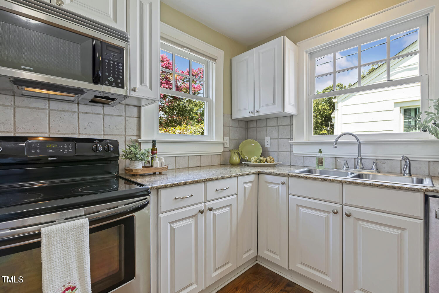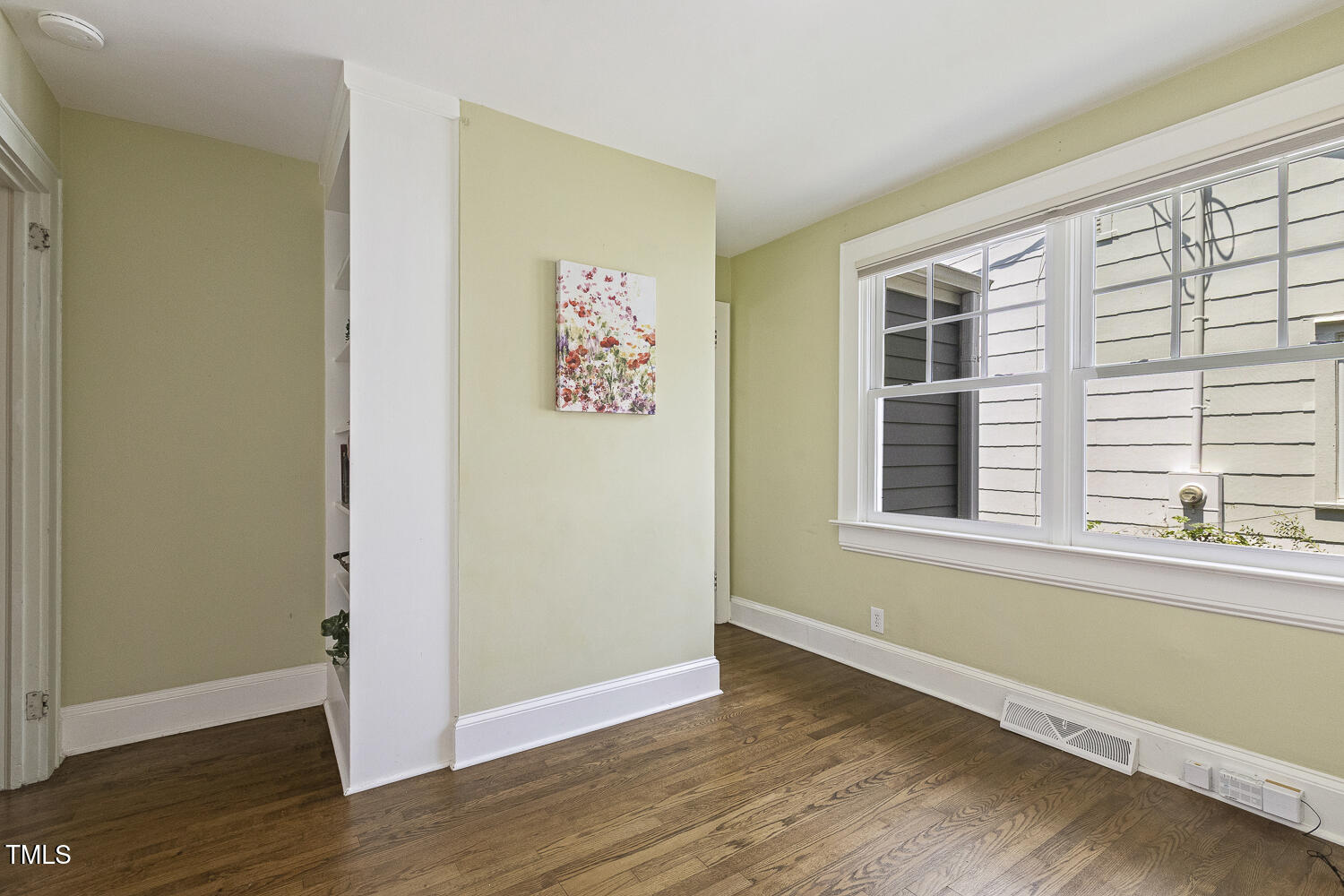 Step back in time to the charm of Roanoke Park with this delightful 1940s bungalow! Nestled in one of Raleigh's most desirable, historic neighborhoods, this home blends vintage character with modern updates. Abundant charm overflows from the updated kitchen to the an cozy living room with an arch-topped built in bookcase and an inviting fireplace (non-functional). A sunlit flex space can easily be used as a dining room or a study - enjoy the oportunity to make this floorplan meet your needs. The primary bedroom has an updated bathroom with a dual vanity and lovely, tiled tub surround. Relax in the expansive backyard or cook out on the deck or patio. The large workshop/shed can be used for storage and hobbies. Vibrant Five Points and Glenwood South are just moments away providing easy access to dining, boutique shopping, and lively entertainment, all while enjoying the tranquility of this cherished community.